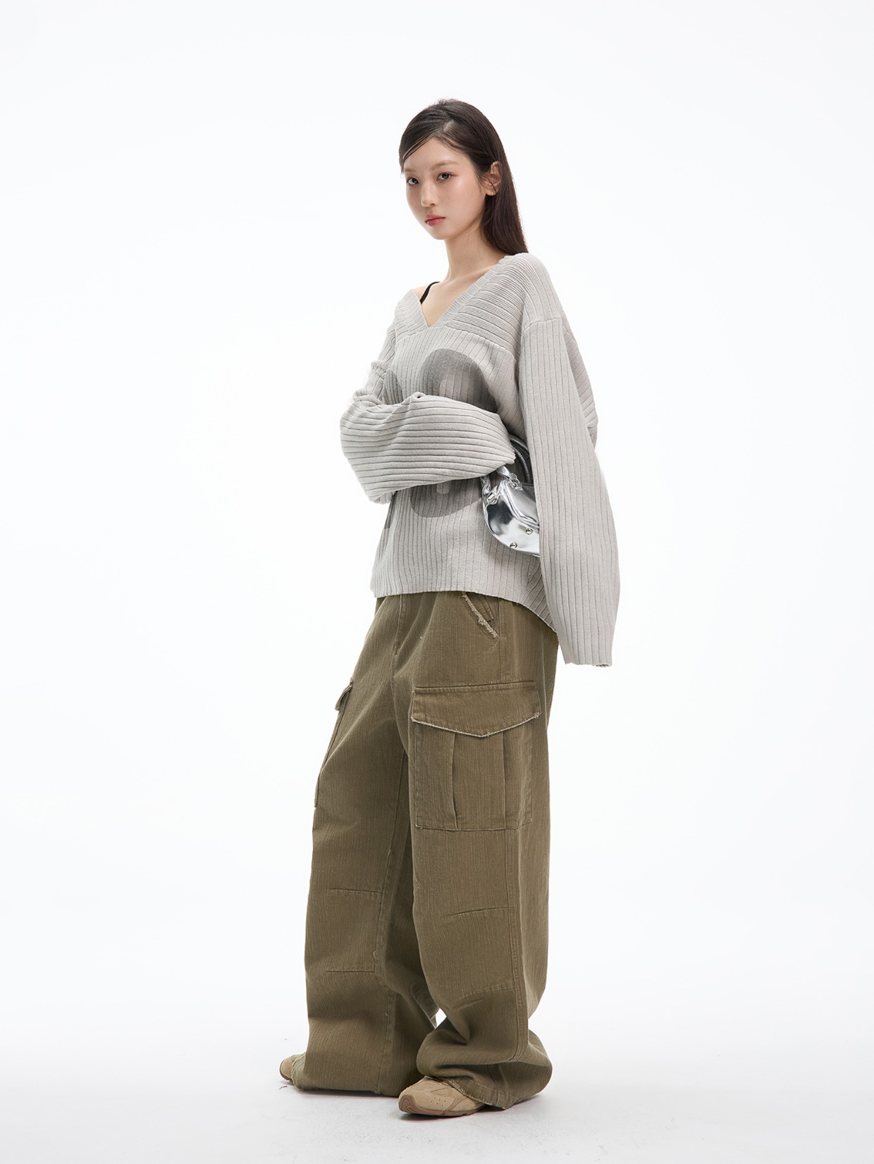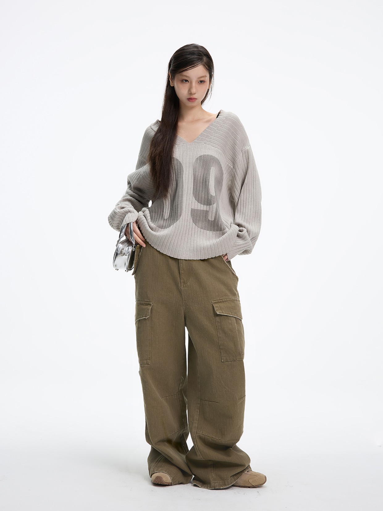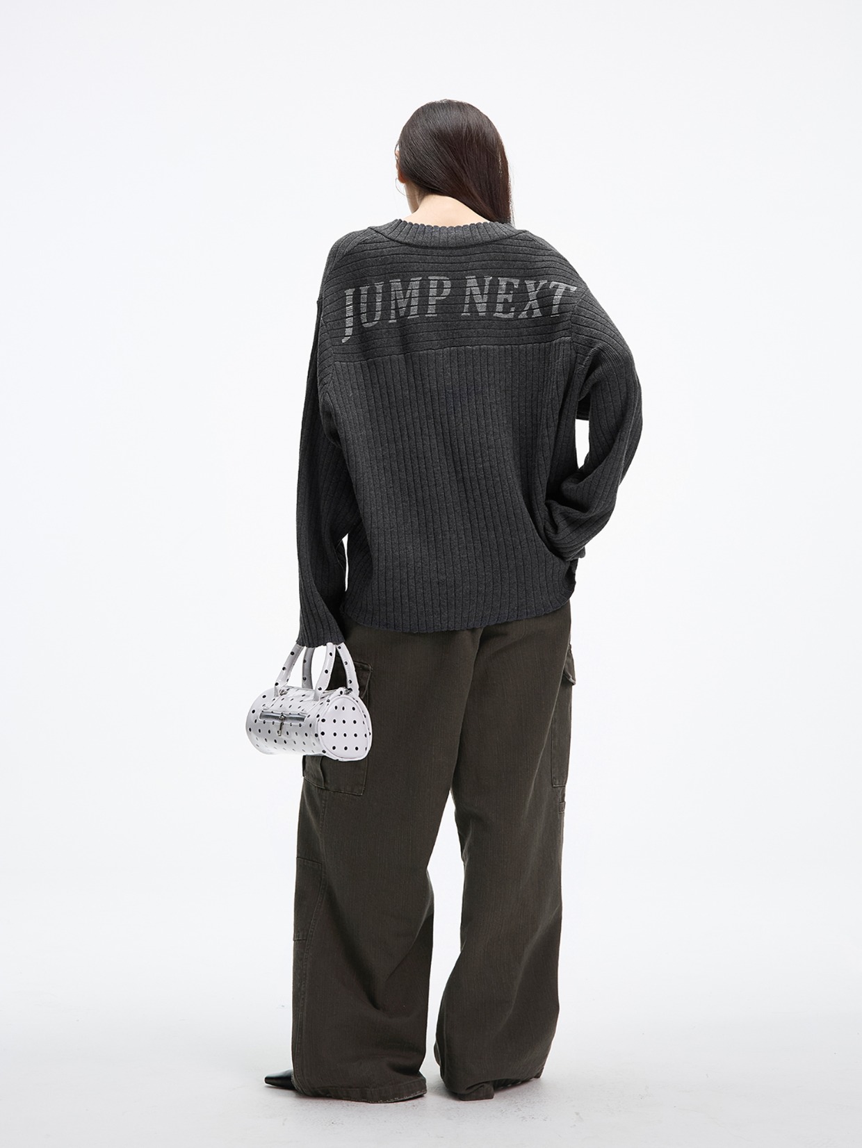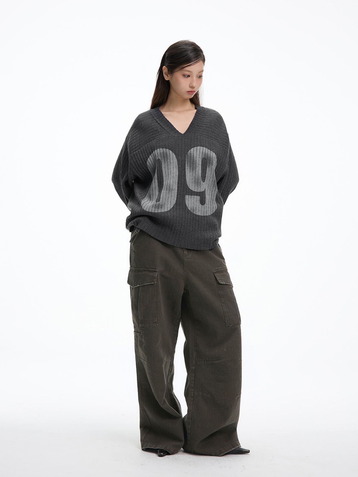 Jumpnext Retro Loose Design Digital Print V-Neck Sweater Knitted Long-Sleeved Jersey Off-Shoulder Top