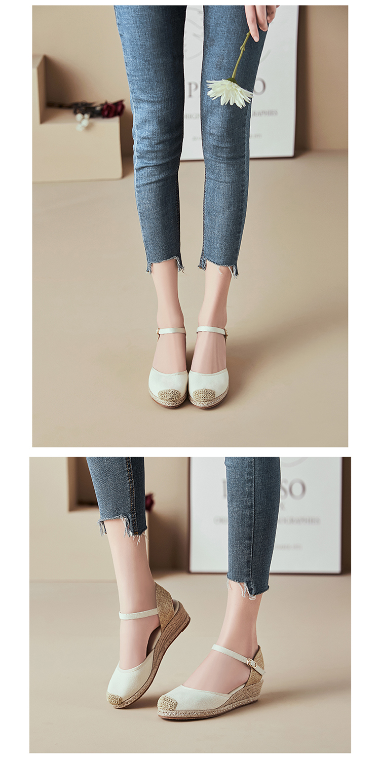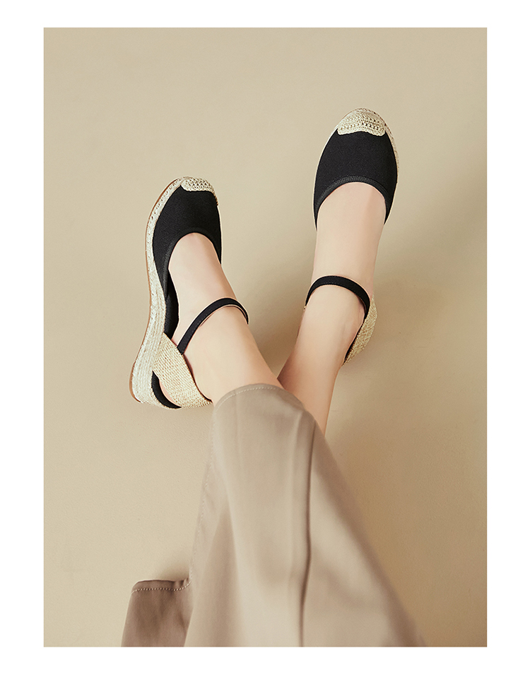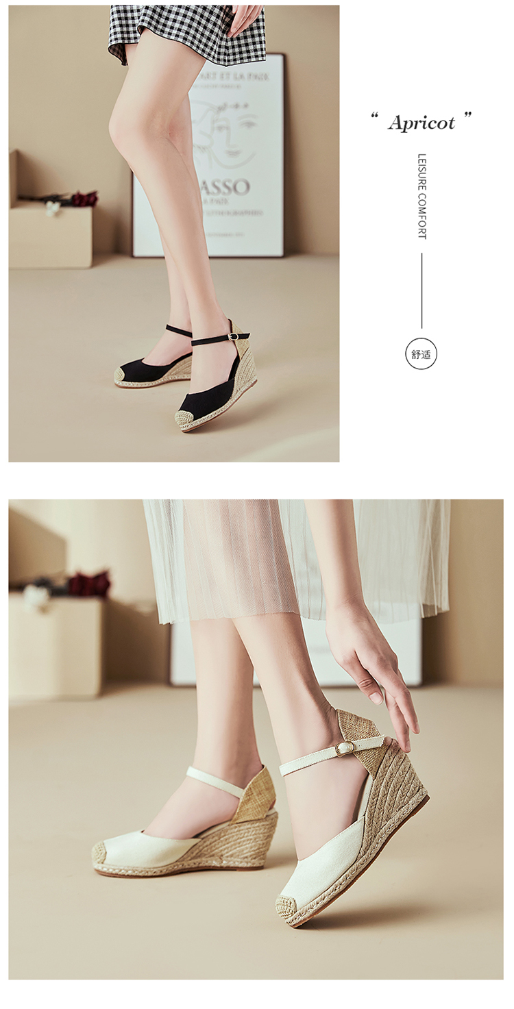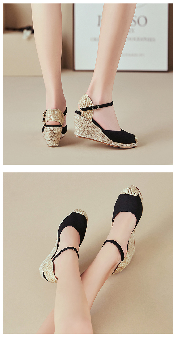 Summer New Style Straw Woven Toe-Cap Chunky Heel High-Heeled French Wedge Height-Increasing Breathable Thick-Soled Canvas Fisherman Sandals for Women Trendy