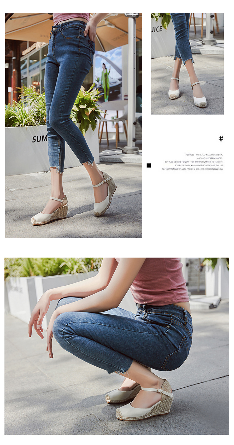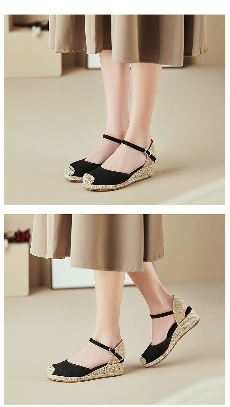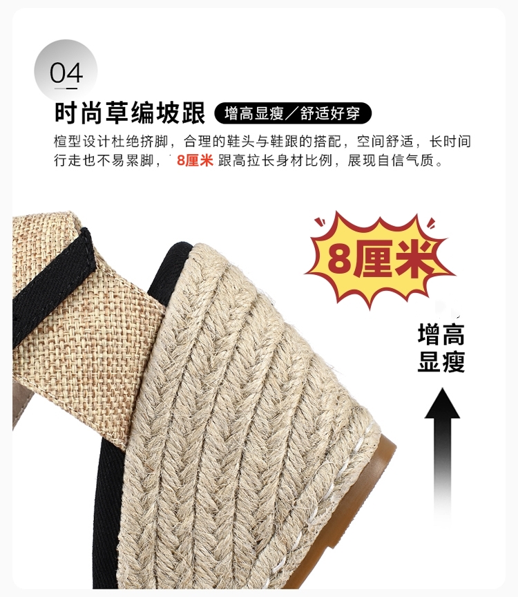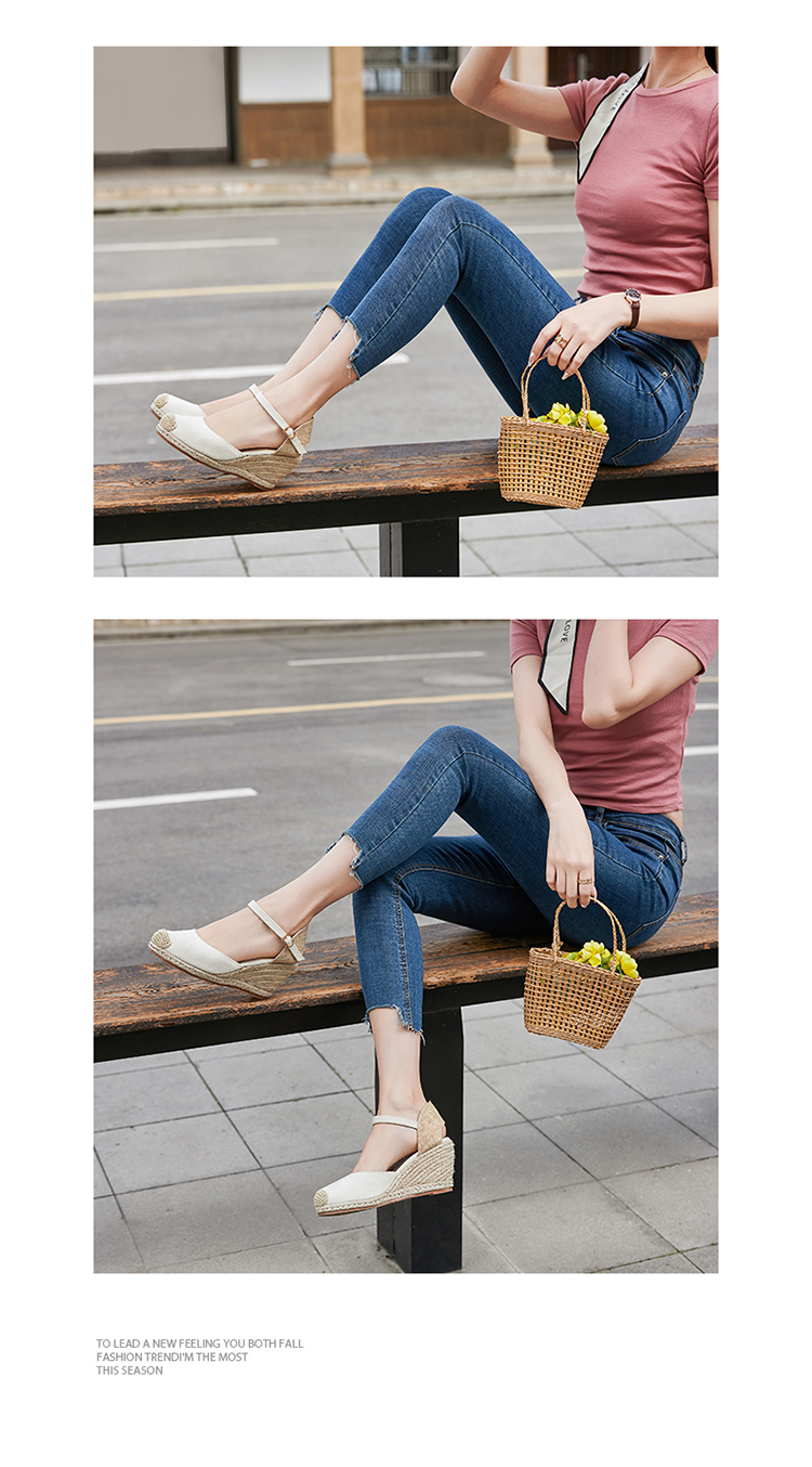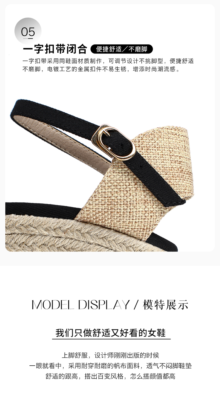 Summer New Style Straw Woven Toe-Cap Chunky Heel High-Heeled French Wedge Height-Increasing Breathable Thick-Soled Canvas Fisherman Sandals for Women Trendy