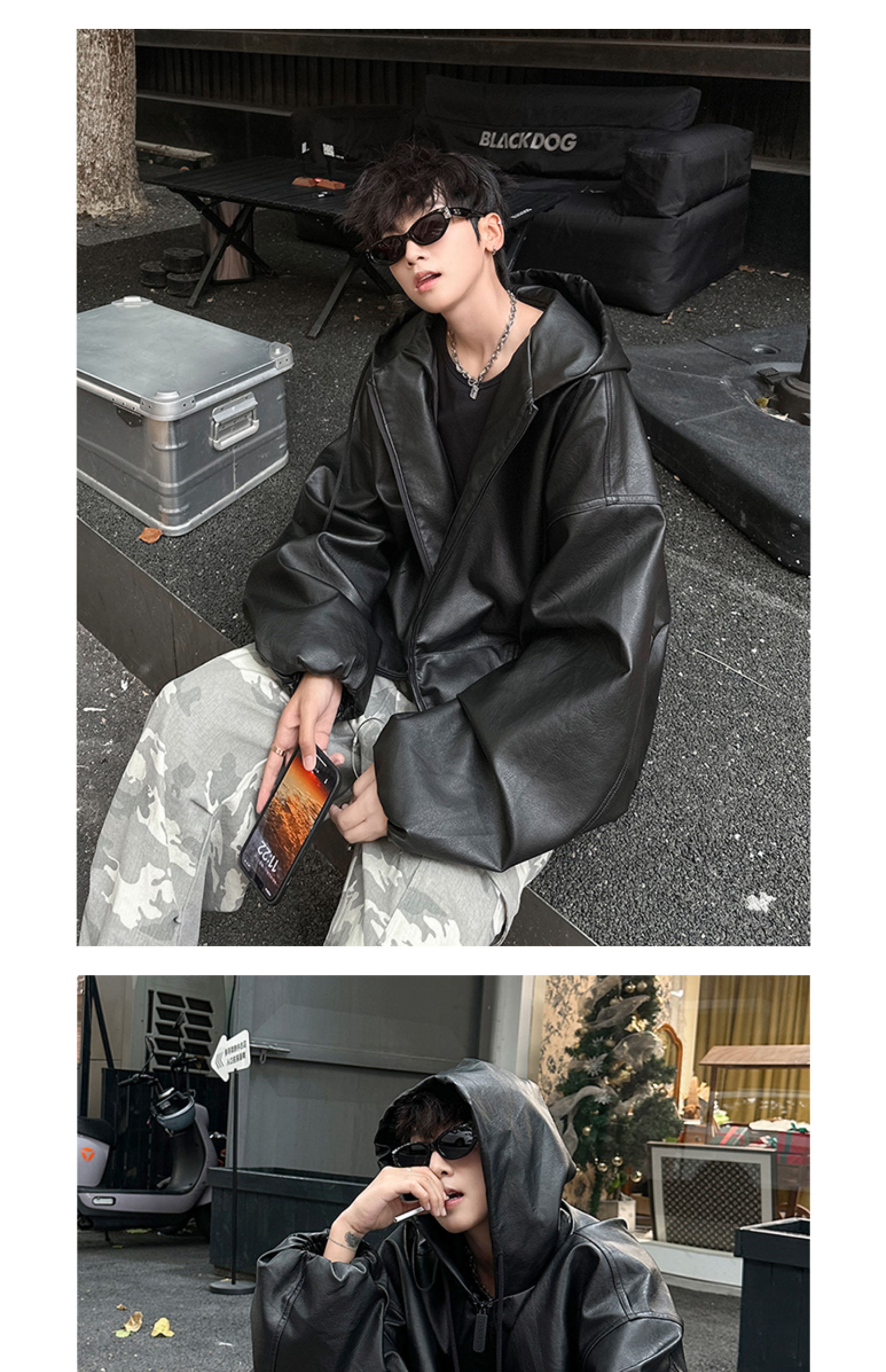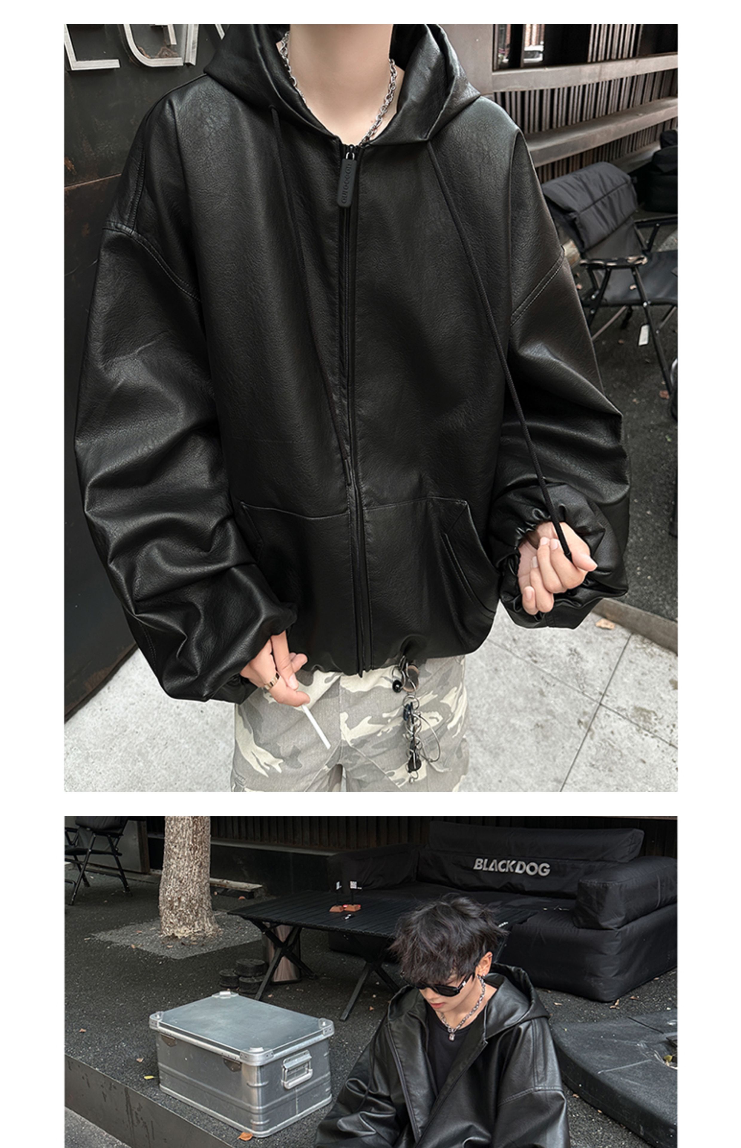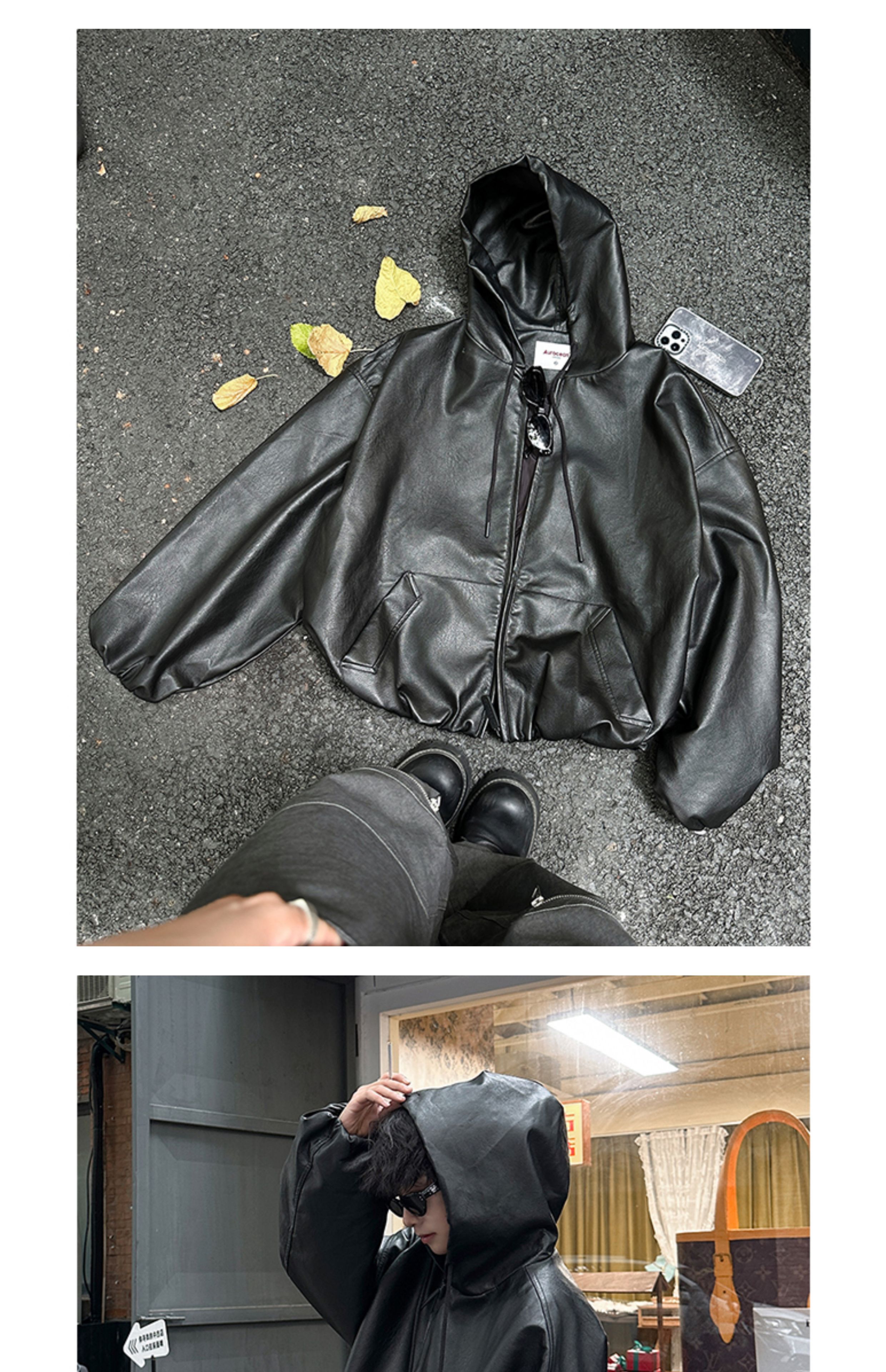 Short Wide Hooded Leather Jacket for Men, Spring and Autumn, Cleanfit American Style, Cool and High-End, Loose Silhouette Pu Leather Jacket