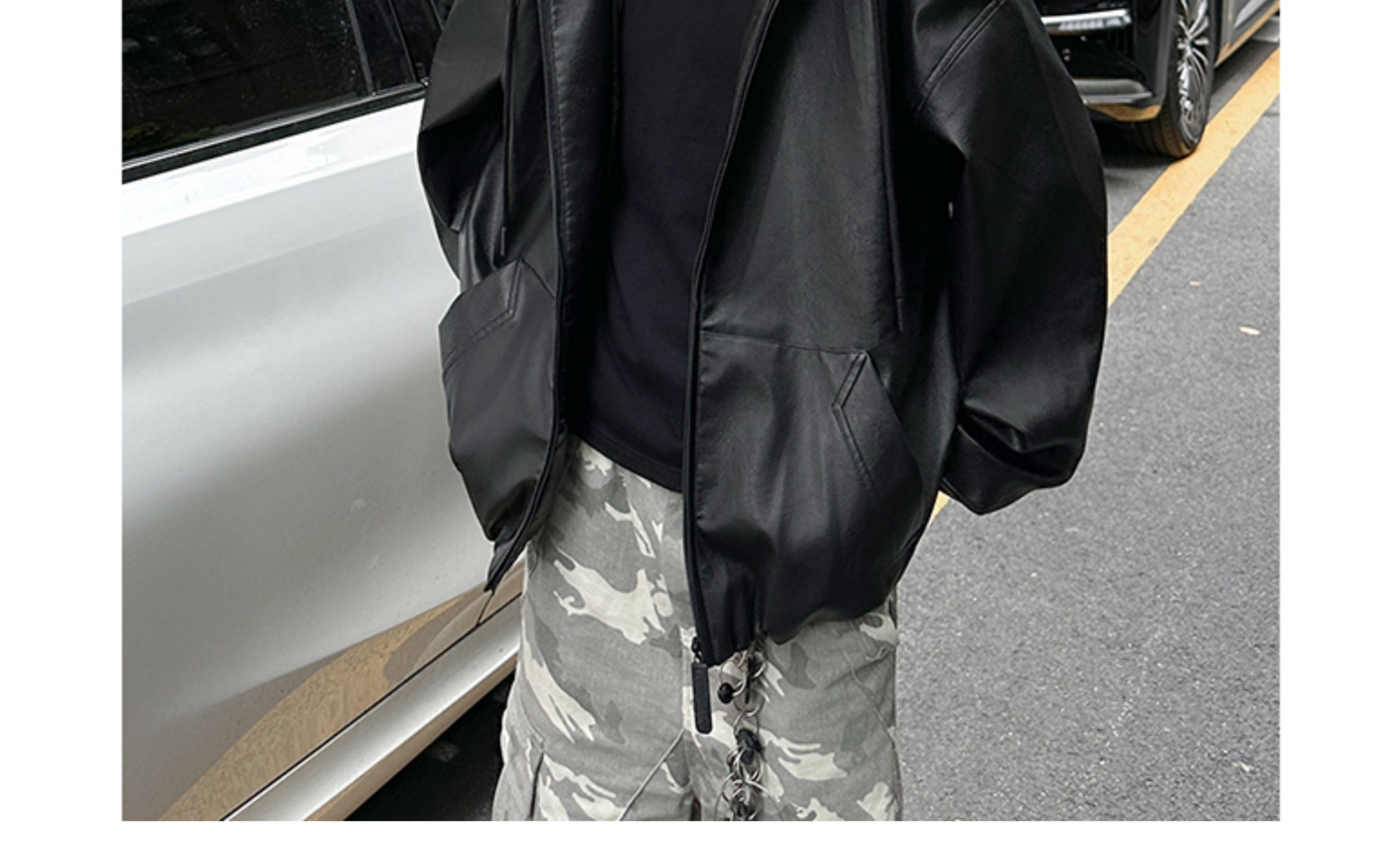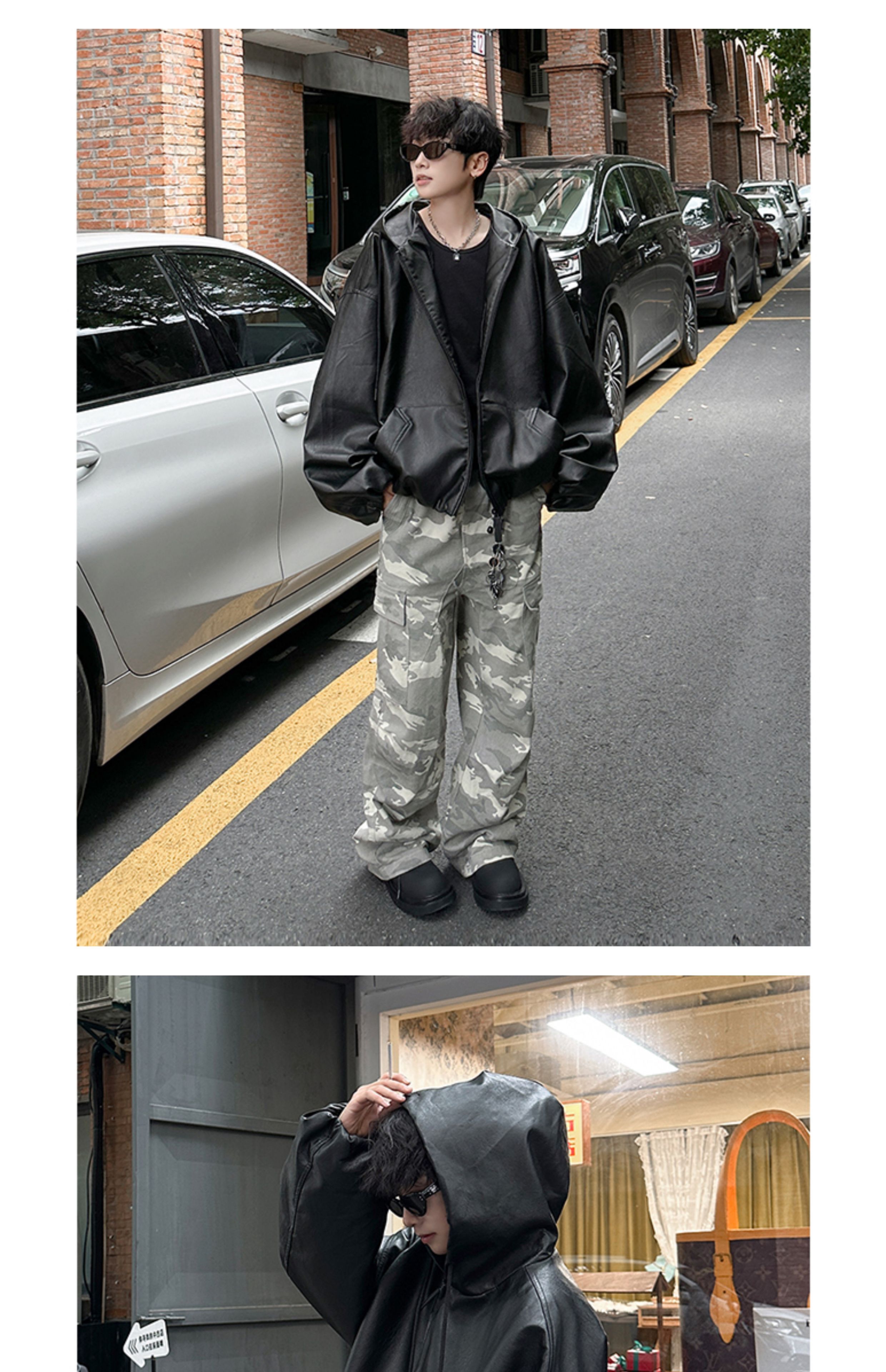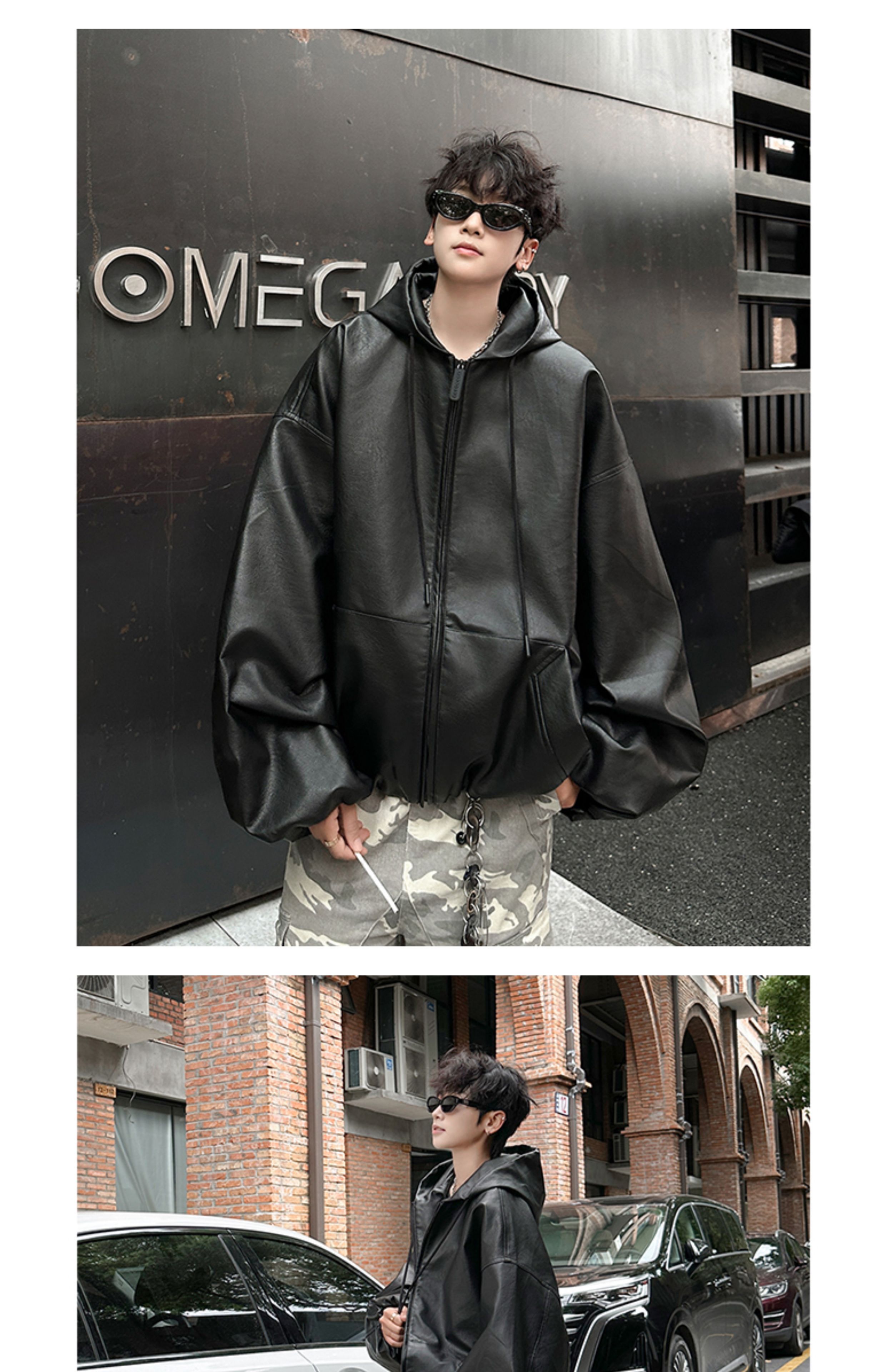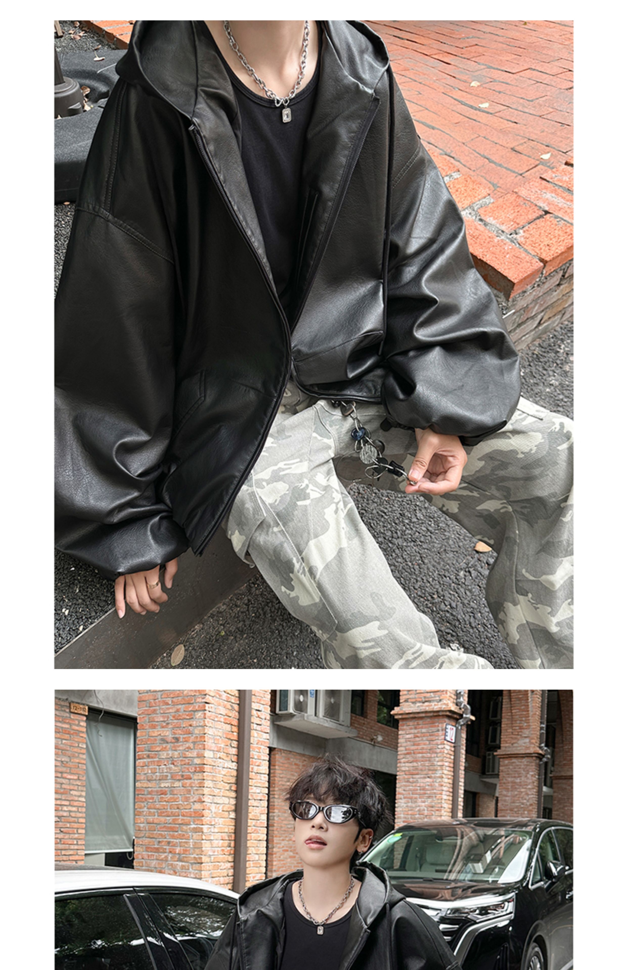 Short Wide Hooded Leather Jacket for Men, Spring and Autumn, Cleanfit American Style, Cool and High-End, Loose Silhouette Pu Leather Jacket