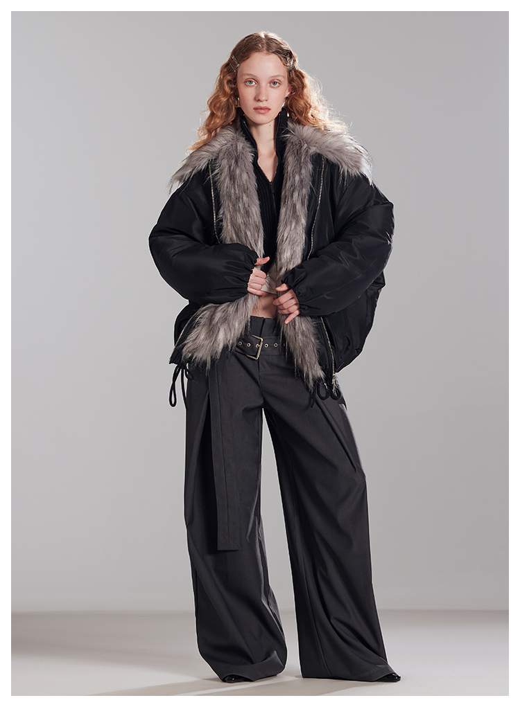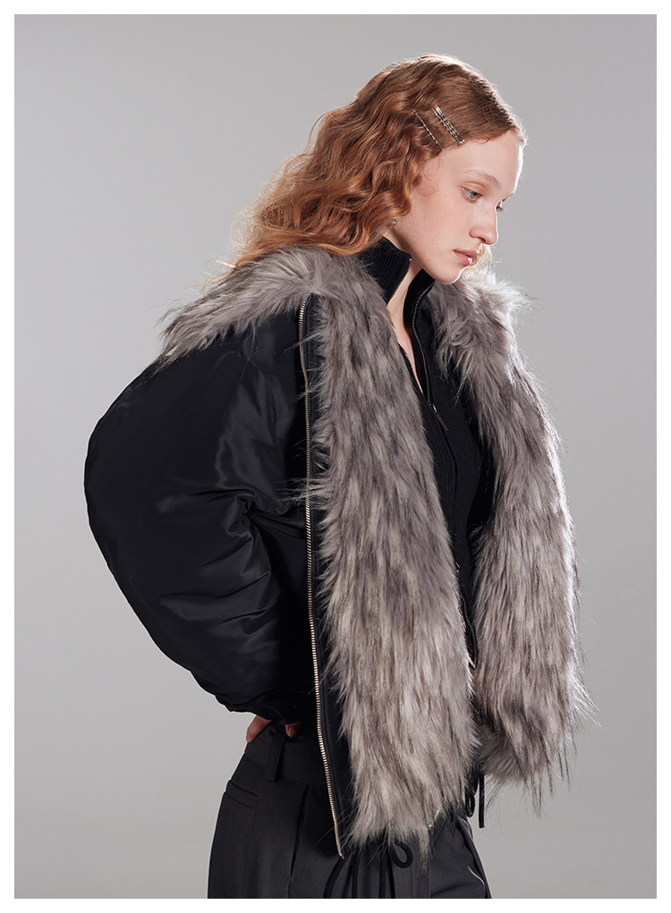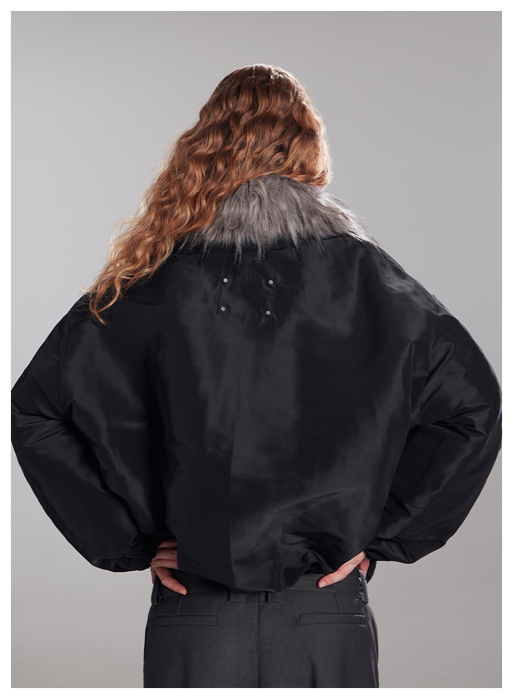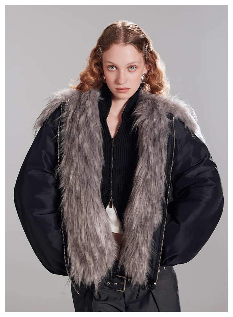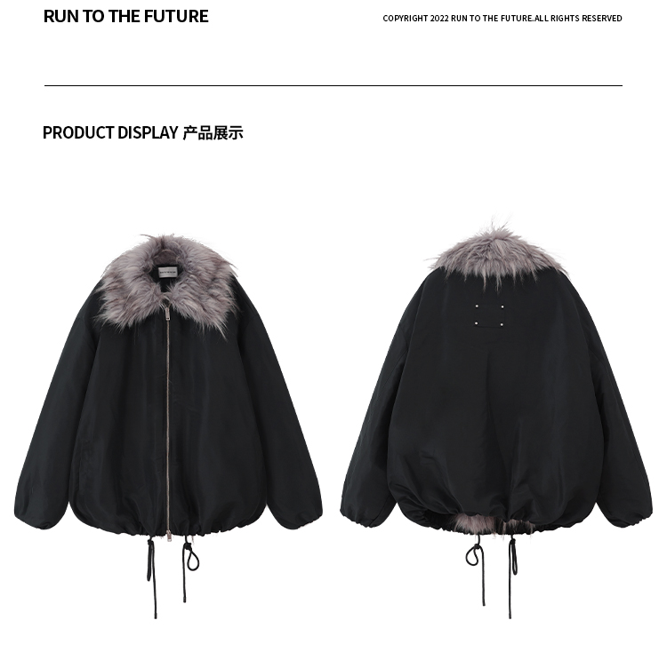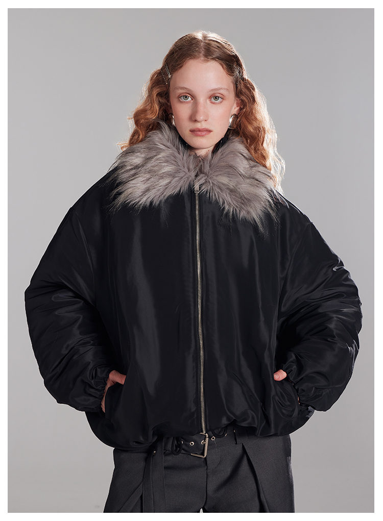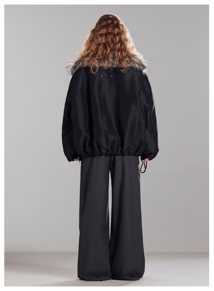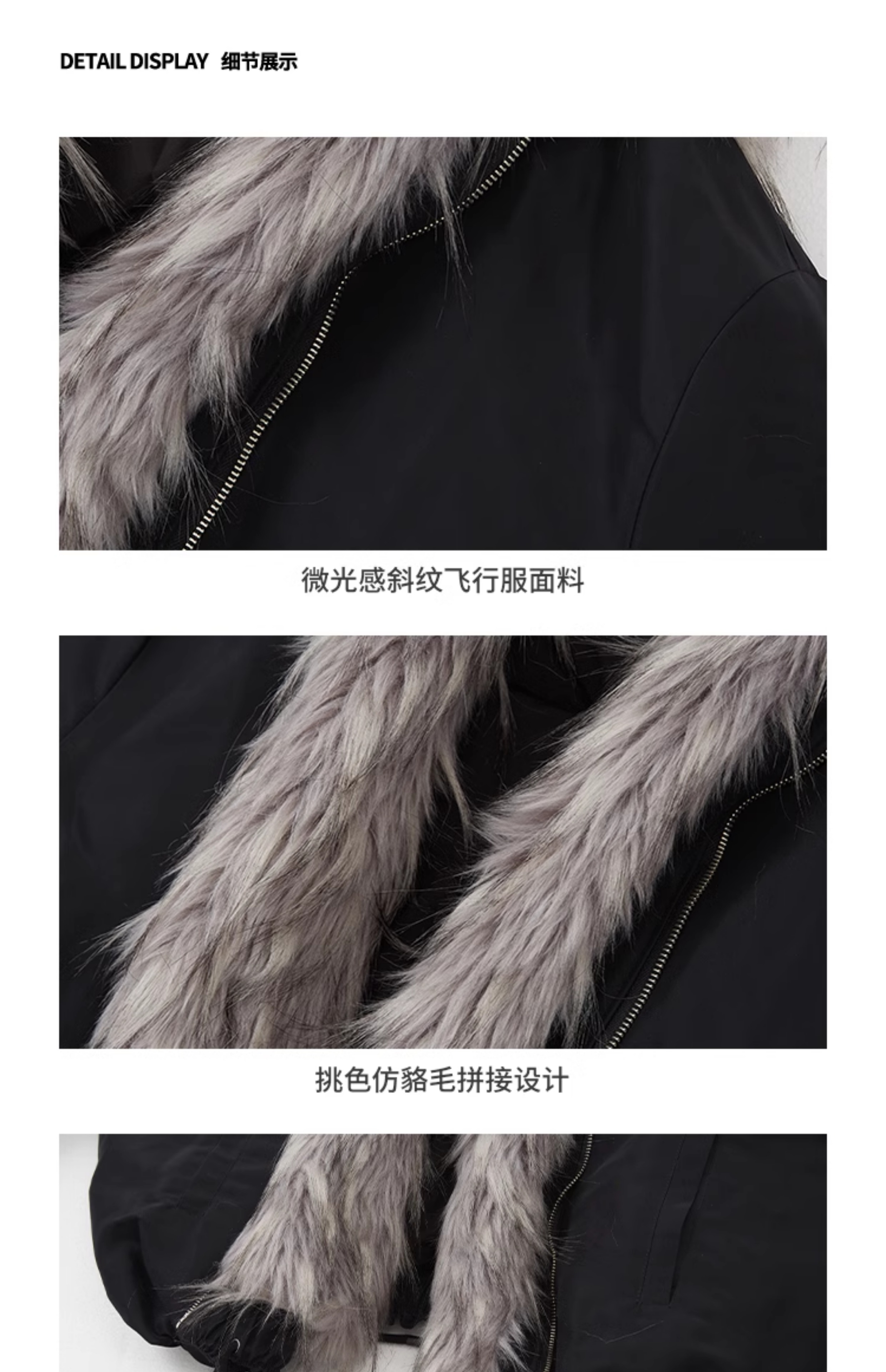 Original Black Shimmer Parka for Women, Winter Mixed-Color Cotton Coat, Faux Raccoon Fur Thickened Cotton Jacket