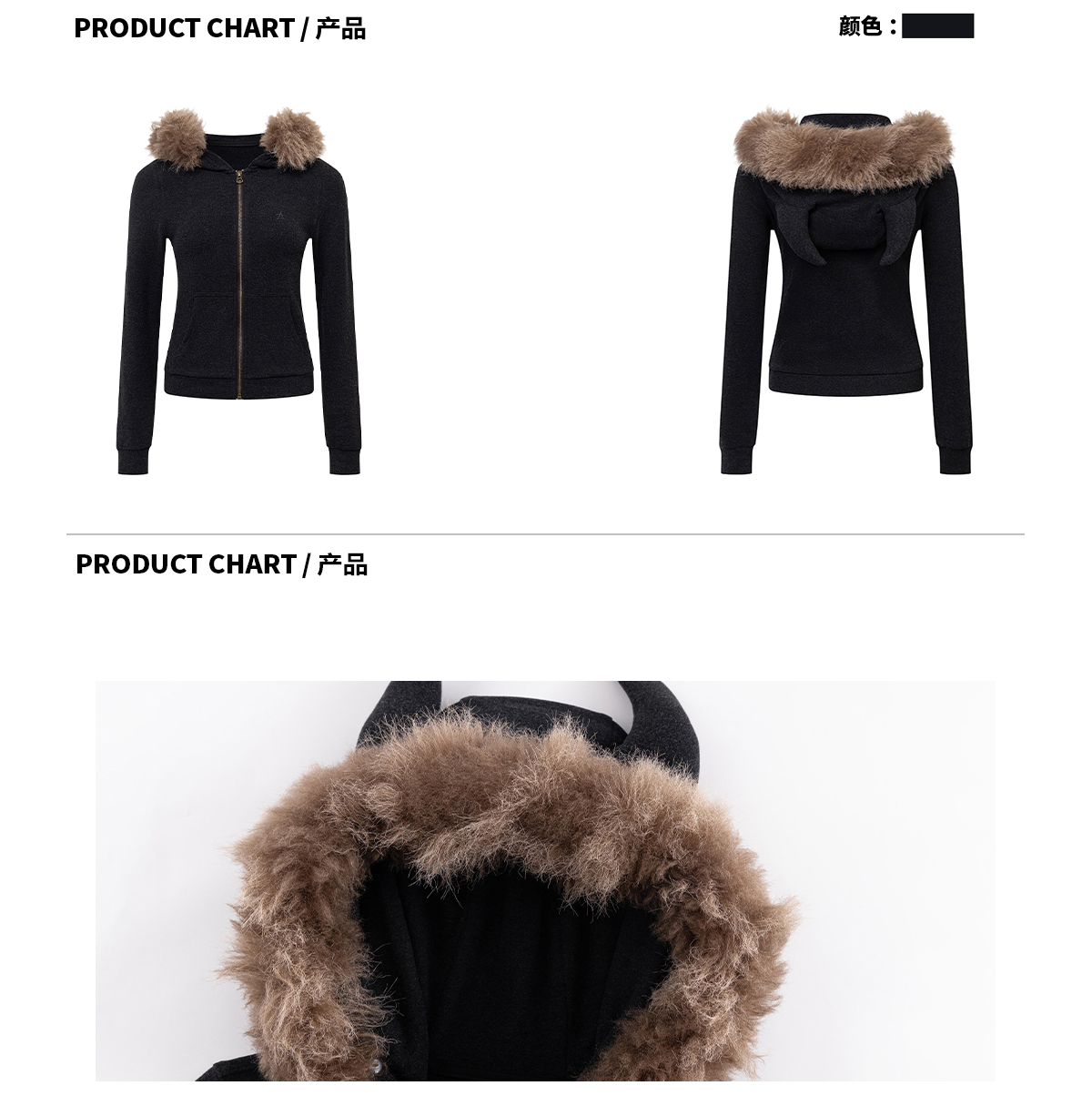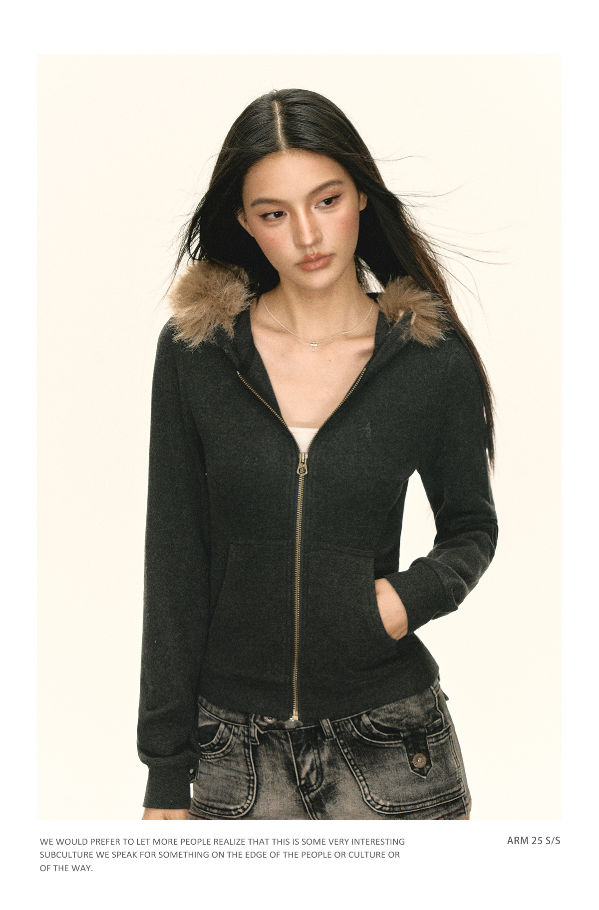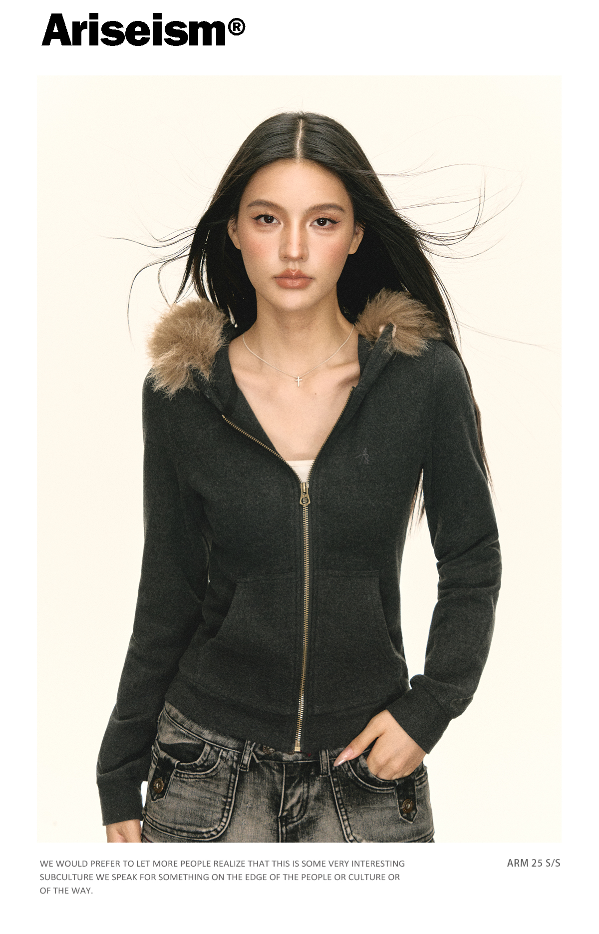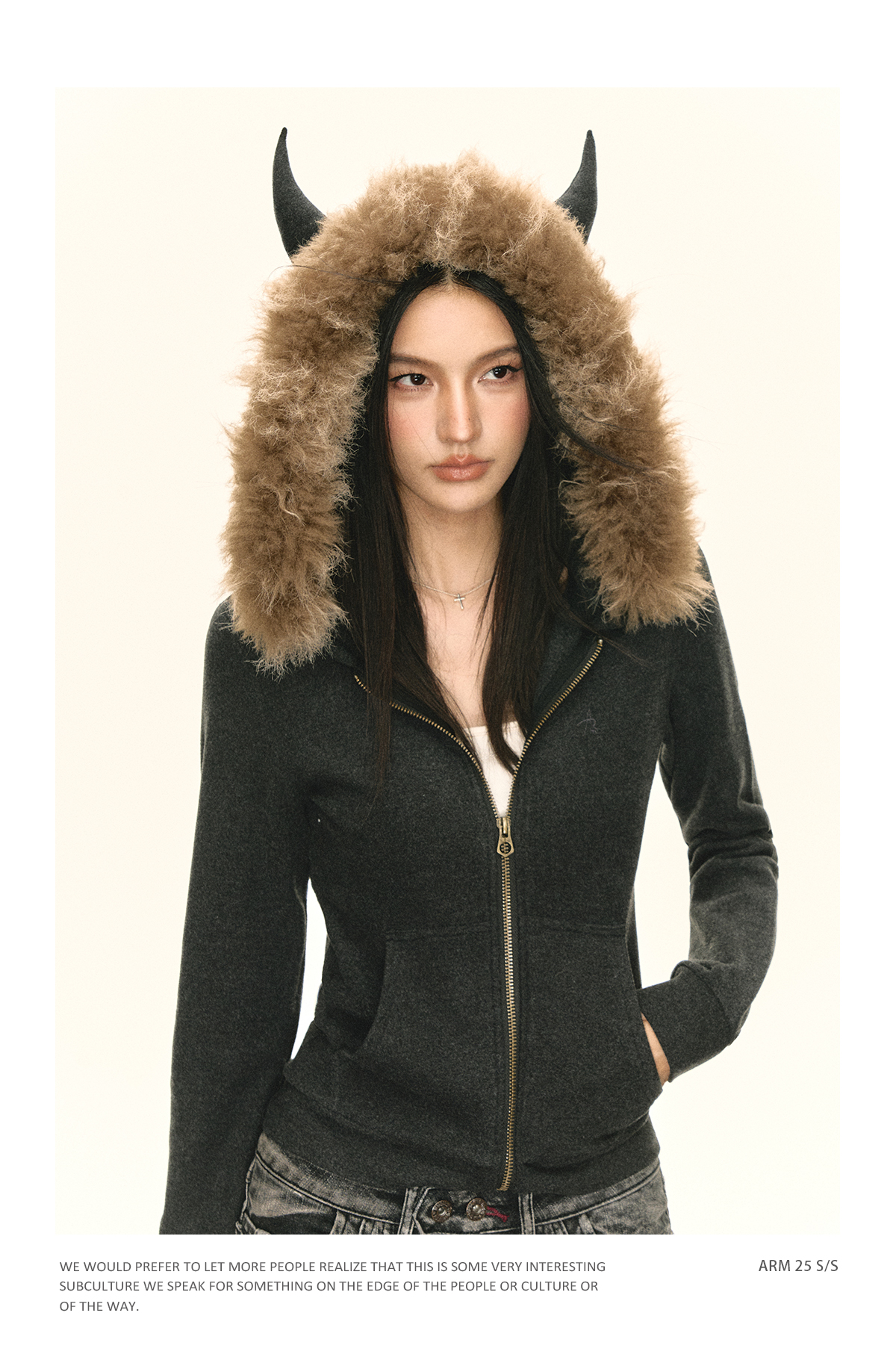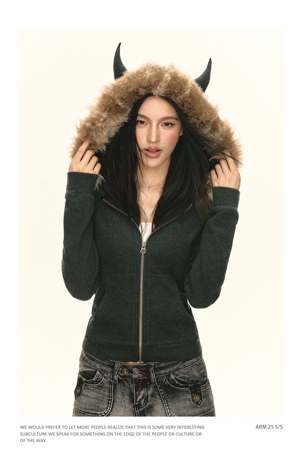 Ariseism American Retro Detachable Fur Collar Little Devil Hooded Sweatshirt Jacket Women's Autumn Short Top