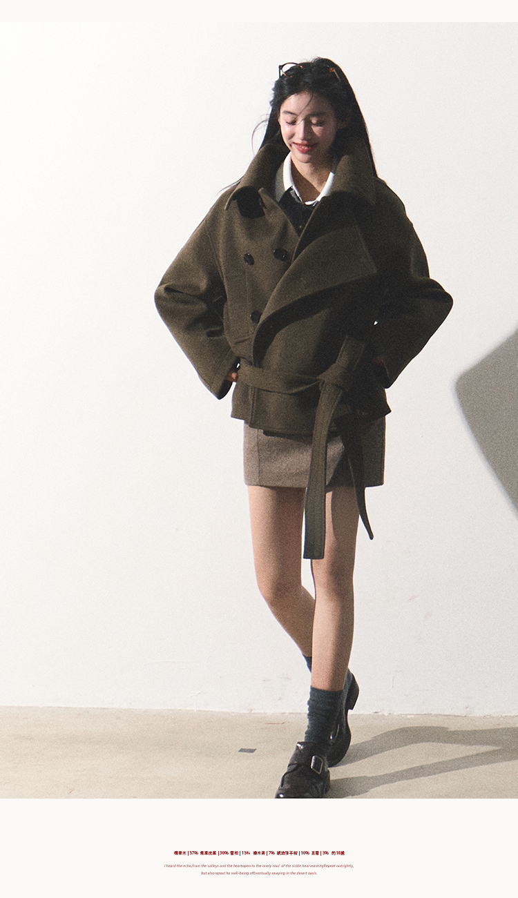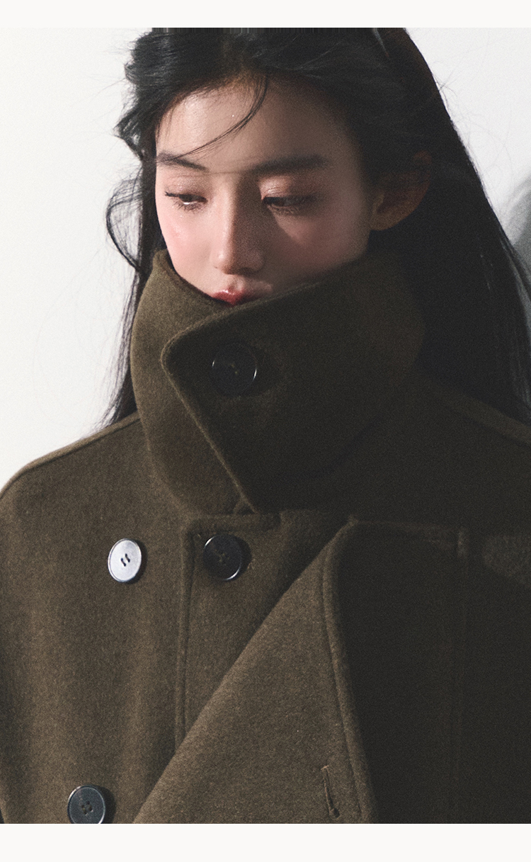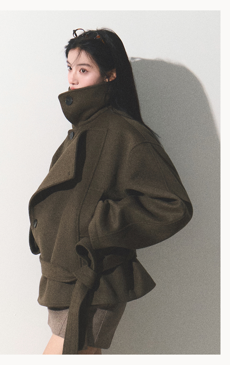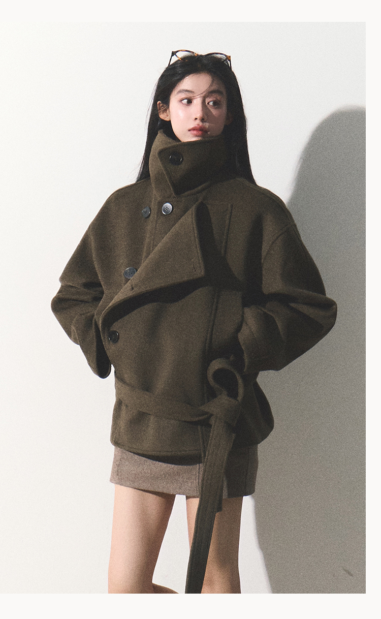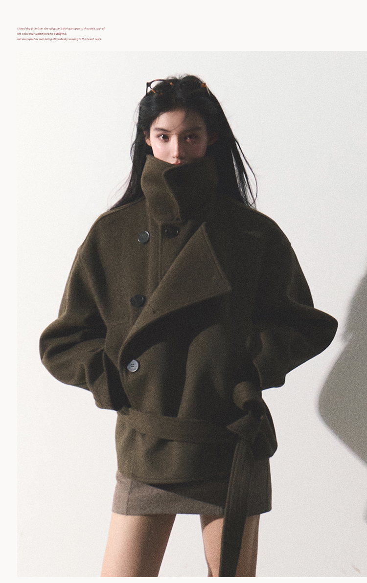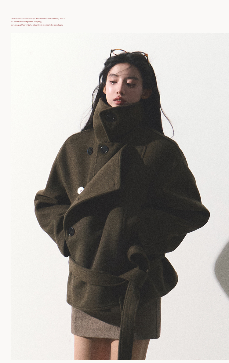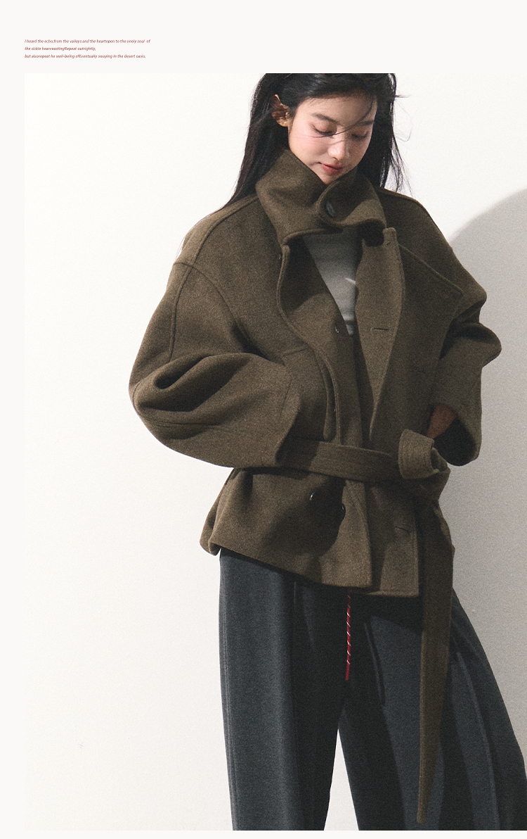 Oakmoo/ "Flowers Are in Full Bloom" Wool Stand-Up Collar Coat for Women, Winter Double-Breasted Short Waist-Cinching Woolen Coat