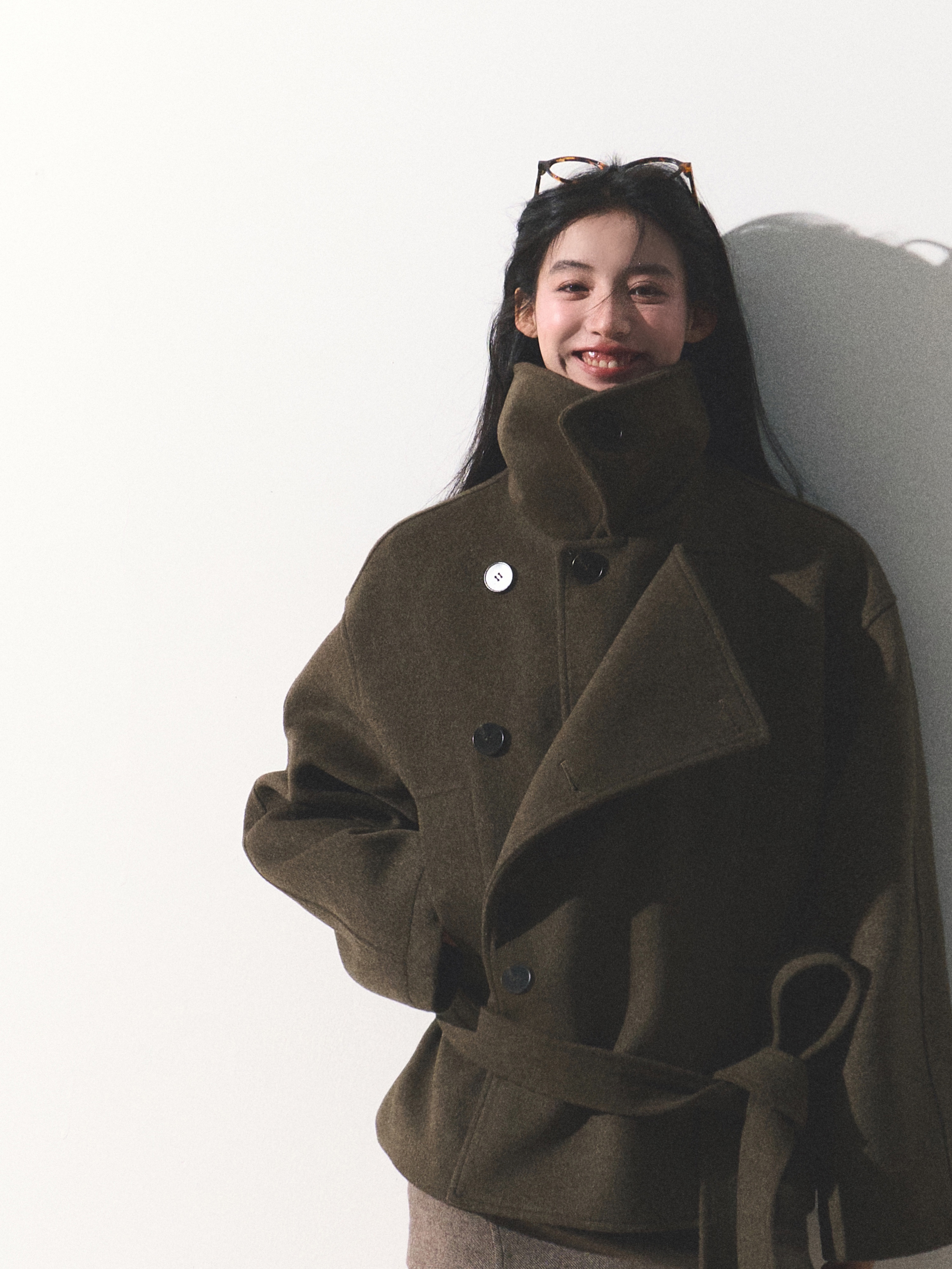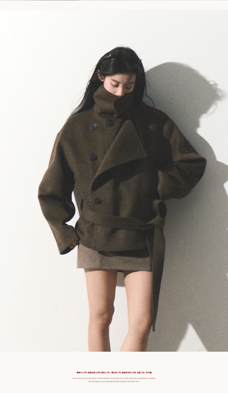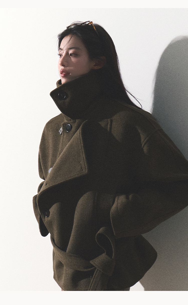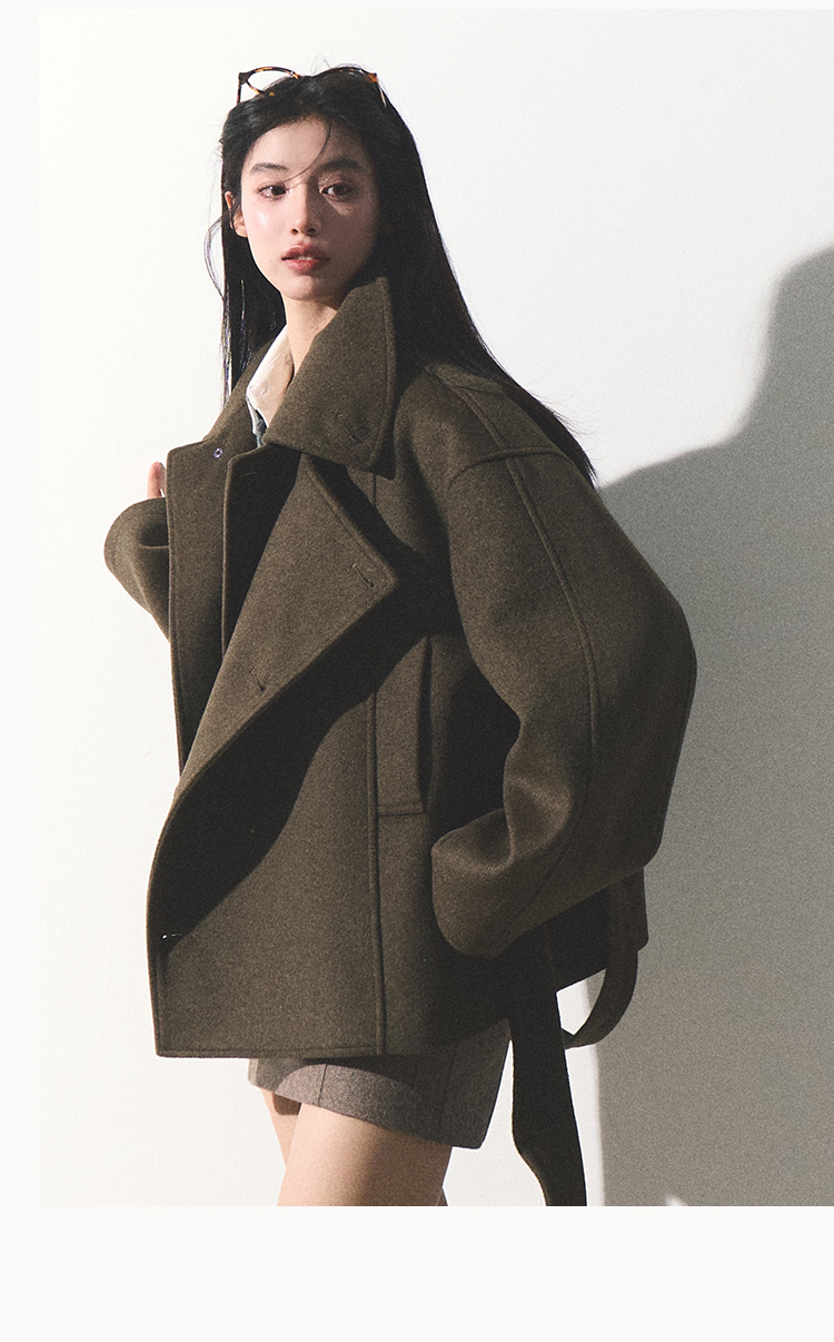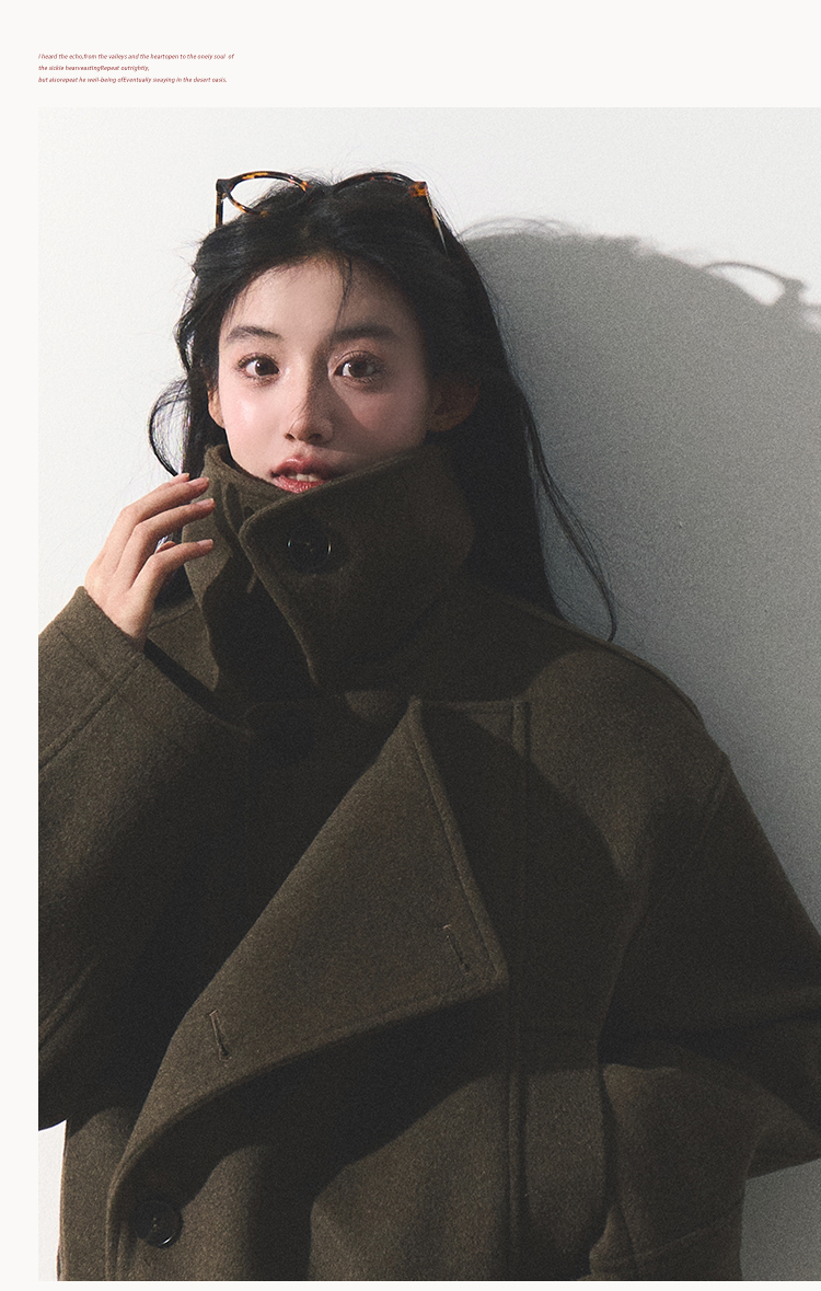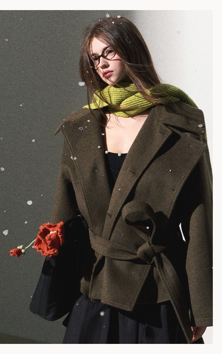 Oakmoo/ "Flowers Are in Full Bloom" Wool Stand-Up Collar Coat for Women, Winter Double-Breasted Short Waist-Cinching Woolen Coat