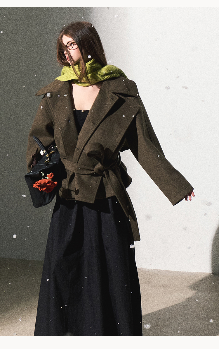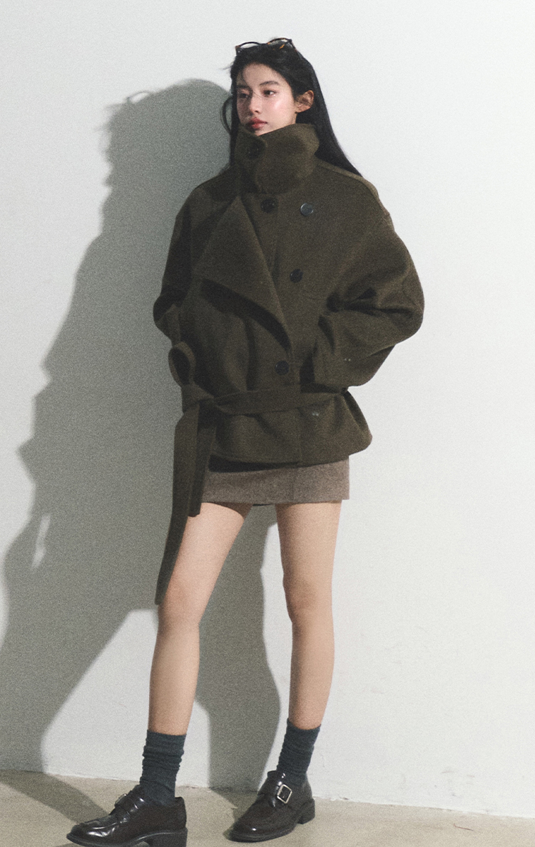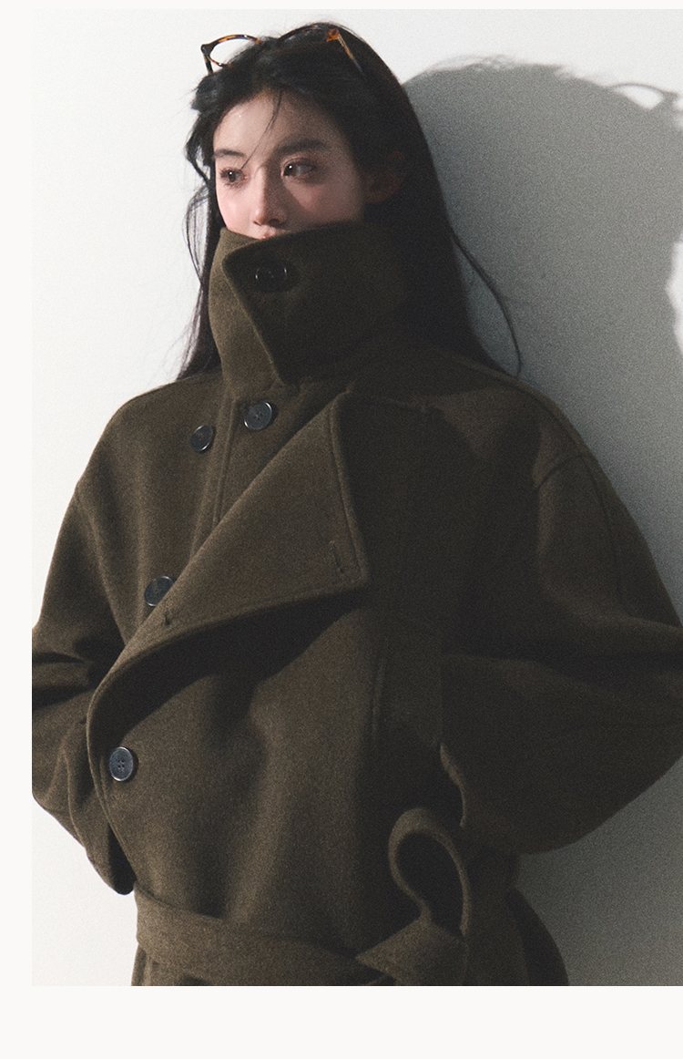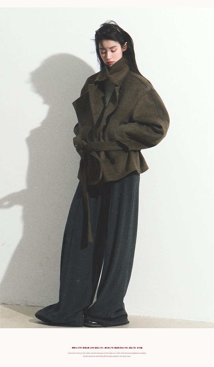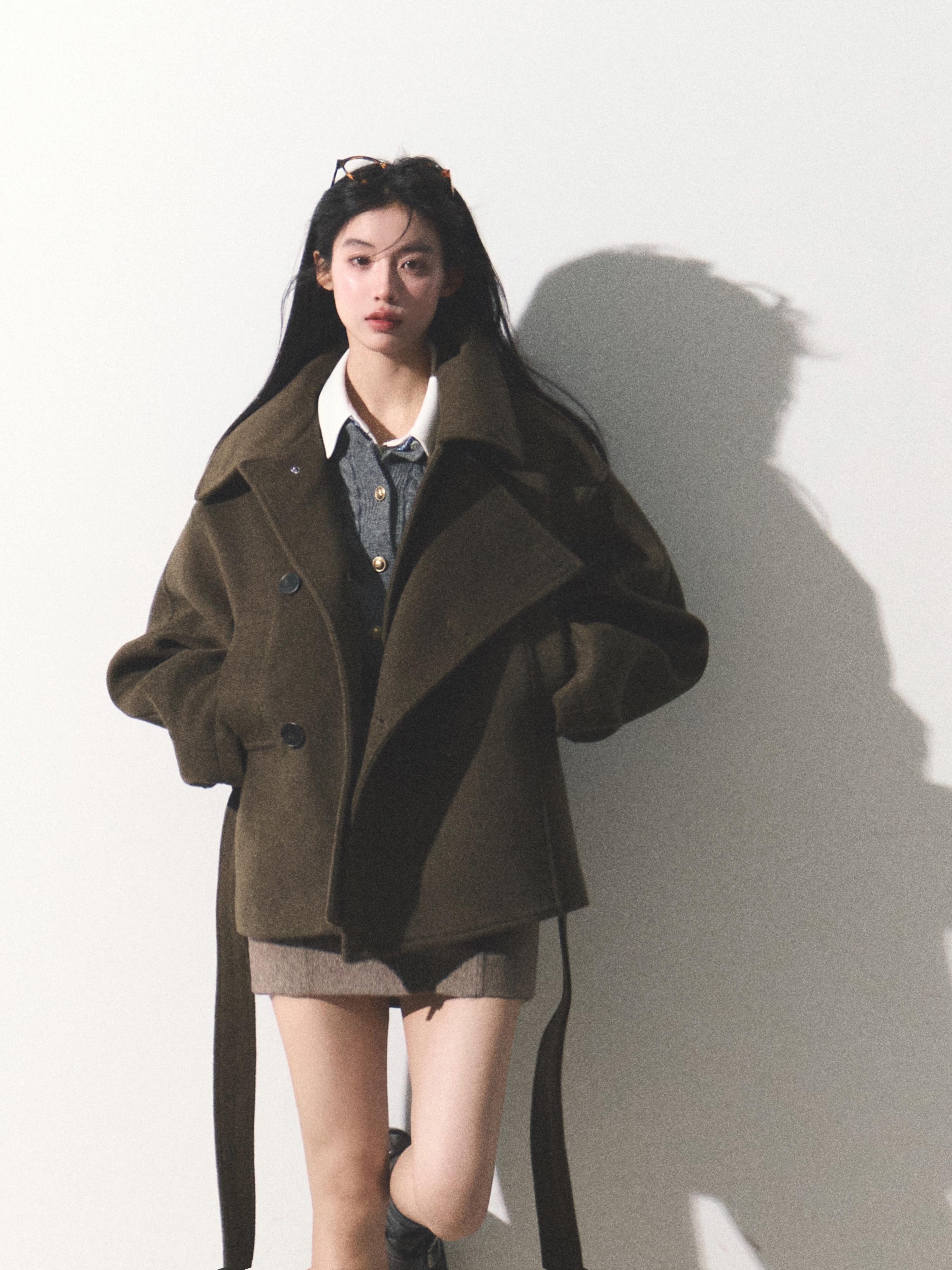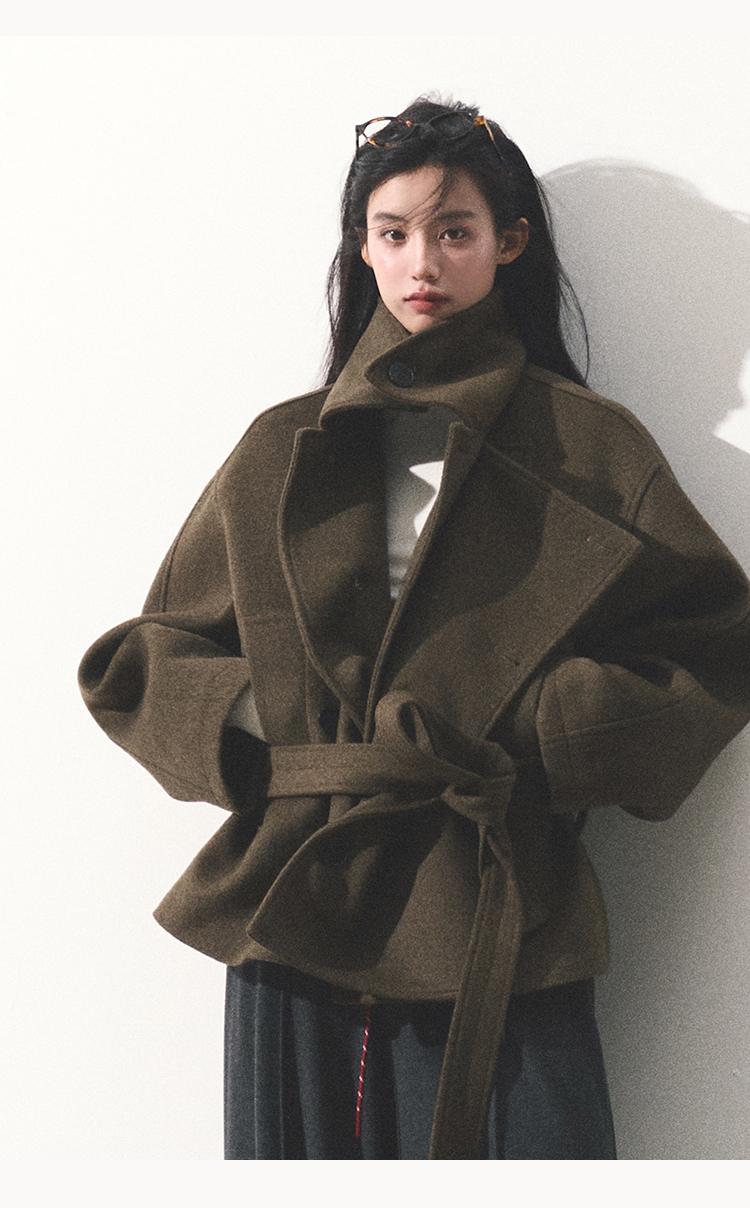 Oakmoo/ "Flowers Are in Full Bloom" Wool Stand-Up Collar Coat for Women, Winter Double-Breasted Short Waist-Cinching Woolen Coat