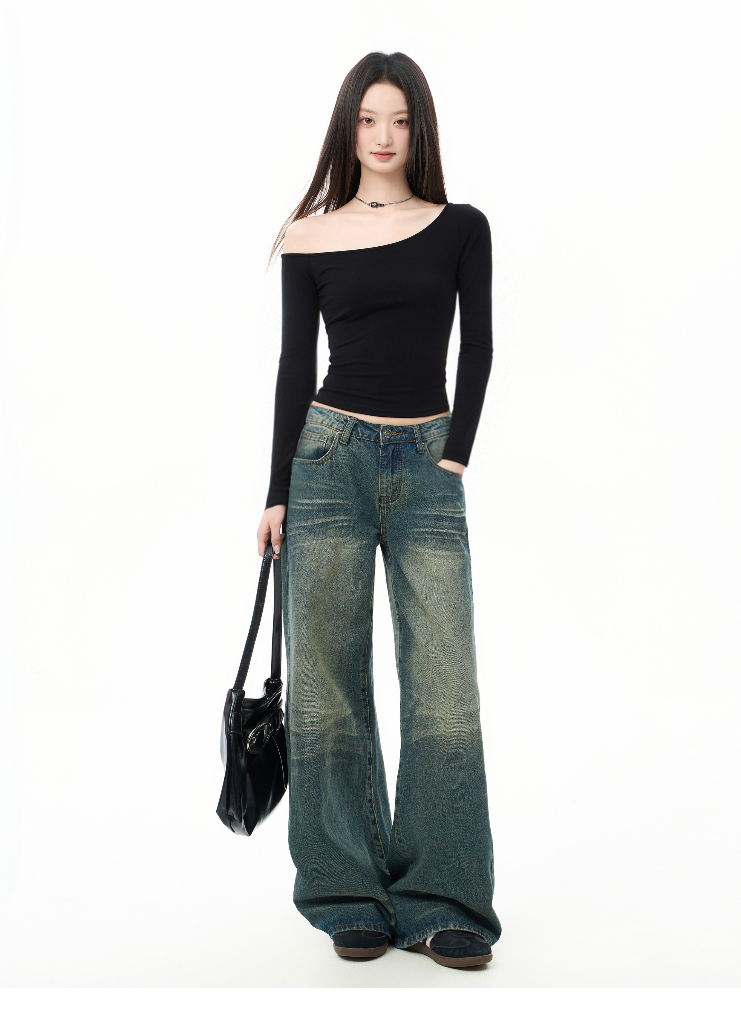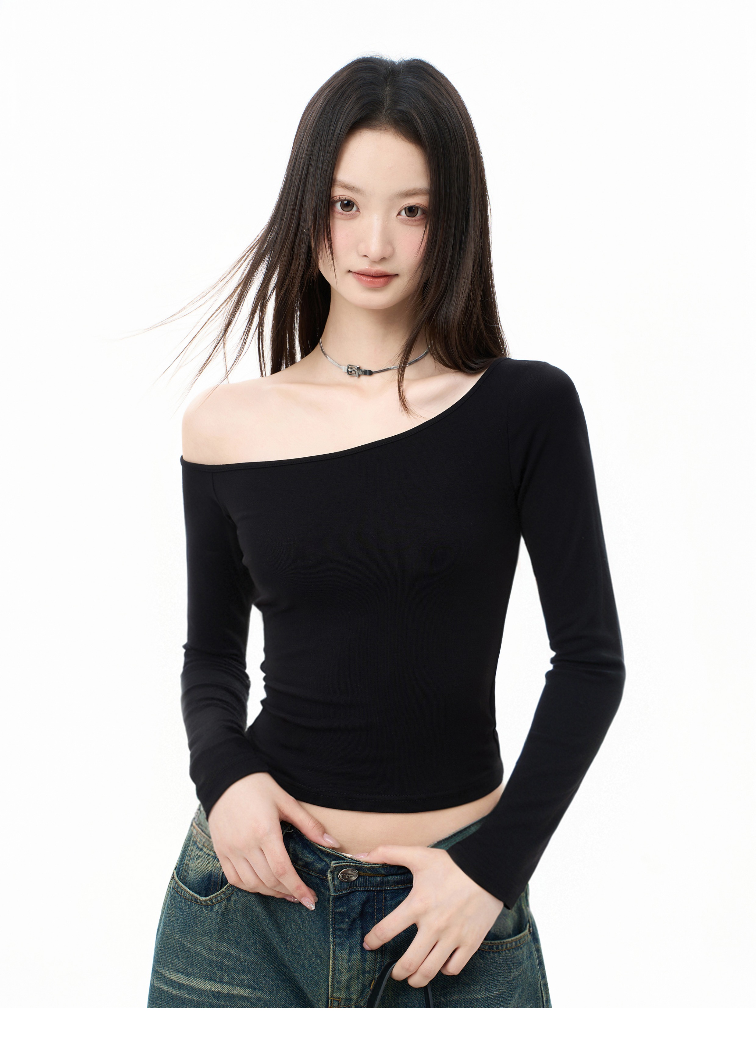 Iiiamx Black Off-Shoulder Long-Sleeve T-Shirt for Women, Autumn Slim-Fit Inner Wear, Trendy Base Shirt, 2025 New Model