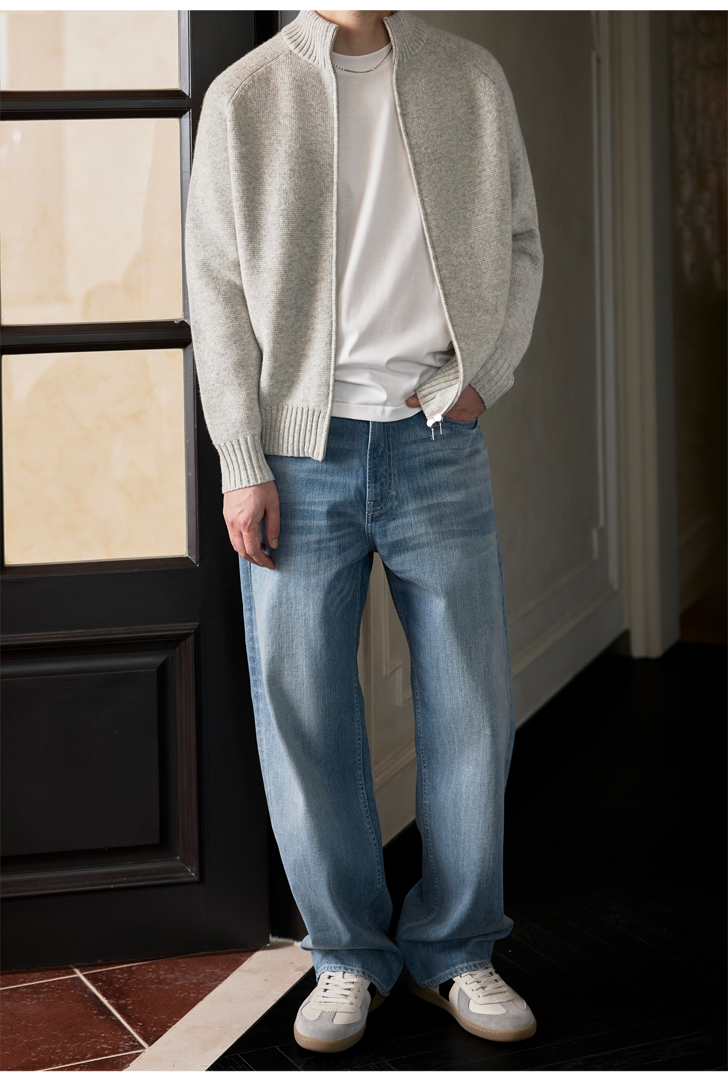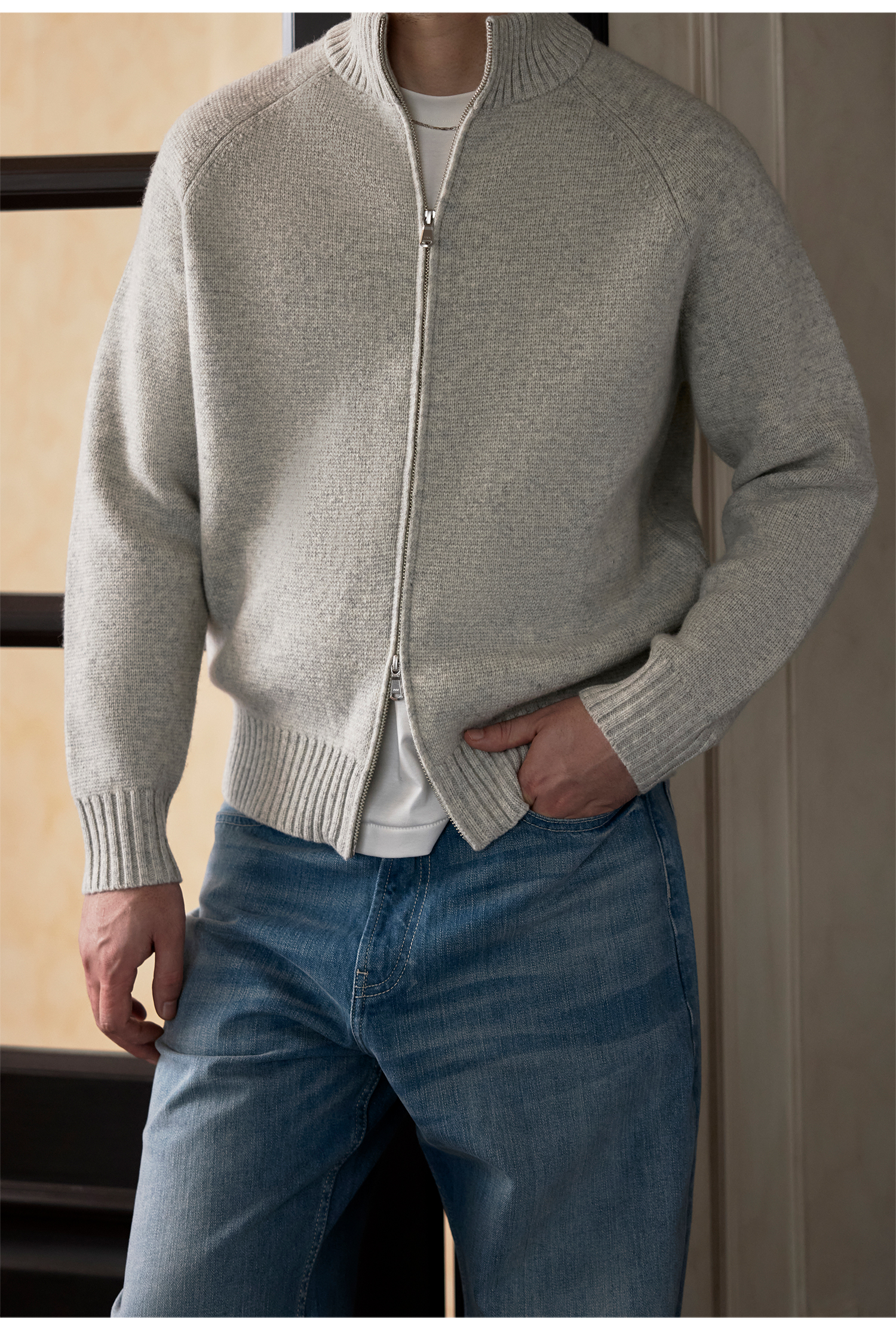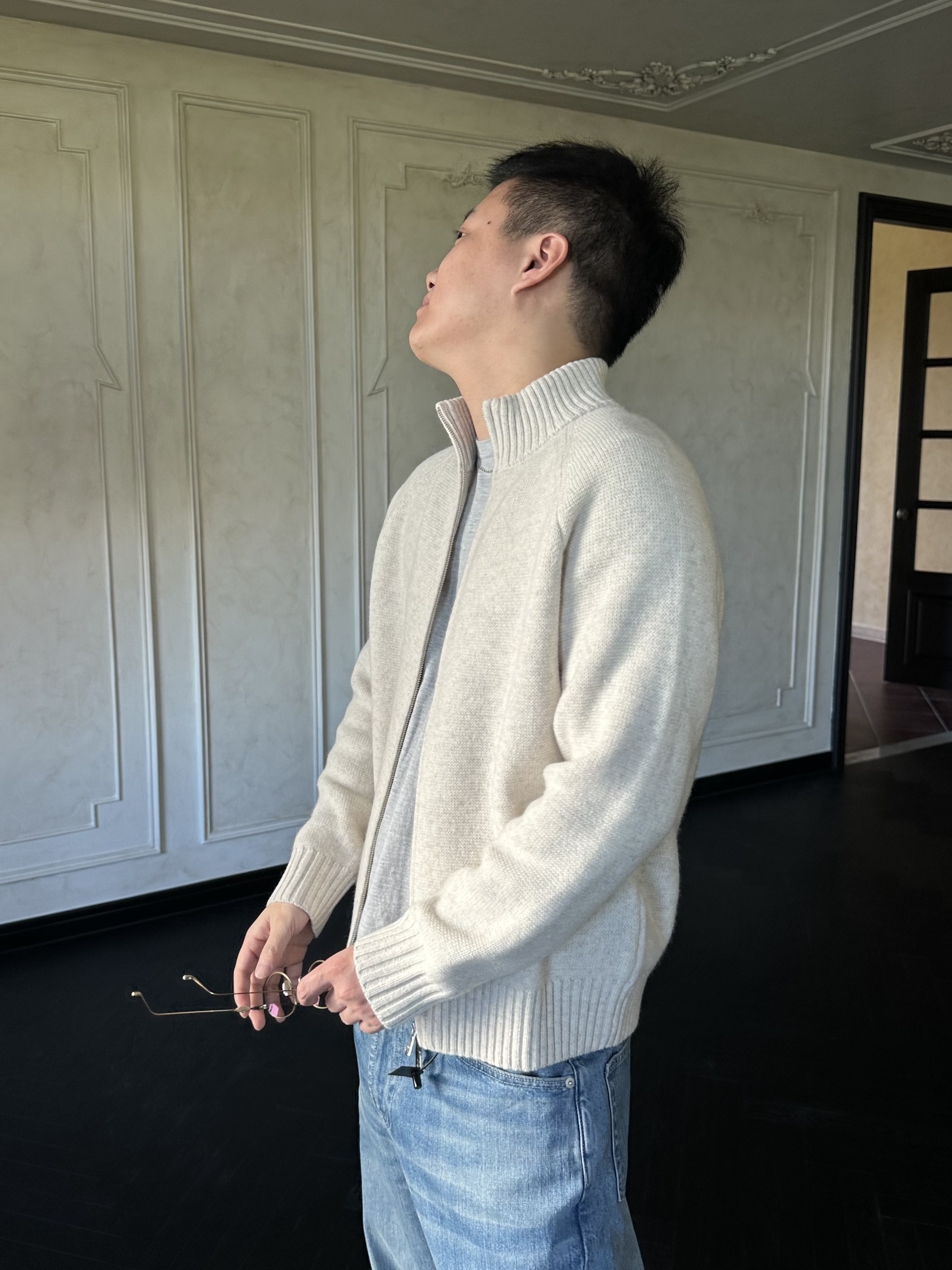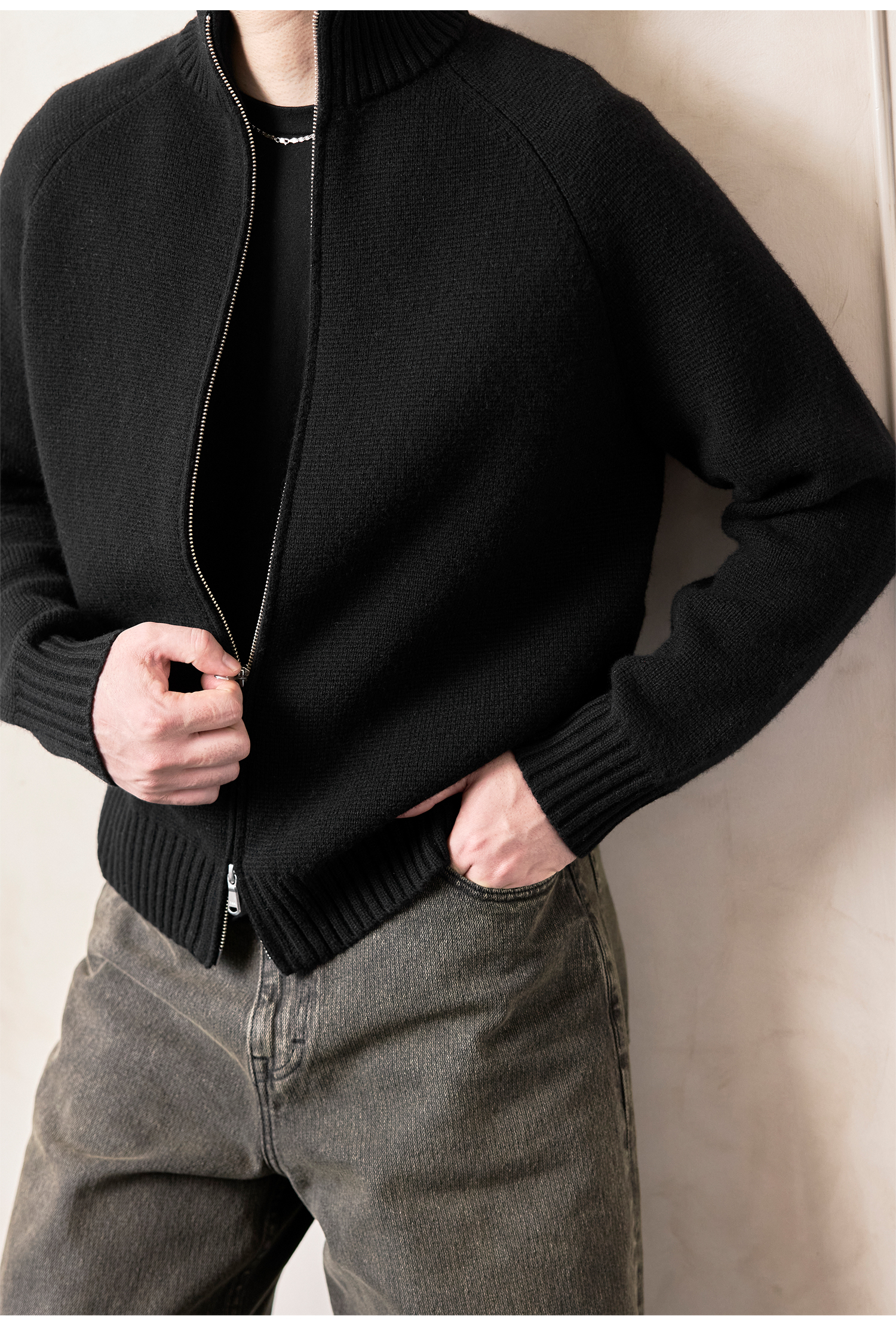 Roolrren 100% Wool Cloud Pattern [Versatile for Commuting and Practical to Wear] Sweater Knit Stand Collar Zipper Cardigan Jacket