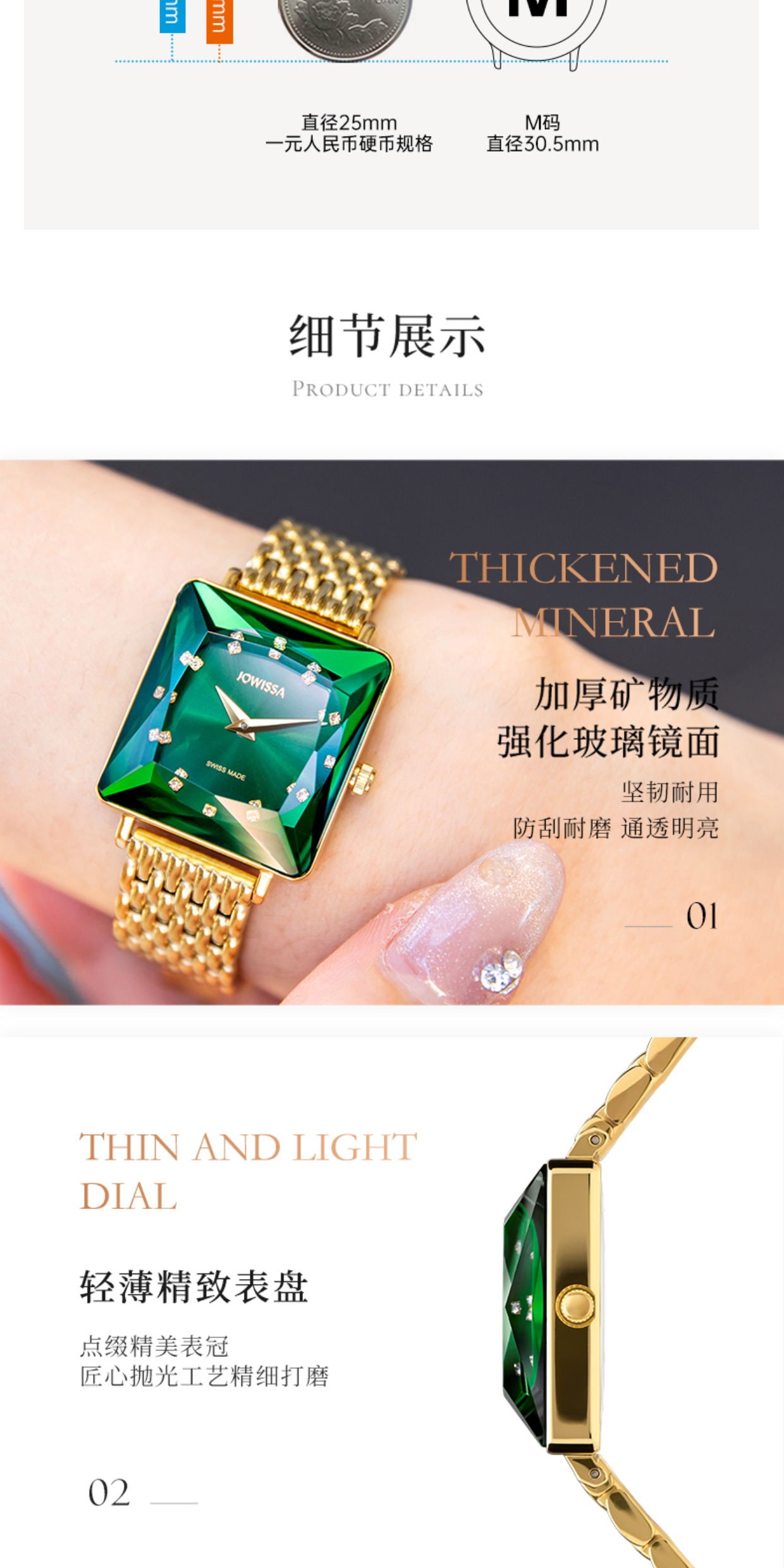 Jowissa Swiss Small Dial Watch for Women, Simple Brand-Name Women's Small Square Watch, Women's Compact and Exquisite Small Green Watch