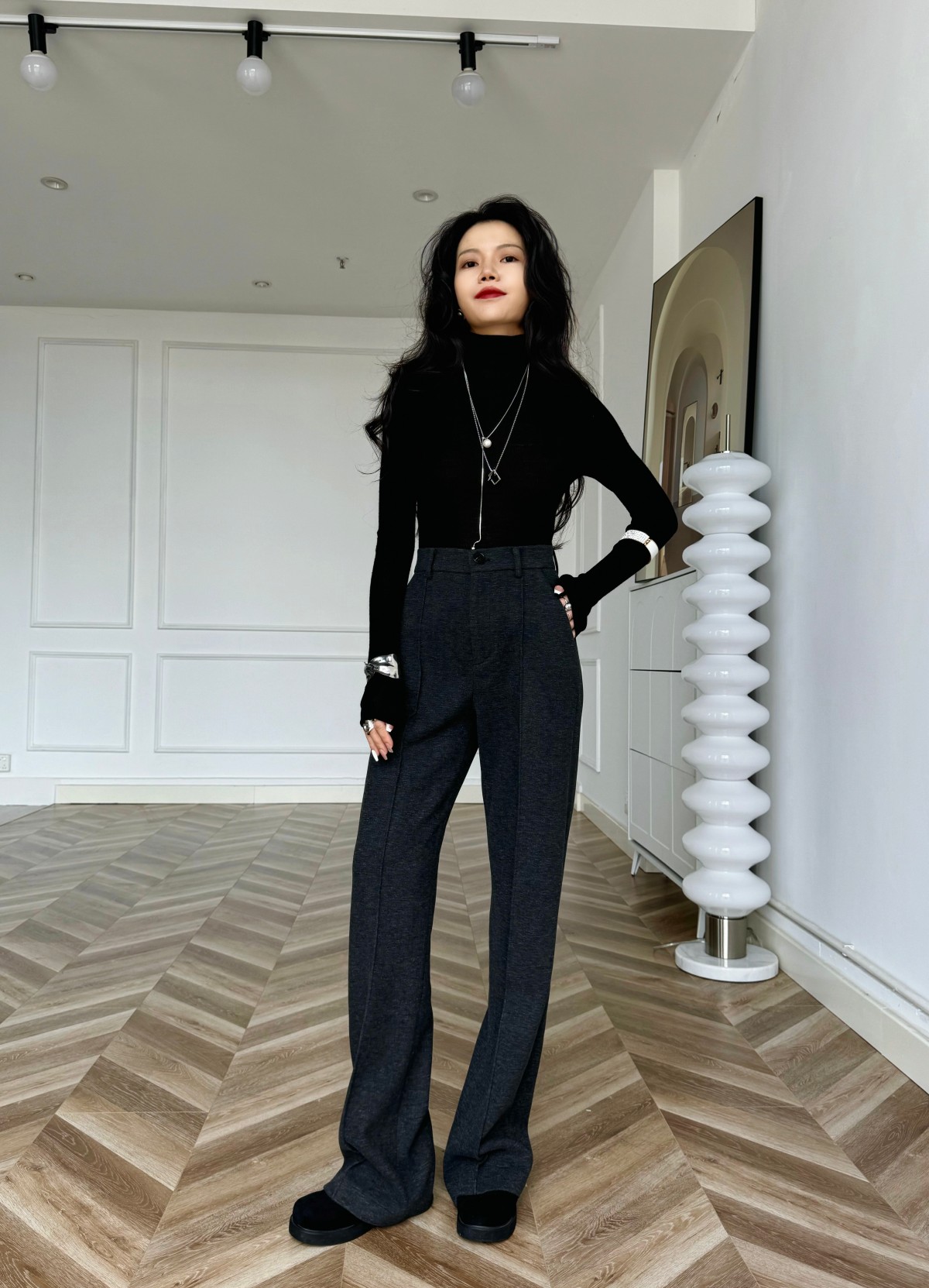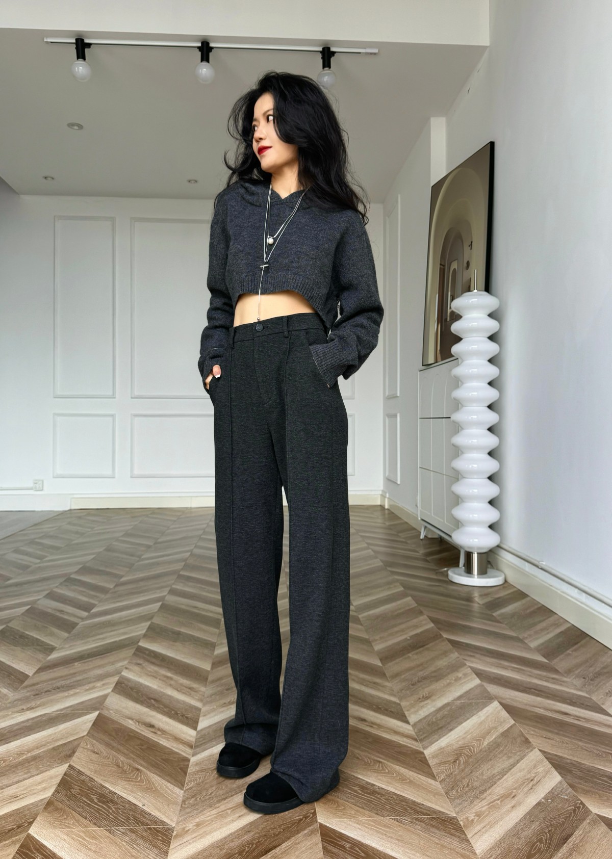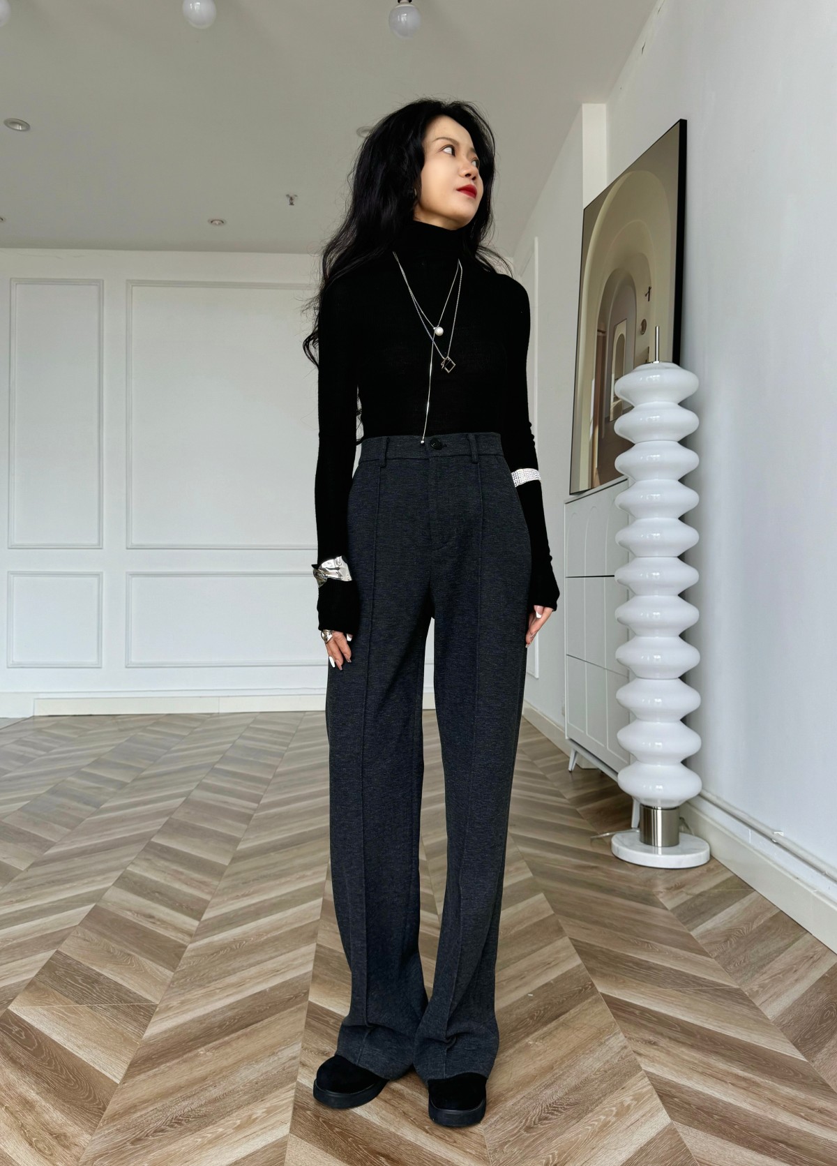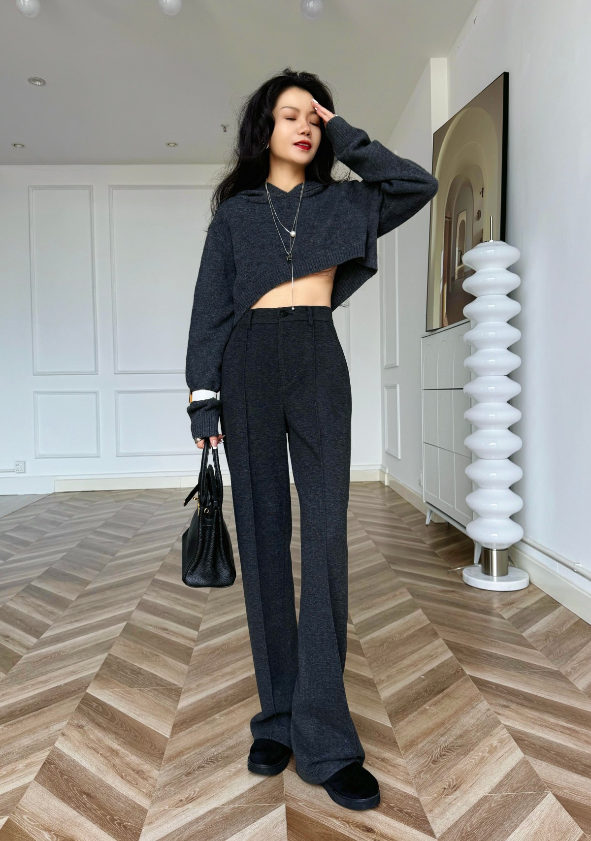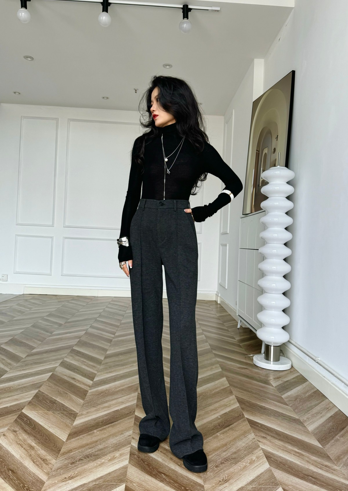 It's a Pair of Slim-Fit, No-Maintenance, Thickened Cashmere-Blend, High-Waisted, Gray, Toothpick-Striped, Warm, Stylish, Straight-Leg Long Trousers
