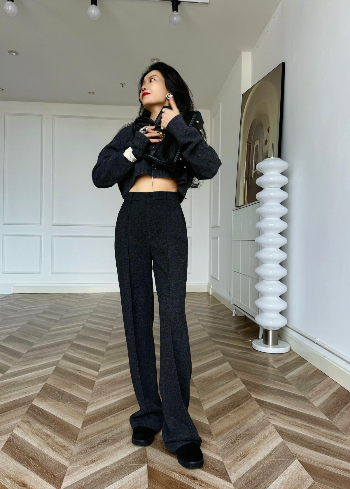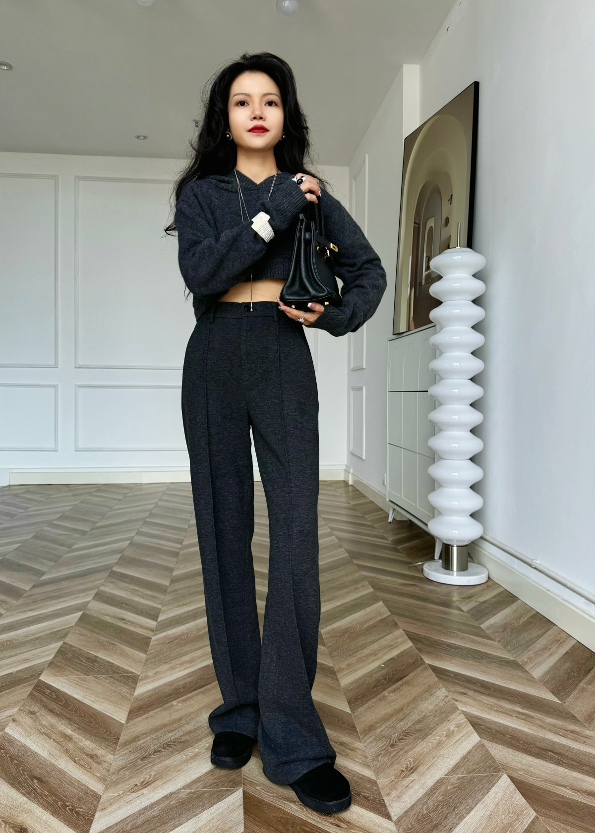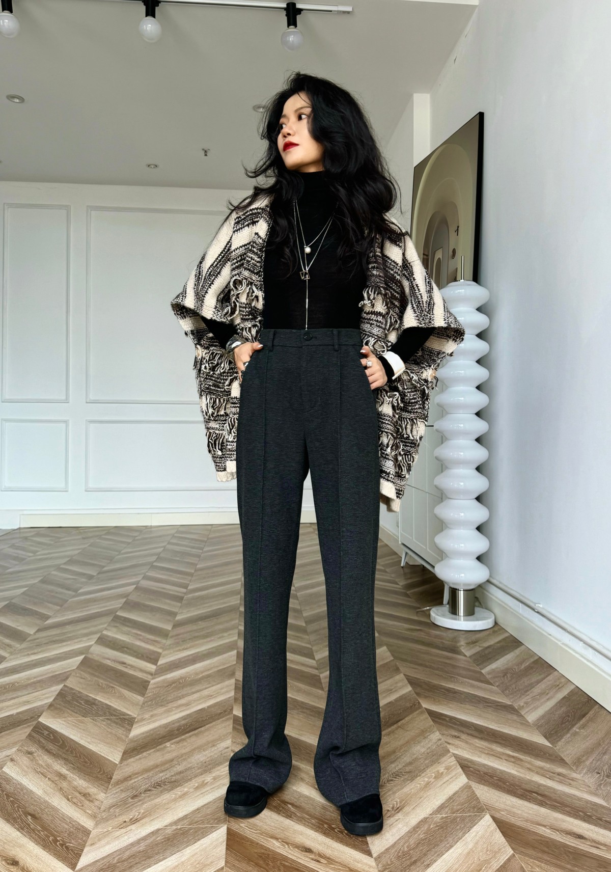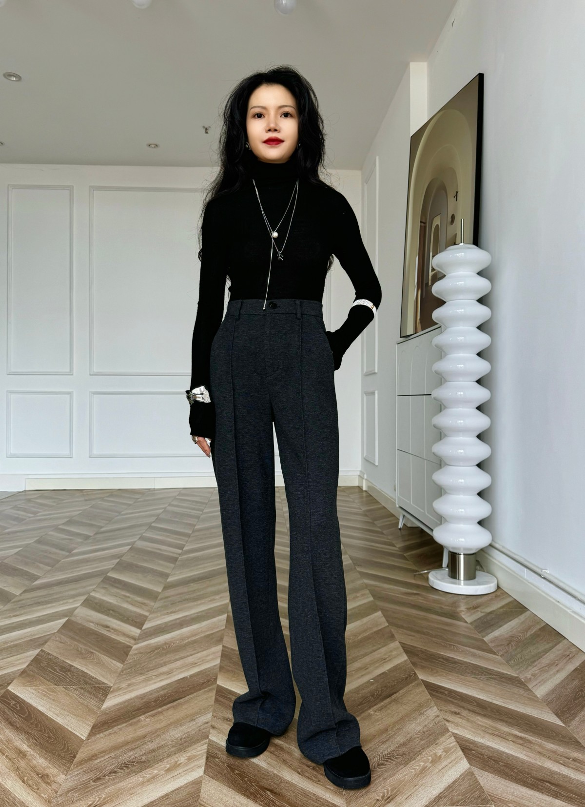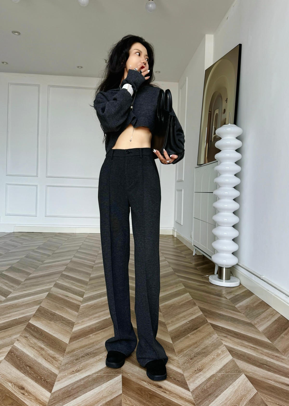 It's a Pair of Slim-Fit, No-Maintenance, Thickened Cashmere-Blend, High-Waisted, Gray, Toothpick-Striped, Warm, Stylish, Straight-Leg Long Trousers