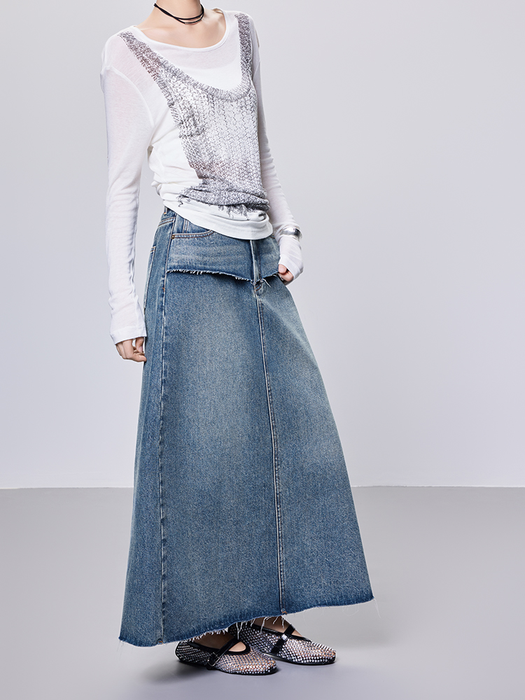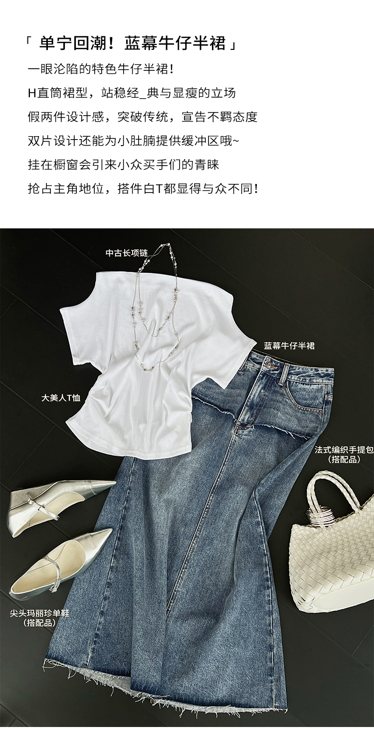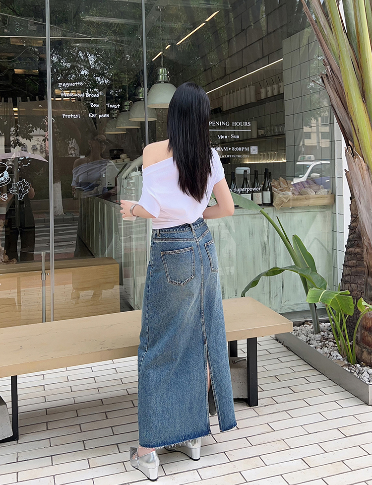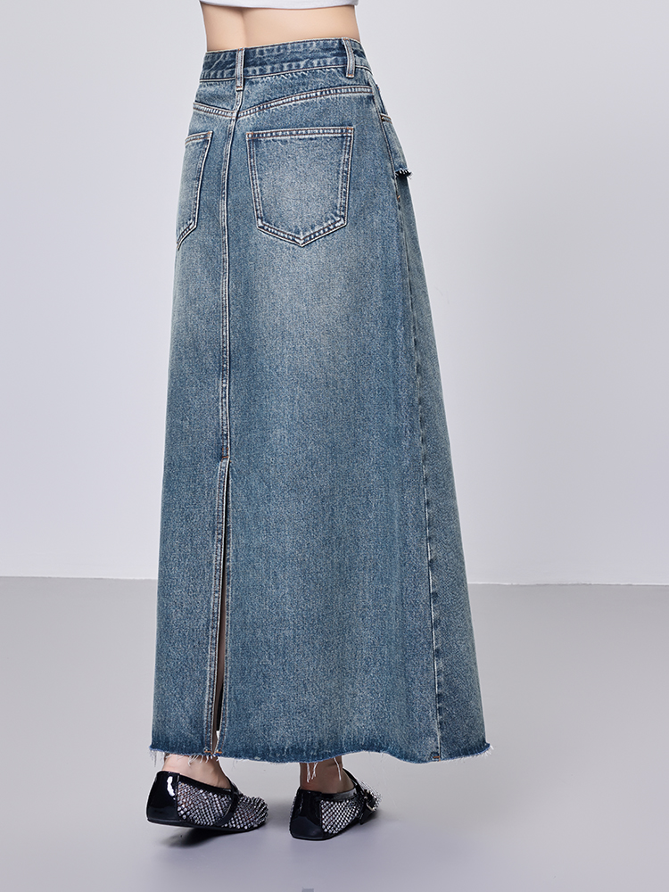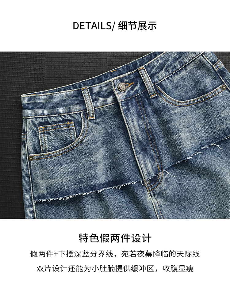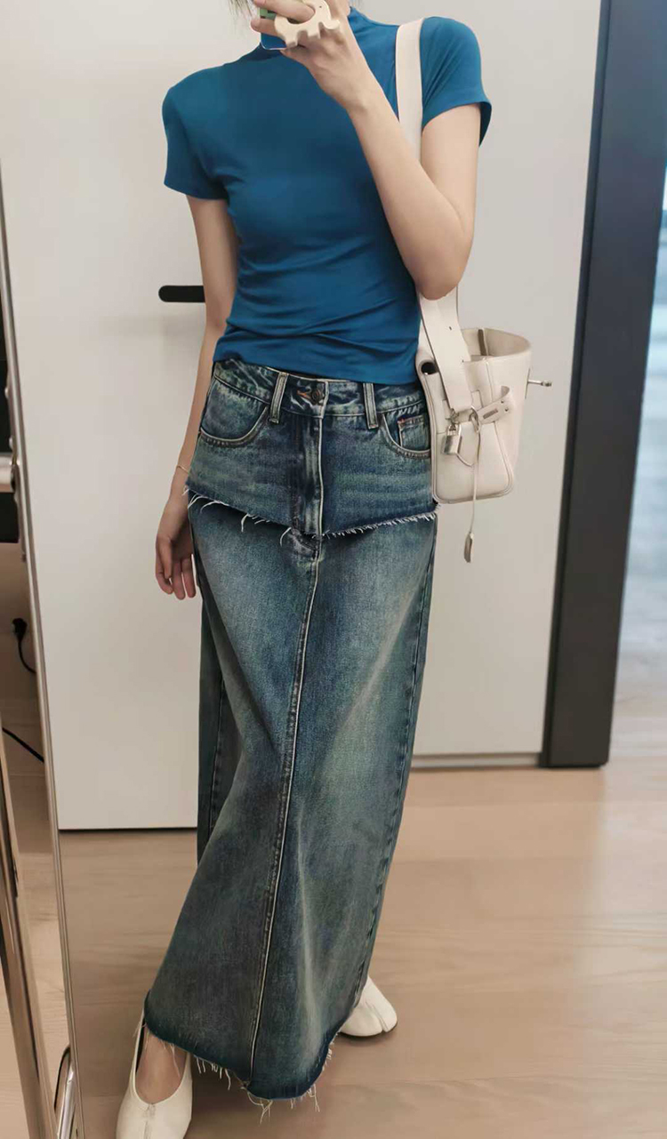 Meiyang【In Stock】Blue Denim Skirt Denim Faux Two-Piece Frayed Hem Slit Mid-Length - Thursday