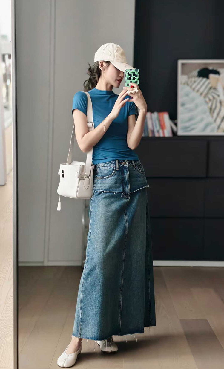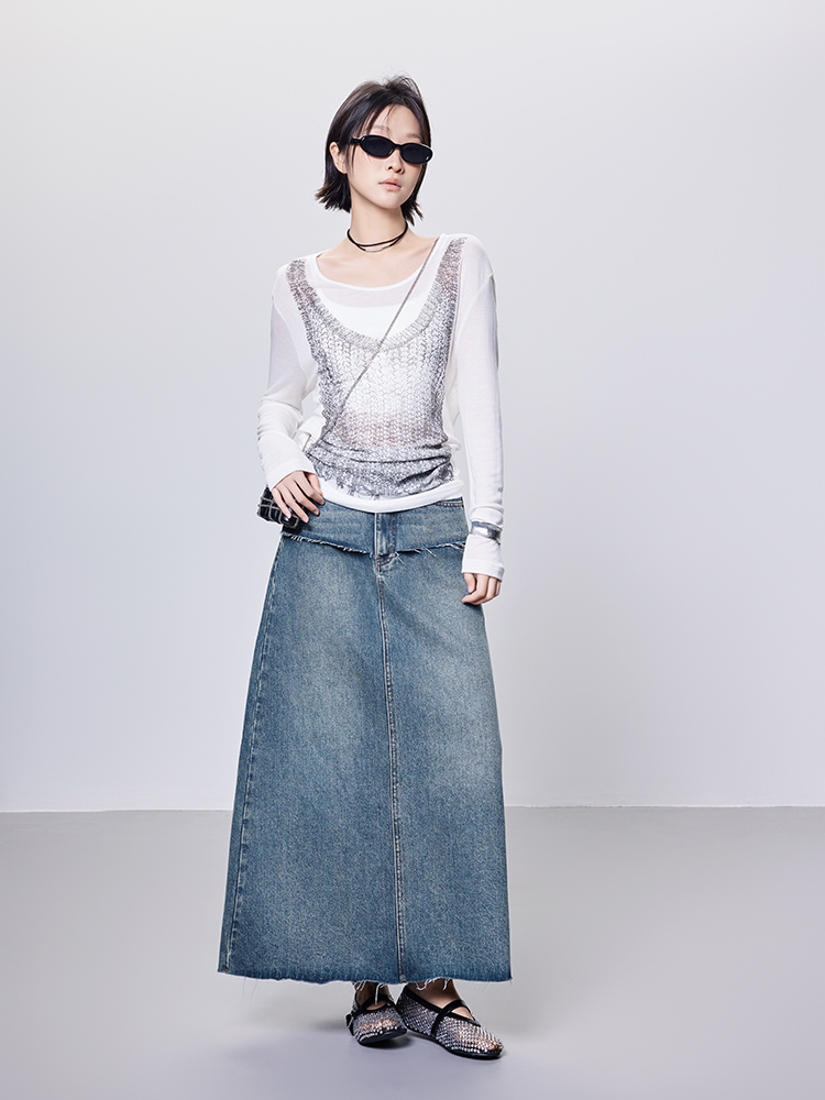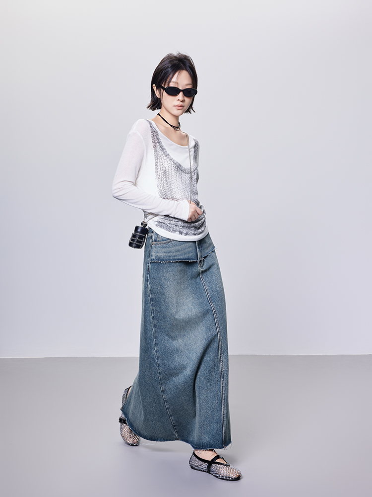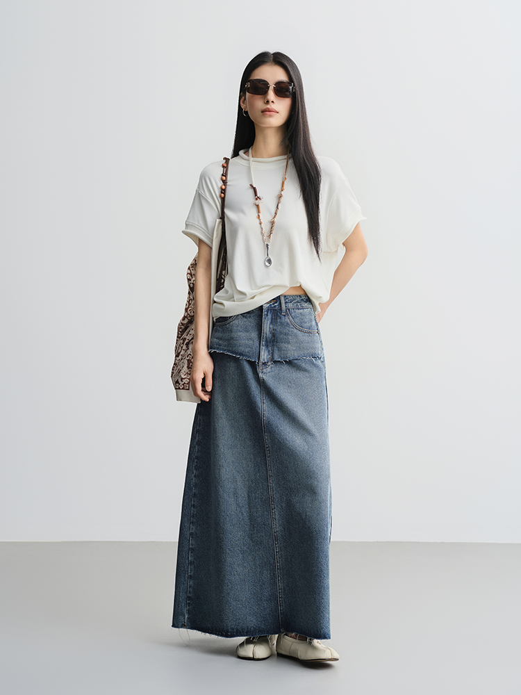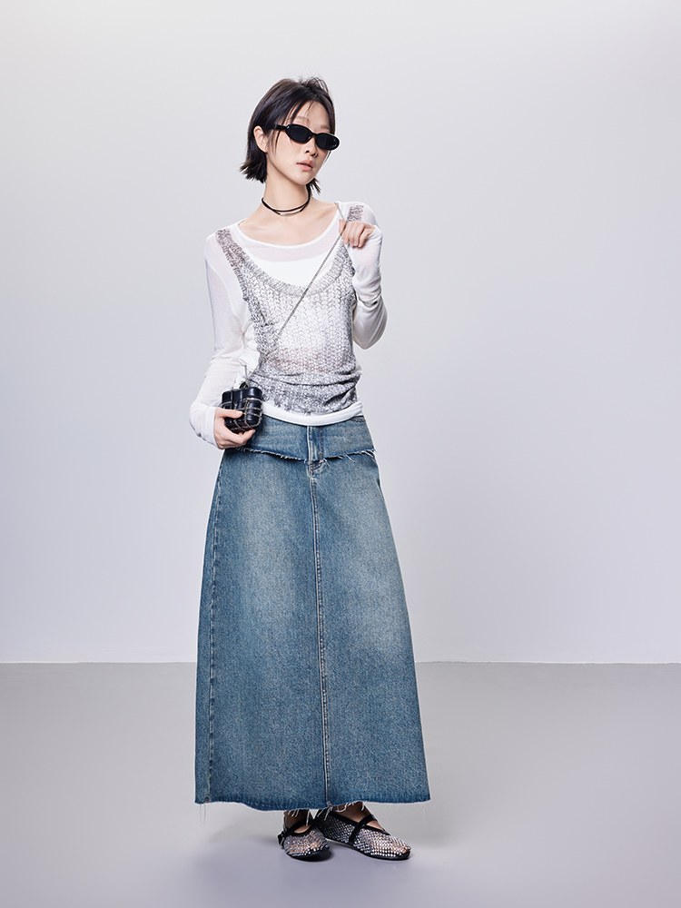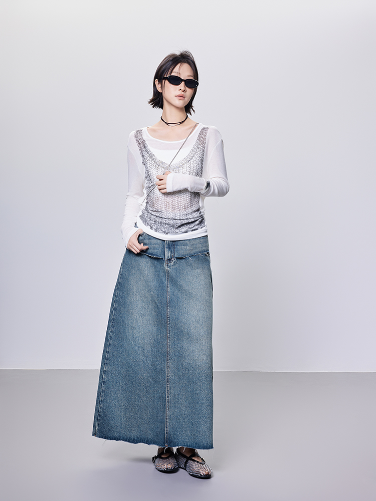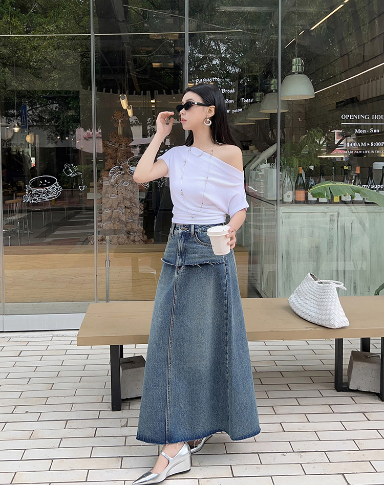 Meiyang【In Stock】Blue Denim Skirt Denim Faux Two-Piece Frayed Hem Slit Mid-Length - Thursday