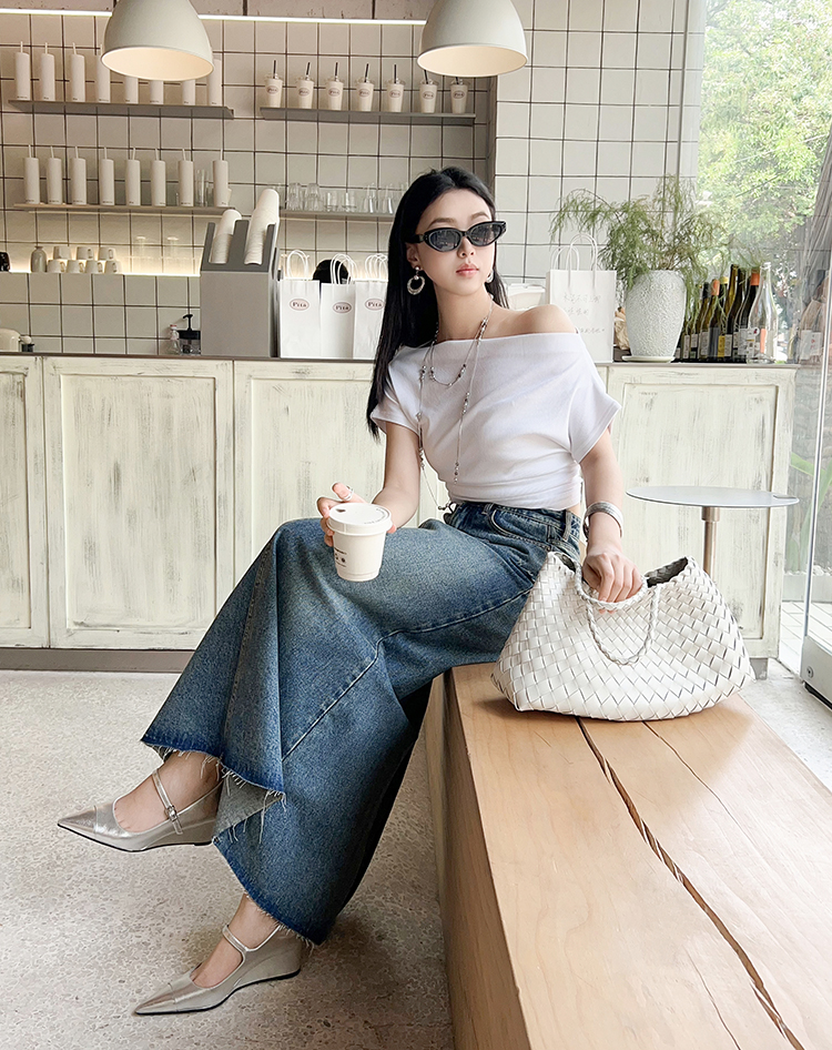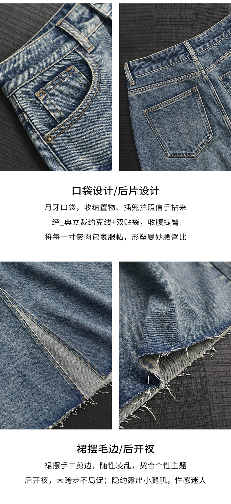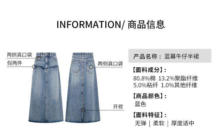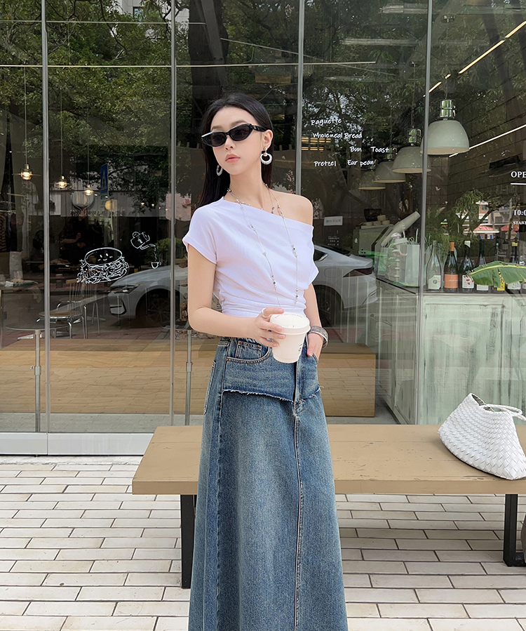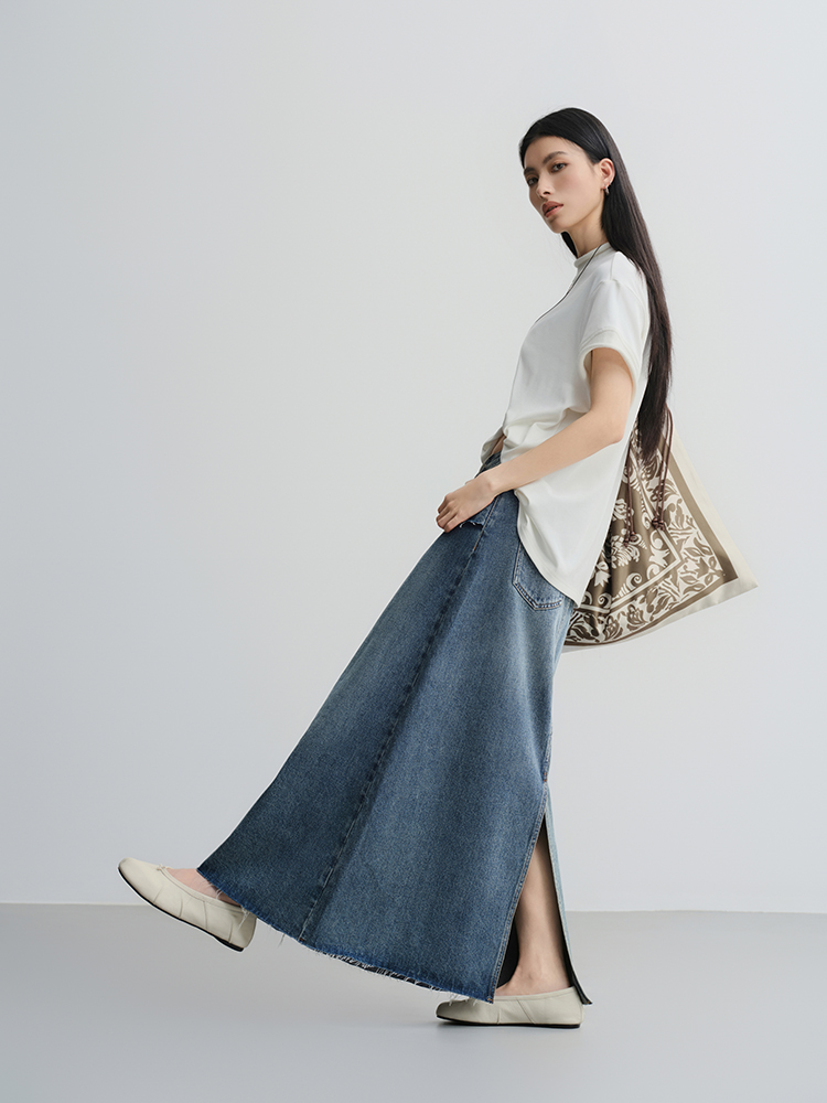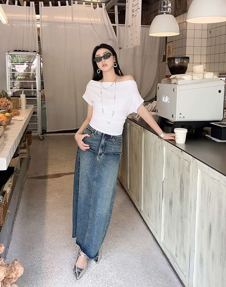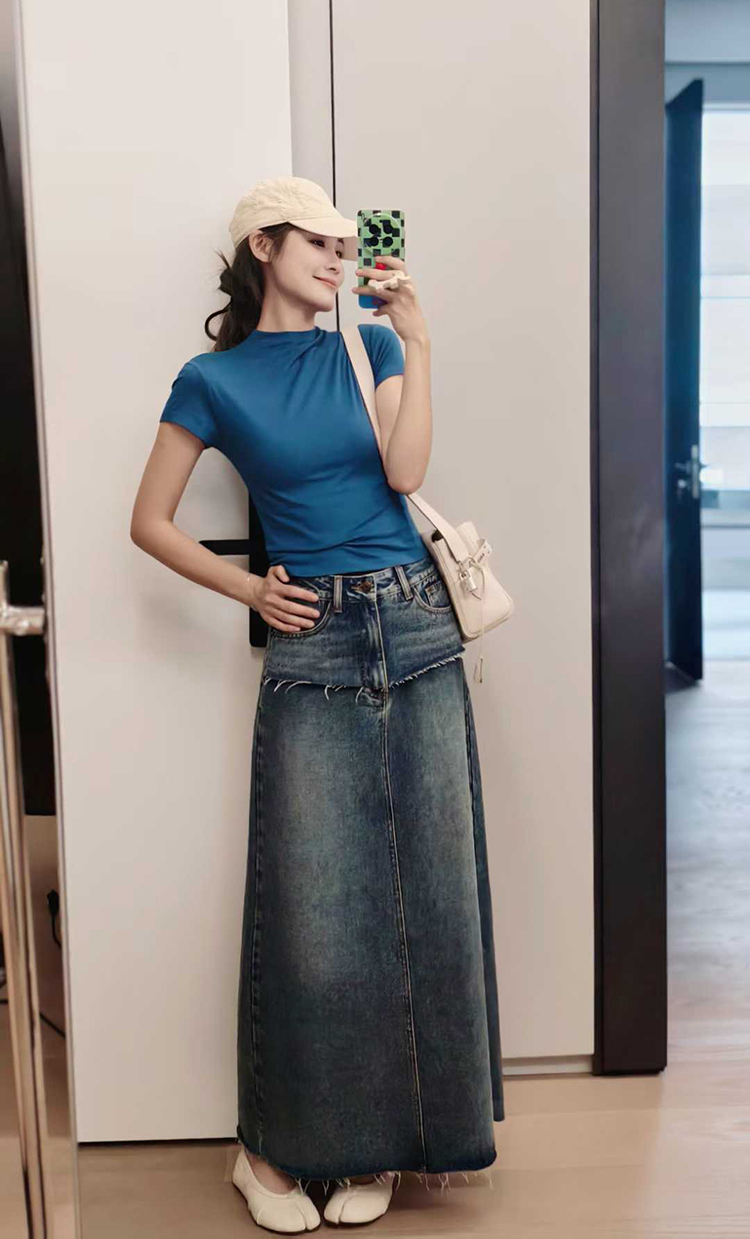 Meiyang【In Stock】Blue Denim Skirt Denim Faux Two-Piece Frayed Hem Slit Mid-Length - Thursday