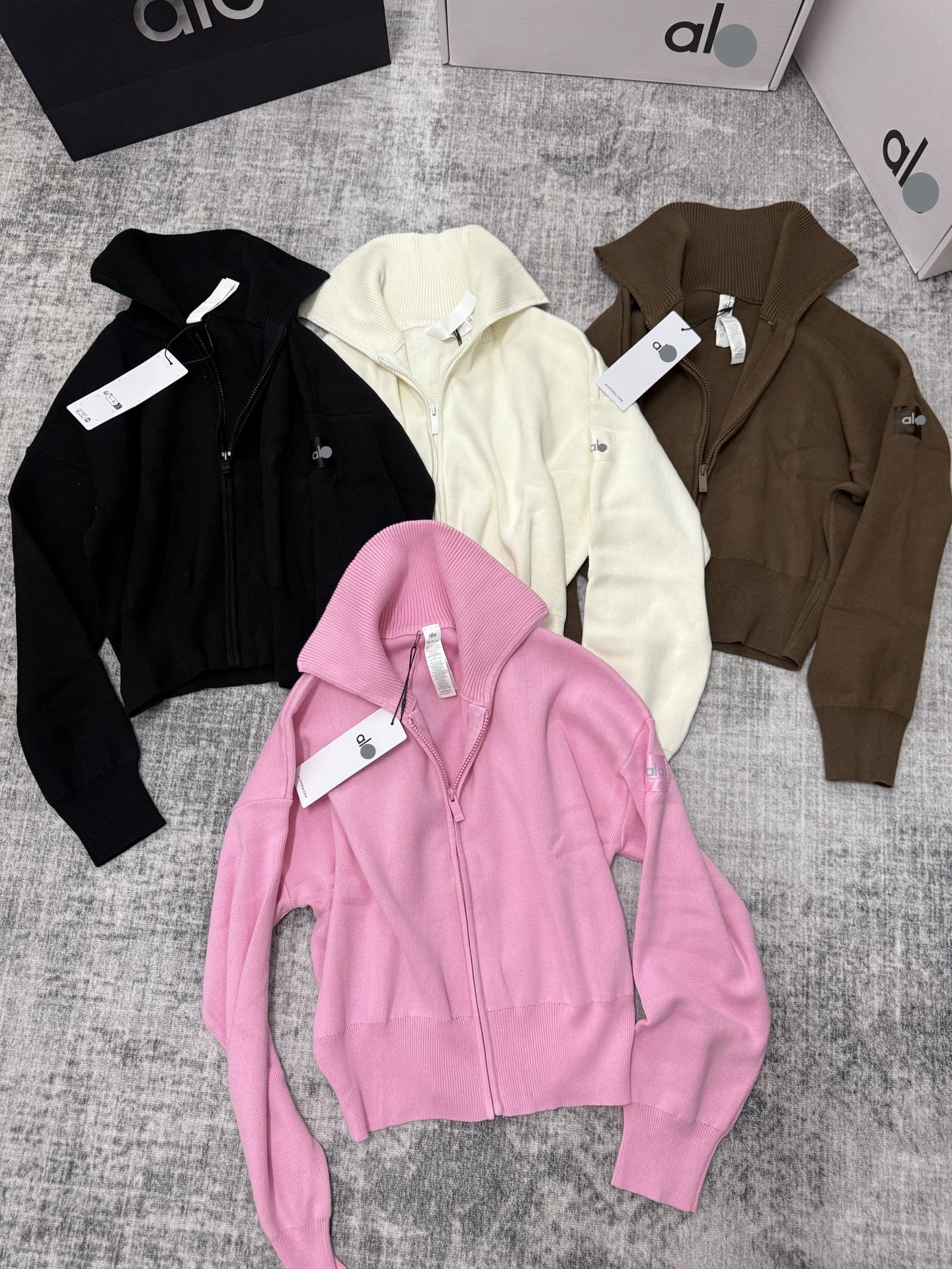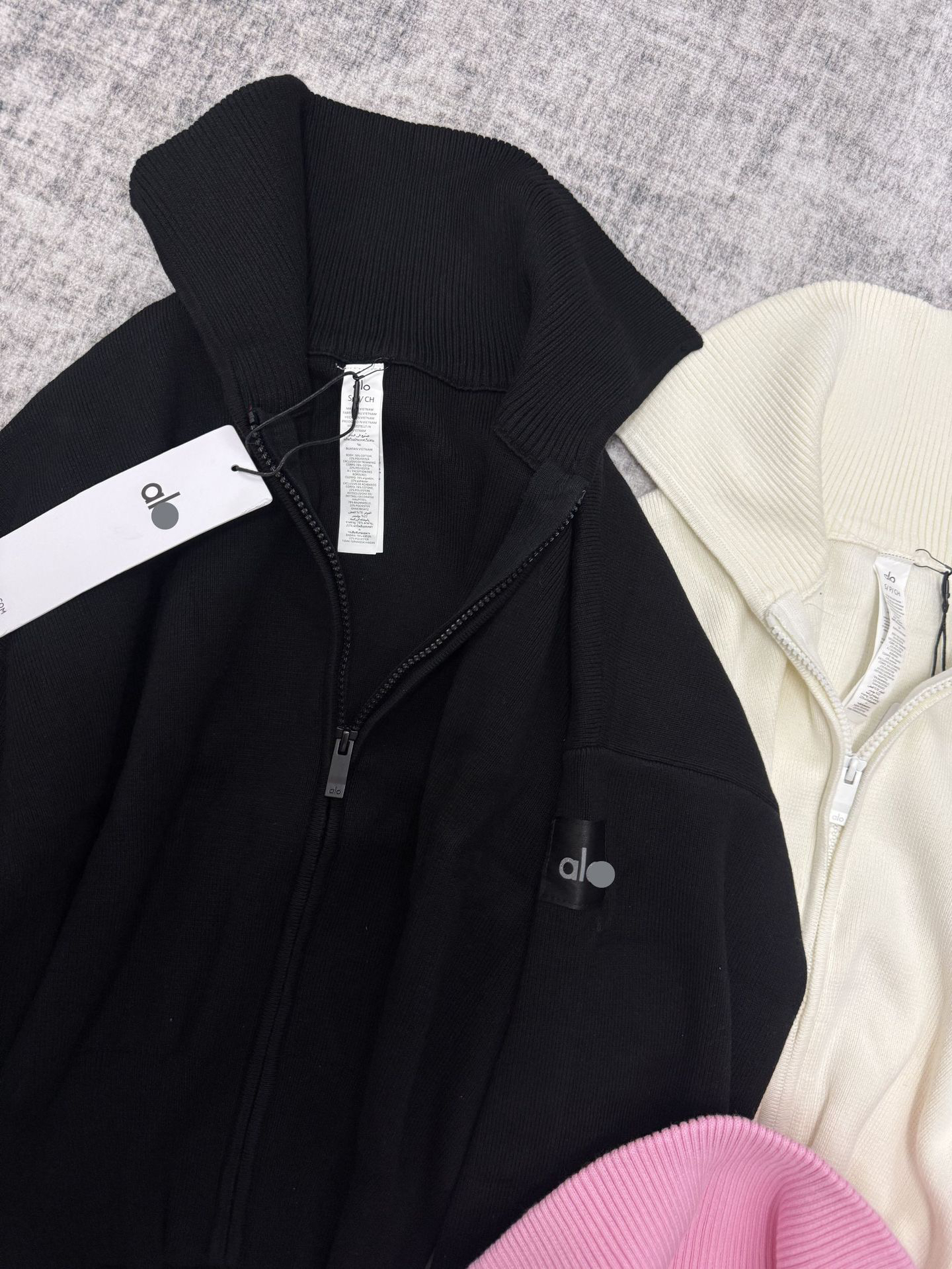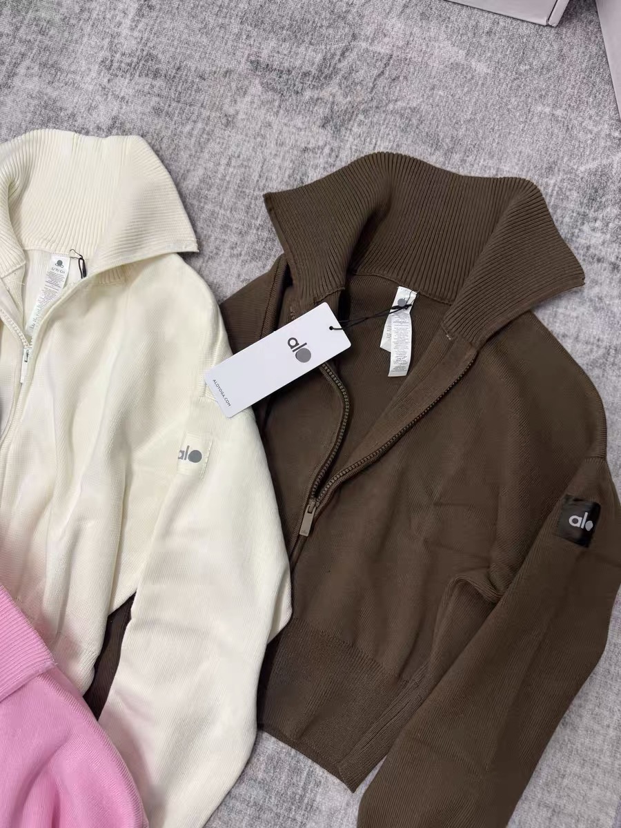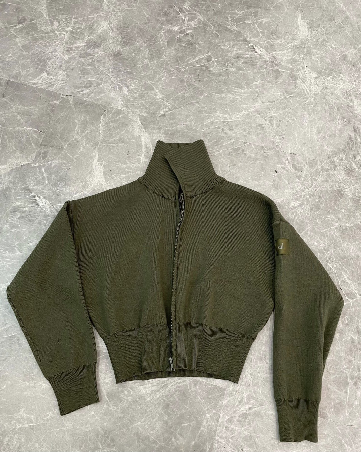 High-End Original Alo New Women's Zip-Up Cardigan Jacket, Knitted Solid Color Loose Casual Short Sweatshirt for Women