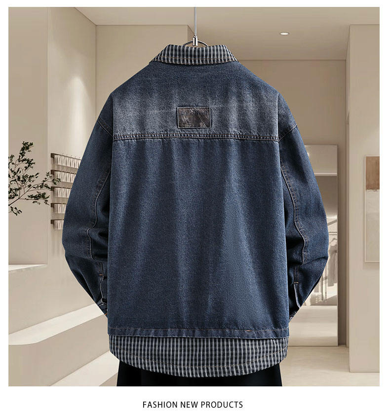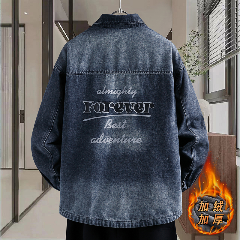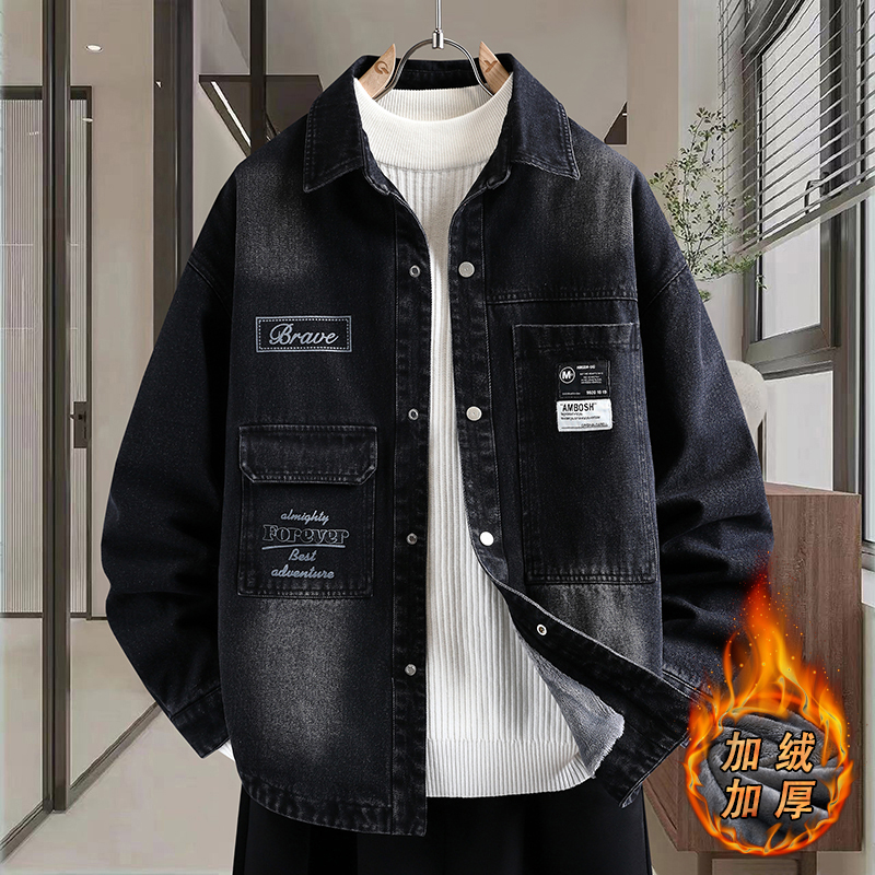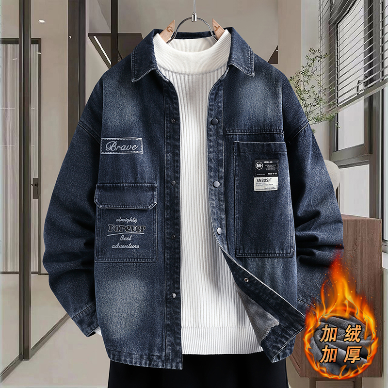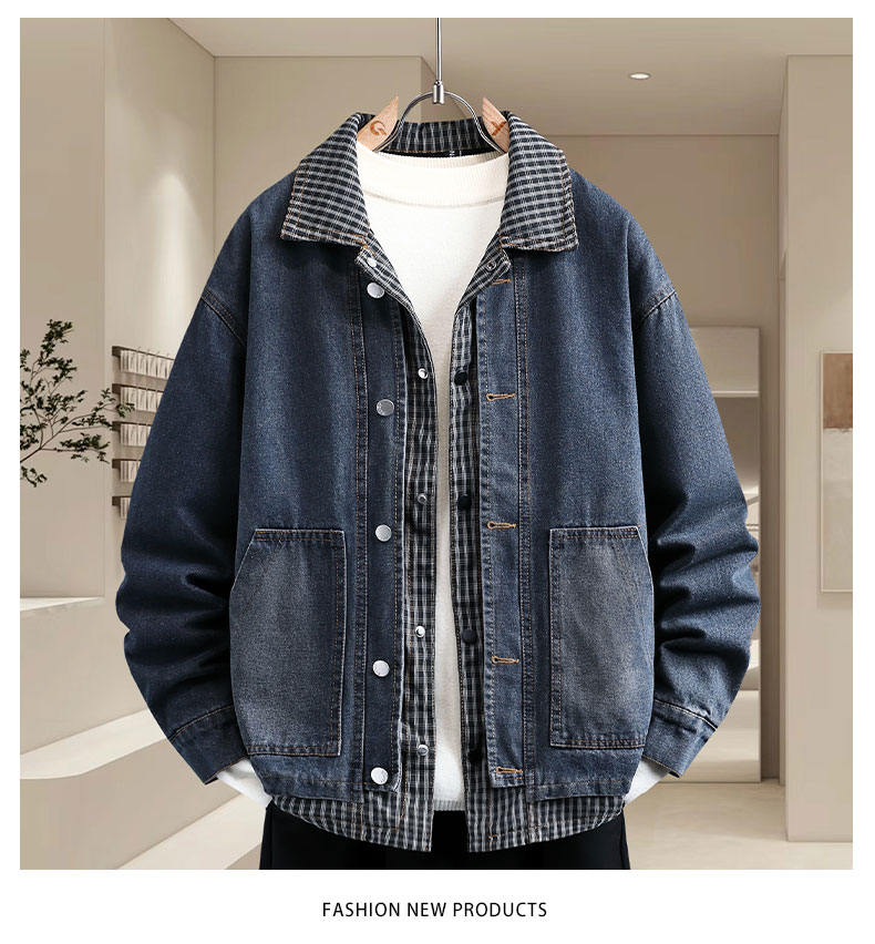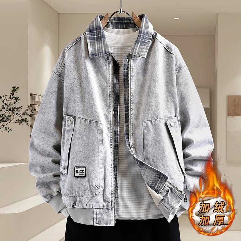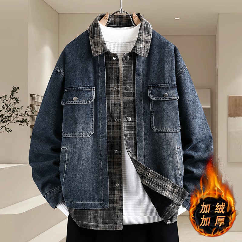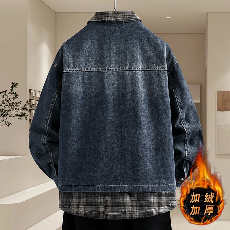 Autumn and Winter Lapel Patchwork Faux Two-Piece Fleece-Lined Denim Jacket for Men, Teenagers, and Middle School Students, Stylish and Warm Coat