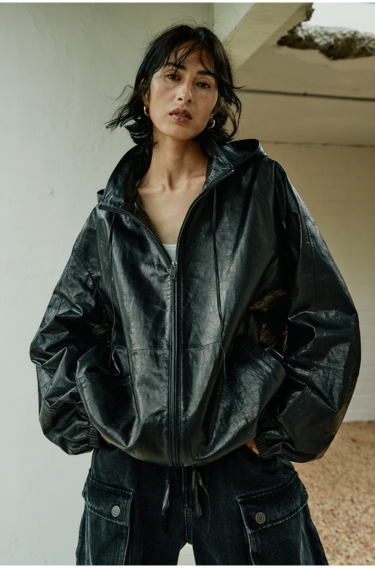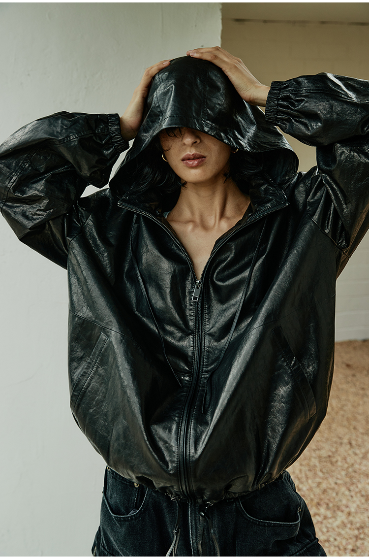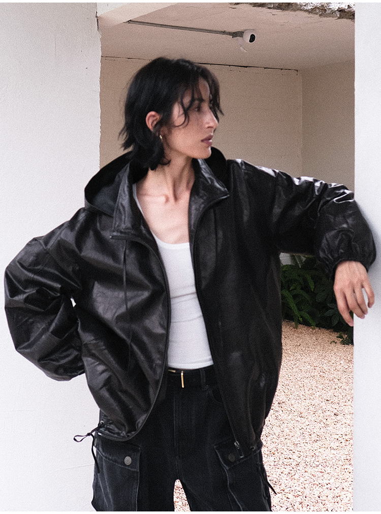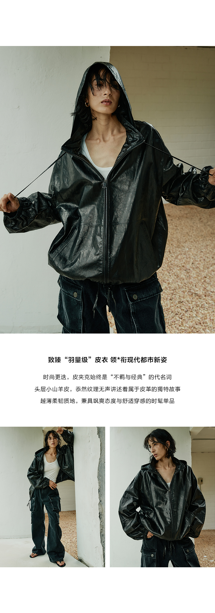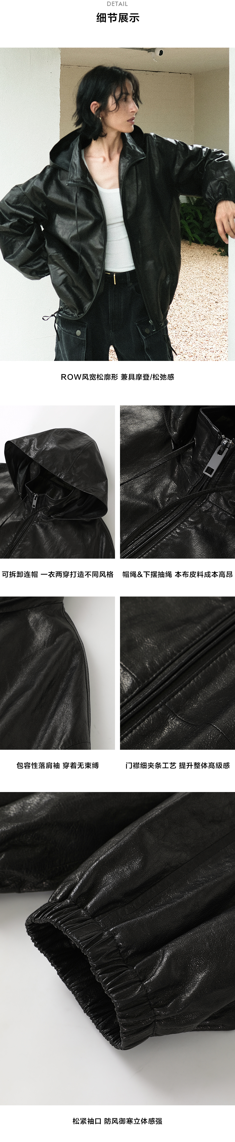Ayuko|First Layer Small Goatskin Ultra-Thin Craft Uncoated Detachable Hooded Silhouette Row Leather Jacket