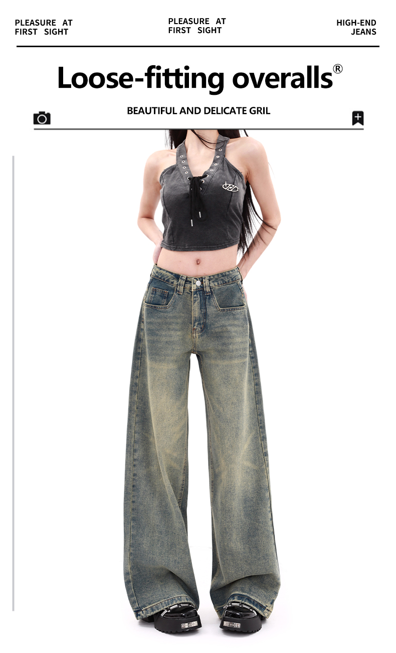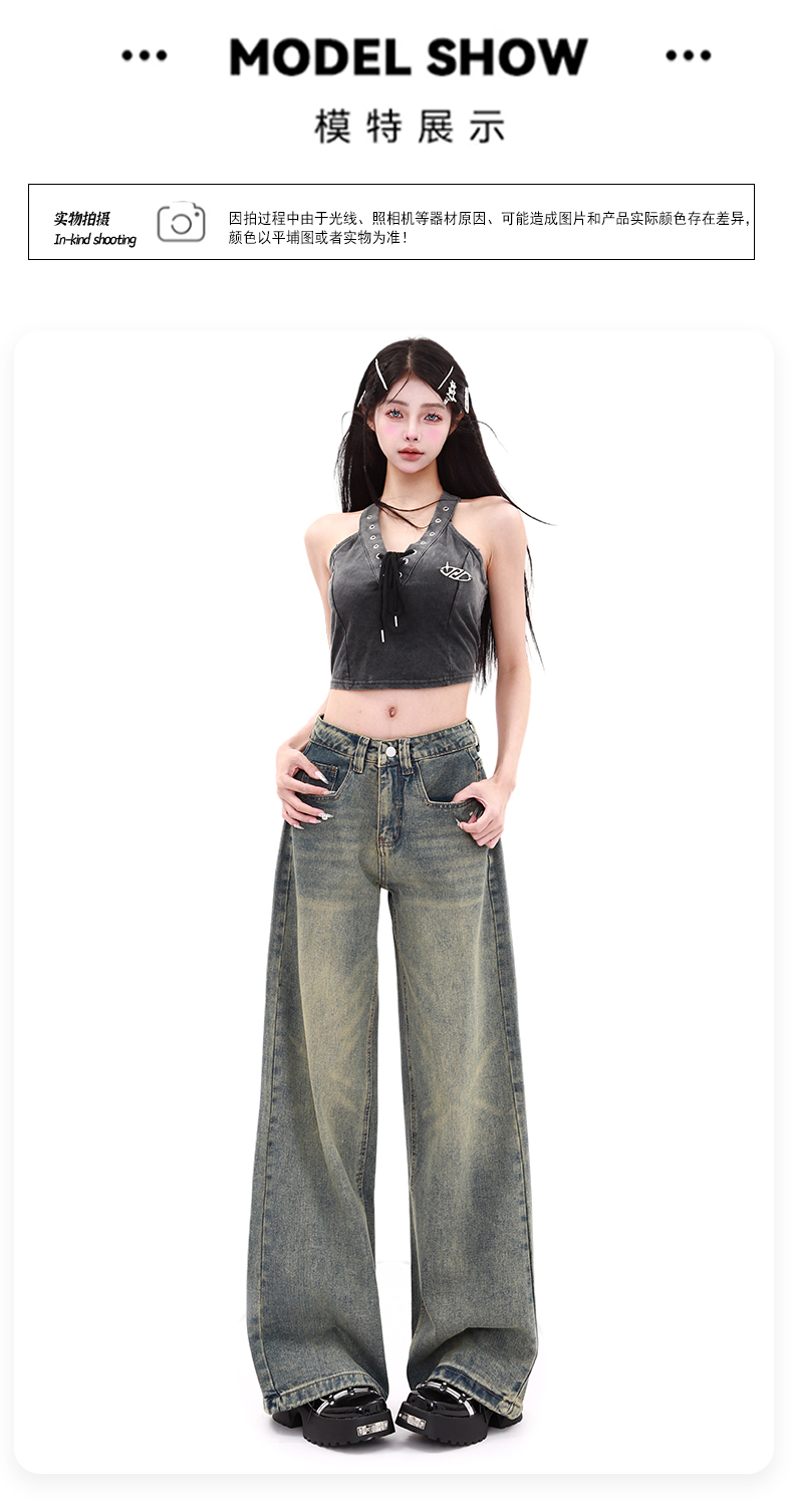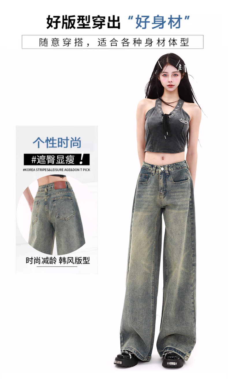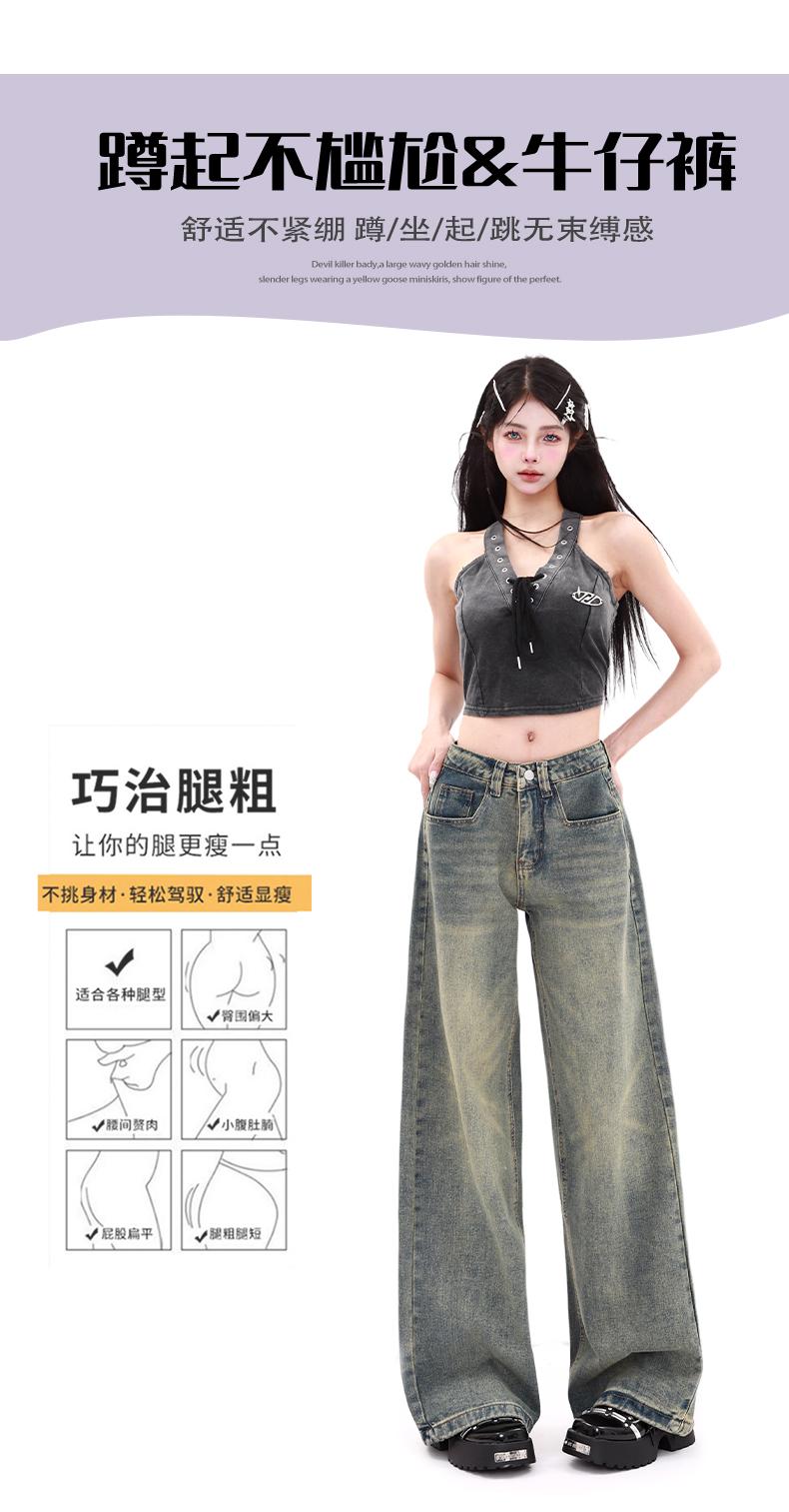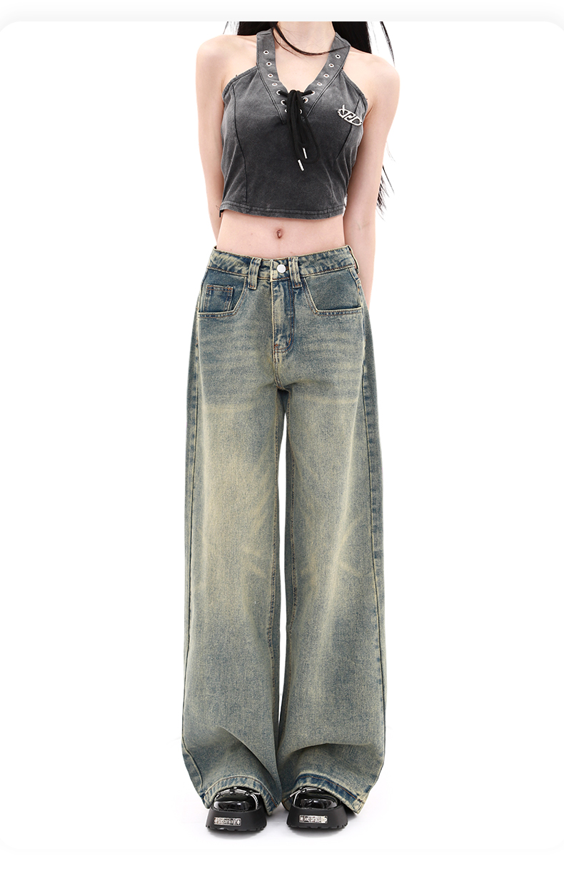 Mzvz American Retro Washed Distressed Wide-Leg Jeans for Women, Autumn Low-Waist Straight-Leg Pants, Floor-Length Trendy Pants