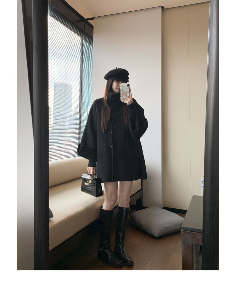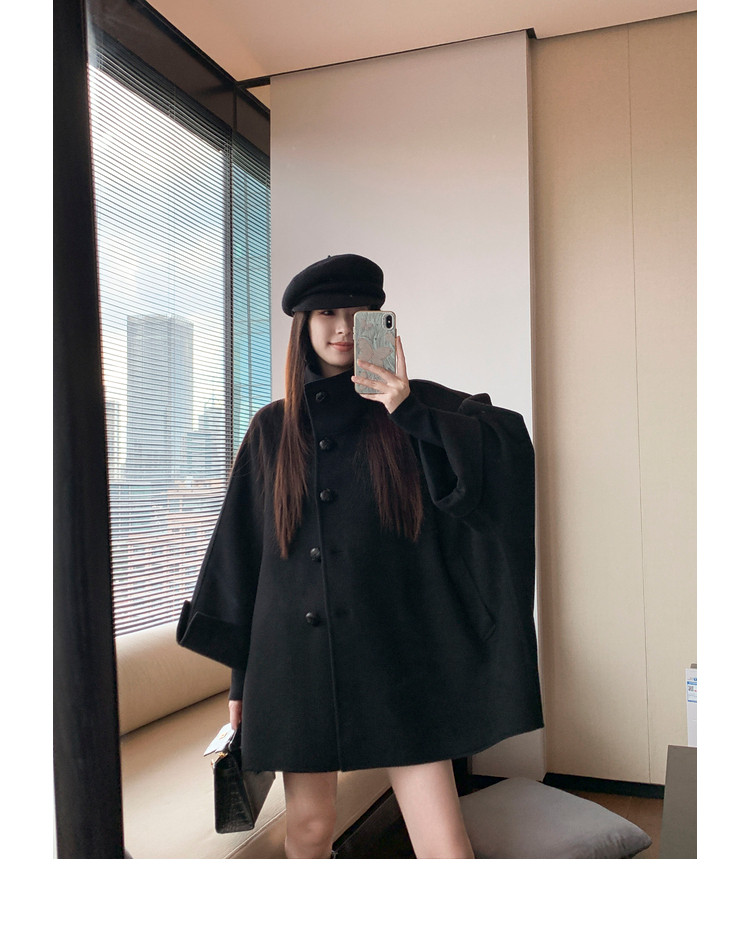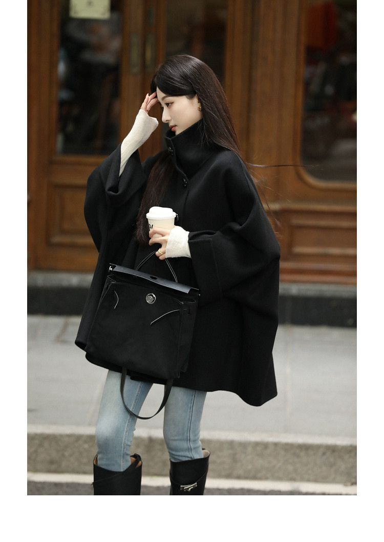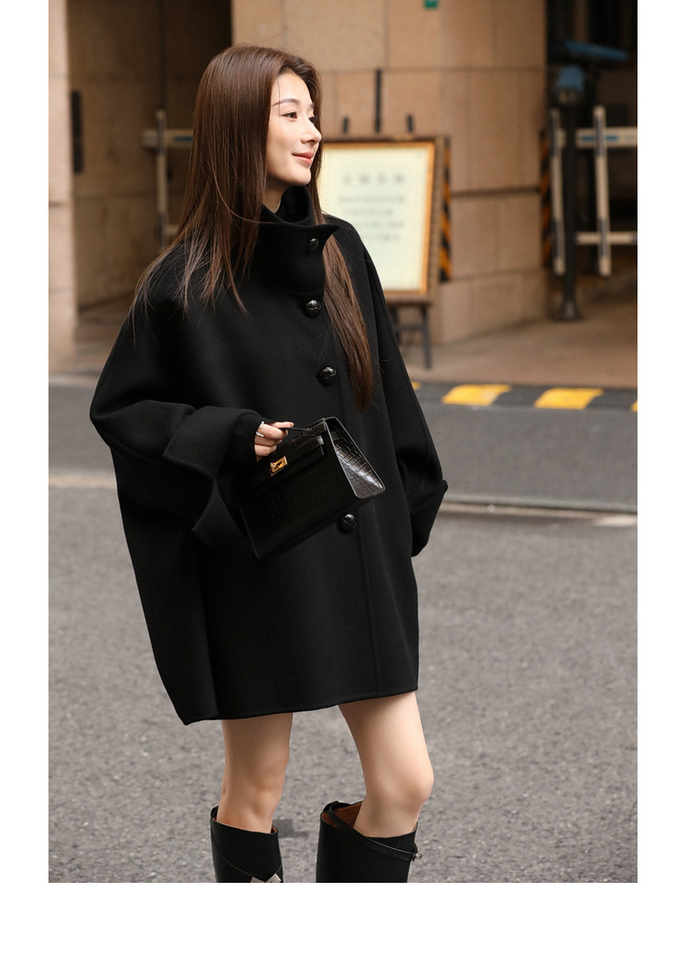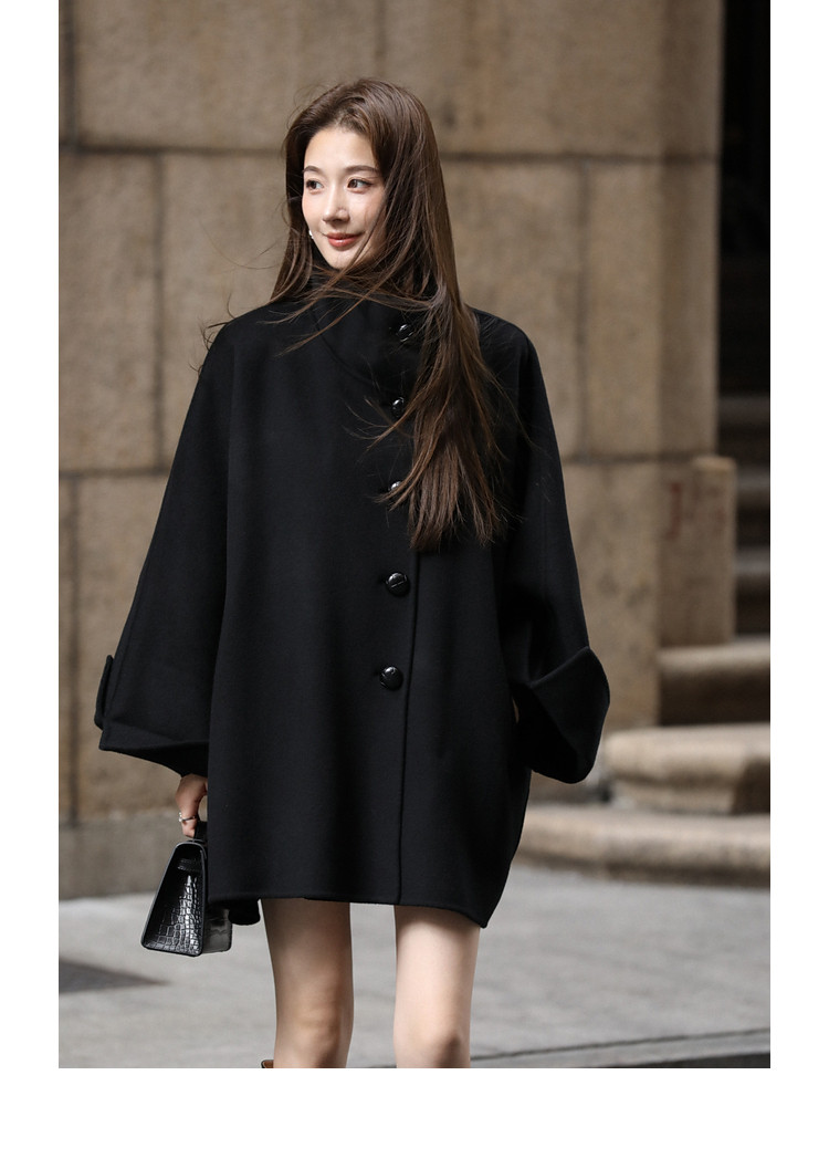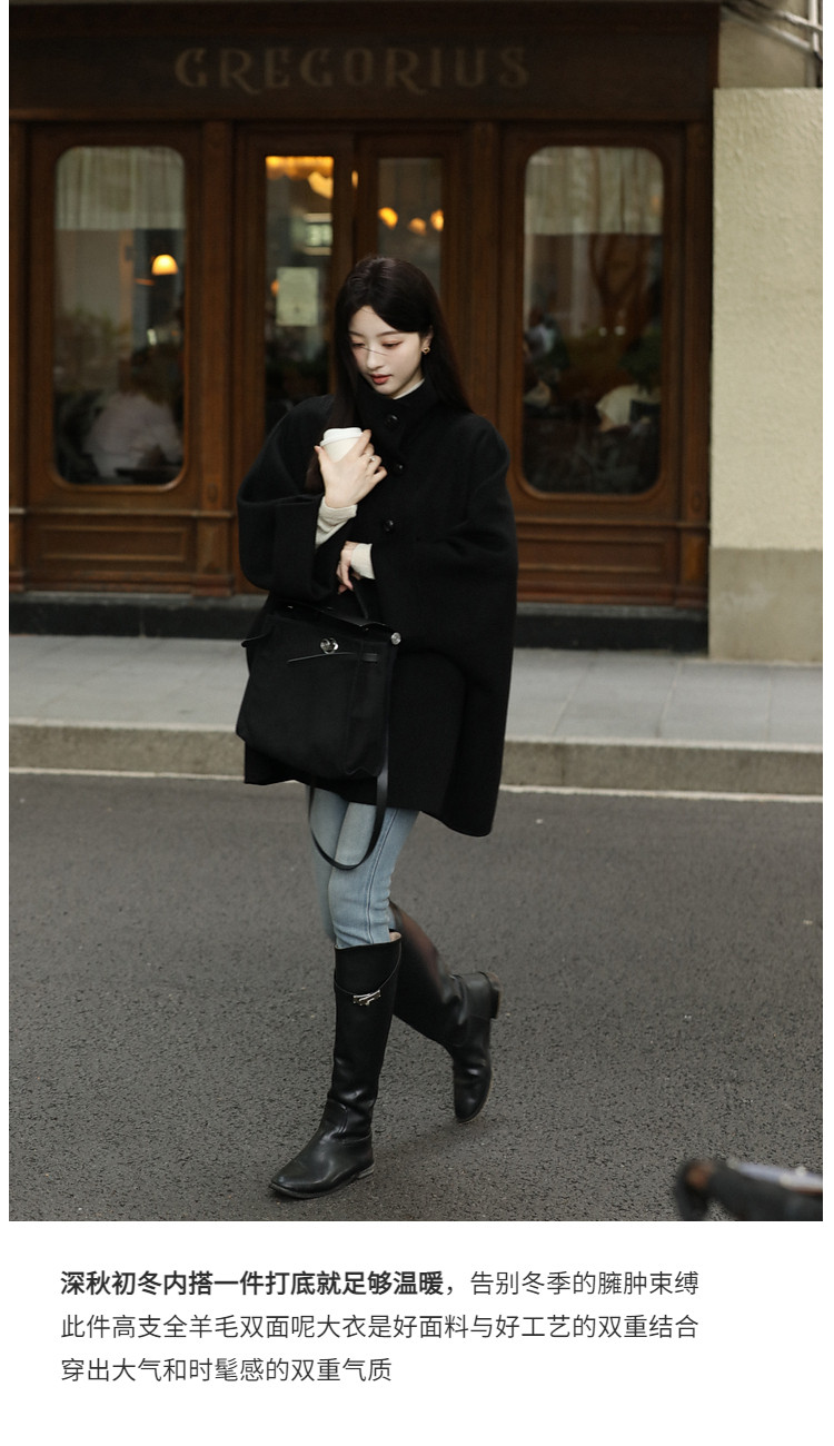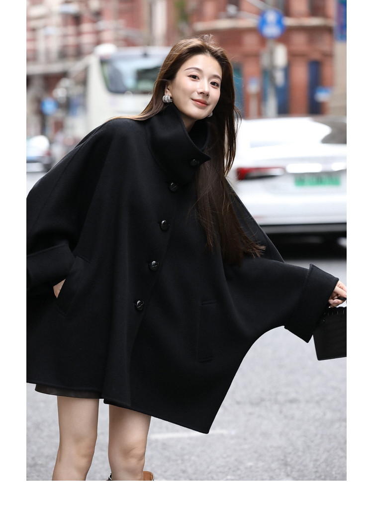 Xia Shiwen All-Wool Double-Sided Woolen Cape-Style Coat for Women, Winter Fashion, Convertible Stand-Up Collar, Versatile Black Coat