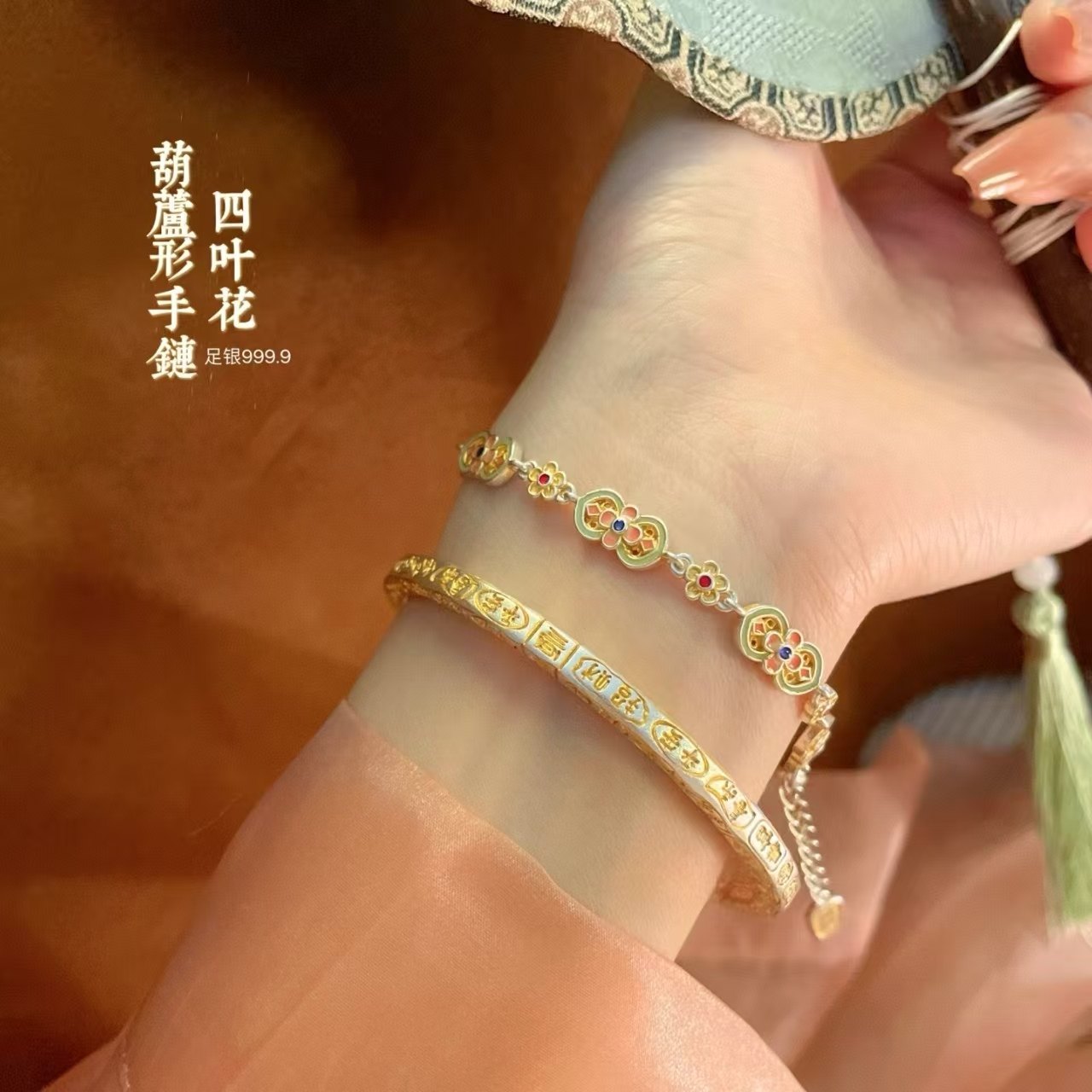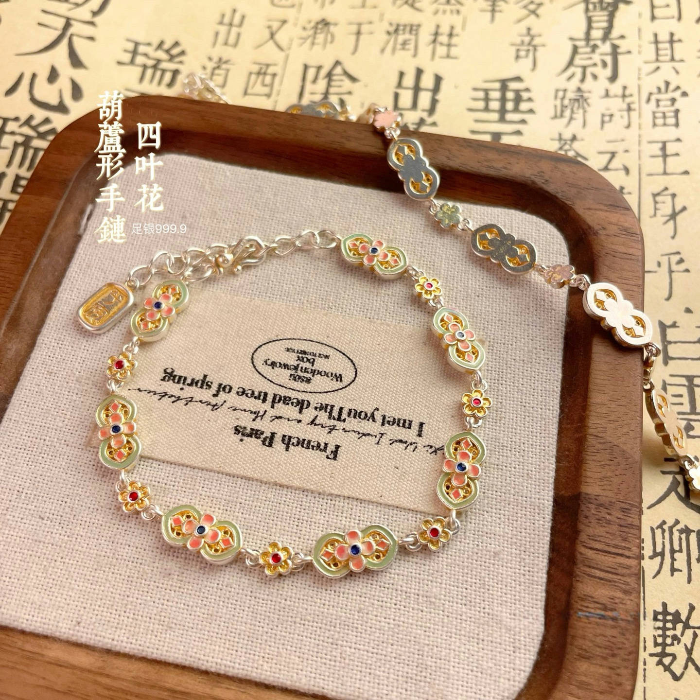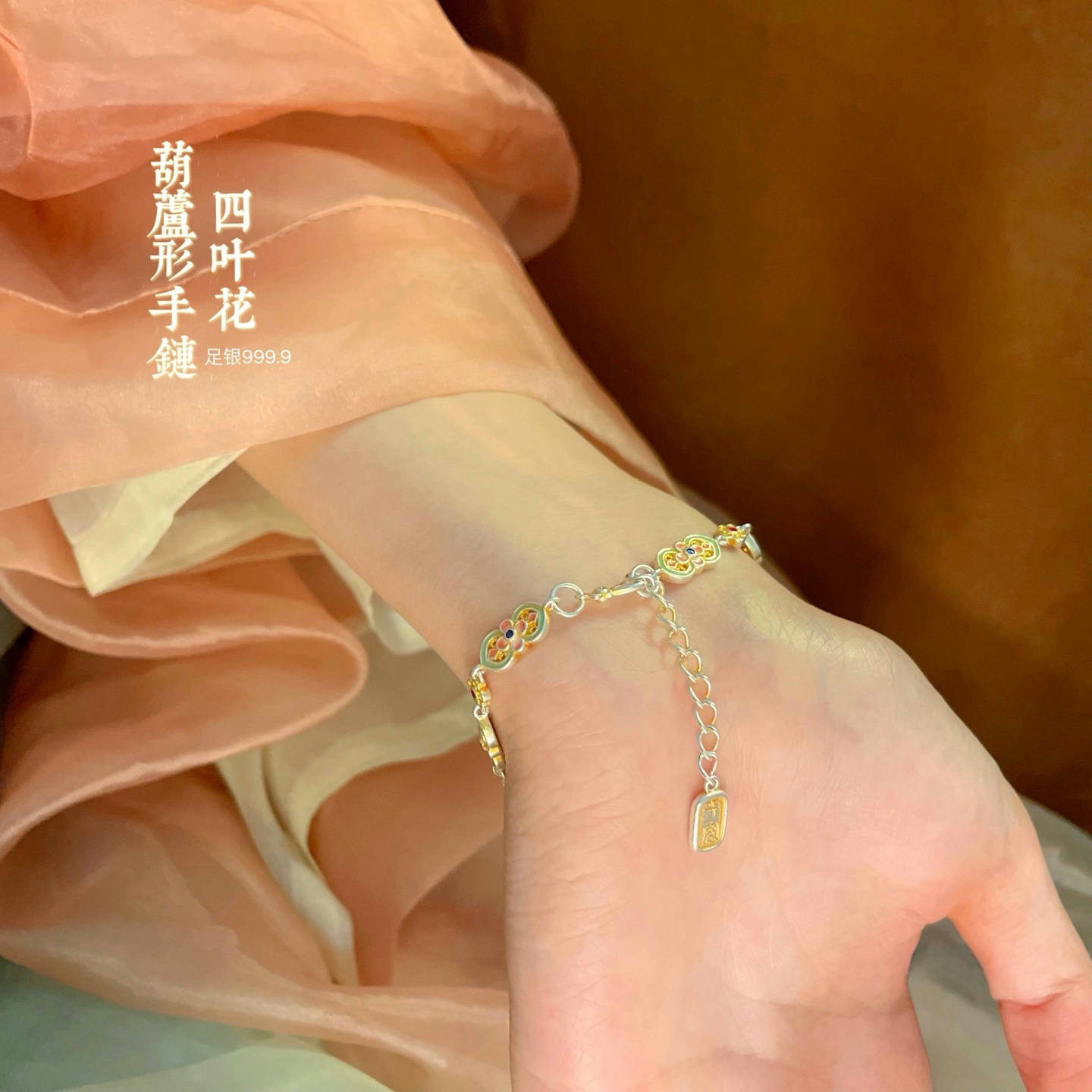 9999 Pure Silver Bracelet for Women, Sterling Silver with Enamel and Gold-Plated Gourd Design, Niche Exquisite New Chinese Style National Trend Jewelry, Gift for Girlfriend