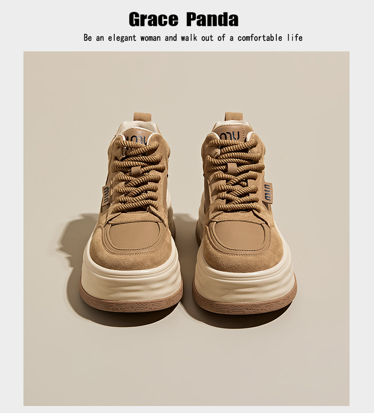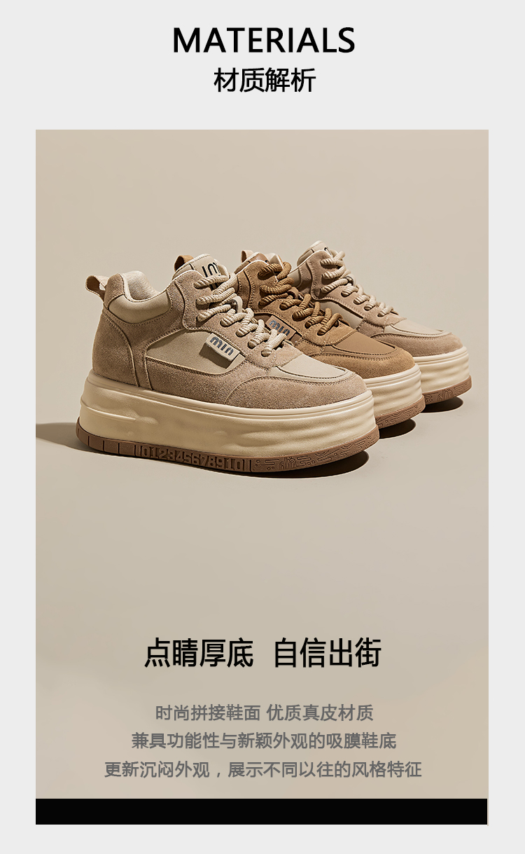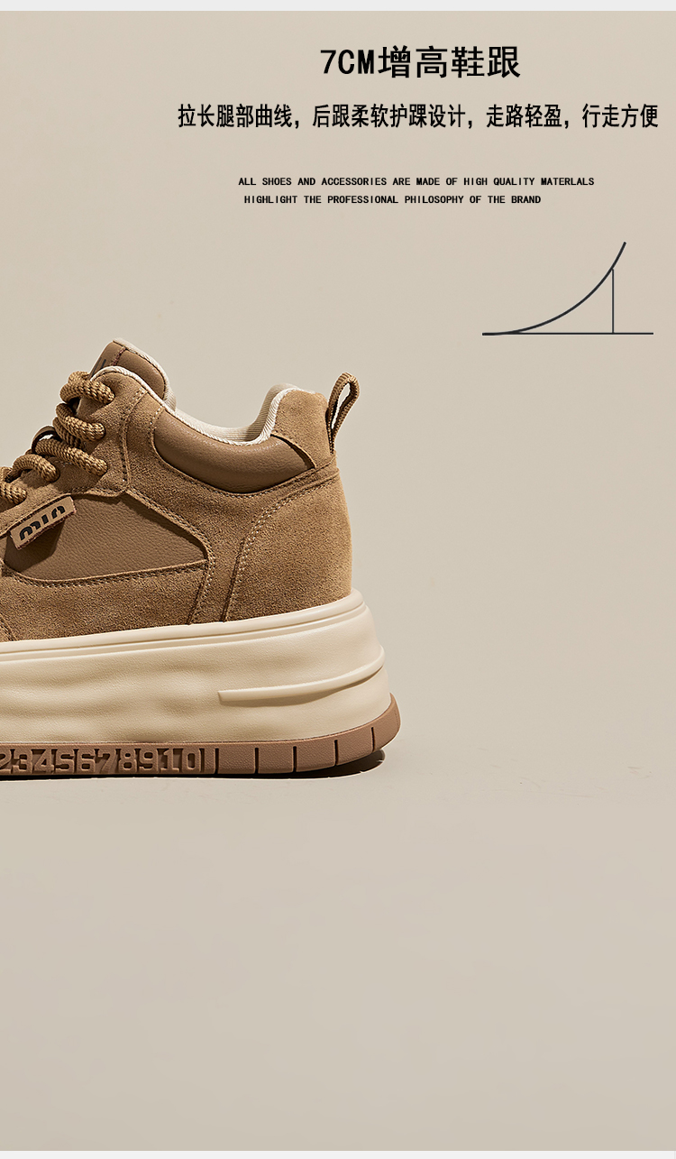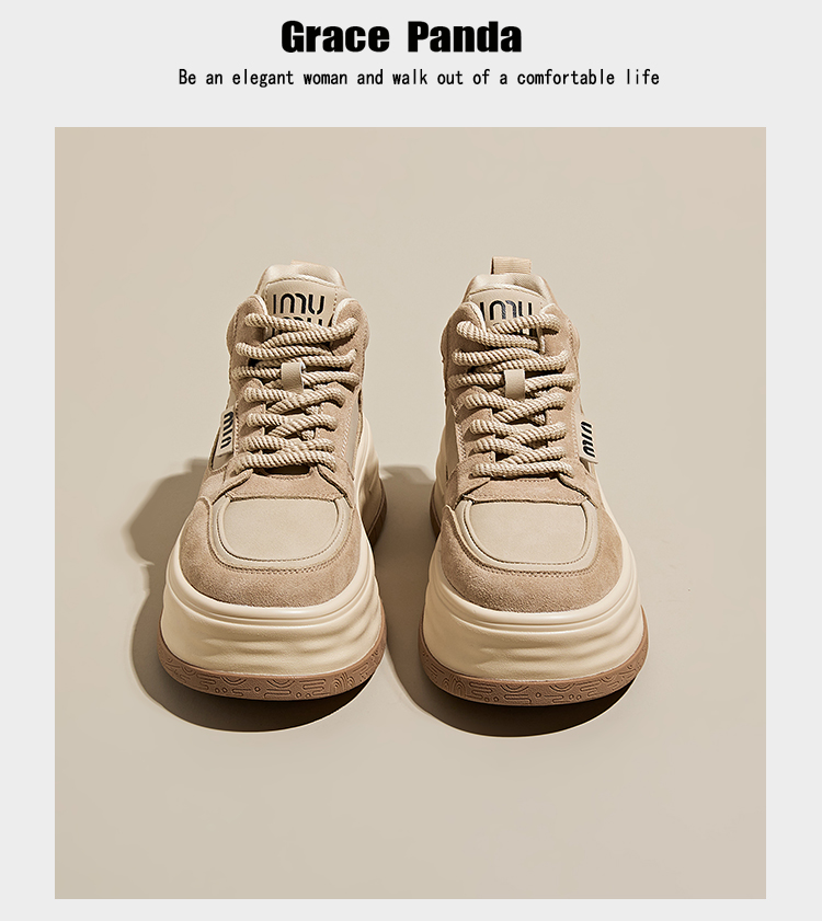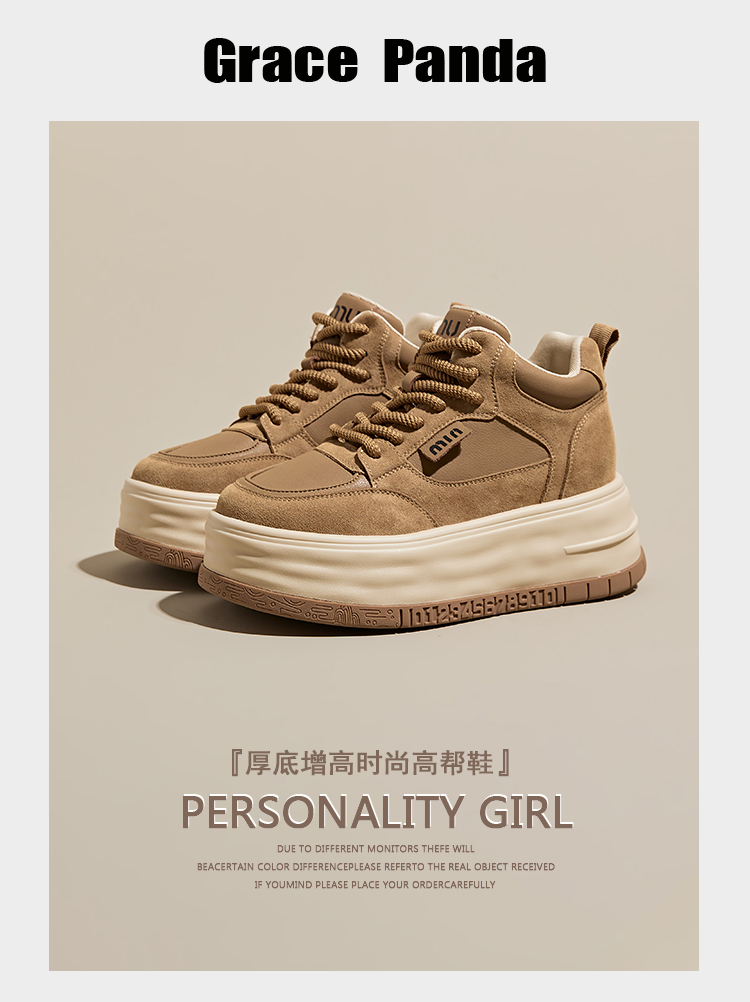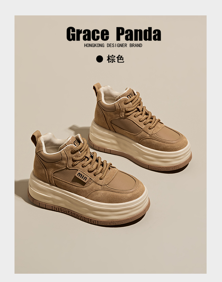 Hong Kong Gp Small-Sized Genuine Leather Brown Thick-Soled Women's Shoes 2025 New Autumn and Winter Height-Increasing Fleece-Lined High-Top Sneakers