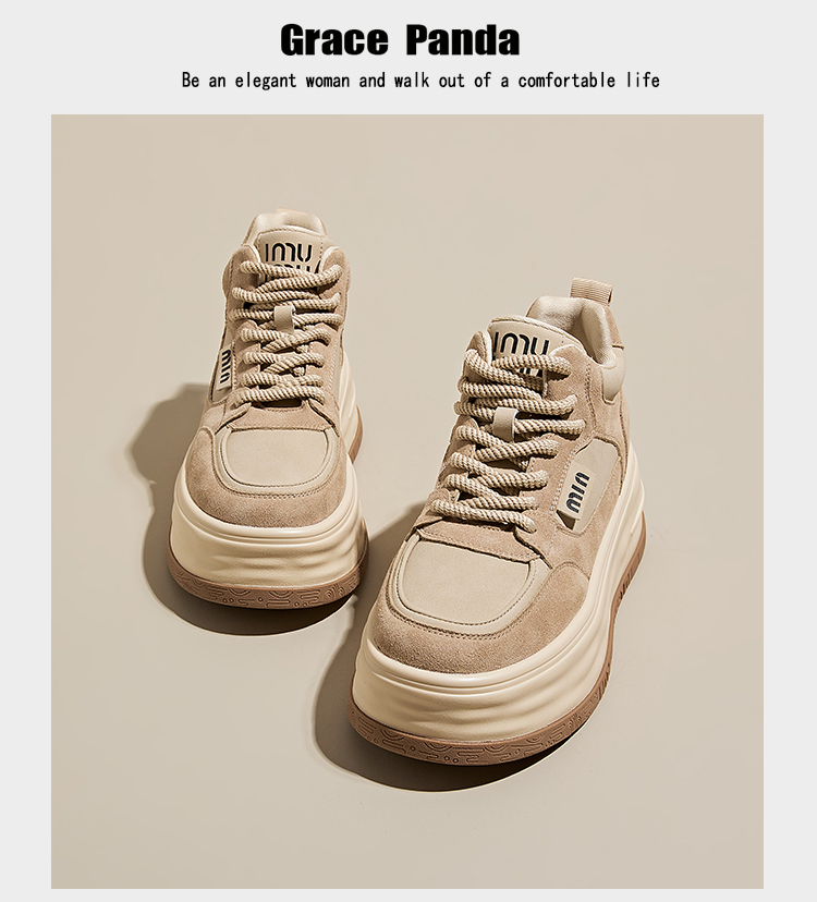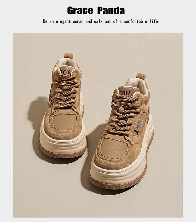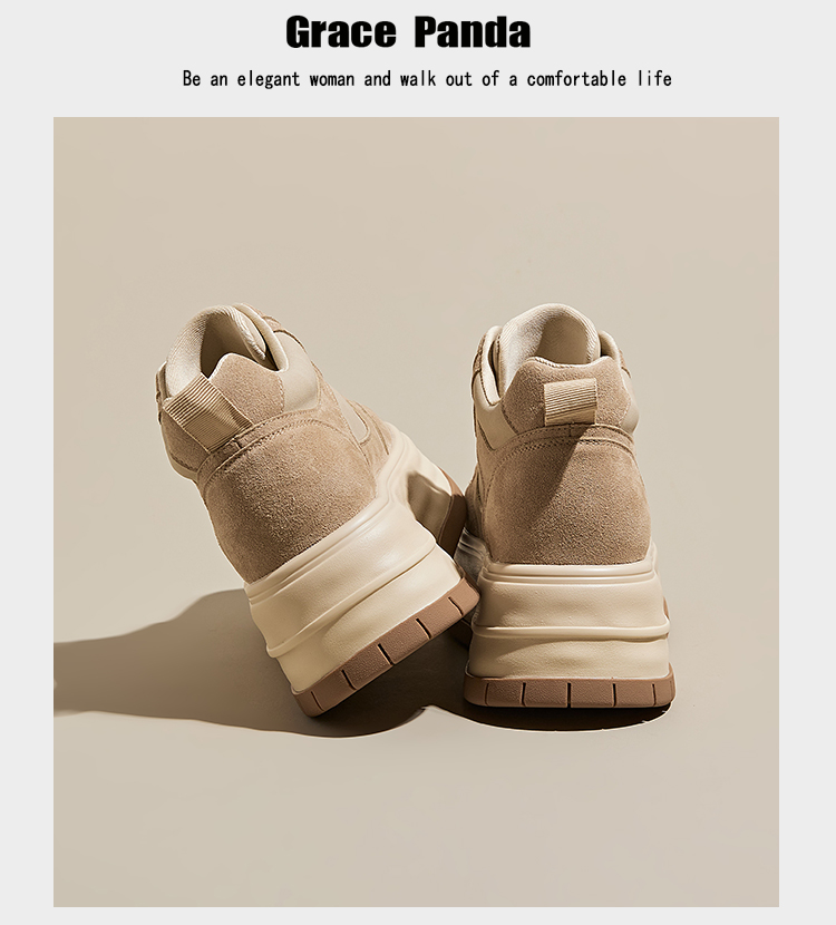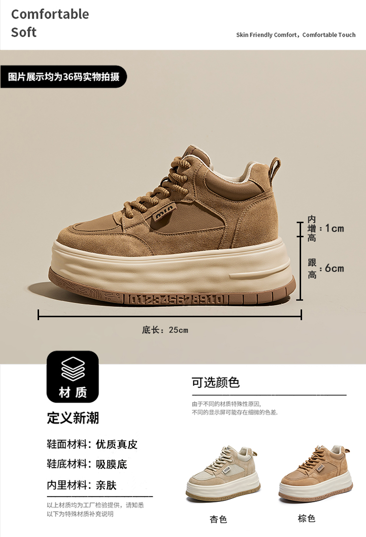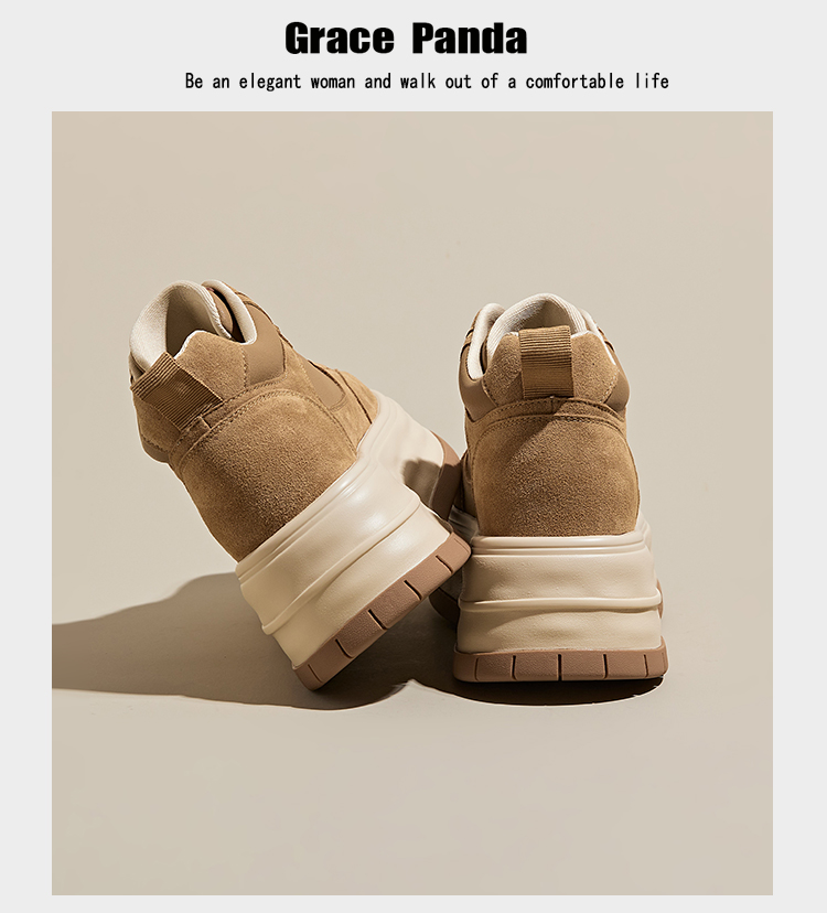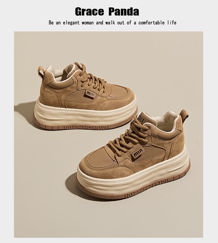 Hong Kong Gp Small-Sized Genuine Leather Brown Thick-Soled Women's Shoes 2025 New Autumn and Winter Height-Increasing Fleece-Lined High-Top Sneakers