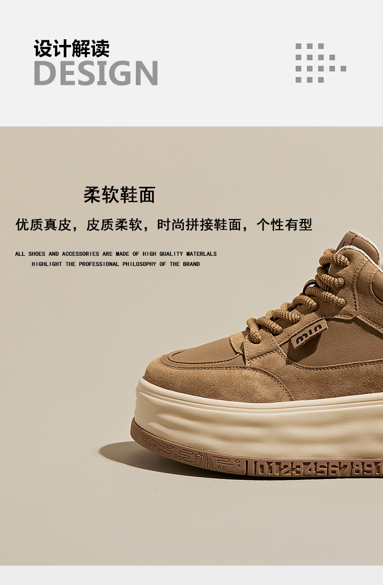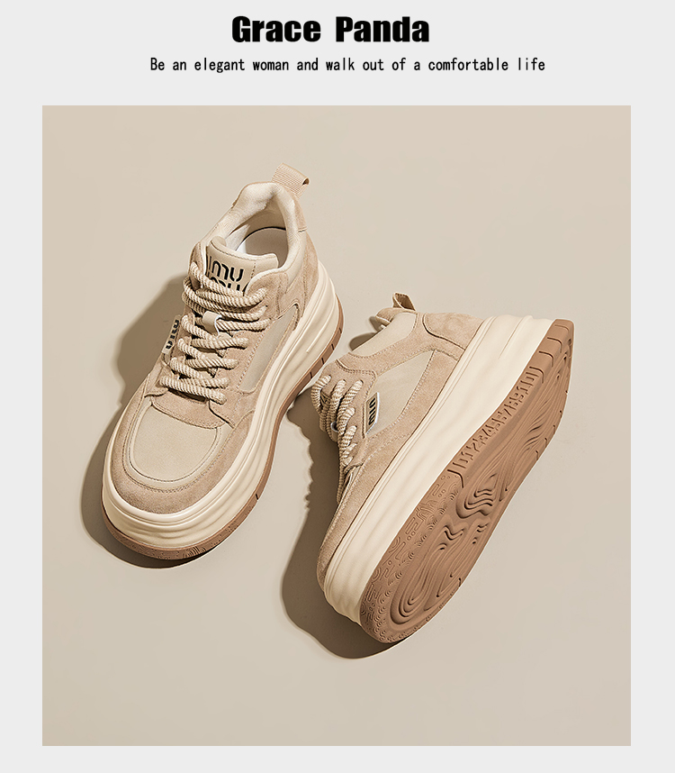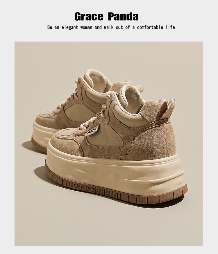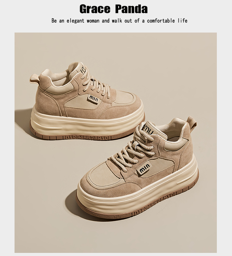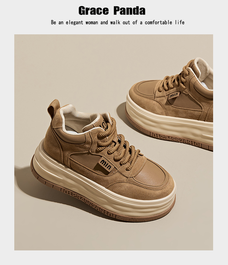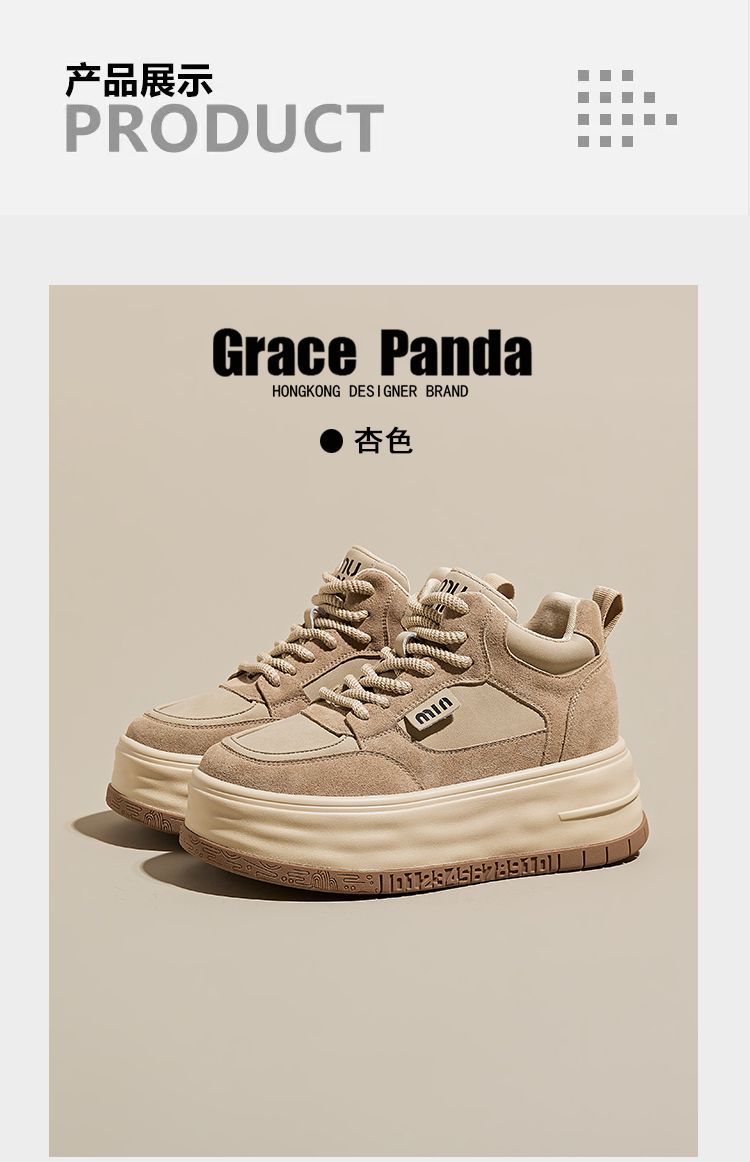 Hong Kong Gp Small-Sized Genuine Leather Brown Thick-Soled Women's Shoes 2025 New Autumn and Winter Height-Increasing Fleece-Lined High-Top Sneakers