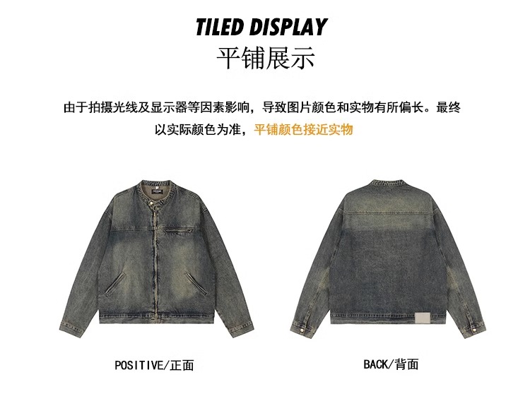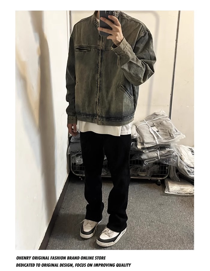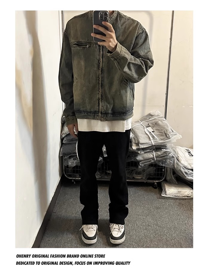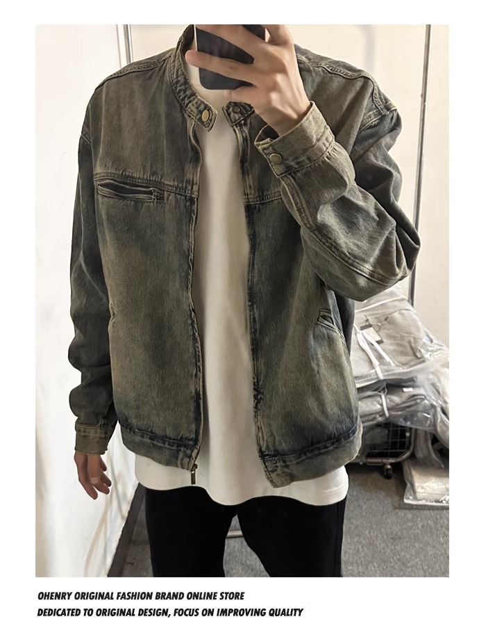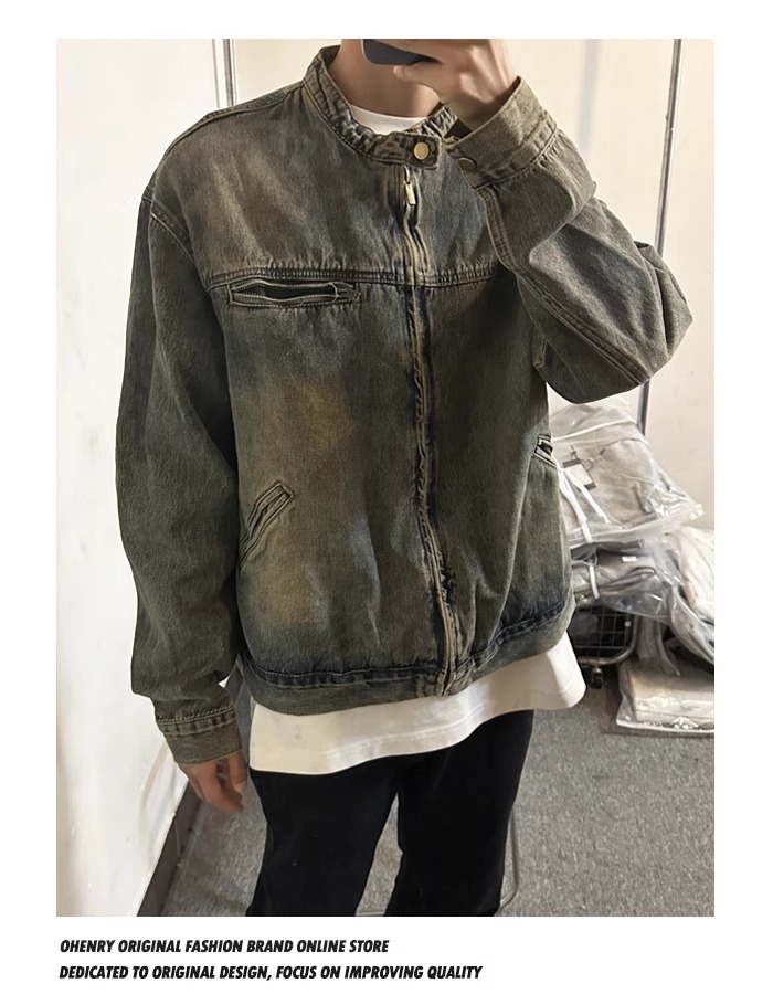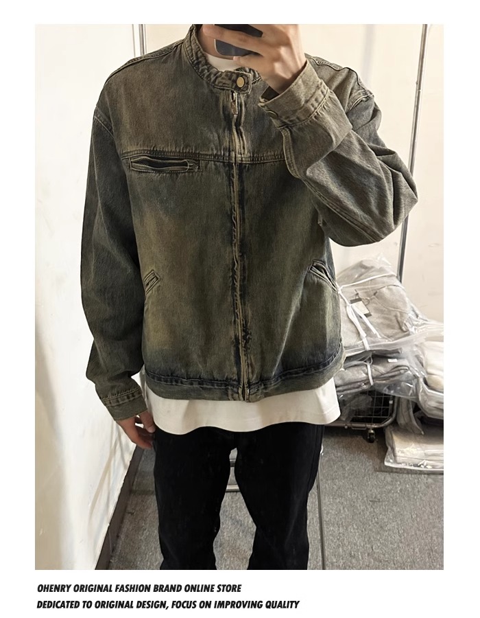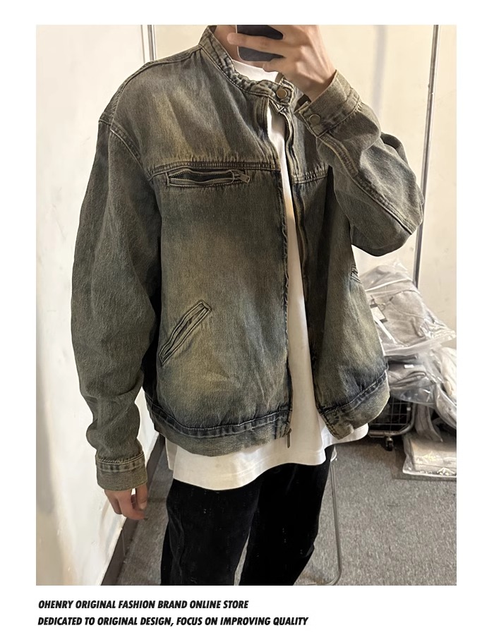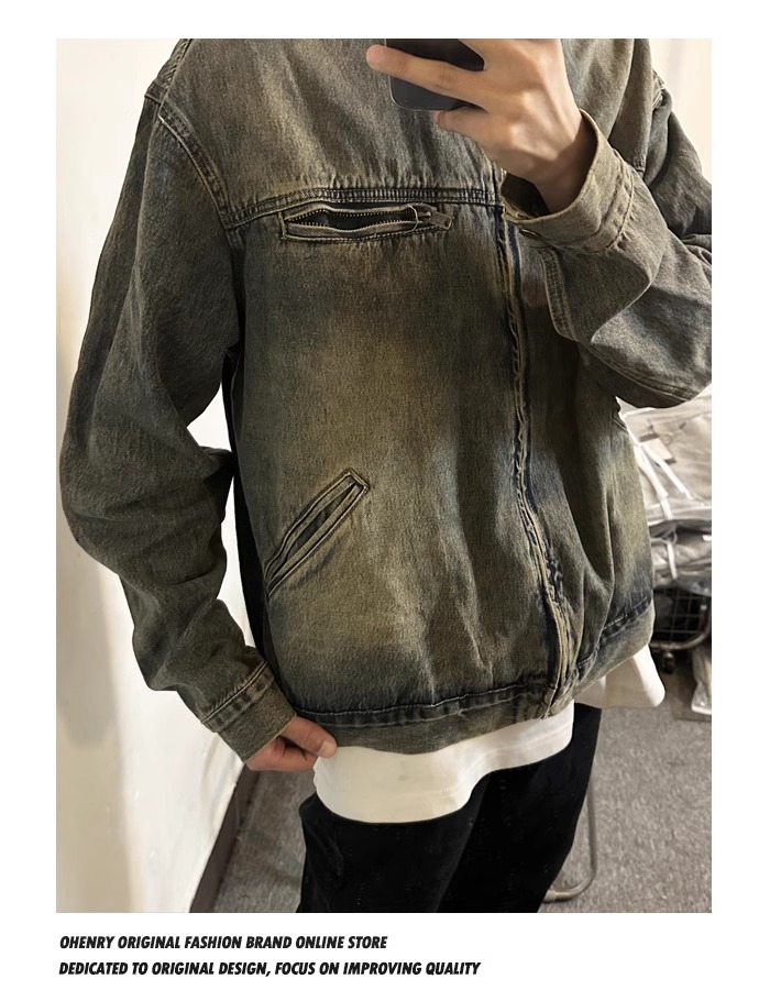 Washed and Distressed Yellow Mud-Dyed Vintage Blue Zip-Up Denim Jacket for Men, Cool and Stylish, Loose and Versatile Jacket Top