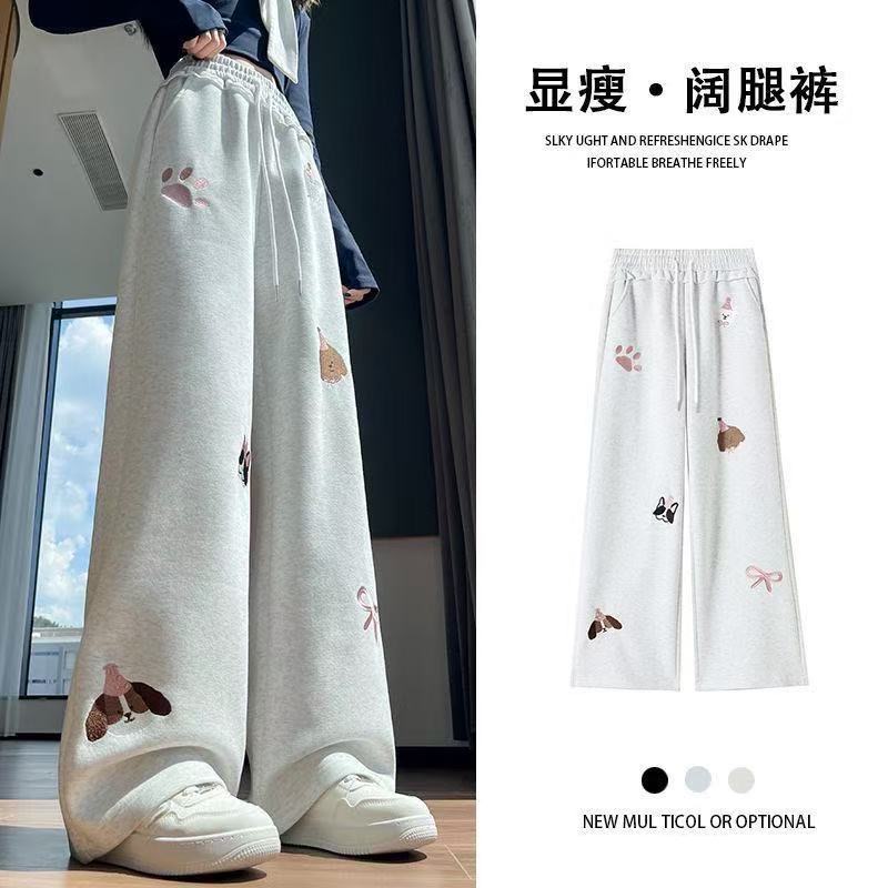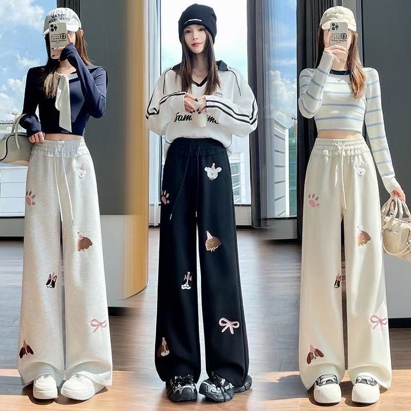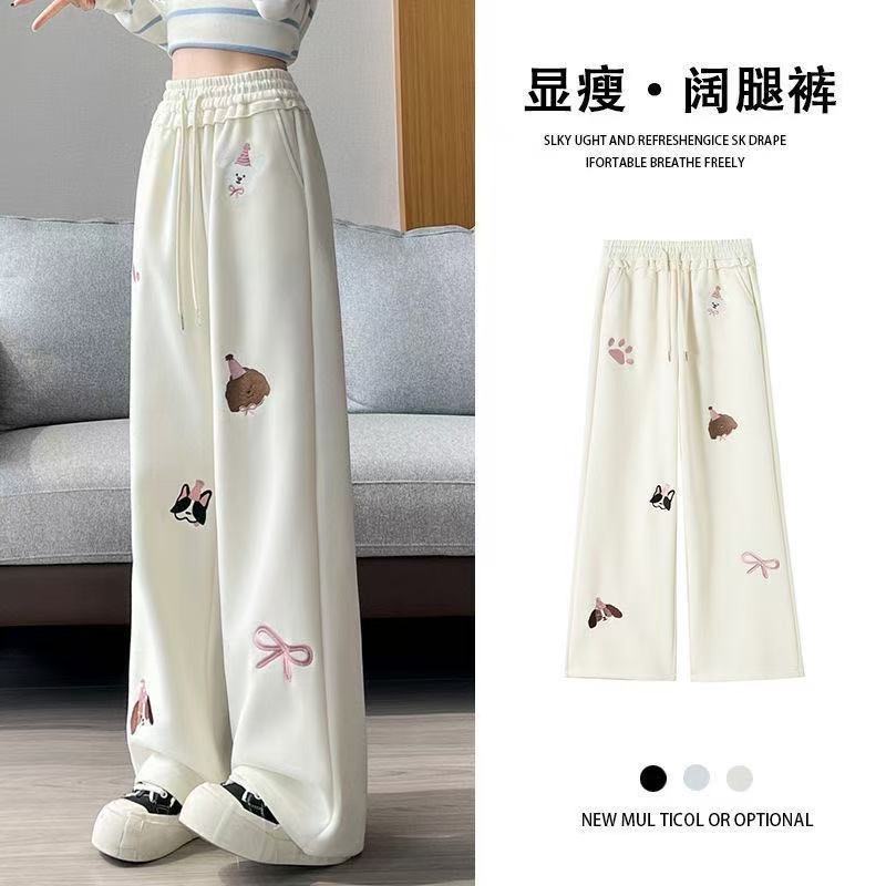 Cute Embroidered Straight-Leg Pants for Women, Sweet Plaid Patchwork, Casual Spring and Autumn New Versatile Loose Wide-Leg Pants Trendy
