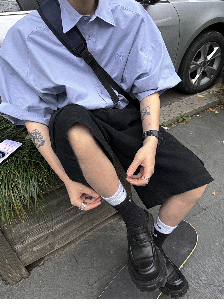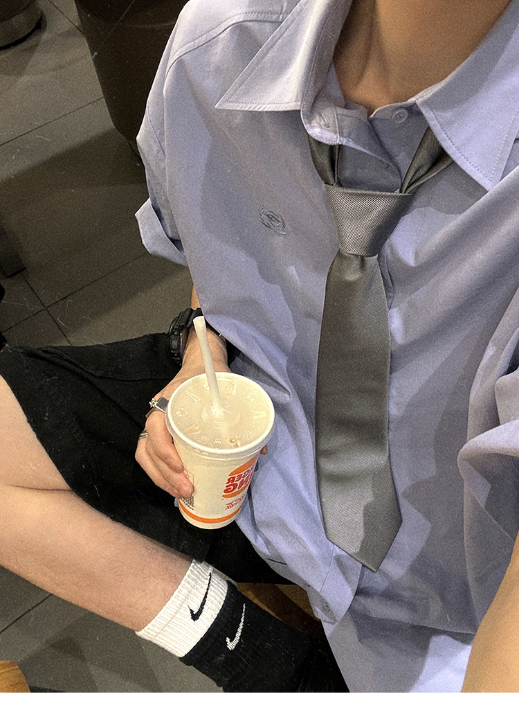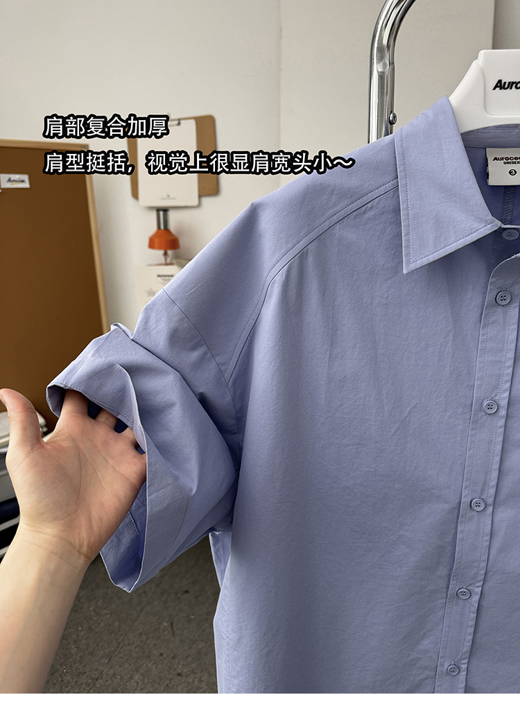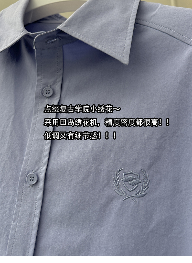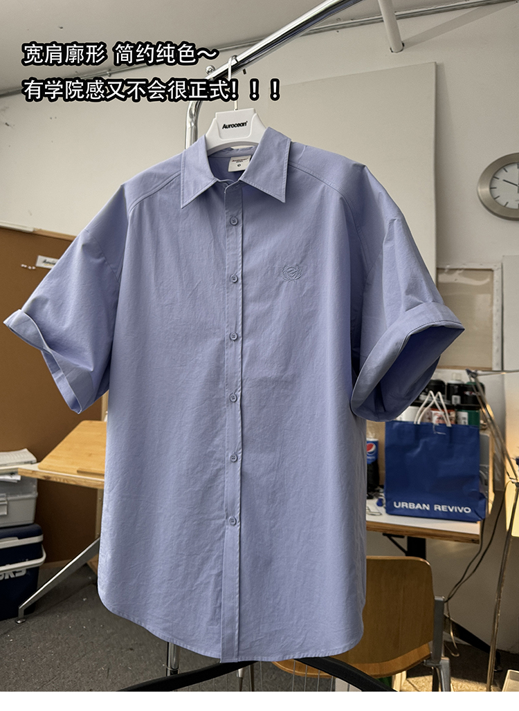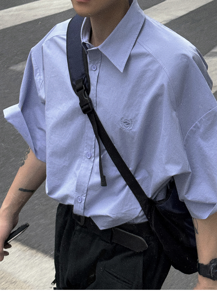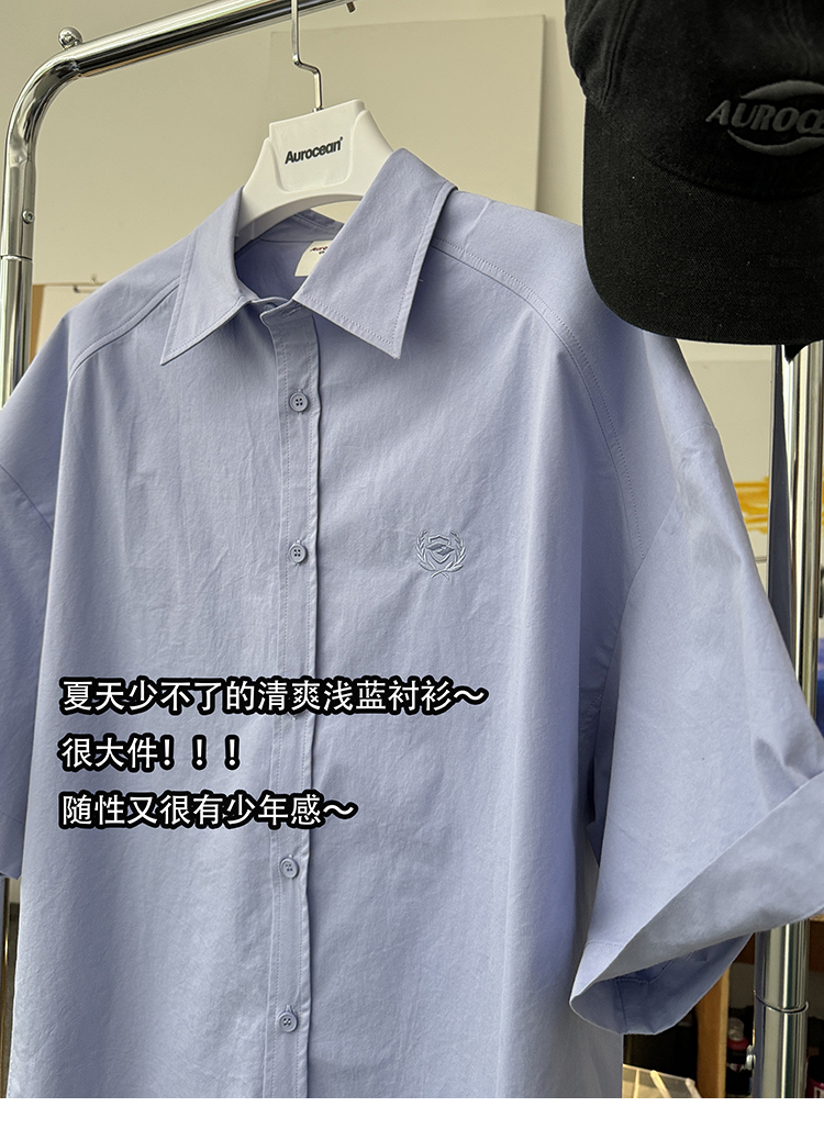 Aurocean Wide-Shoulder Oversized Shirt, Loose and Youthful, Retro College-Style Embroidered Light Blue Pure Cotton Short-Sleeve