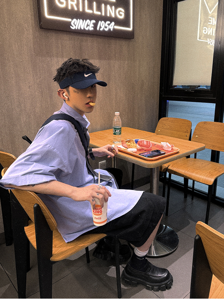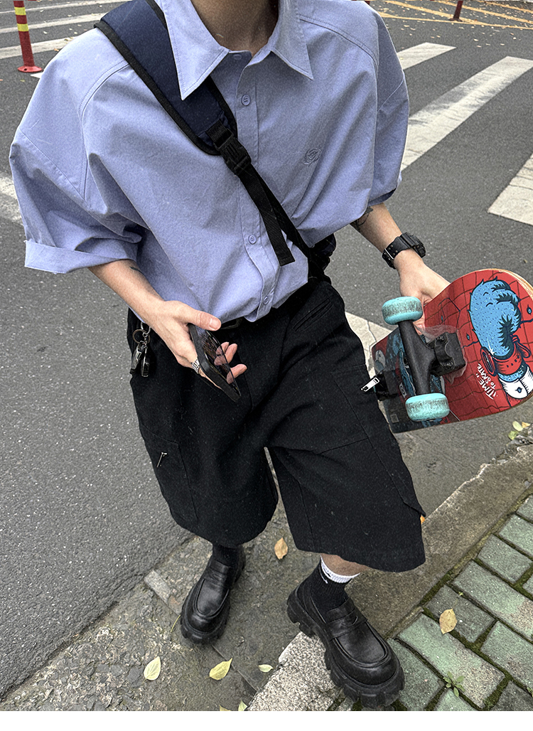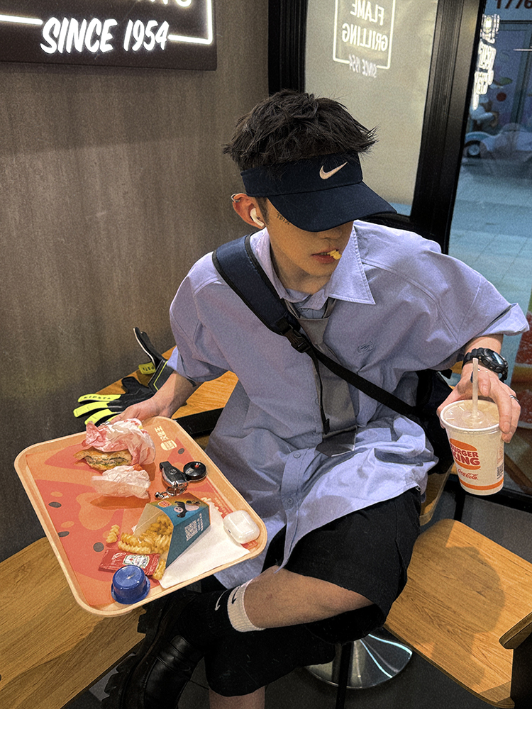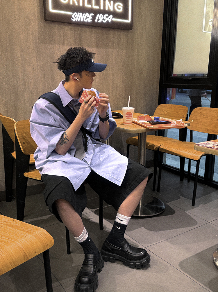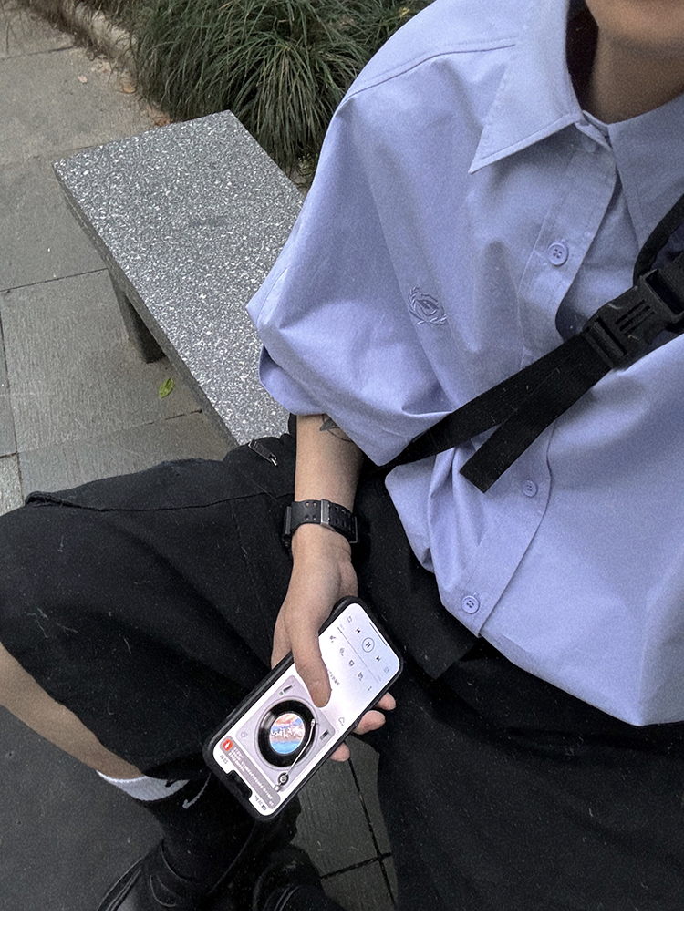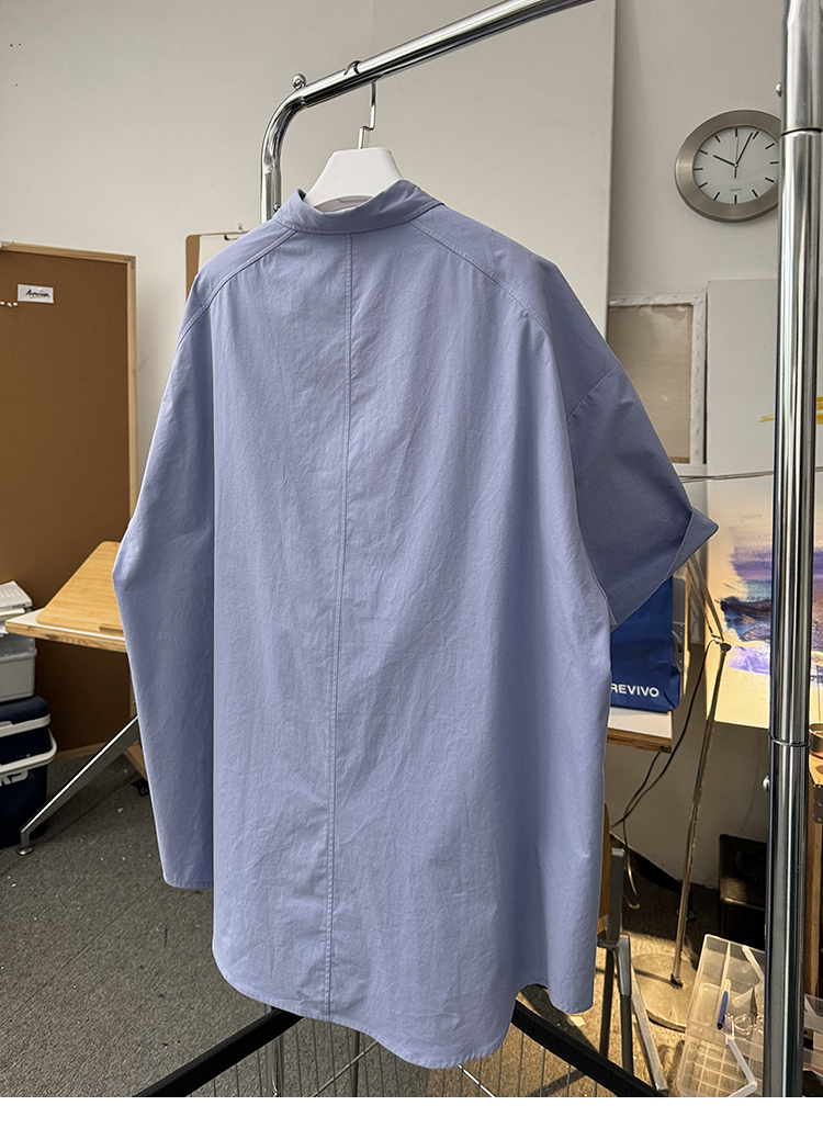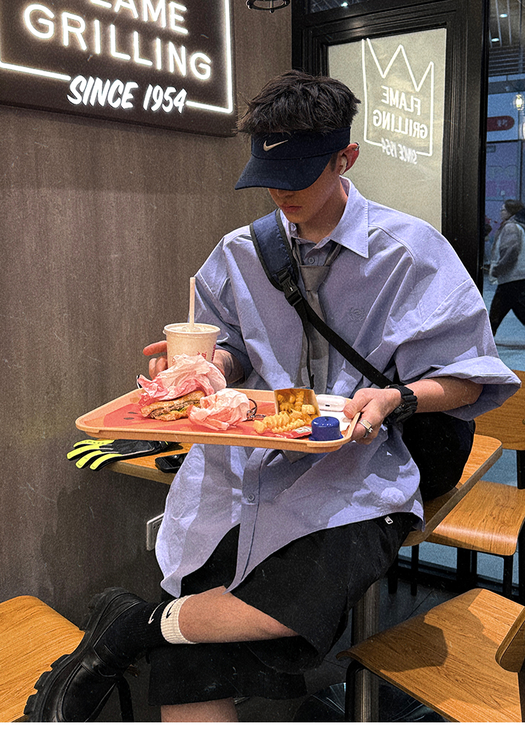 Aurocean Wide-Shoulder Oversized Shirt, Loose and Youthful, Retro College-Style Embroidered Light Blue Pure Cotton Short-Sleeve