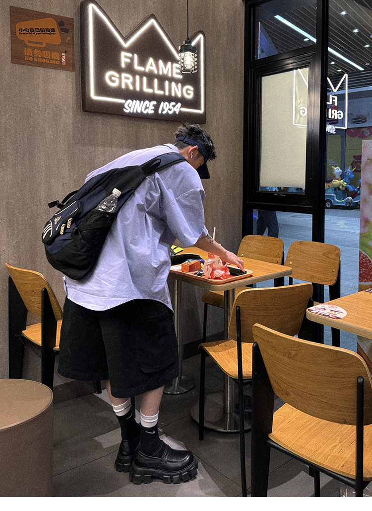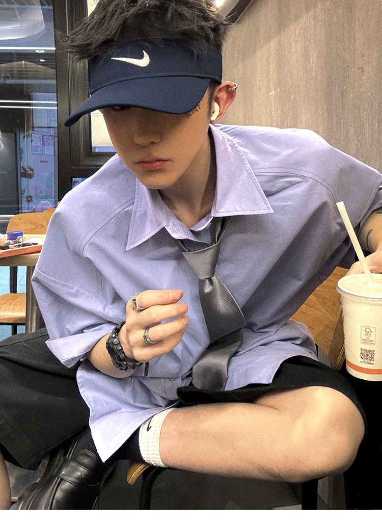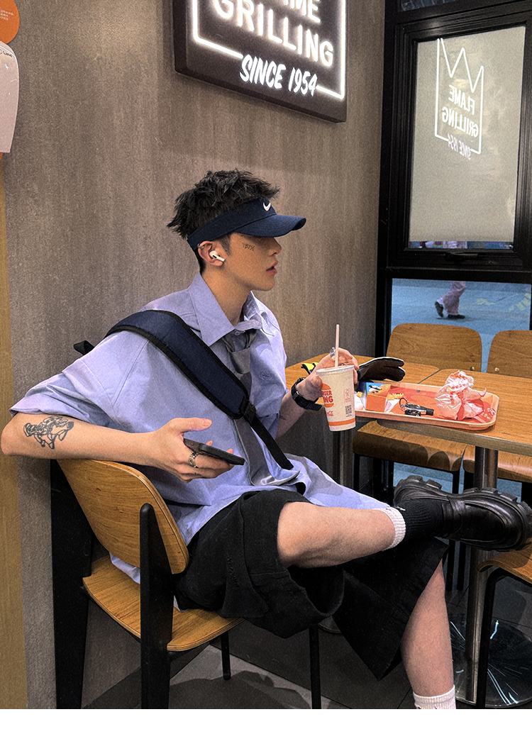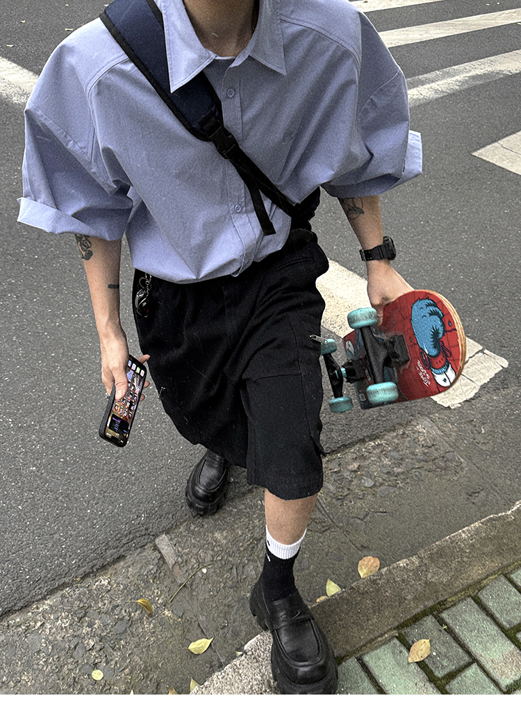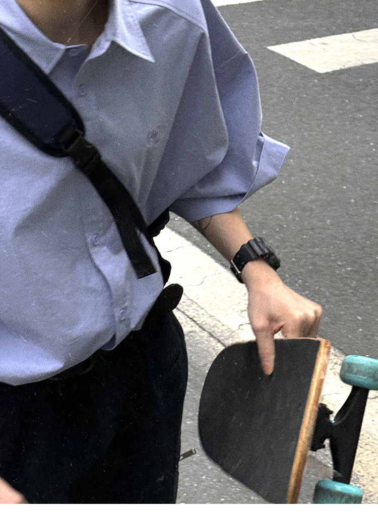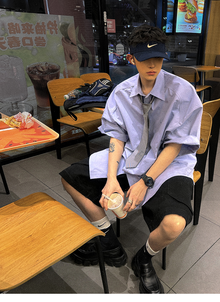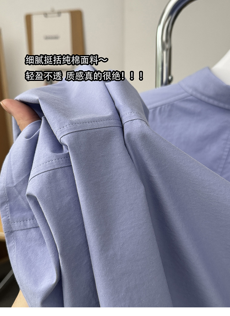 Aurocean Wide-Shoulder Oversized Shirt, Loose and Youthful, Retro College-Style Embroidered Light Blue Pure Cotton Short-Sleeve