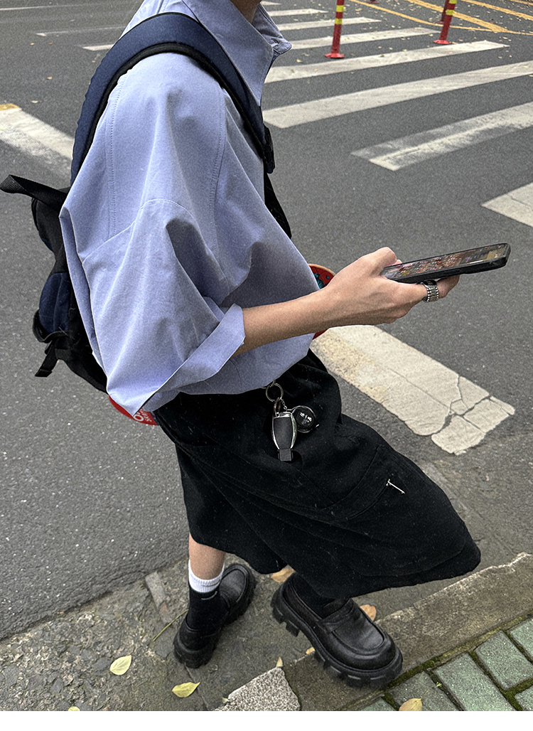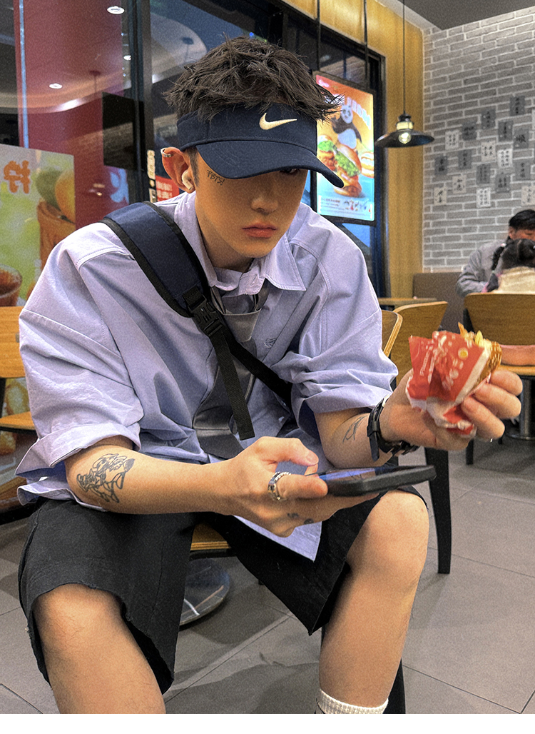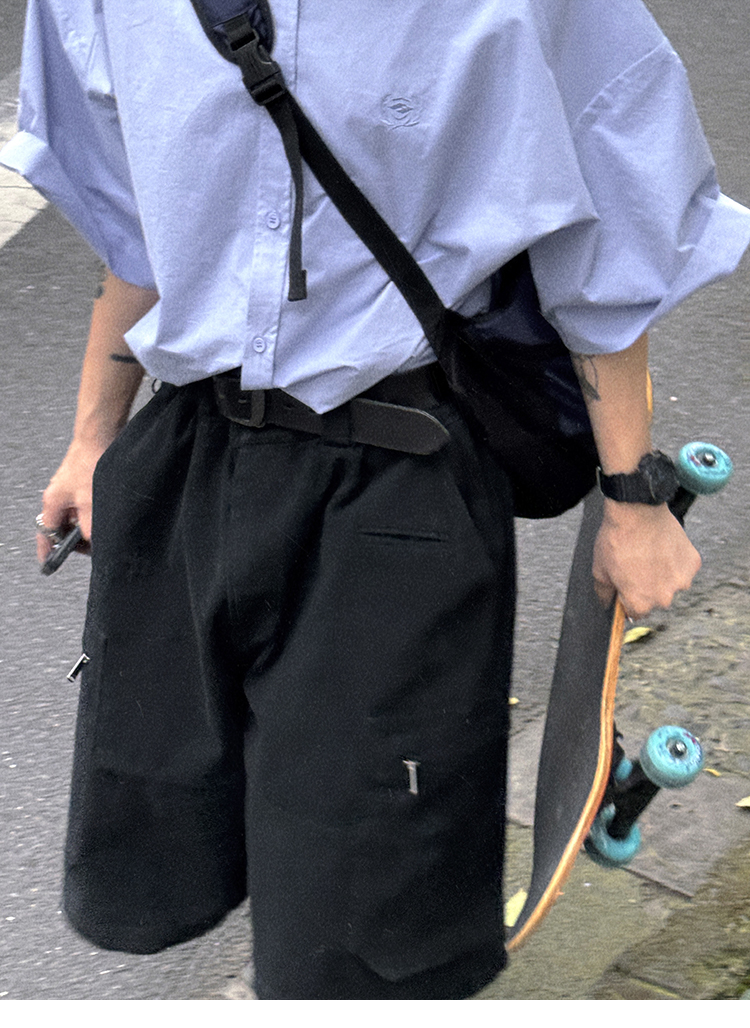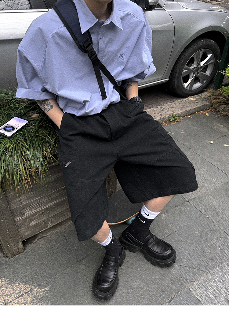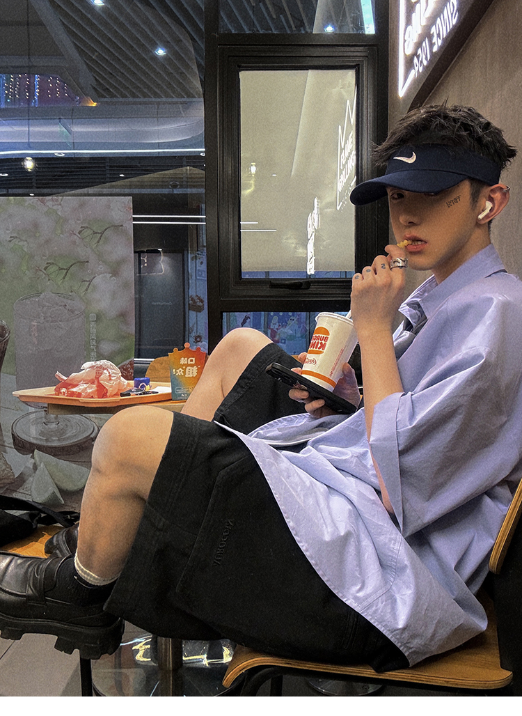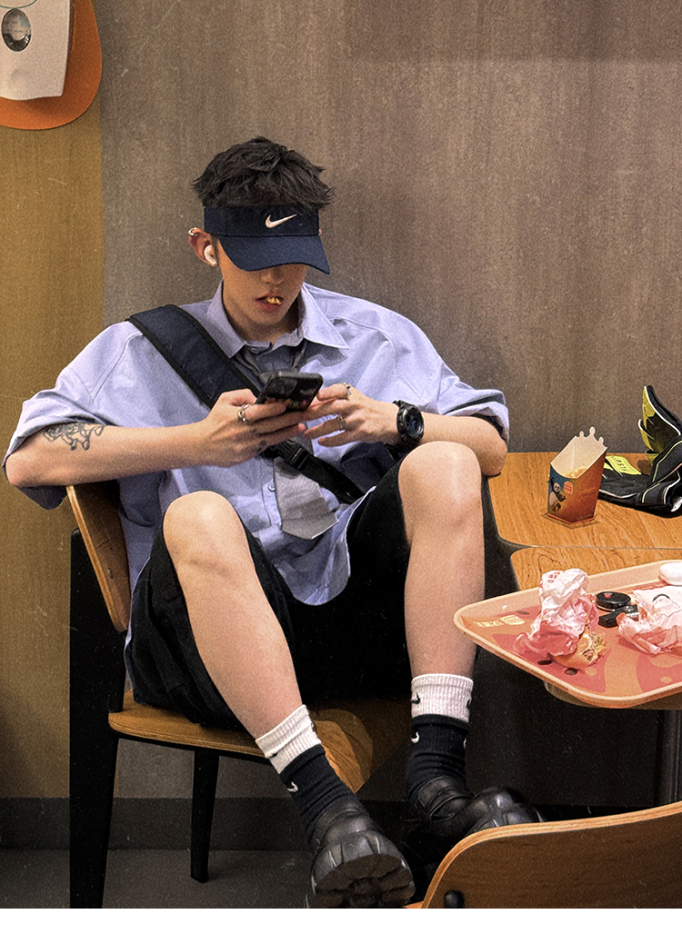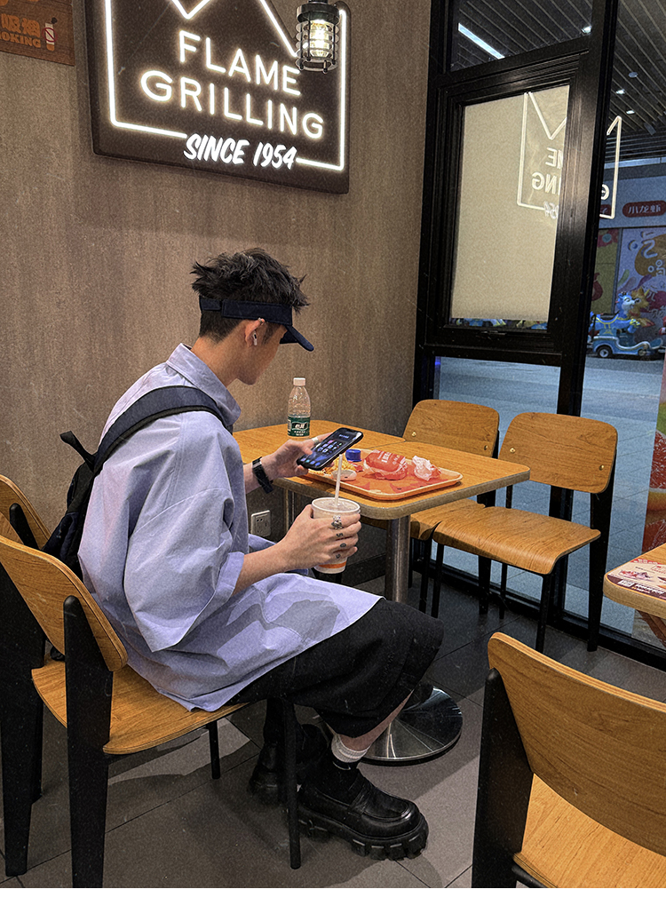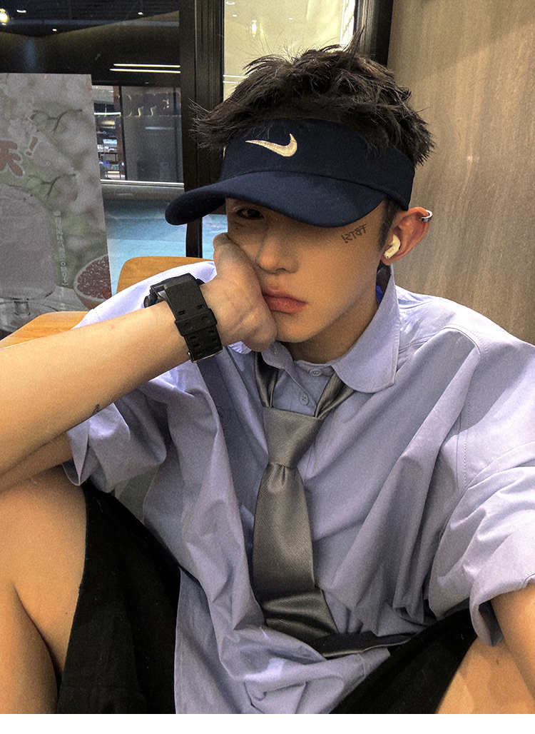 Aurocean Wide-Shoulder Oversized Shirt, Loose and Youthful, Retro College-Style Embroidered Light Blue Pure Cotton Short-Sleeve