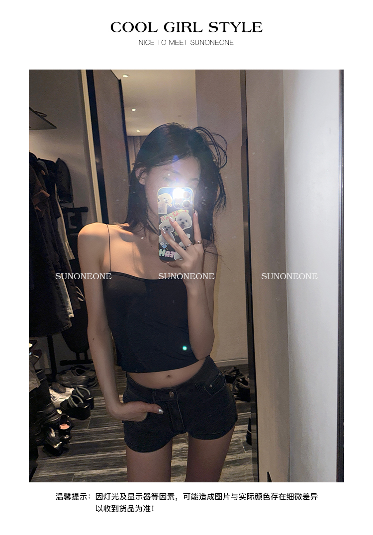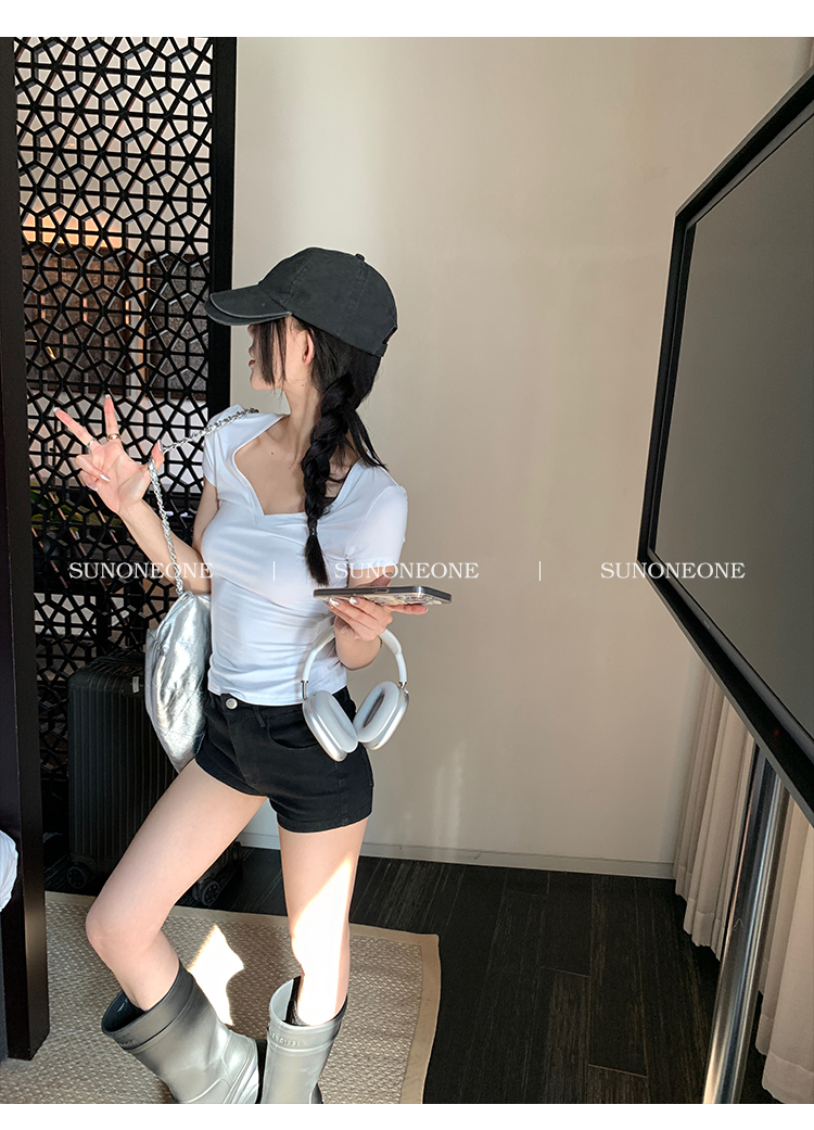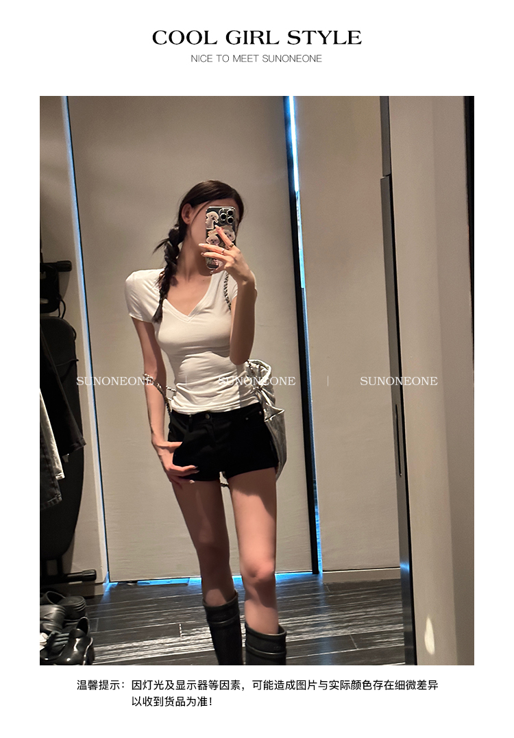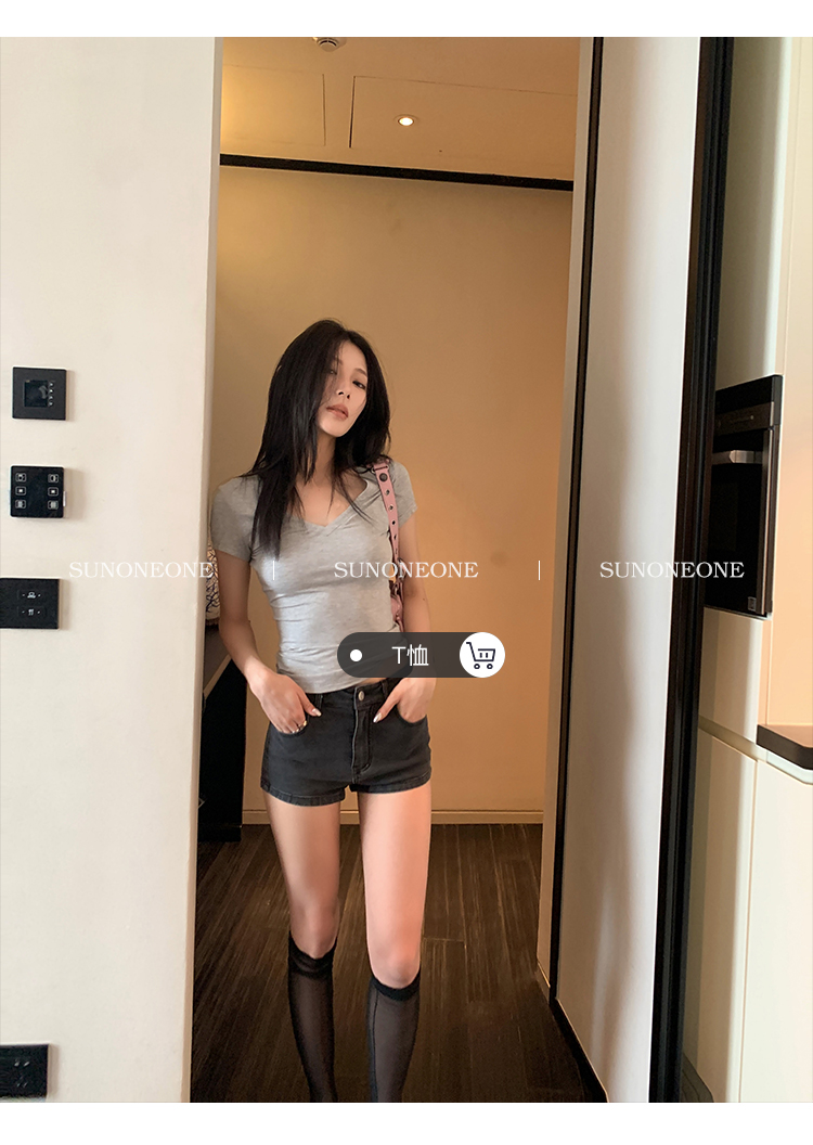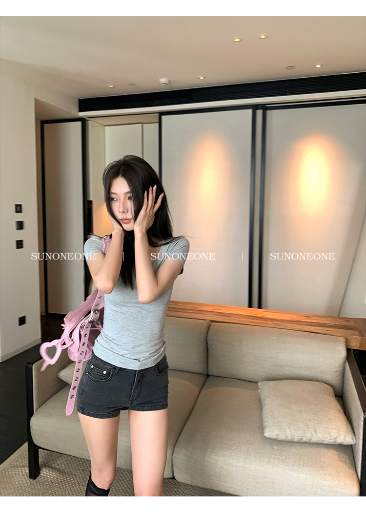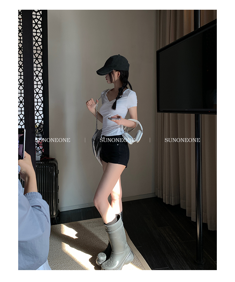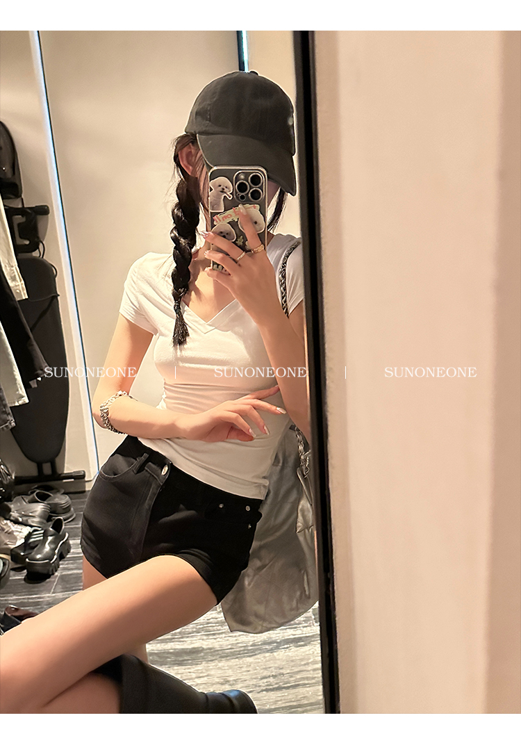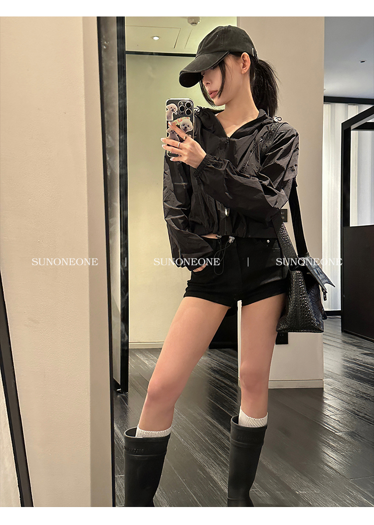 Sunoneone American Style Hot Pants Denim Shorts for Women, Summer Versatile Black Petite Slimming Tight Pants