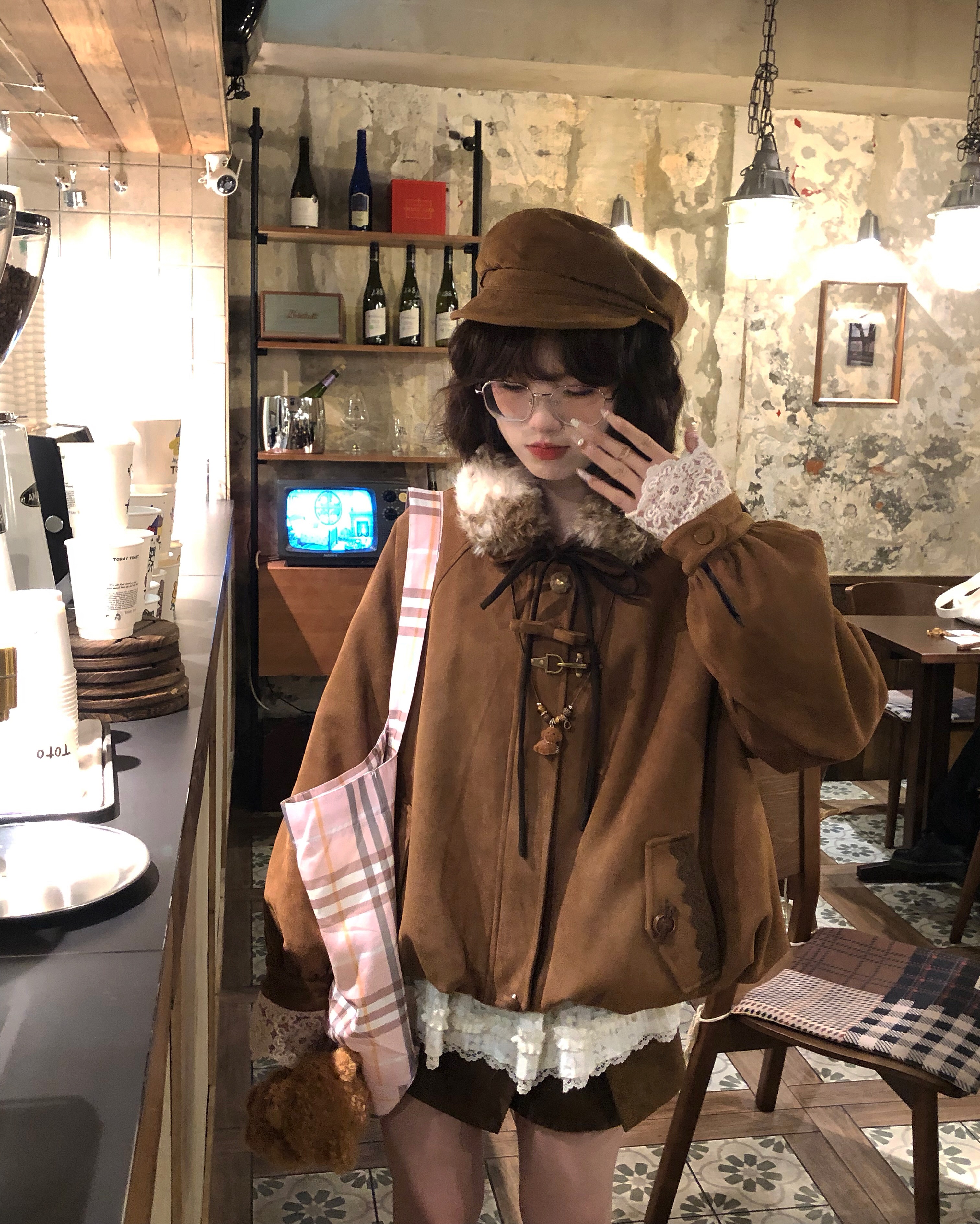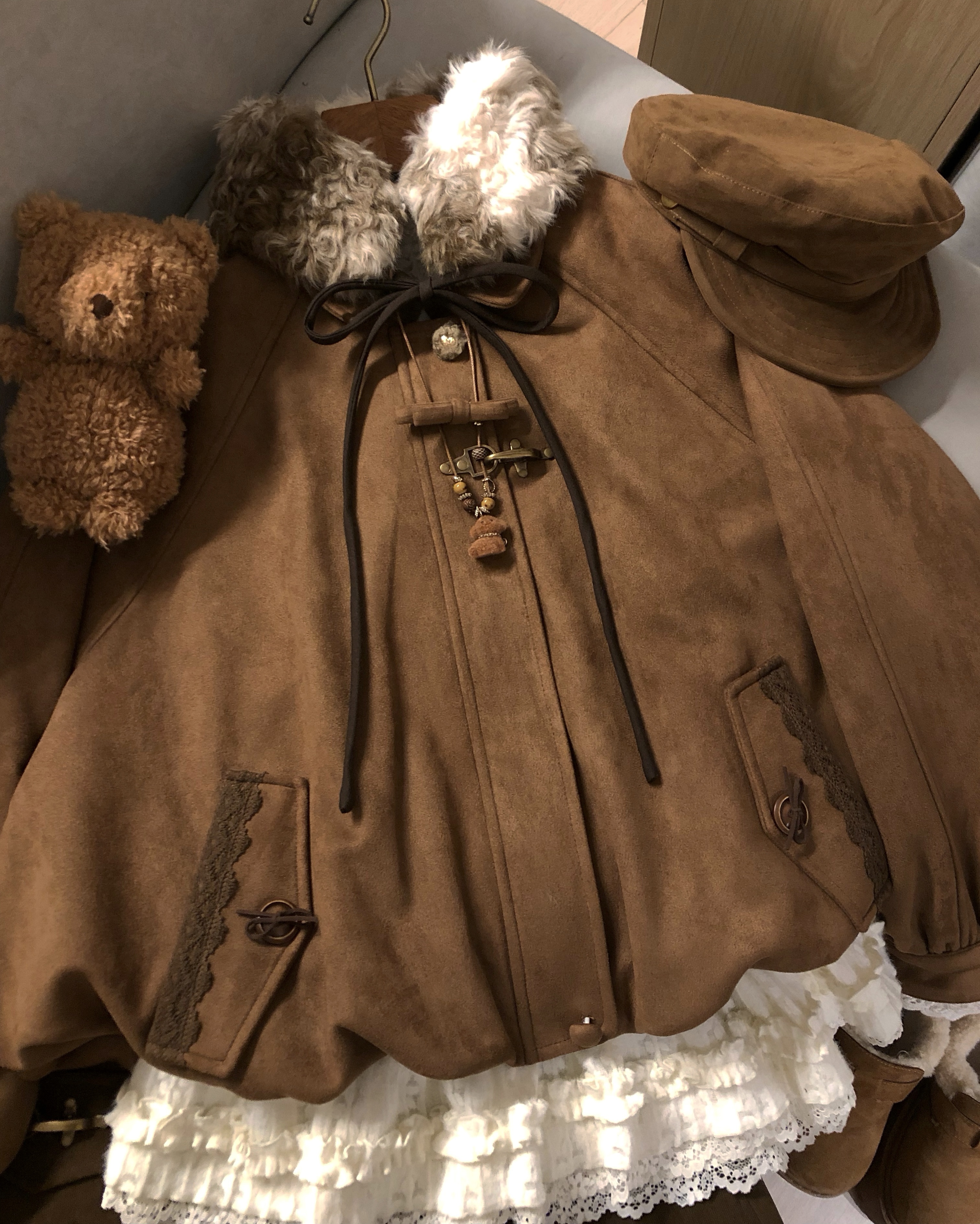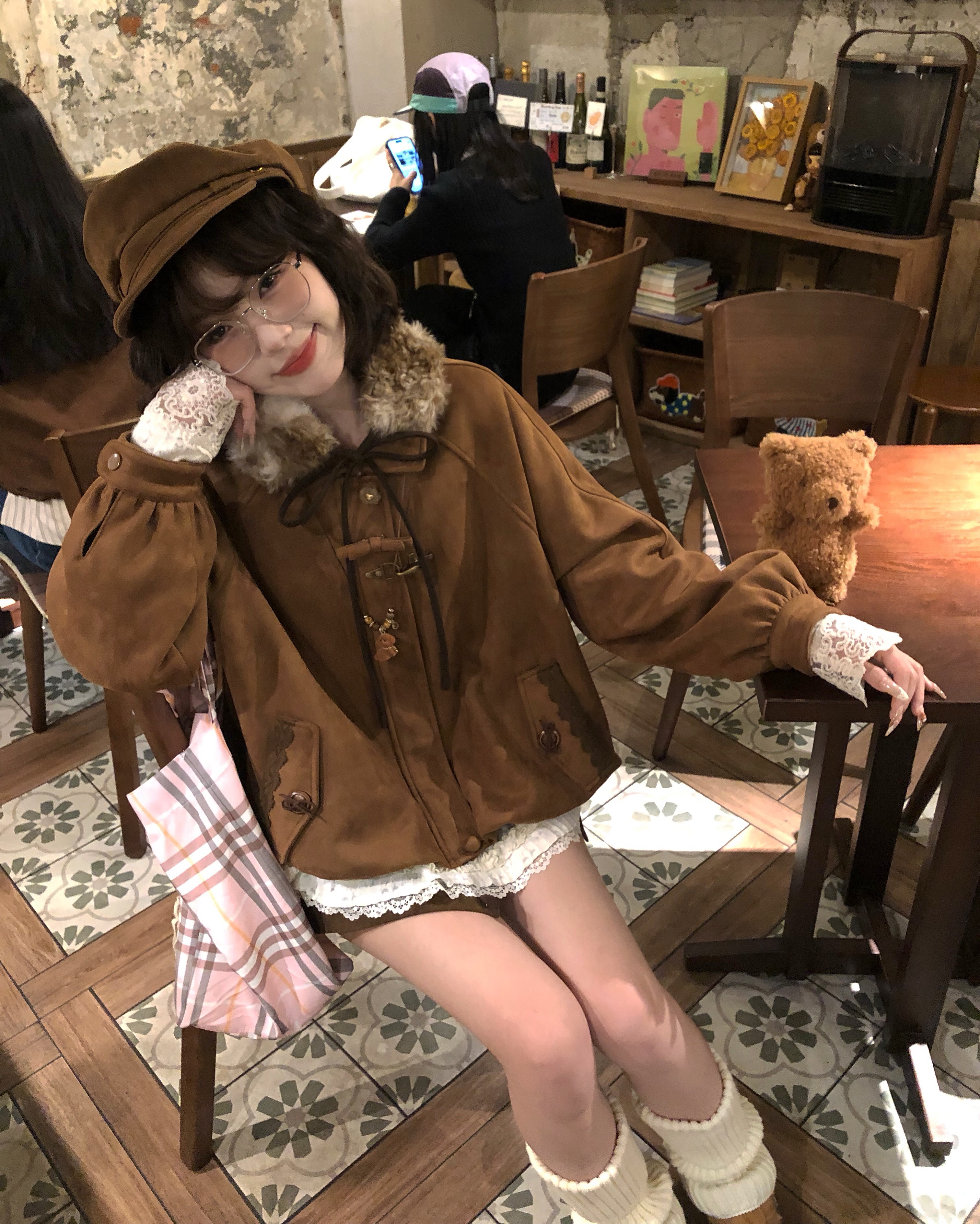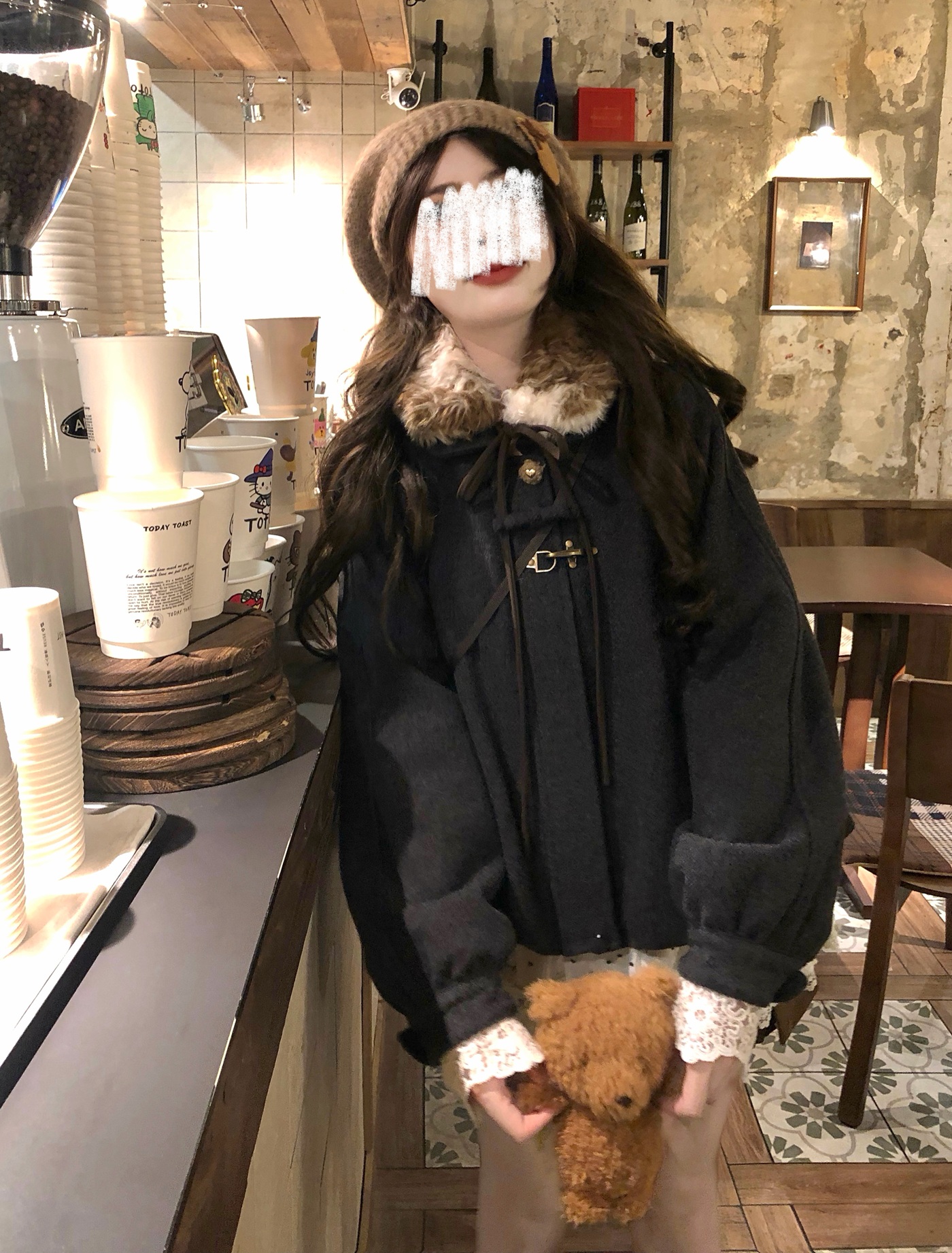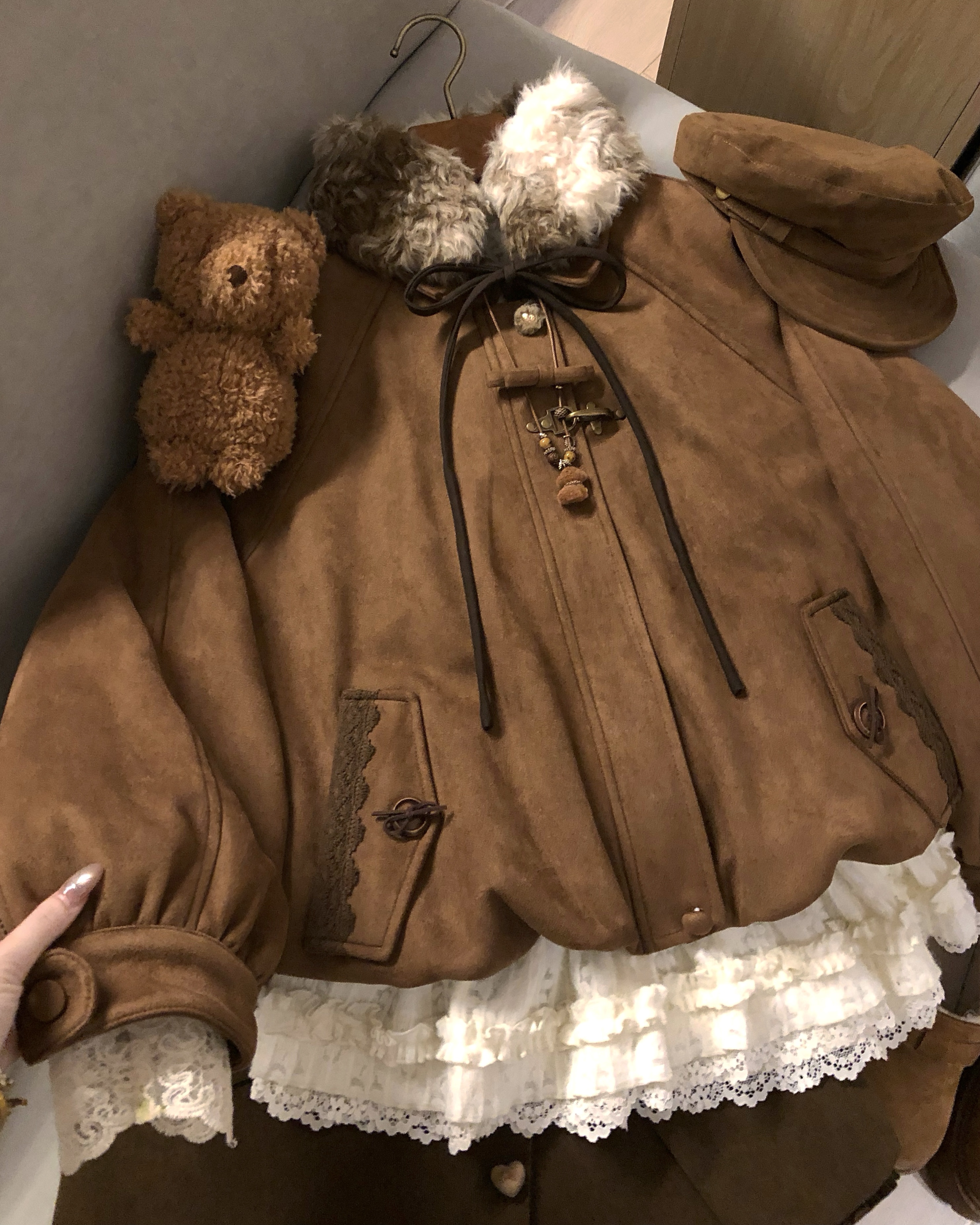 【Alittle Messy】 "Layered Style with a Vintage Feel: Furry Collar Cotton-Padded Jacket with Puff Sleeves and Vintage Style Padding Inside the Jacket