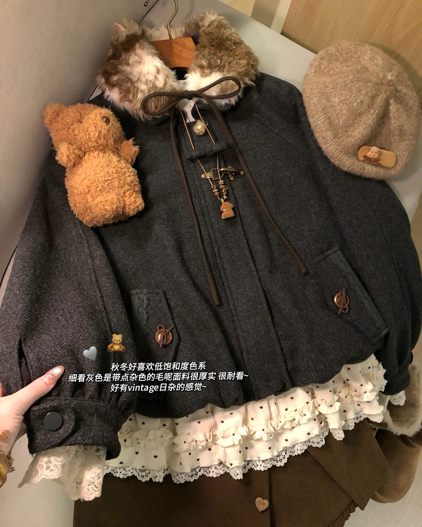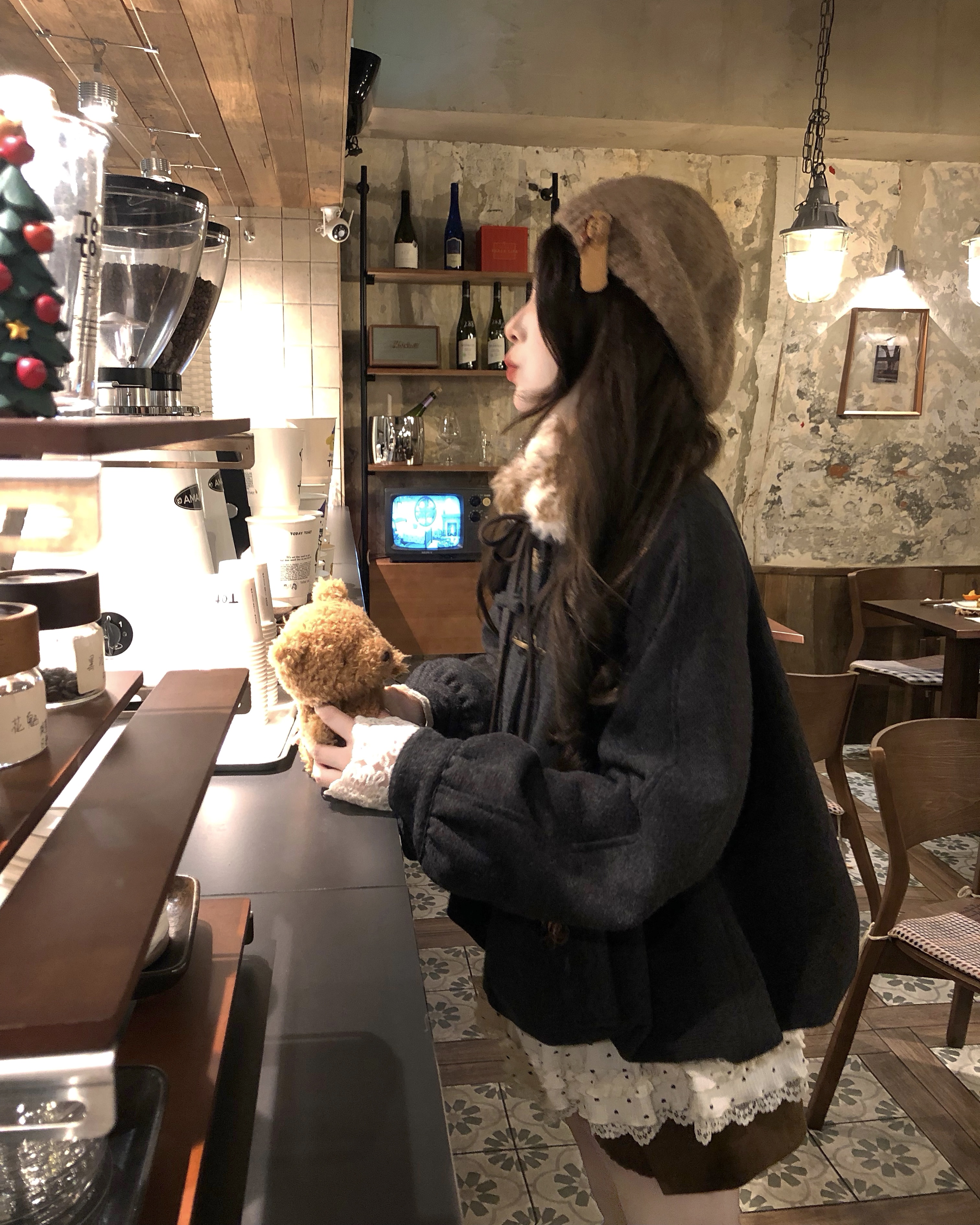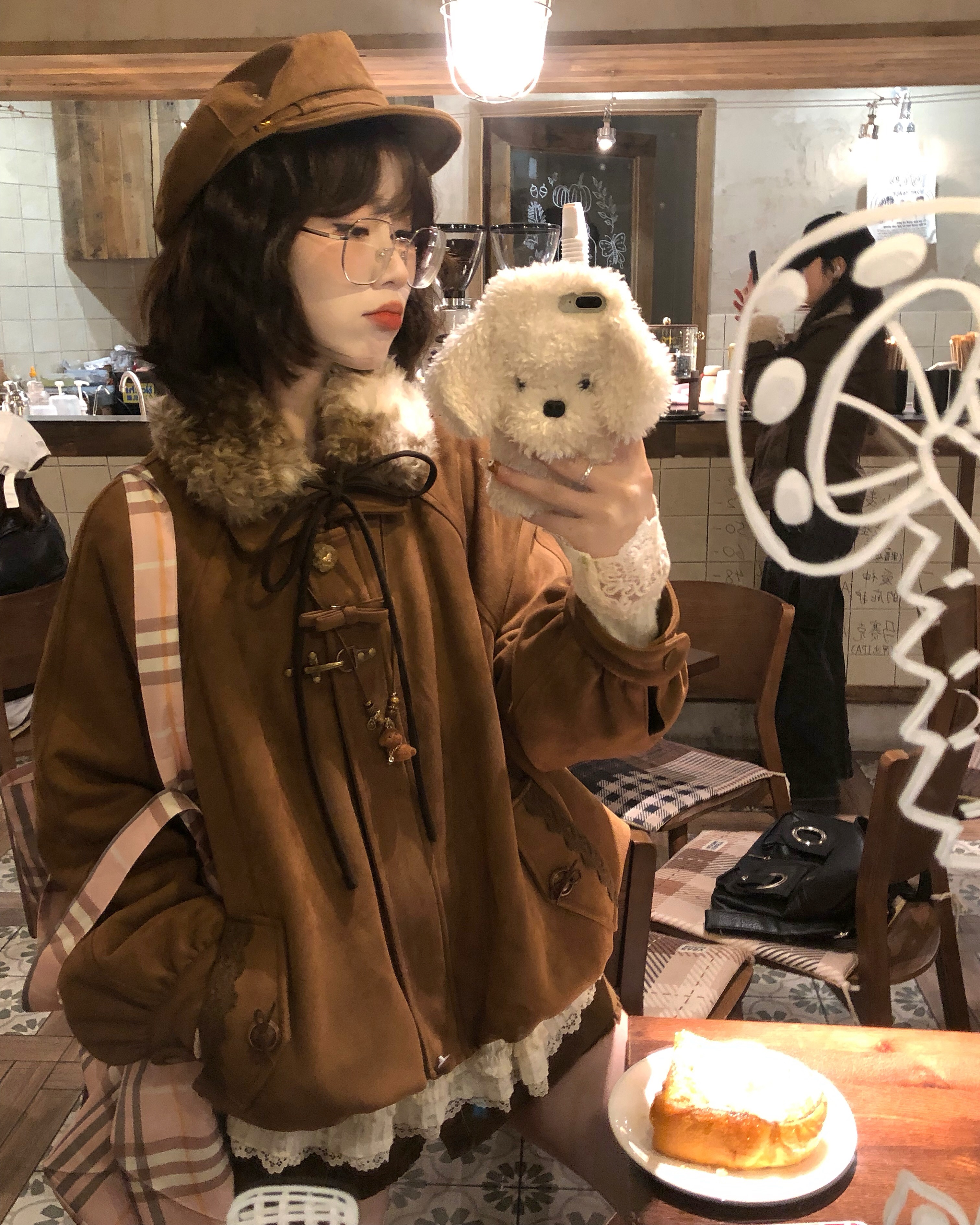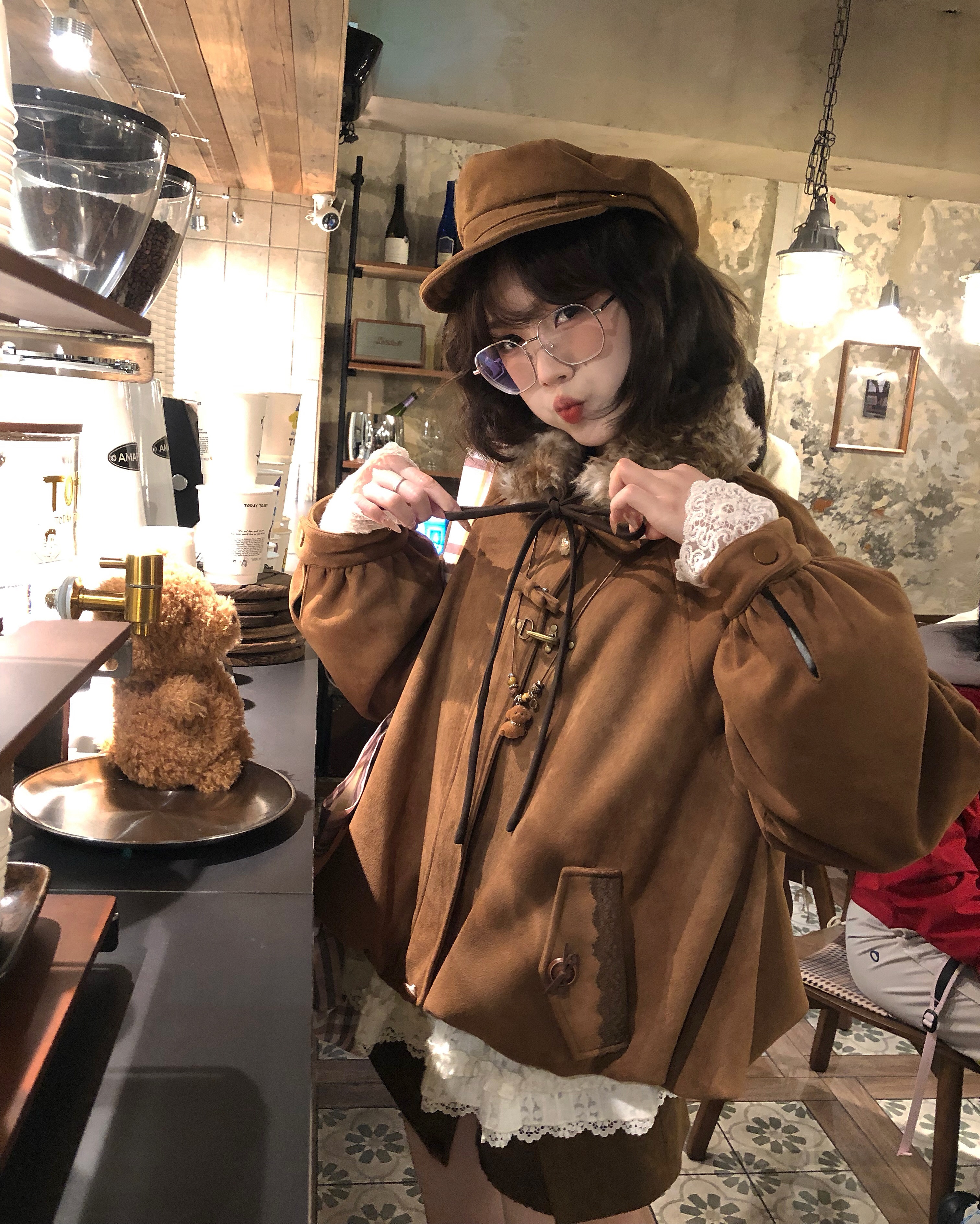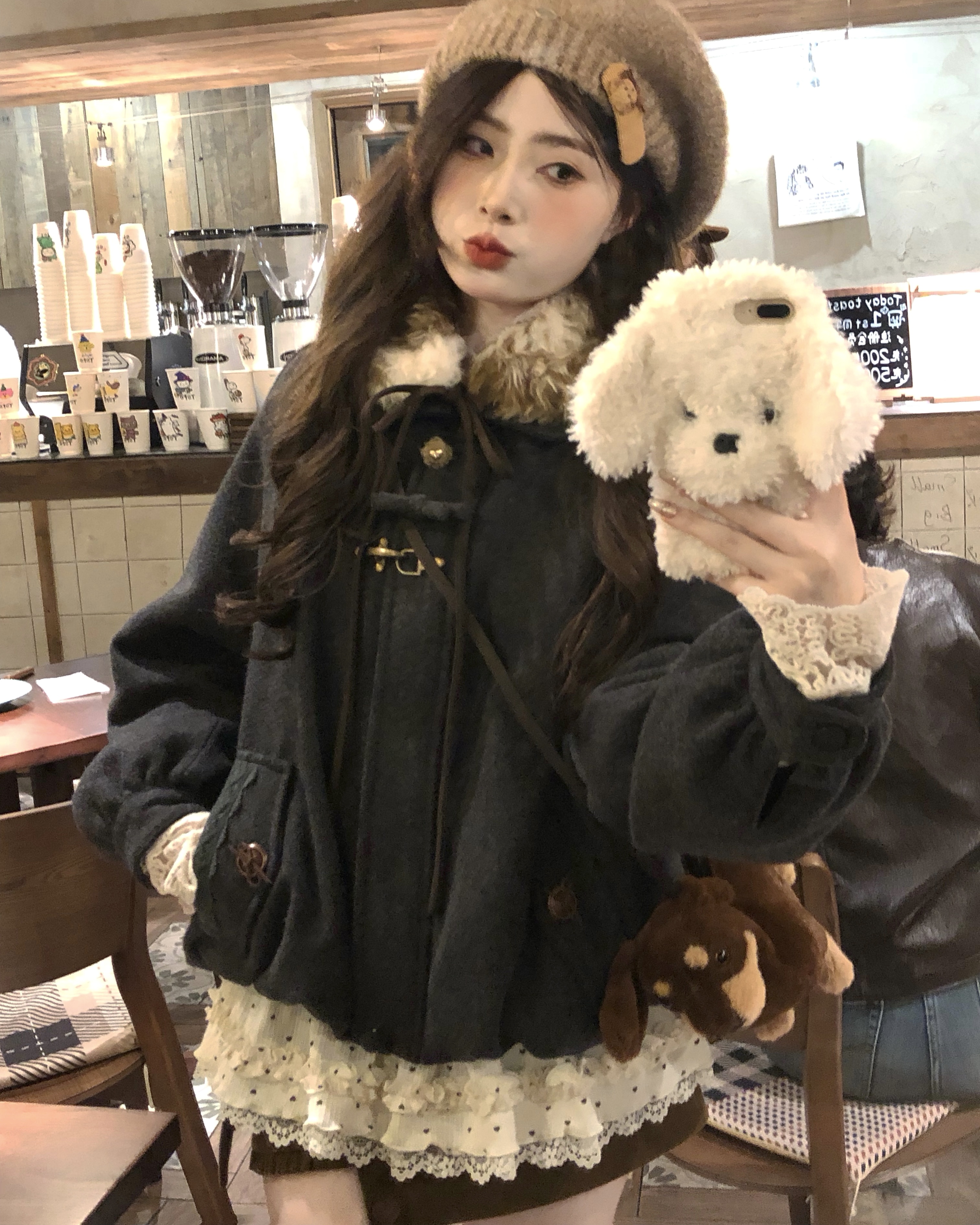 【Alittle Messy】 "Layered Style with a Vintage Feel: Furry Collar Cotton-Padded Jacket with Puff Sleeves and Vintage Style Padding Inside the Jacket