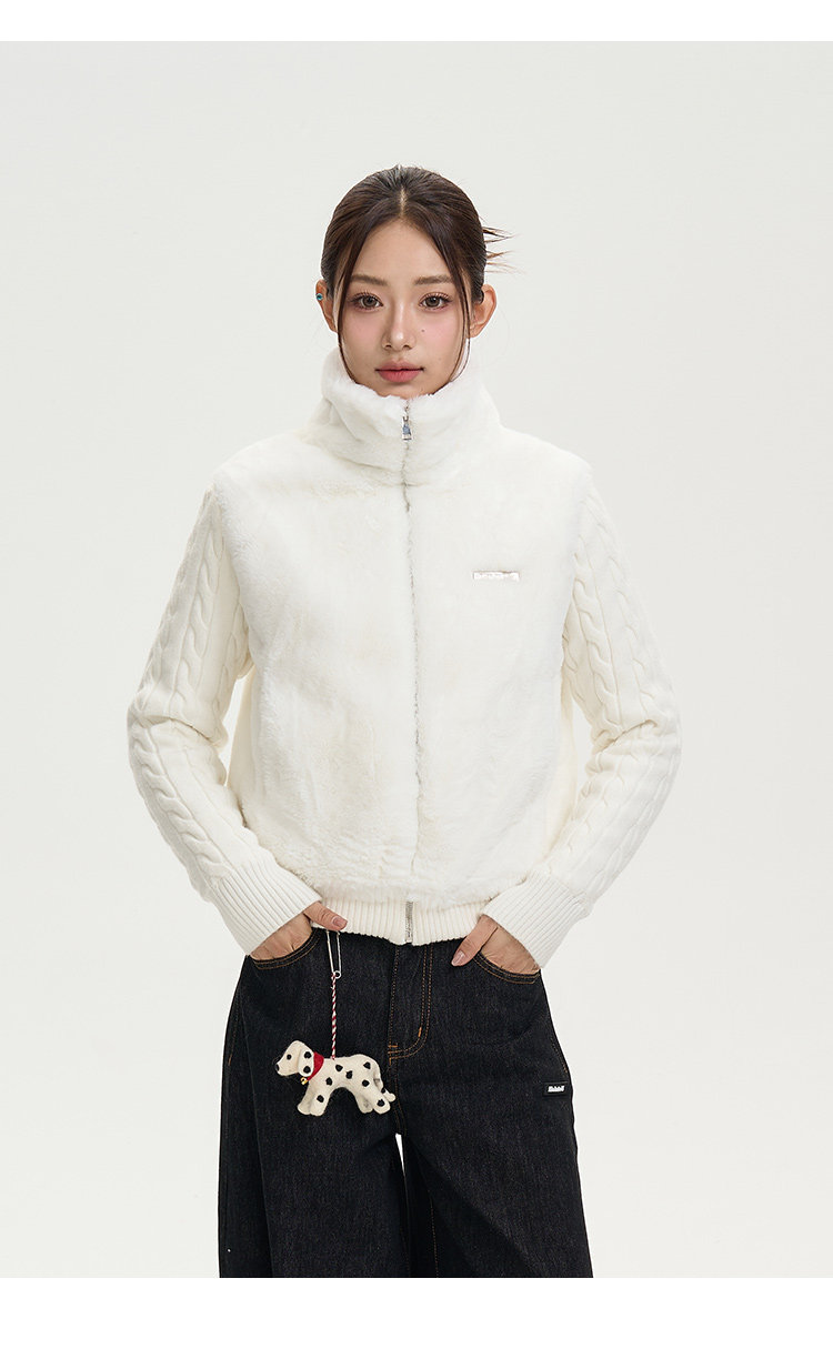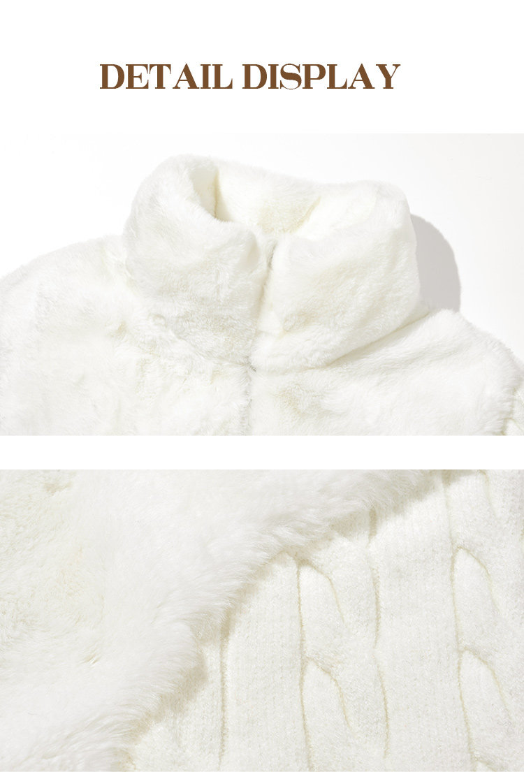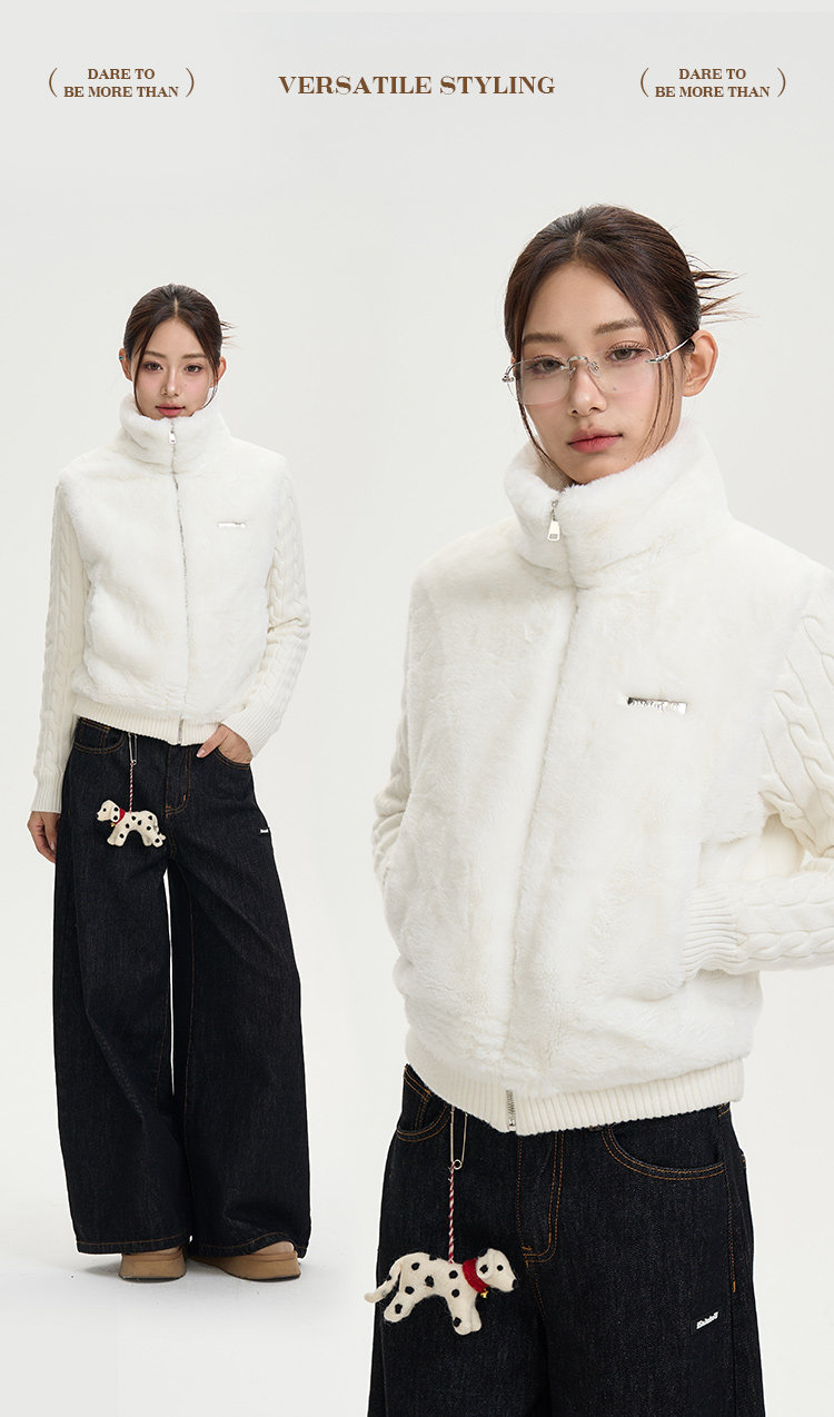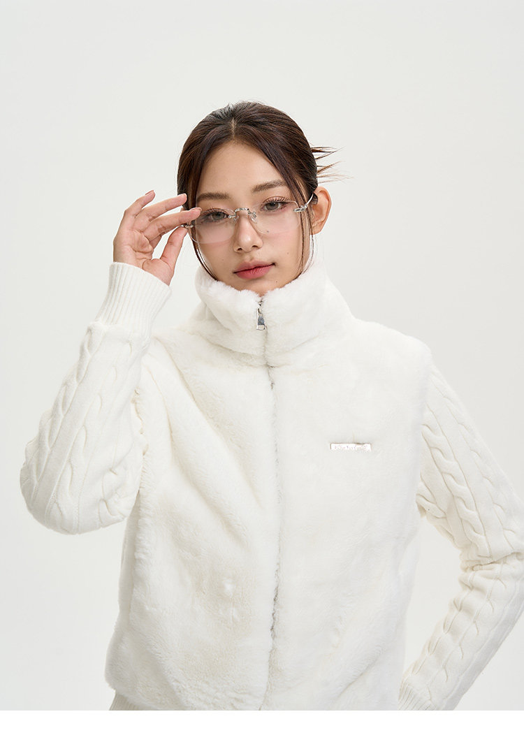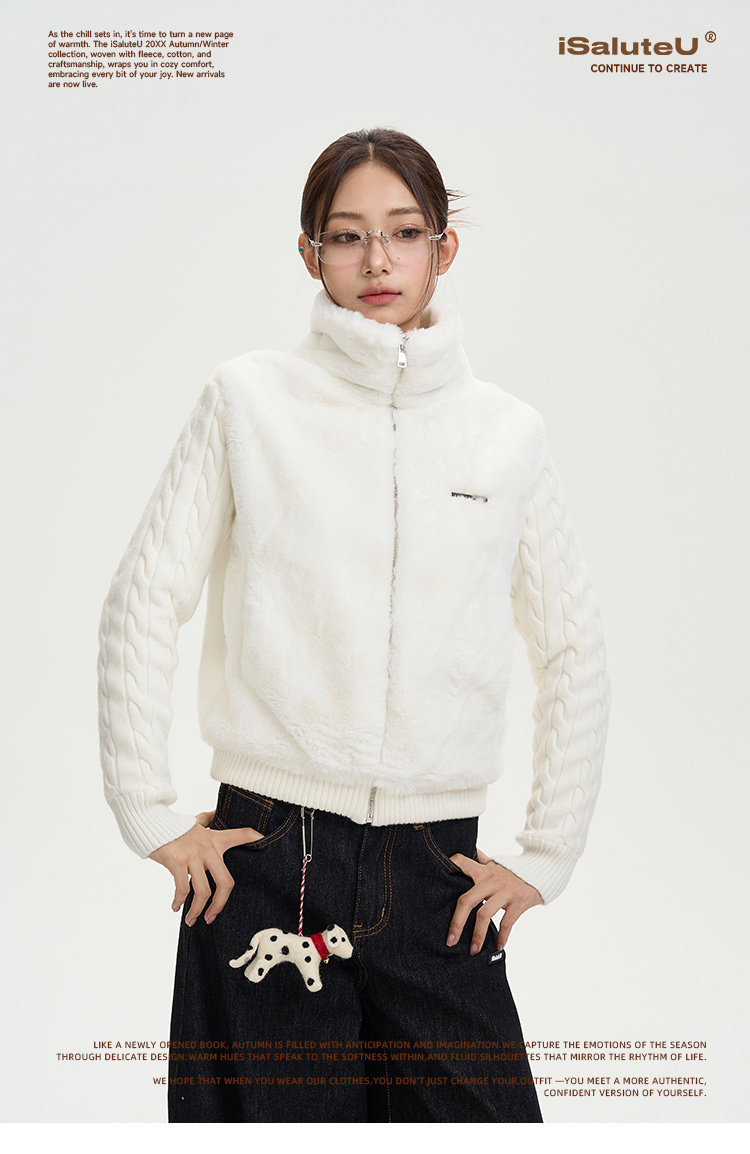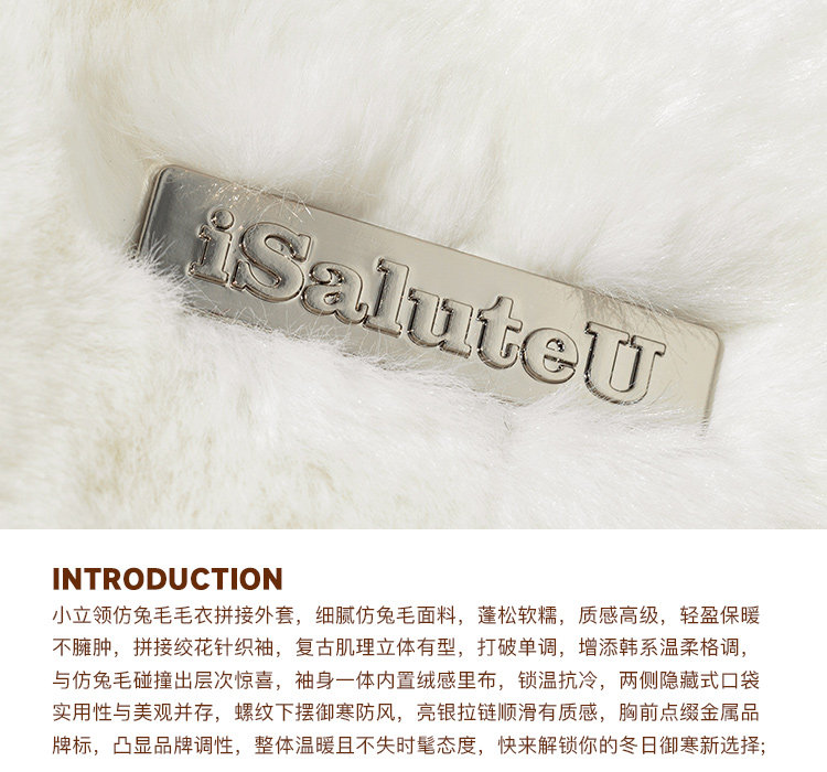 Isaluteu Faux Rabbit Fur Sweater Patchwork Jacket with Small Stand Collar, Trendy Autumn and Winter Warm Short Windproof and Heat-Retaining Cotton Coat
