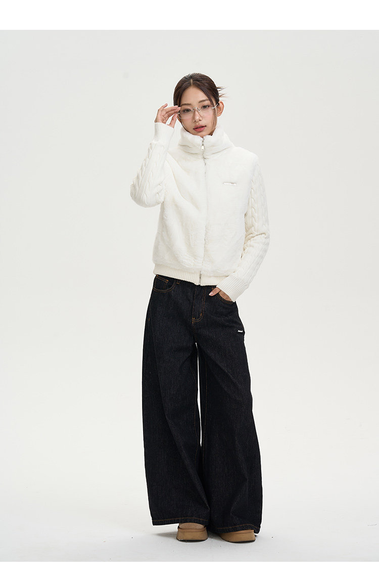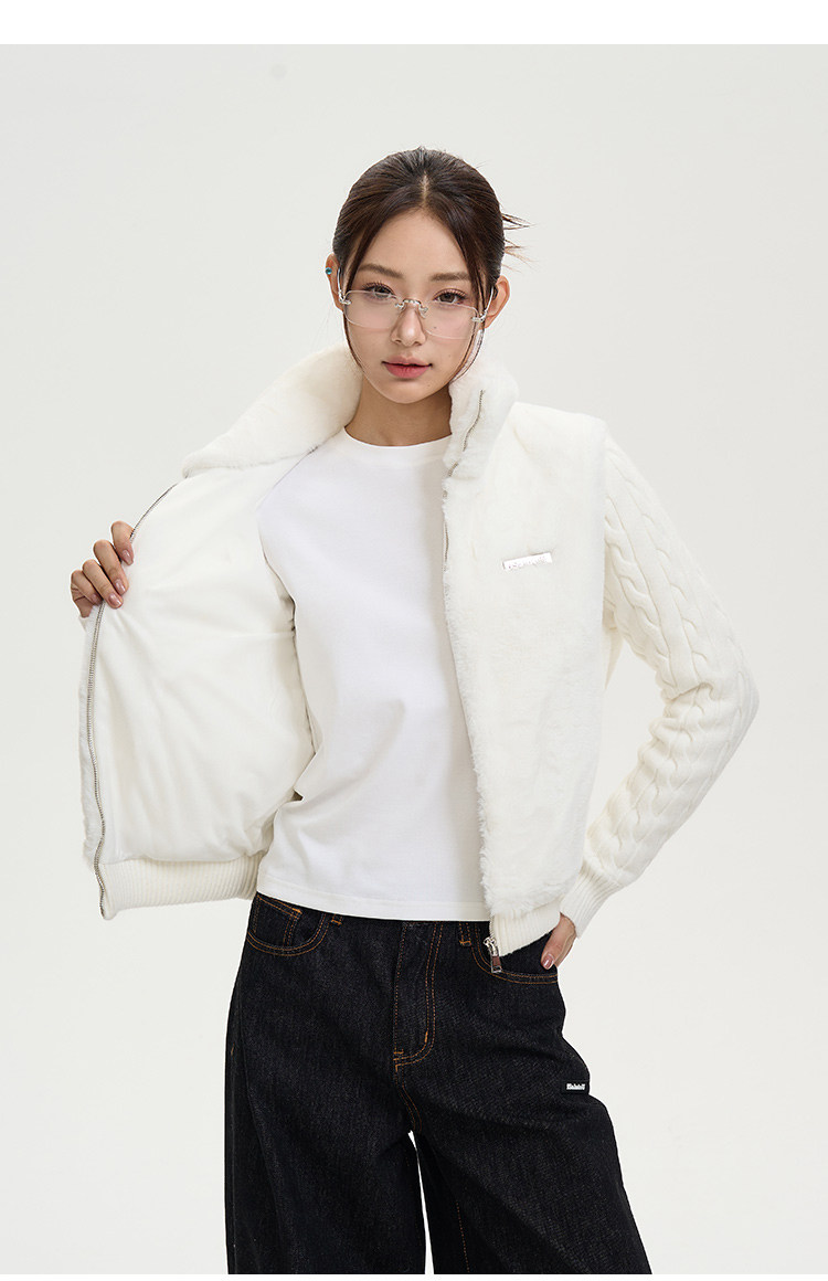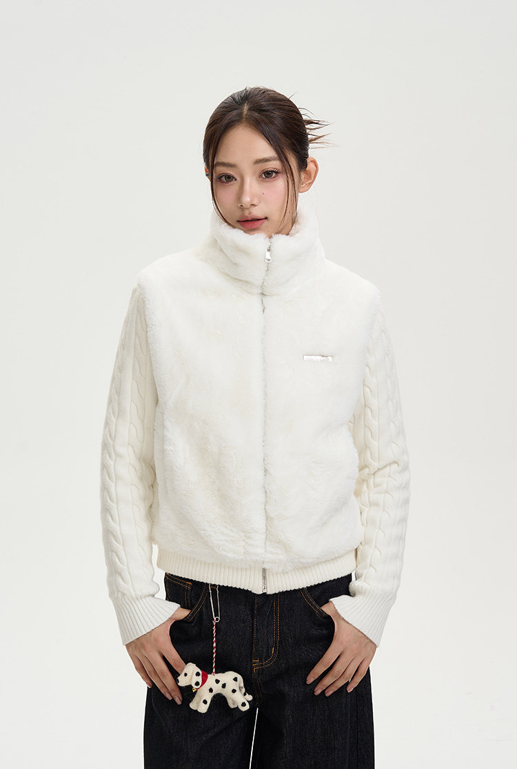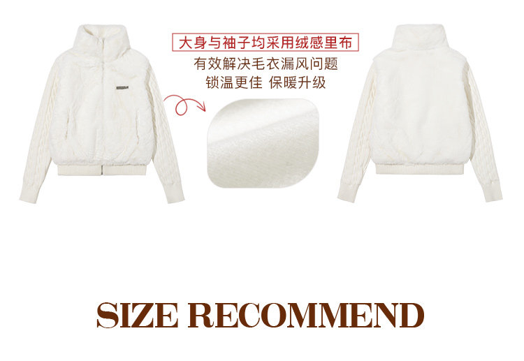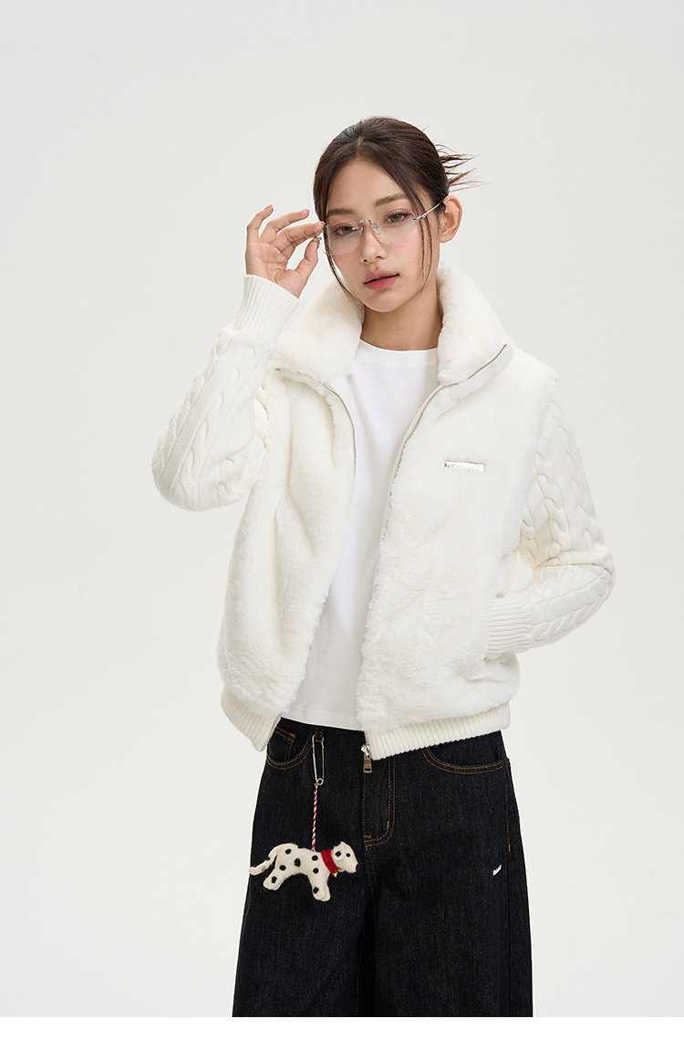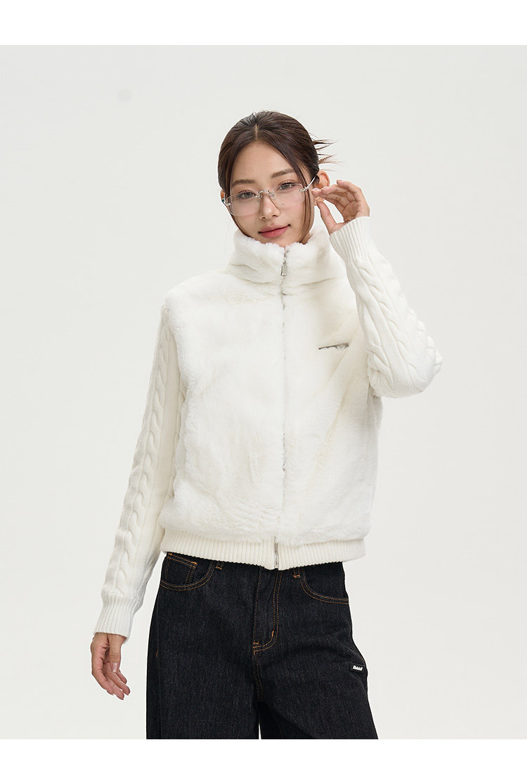 Isaluteu Faux Rabbit Fur Sweater Patchwork Jacket with Small Stand Collar, Trendy Autumn and Winter Warm Short Windproof and Heat-Retaining Cotton Coat
