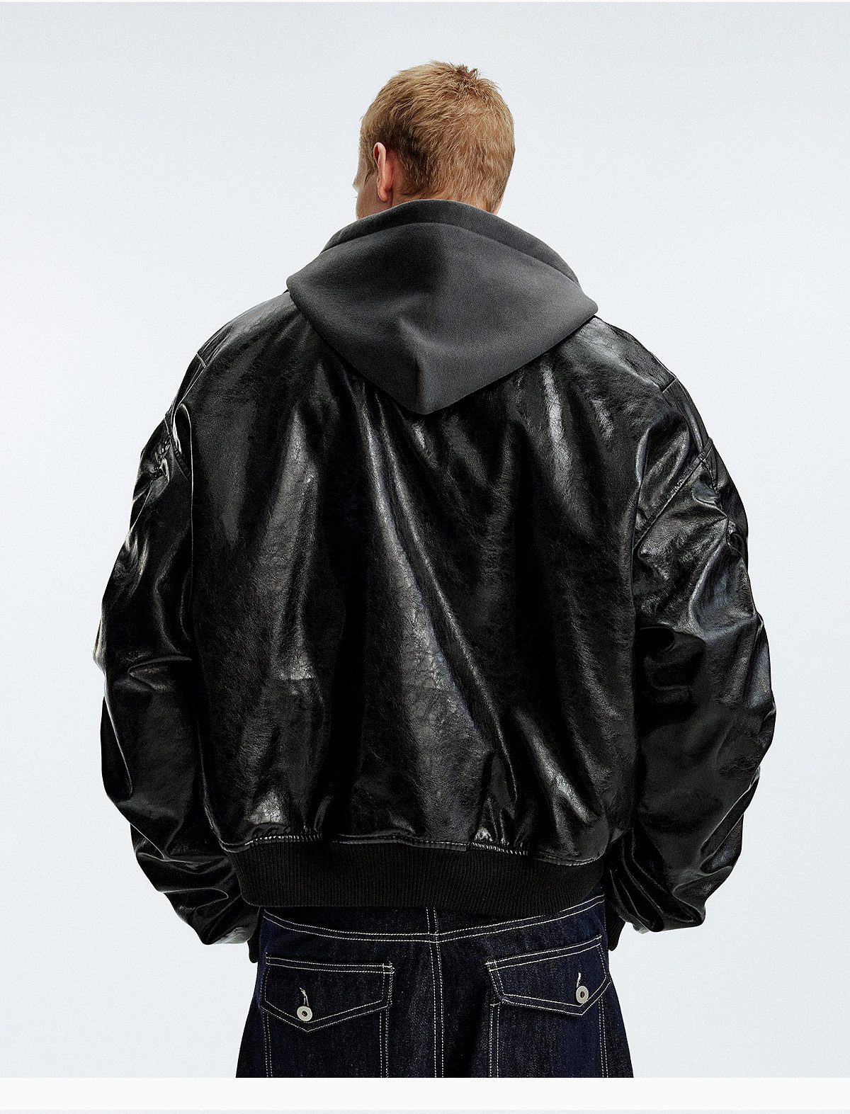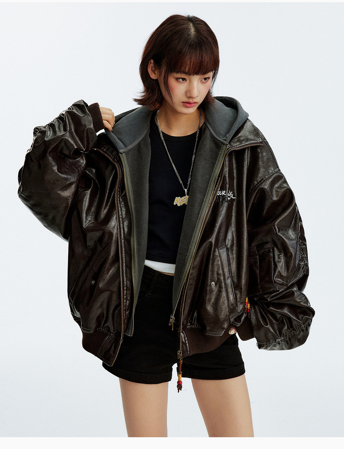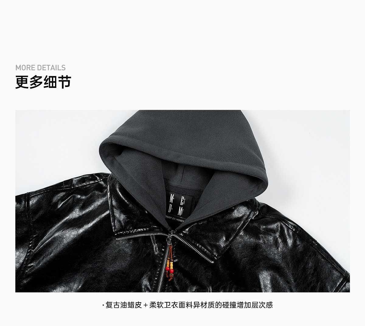 Medm Fake Two-Piece Loose Hooded Zip-Up Leather Jacket Cotton Coat American Style Unisex Warm Casual Cotton Jacket Winter