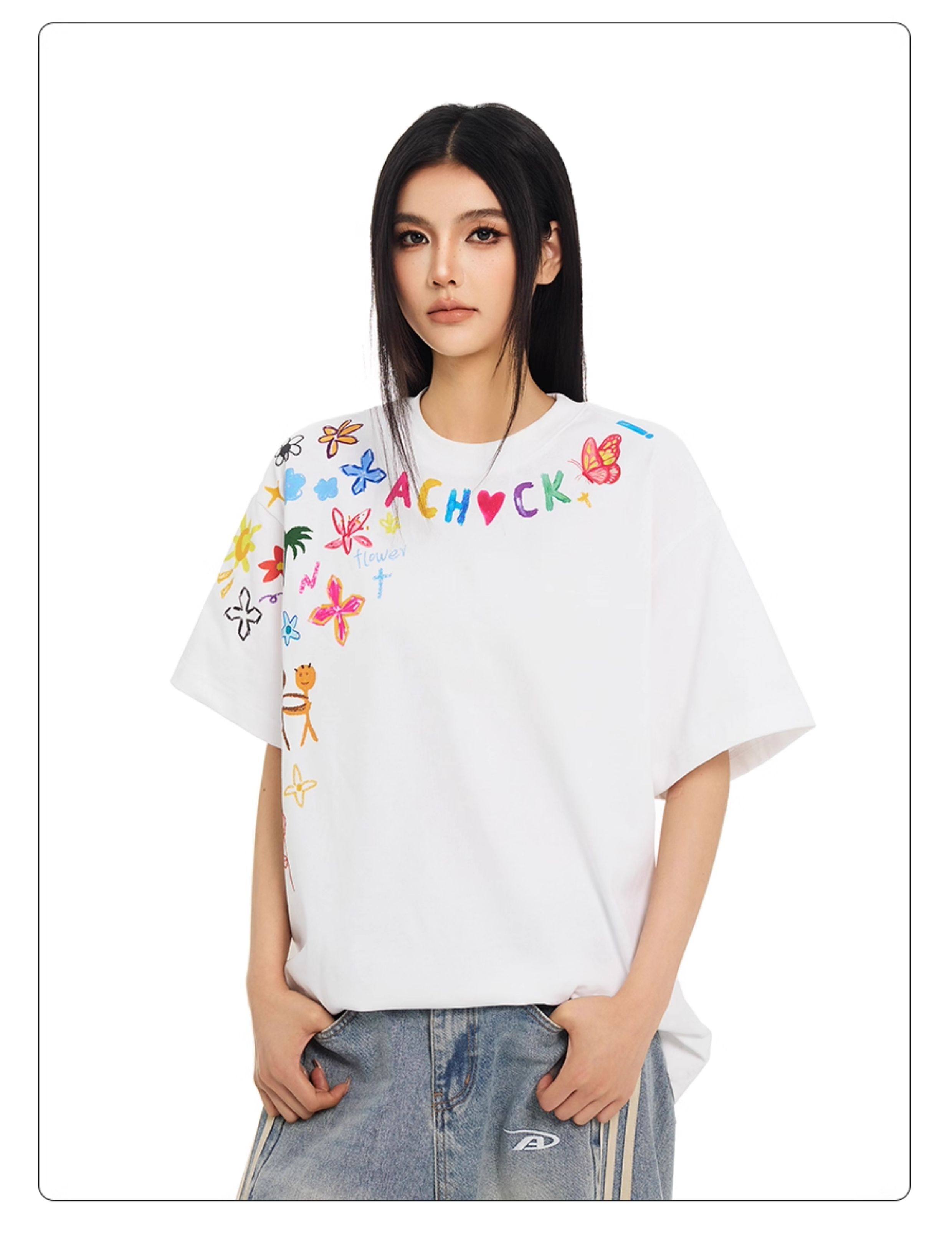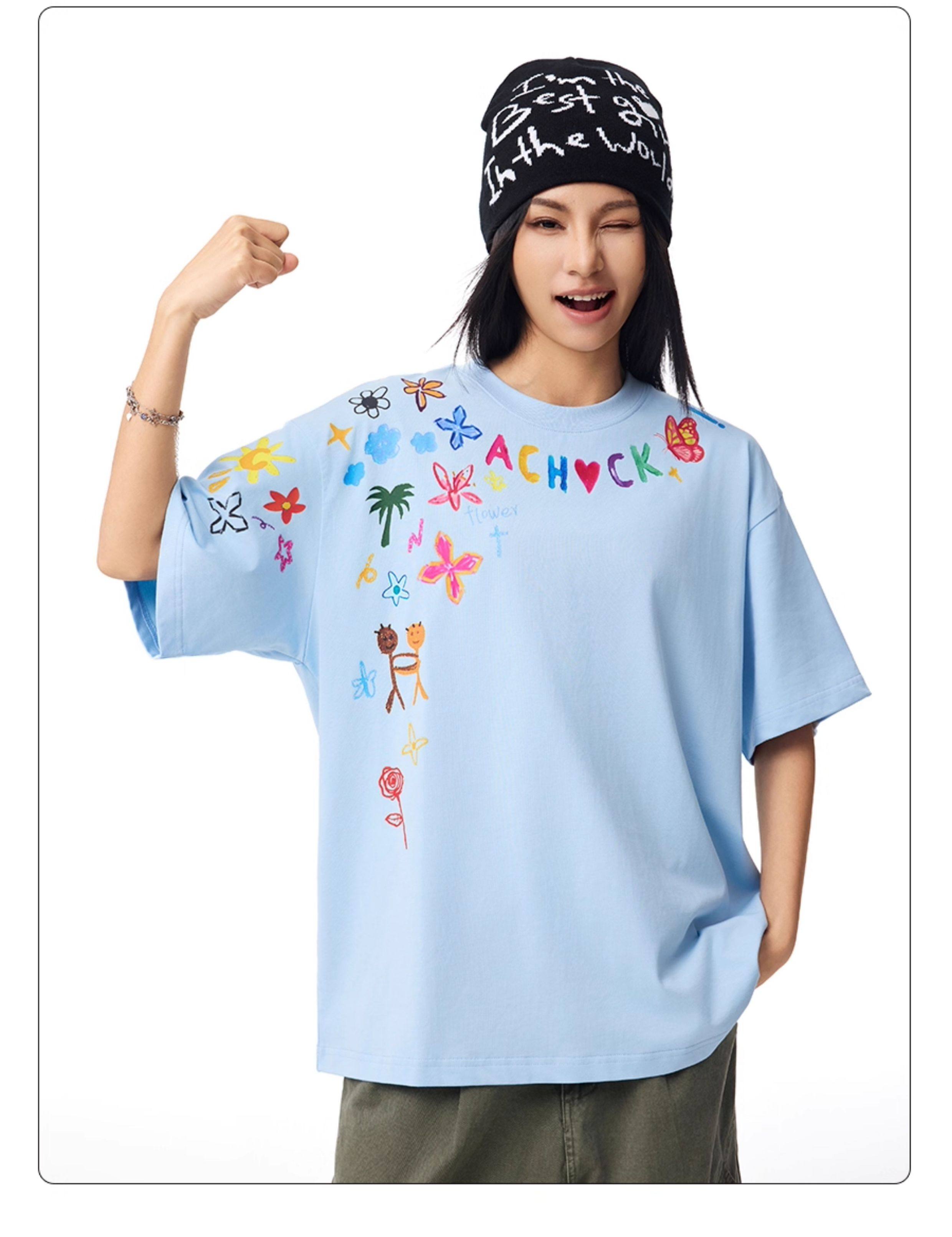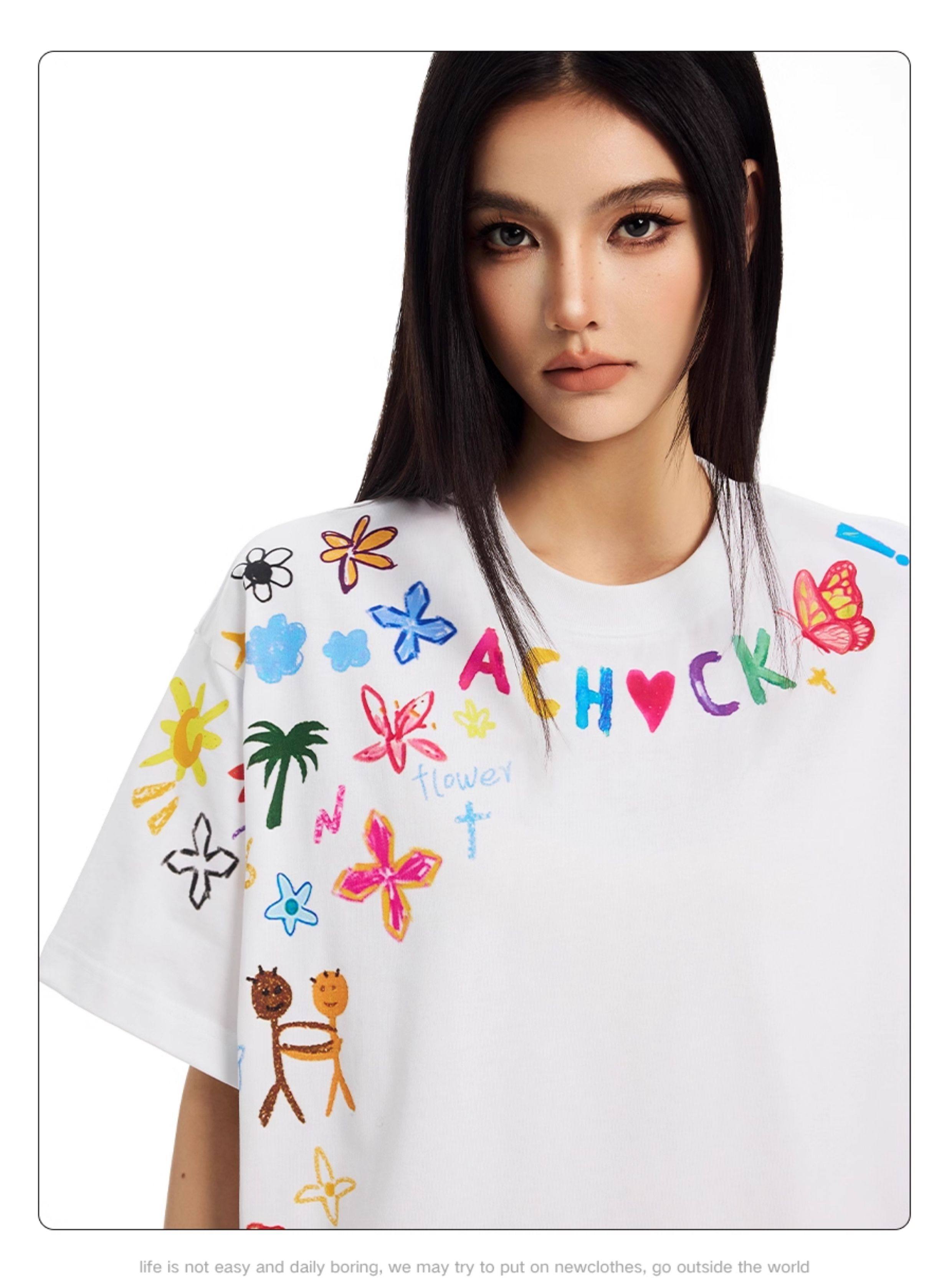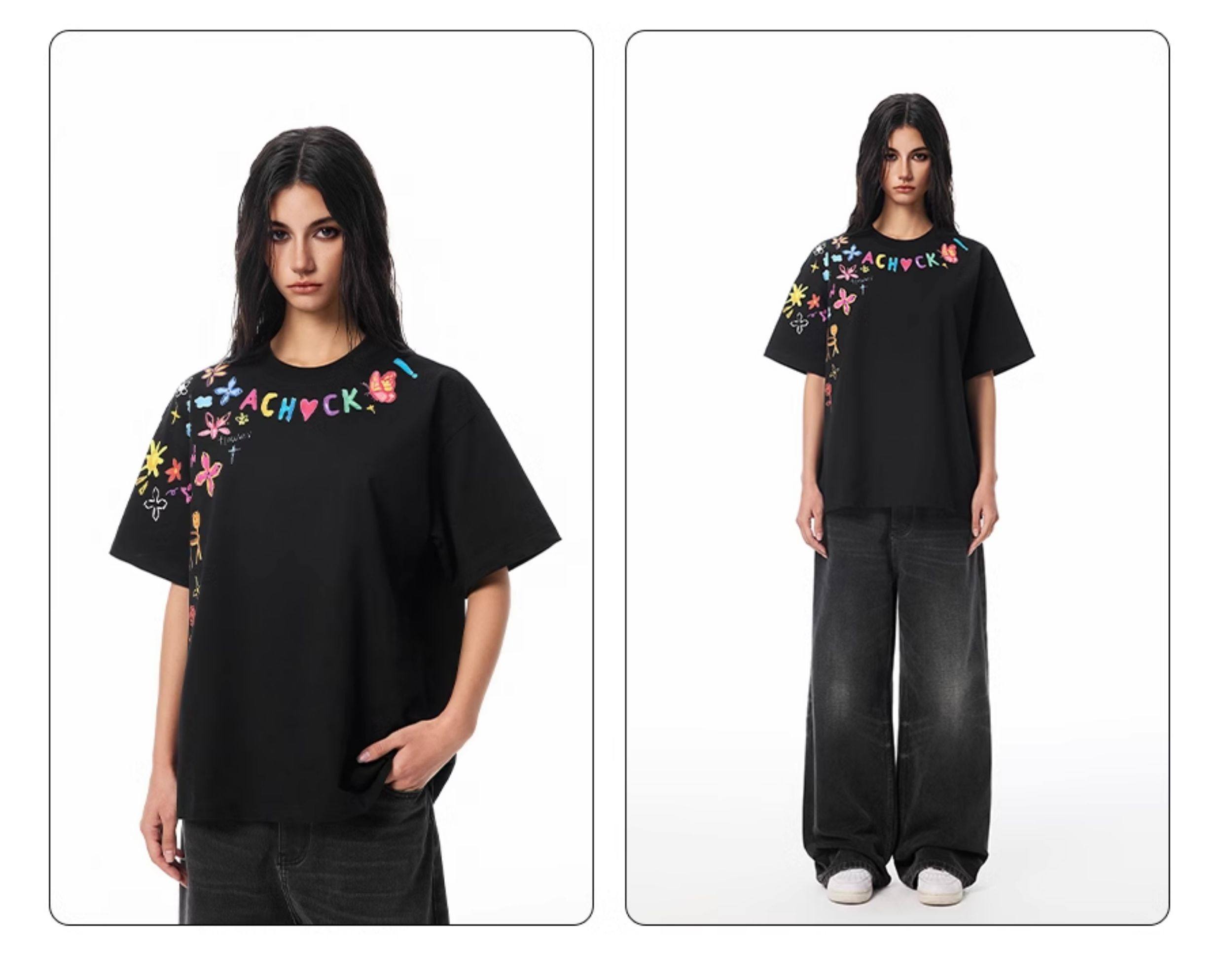 【Achock Official Store】Trendy Brand Creative Cartoon Graffiti Print Half-Sleeve T-Shirt High Street Couple Round Neck Short Sleeve