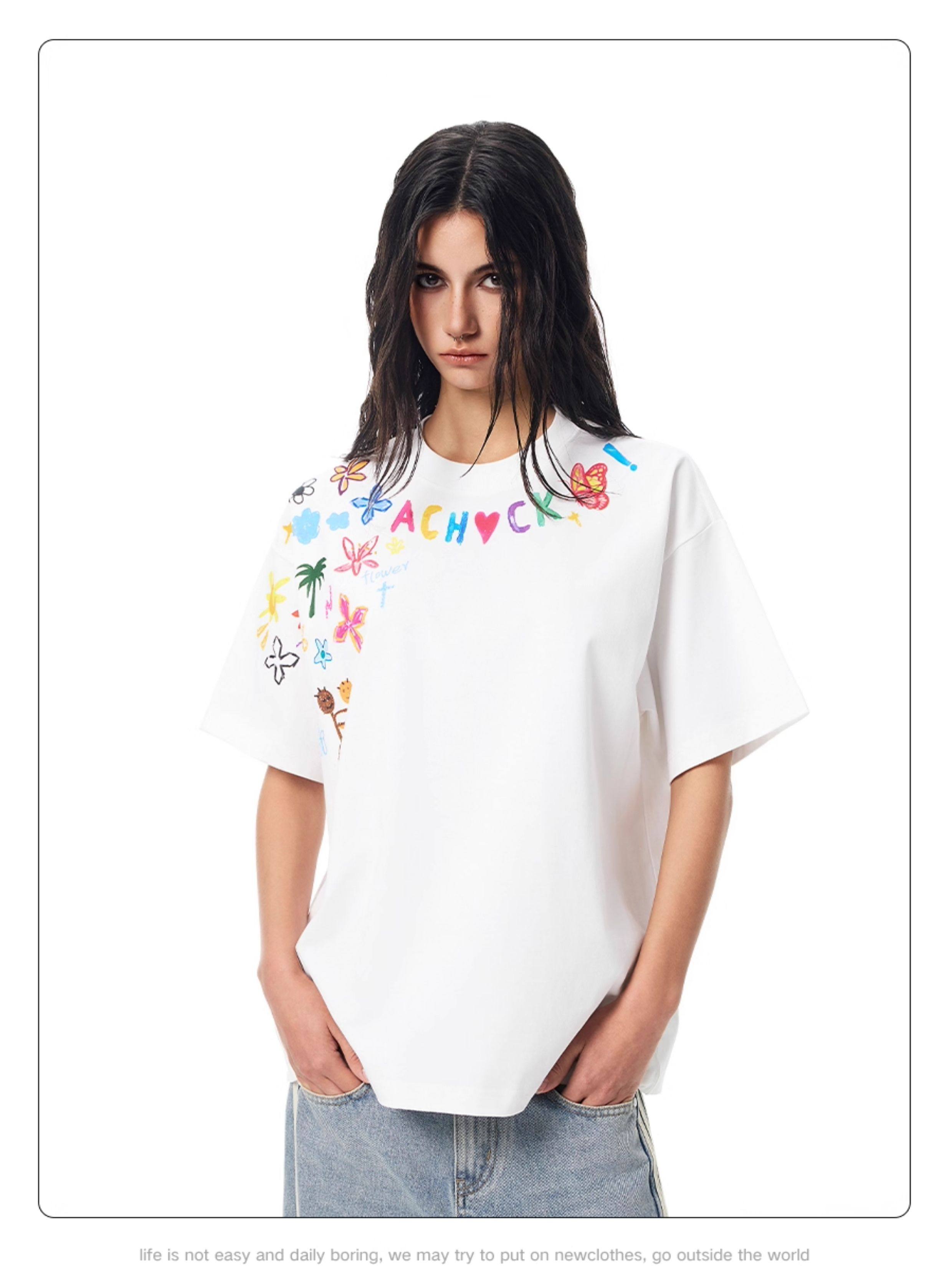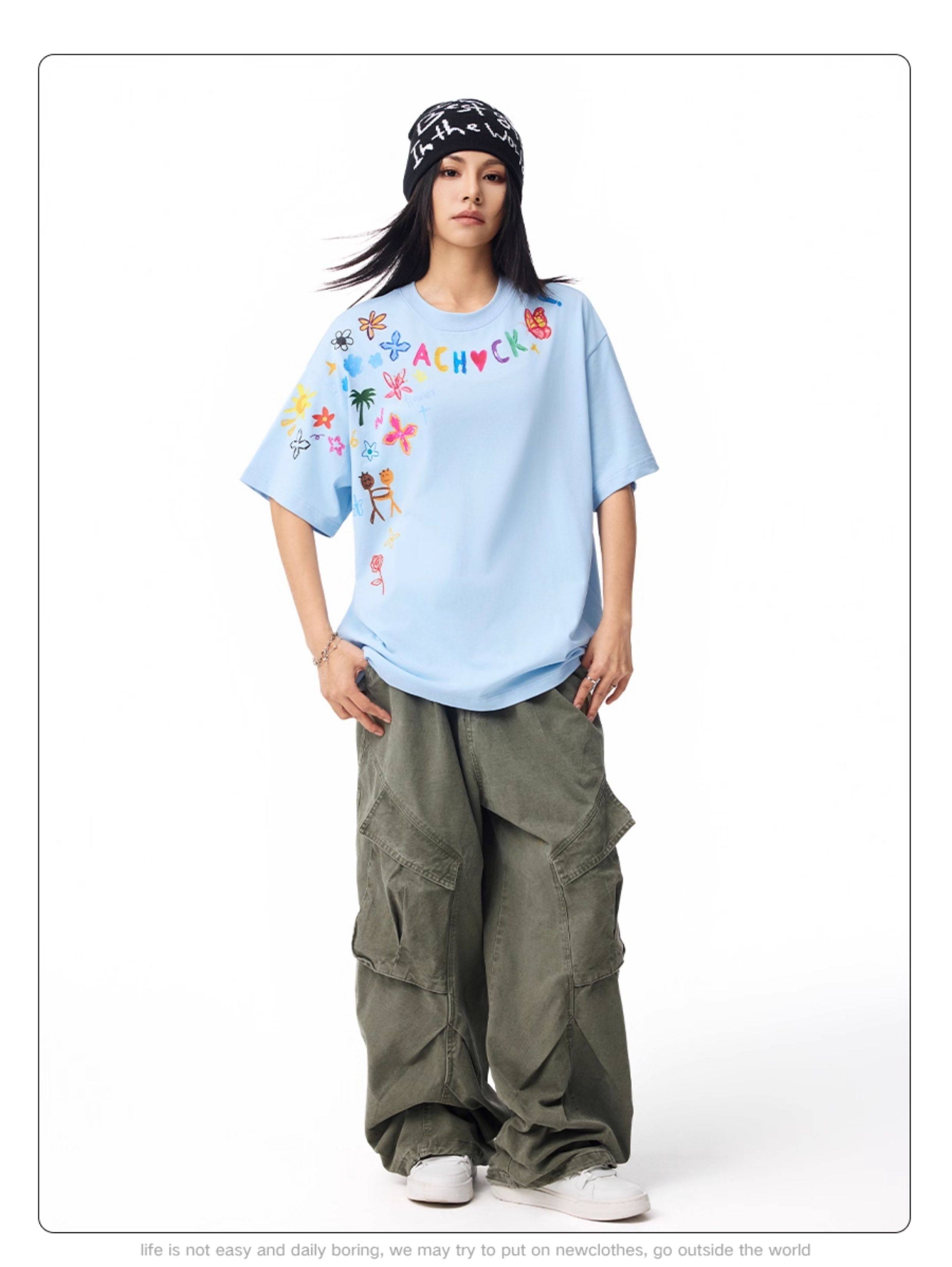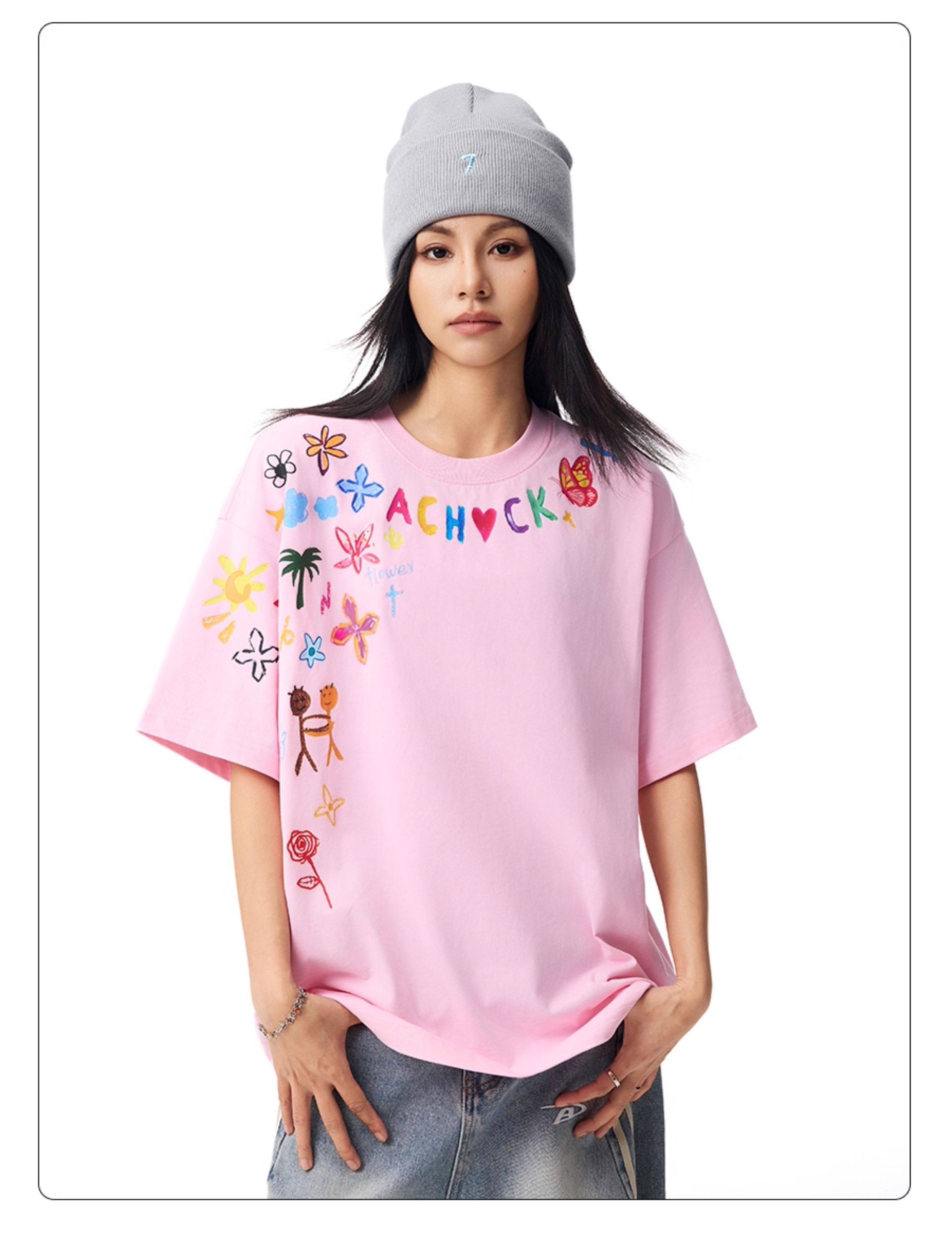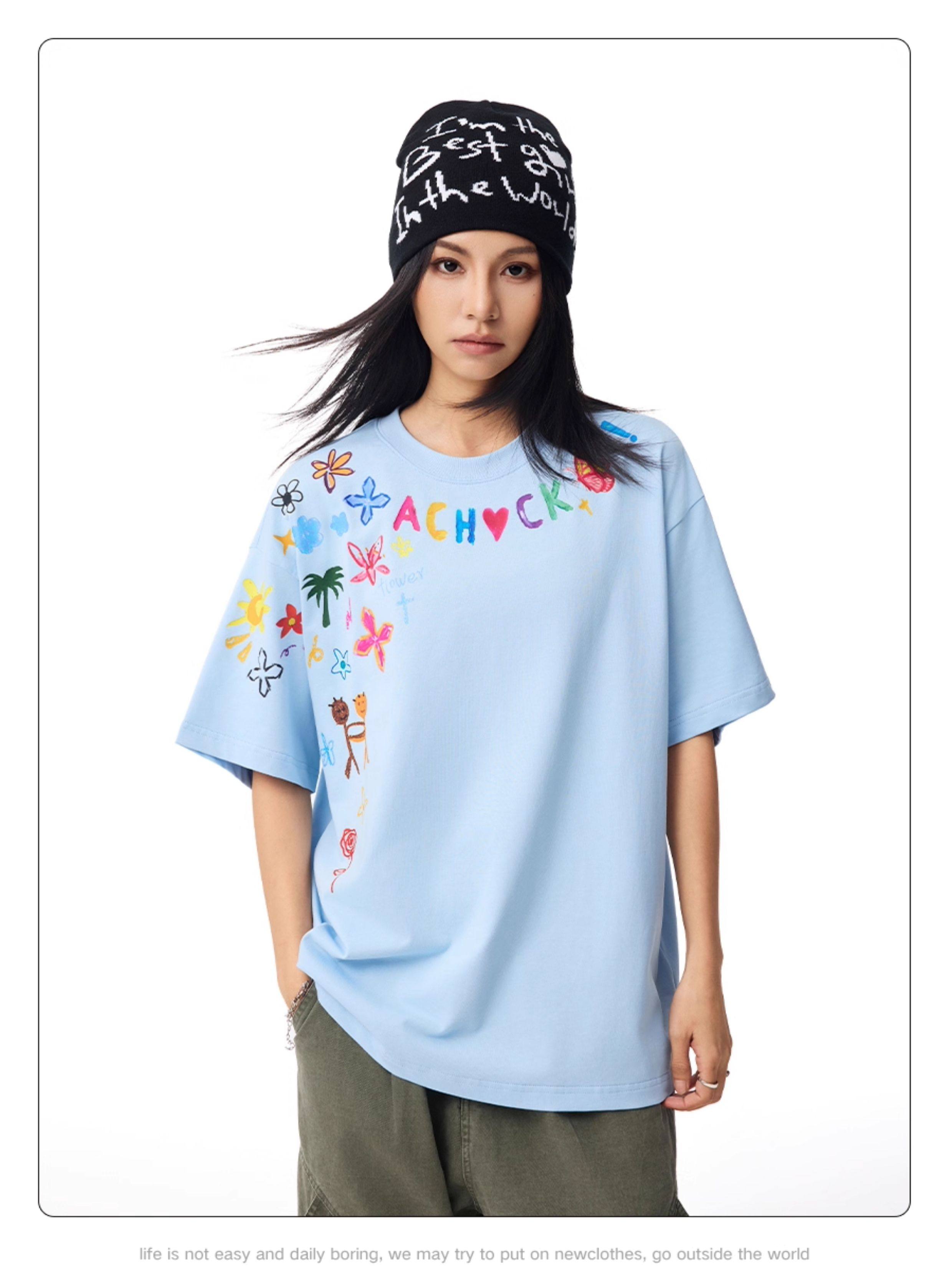 【Achock Official Store】Trendy Brand Creative Cartoon Graffiti Print Half-Sleeve T-Shirt High Street Couple Round Neck Short Sleeve