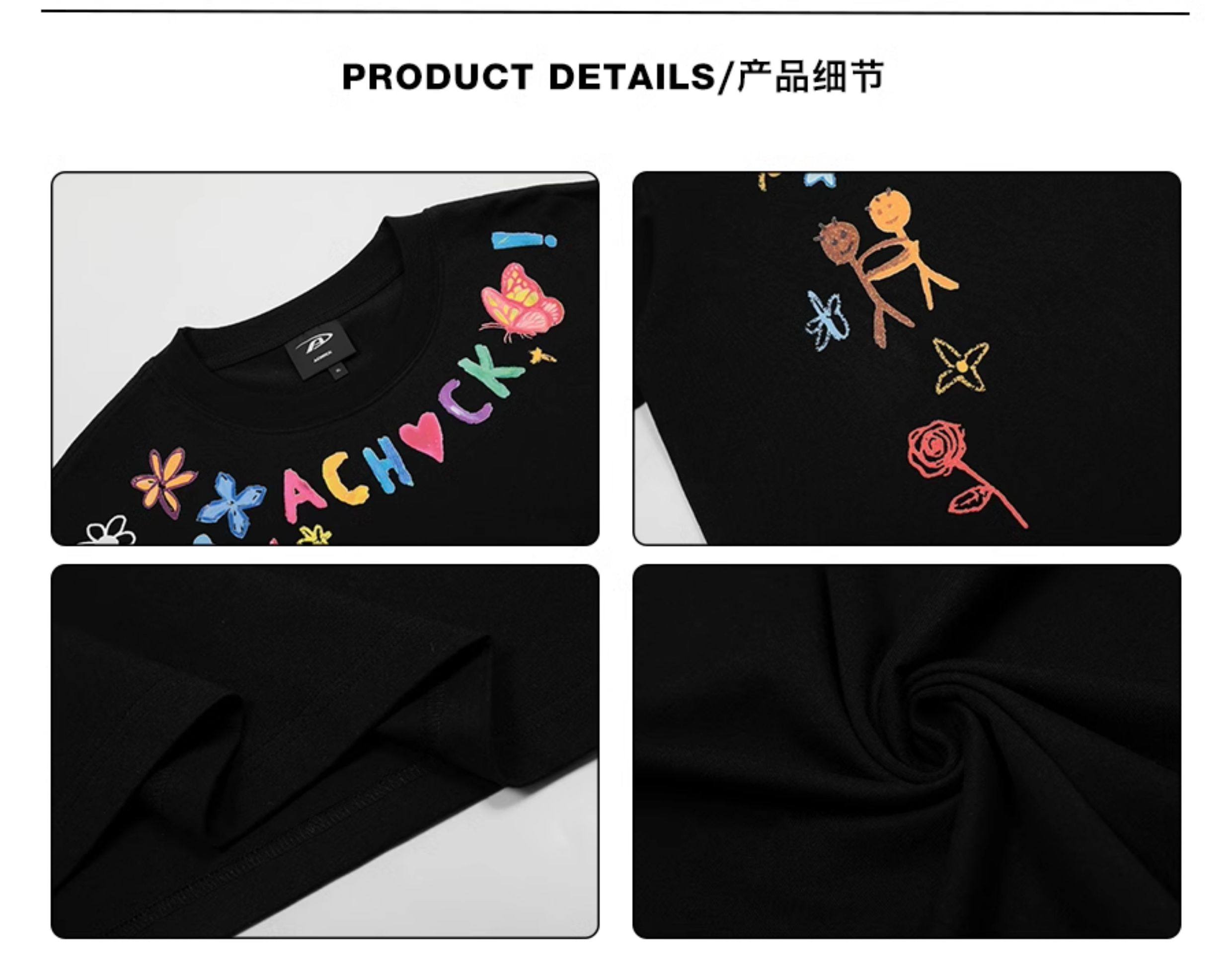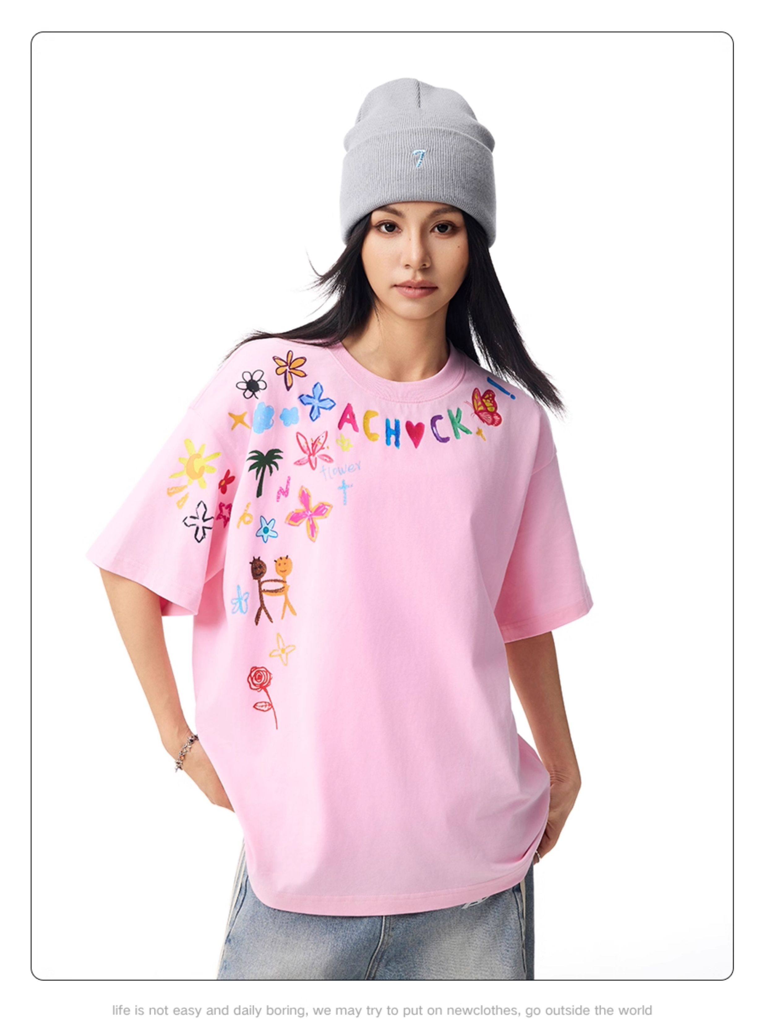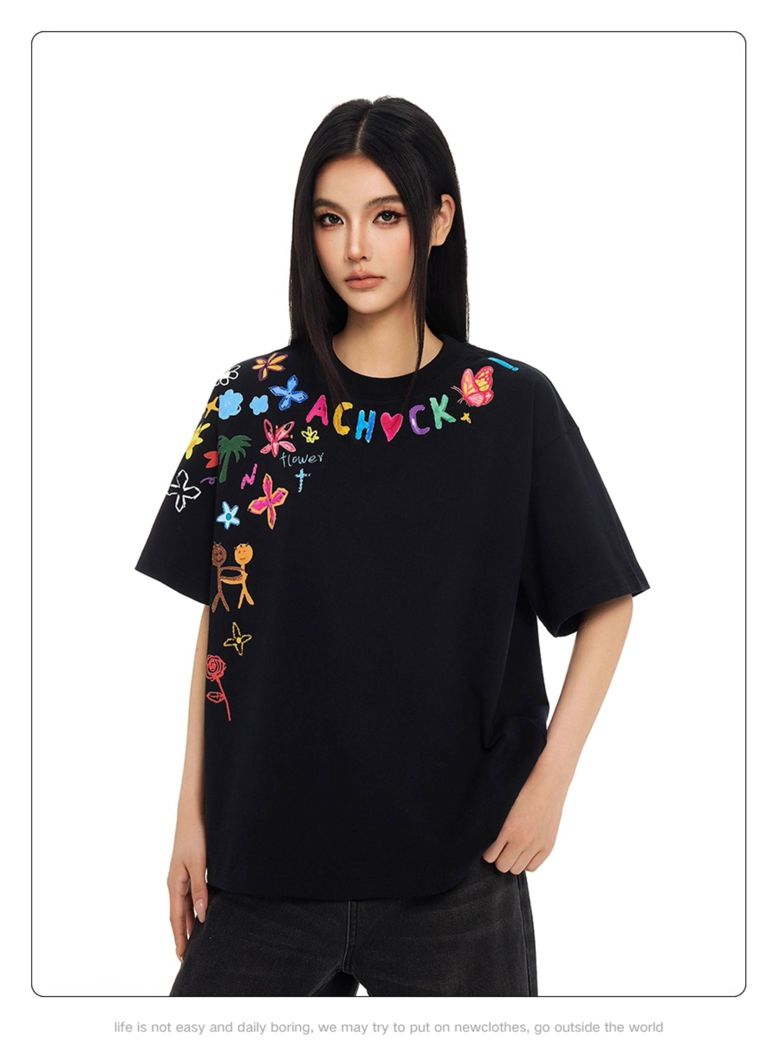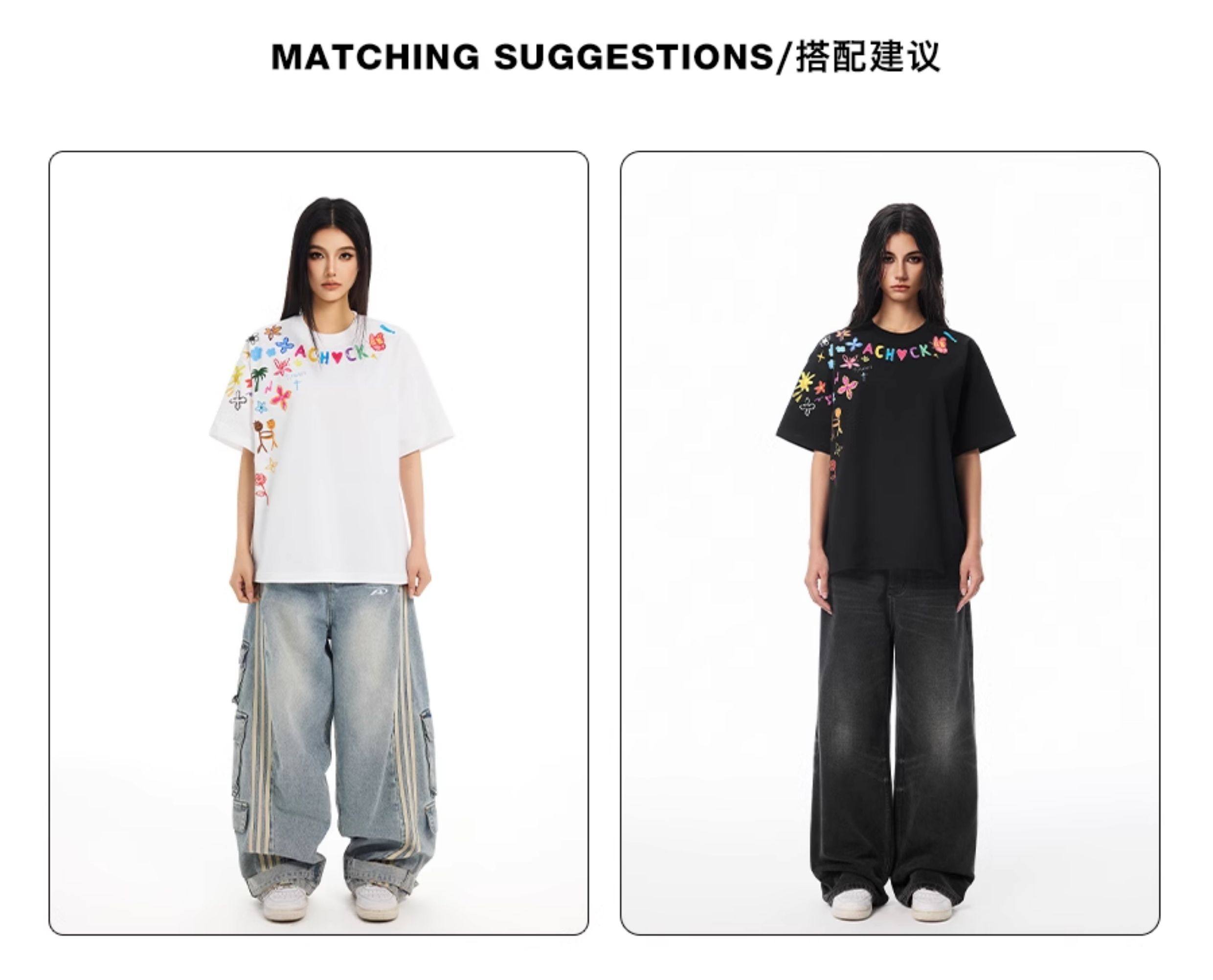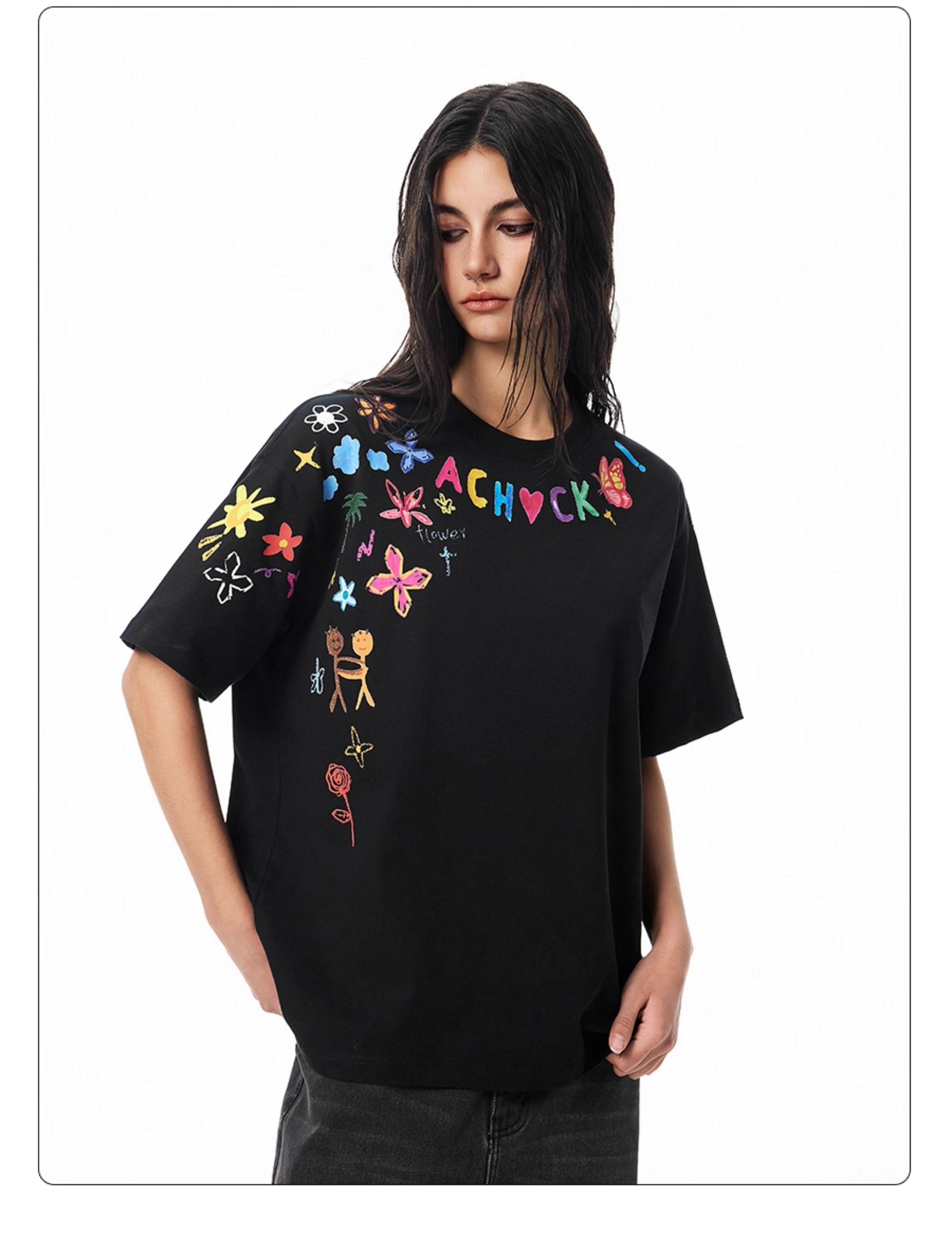 【Achock Official Store】Trendy Brand Creative Cartoon Graffiti Print Half-Sleeve T-Shirt High Street Couple Round Neck Short Sleeve
