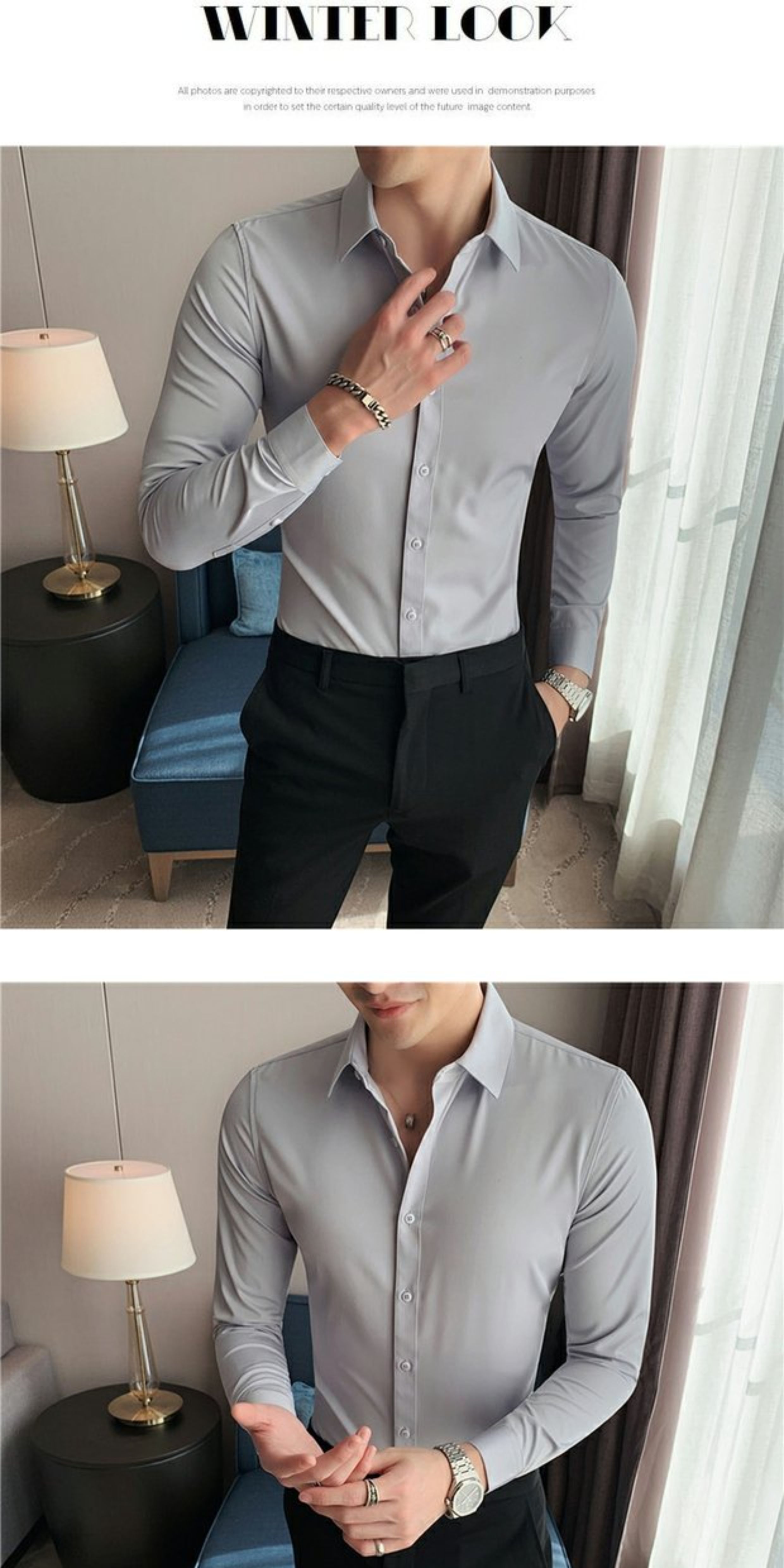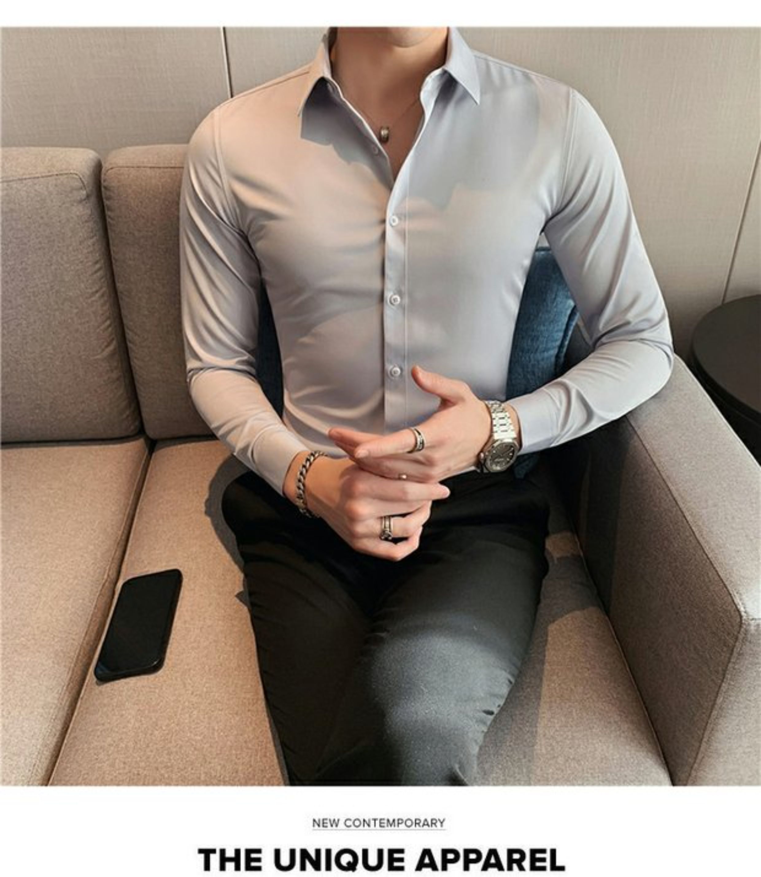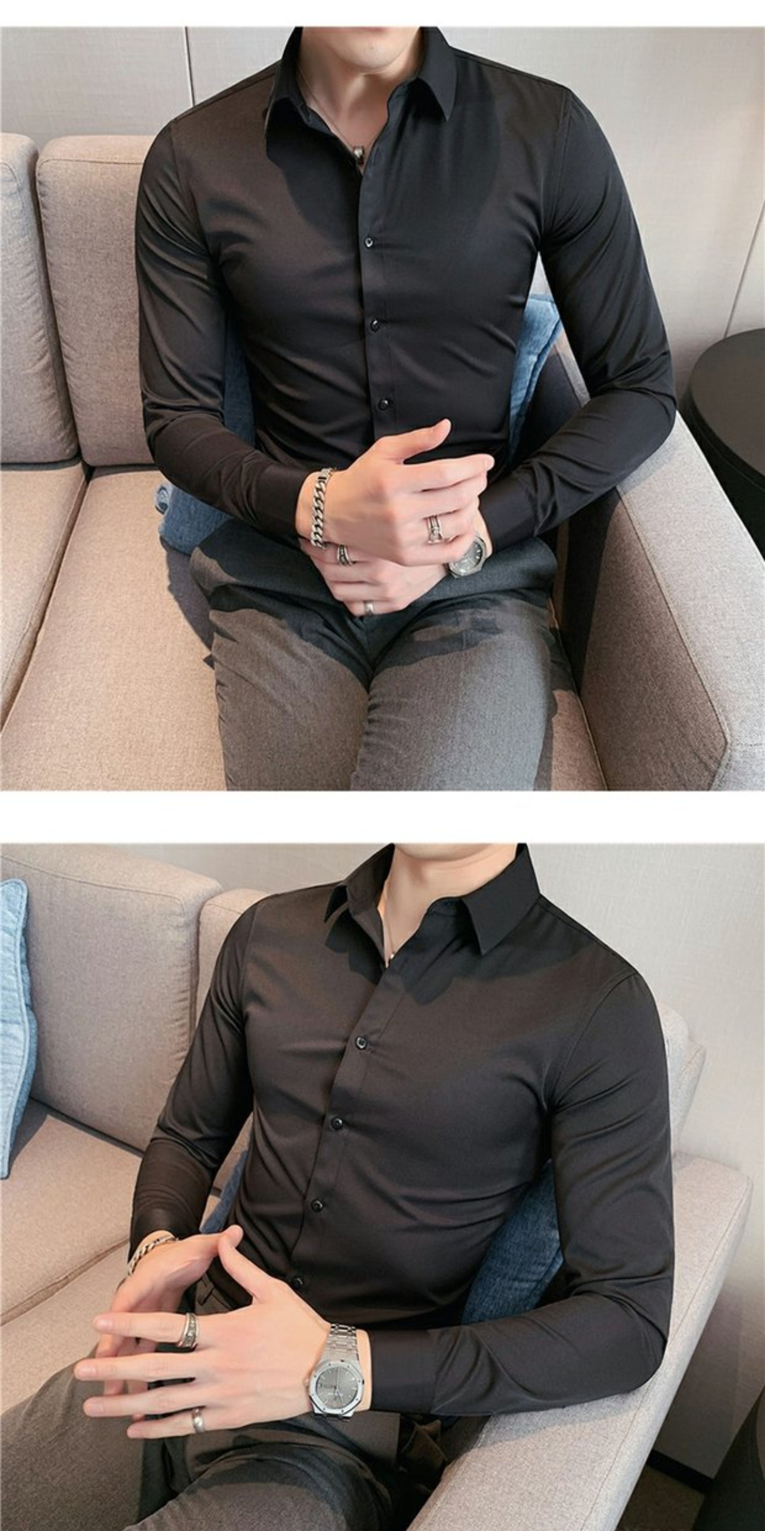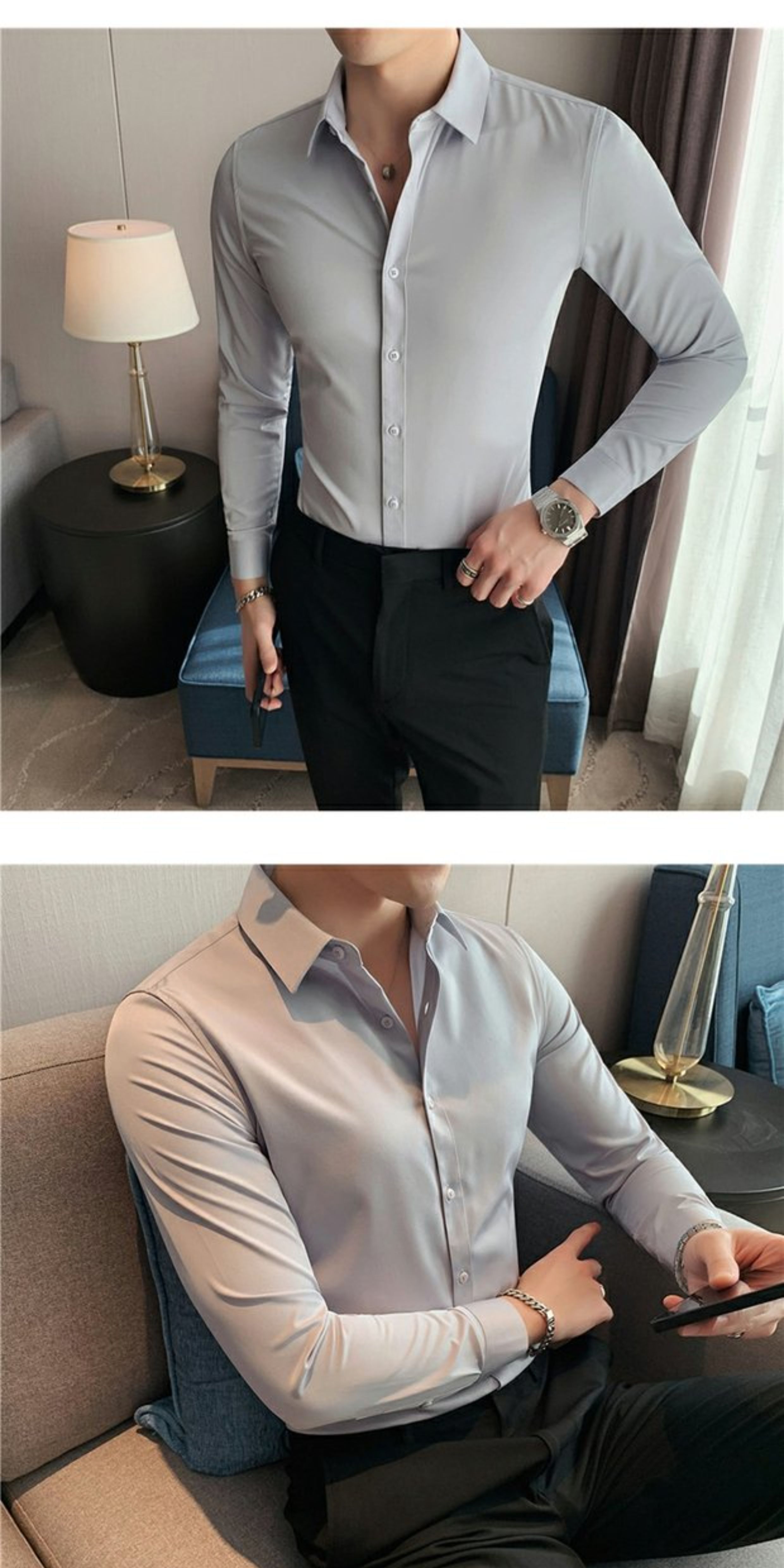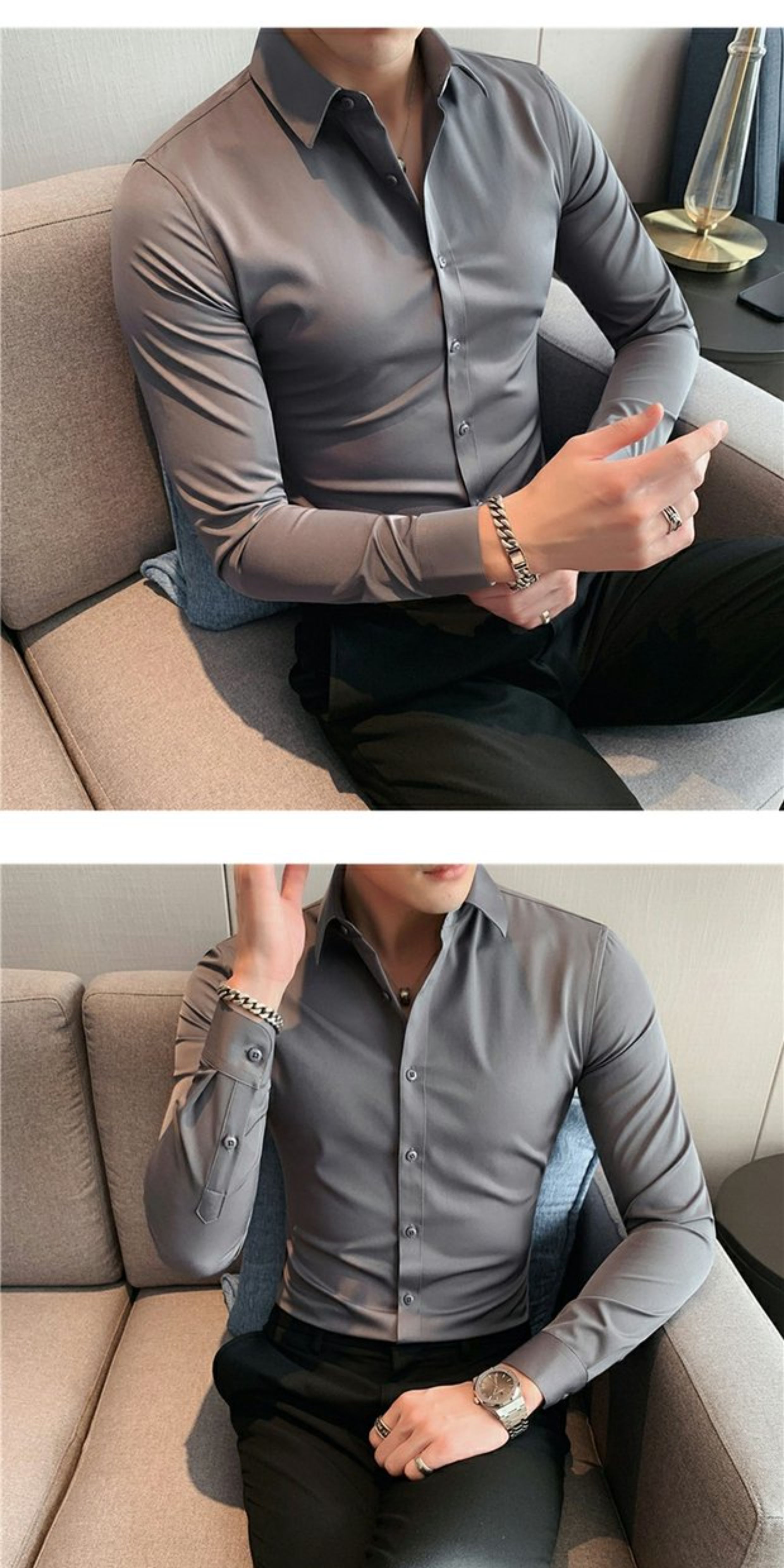 High-End, Cool Gray Long-Sleeved Suit Shirt for Men, Stretchy Inner Layer, Slim-Fit Business Style, Fleece-Lined Black Base Shirt