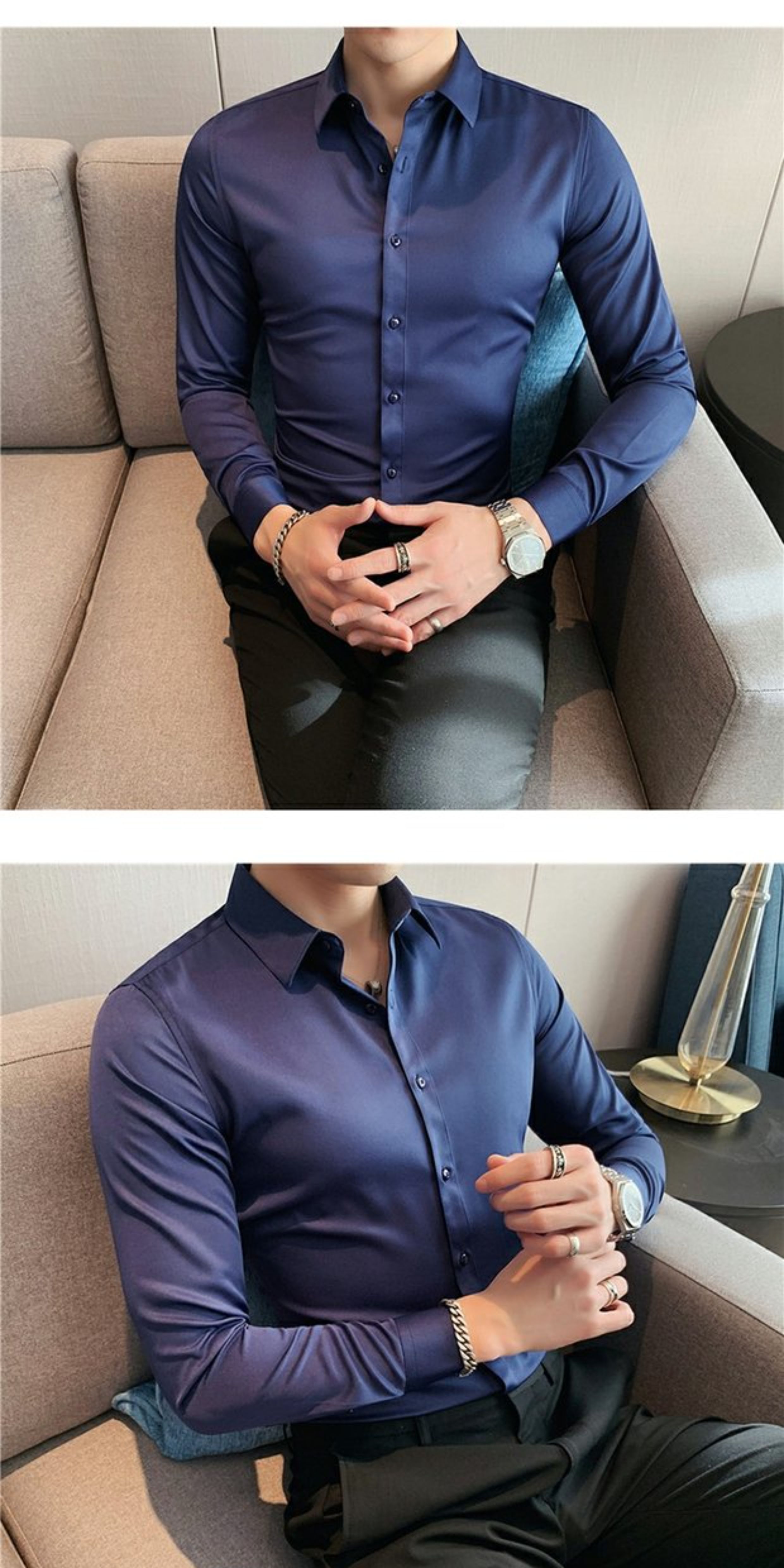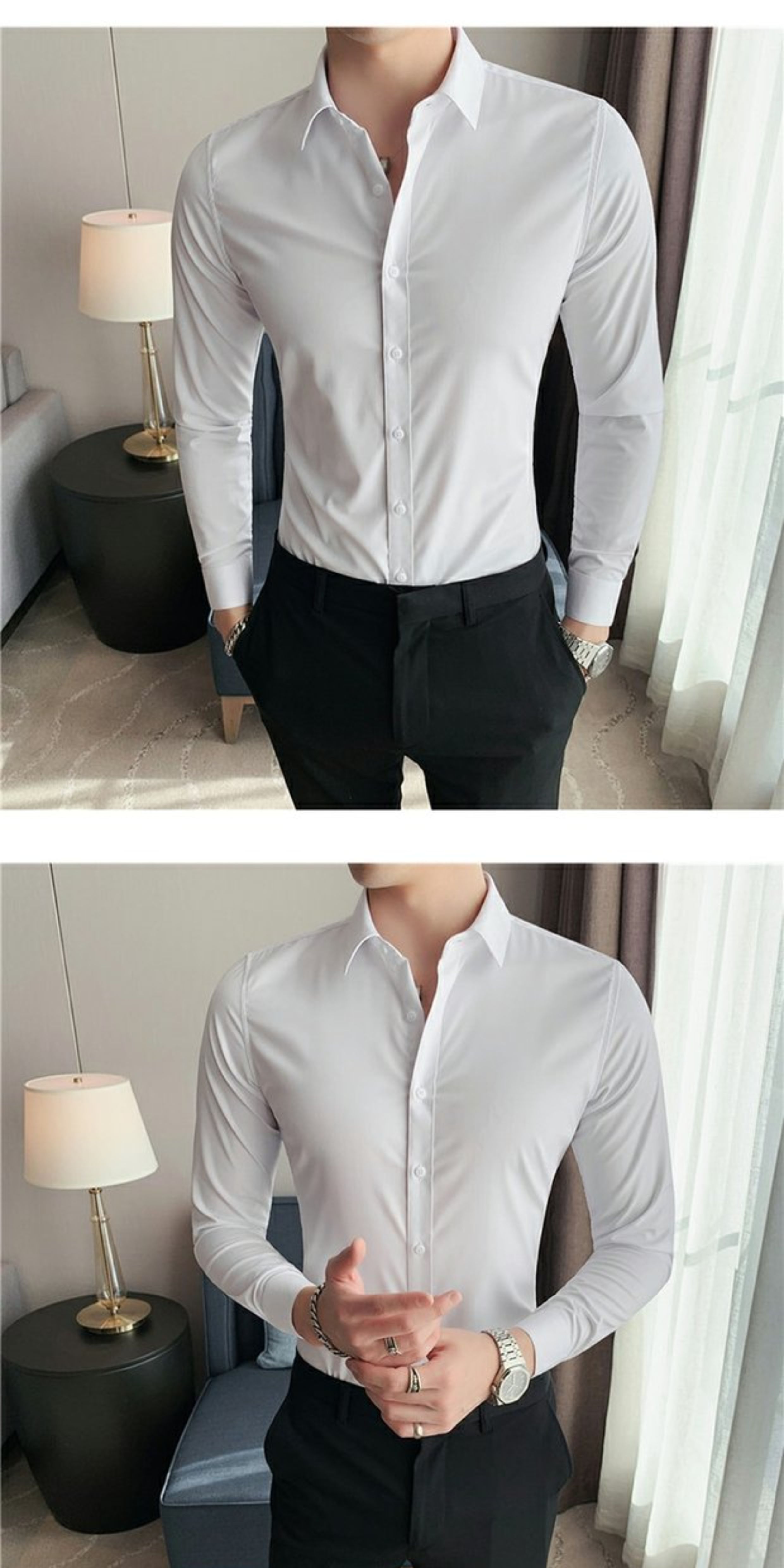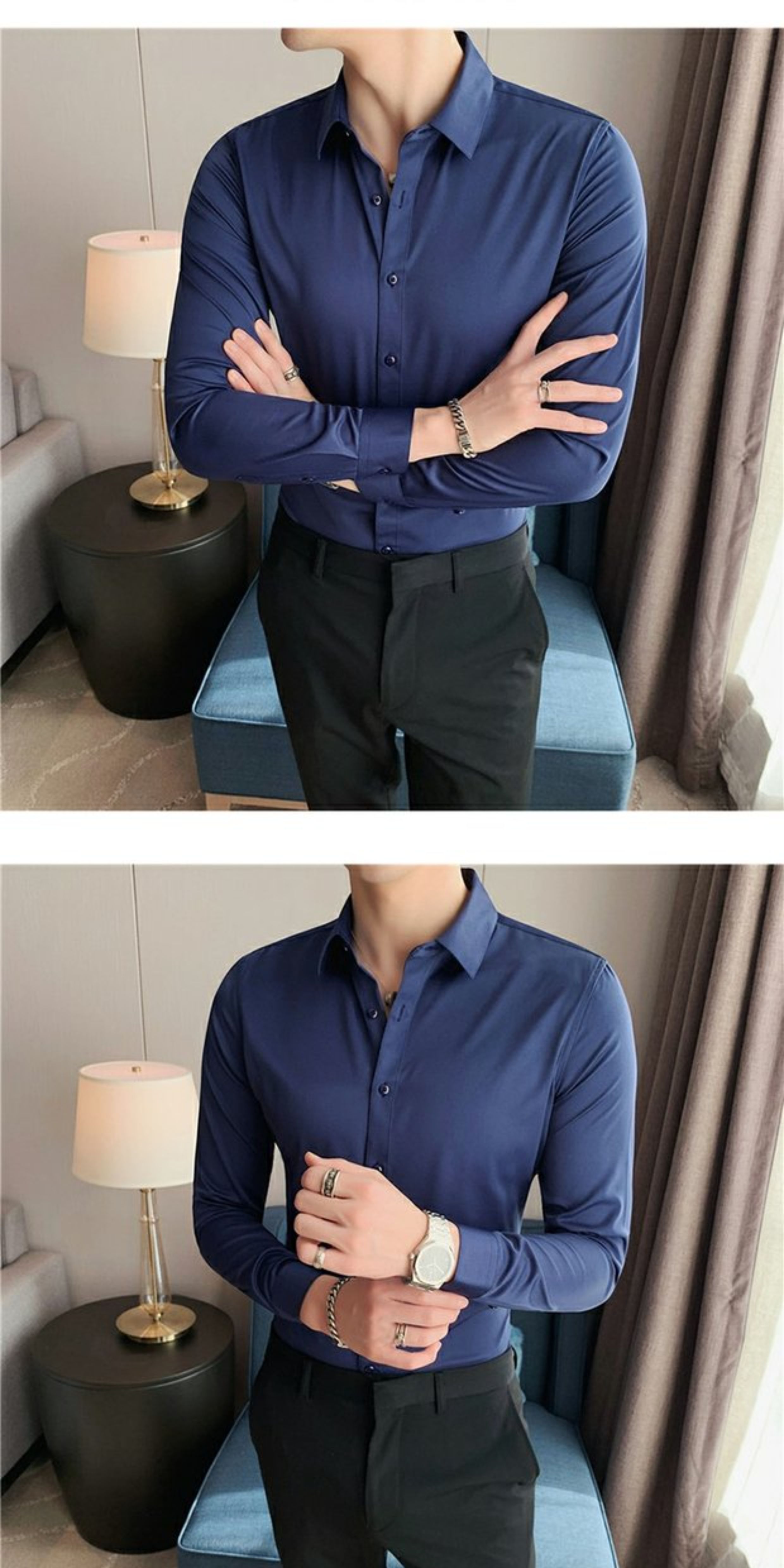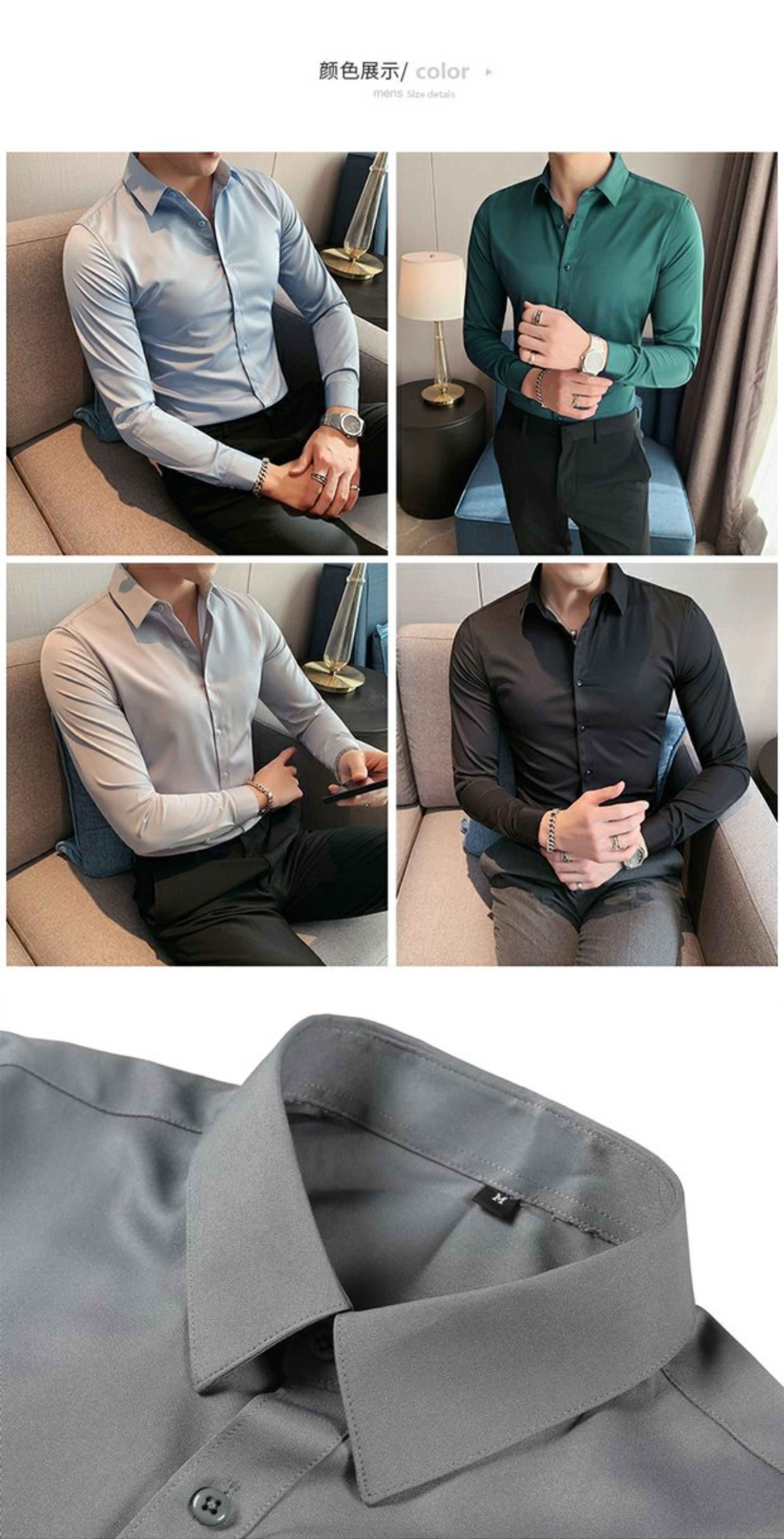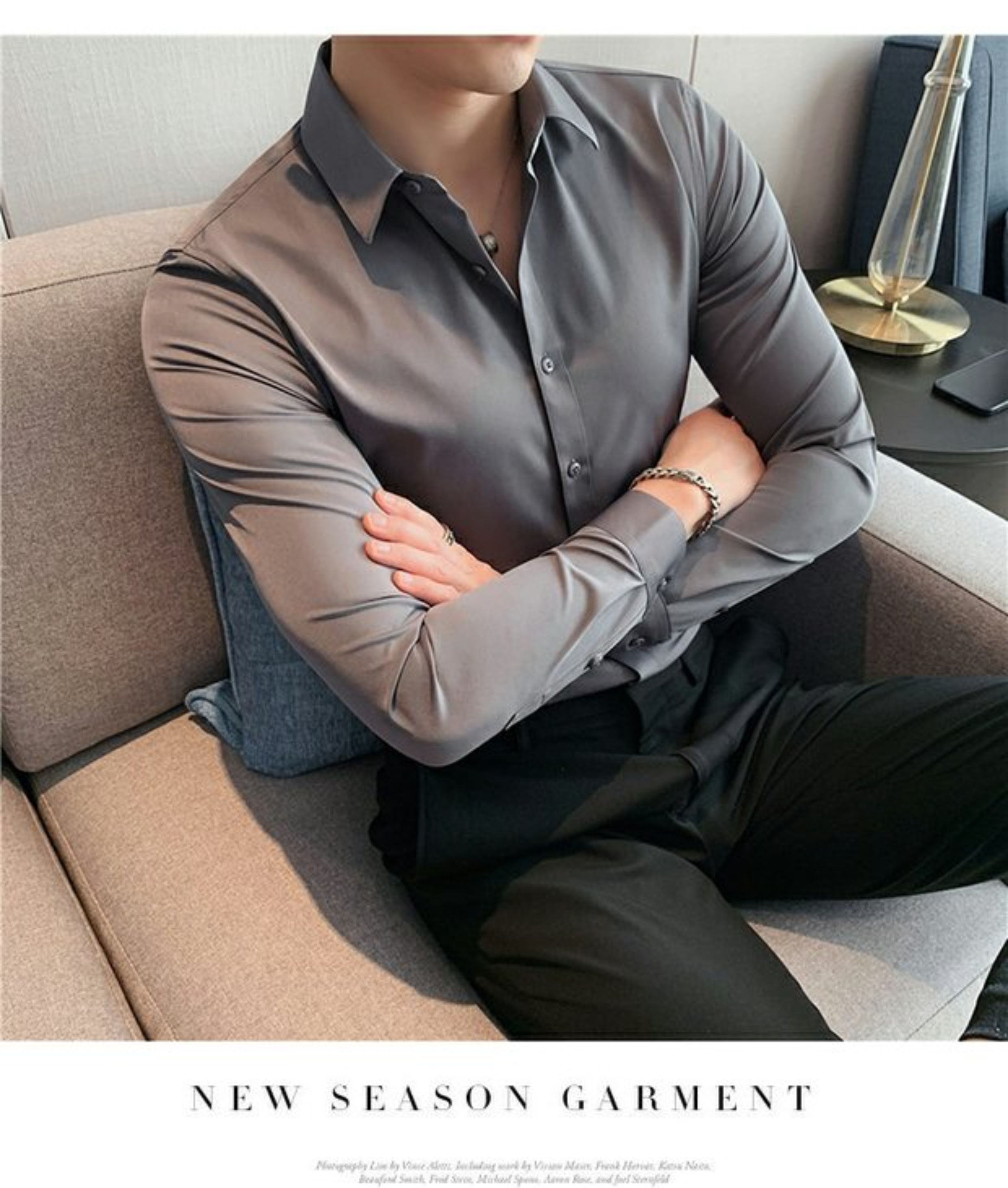High-End, Cool Gray Long-Sleeved Suit Shirt for Men, Stretchy Inner Layer, Slim-Fit Business Style, Fleece-Lined Black Base Shirt