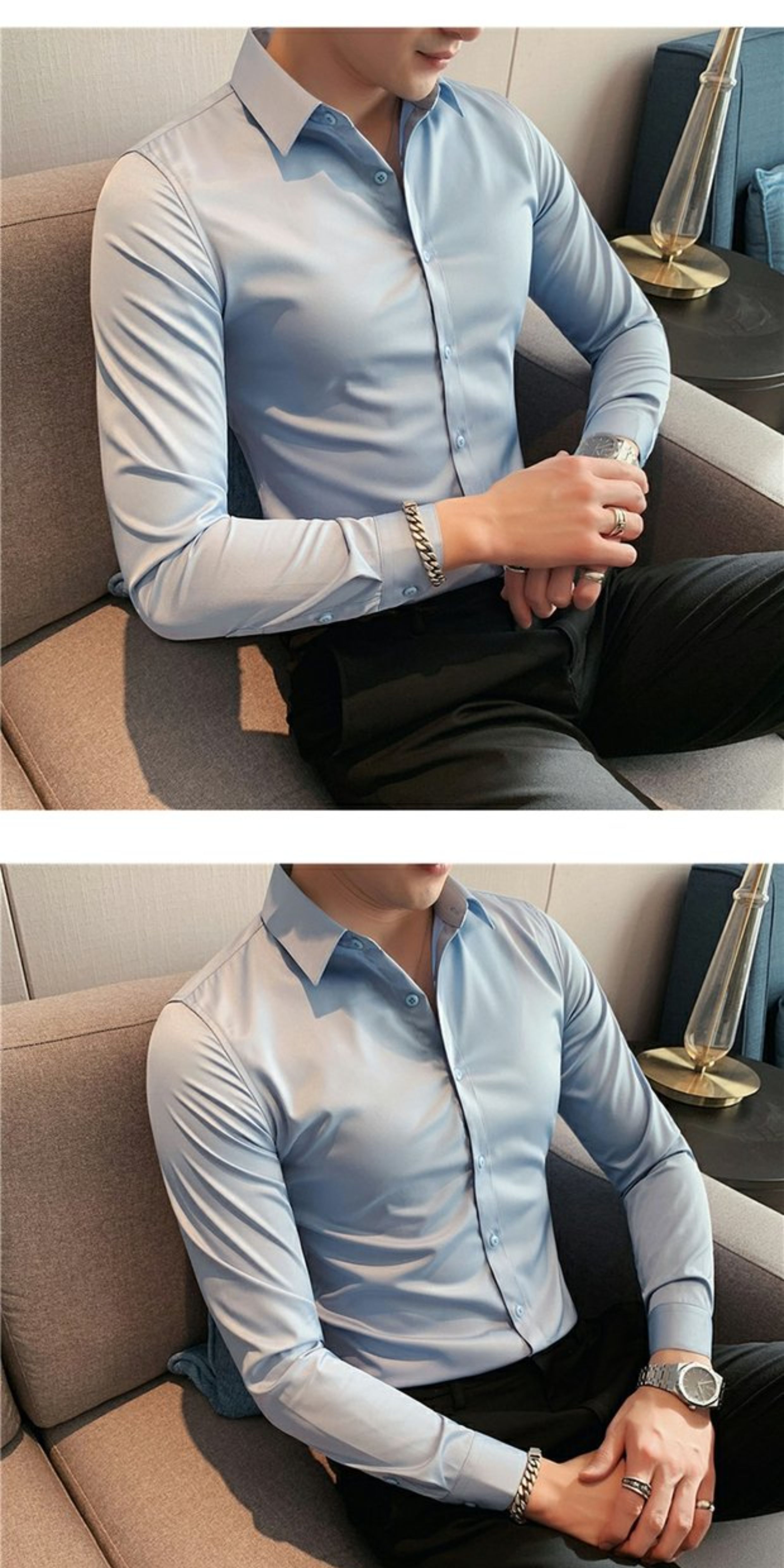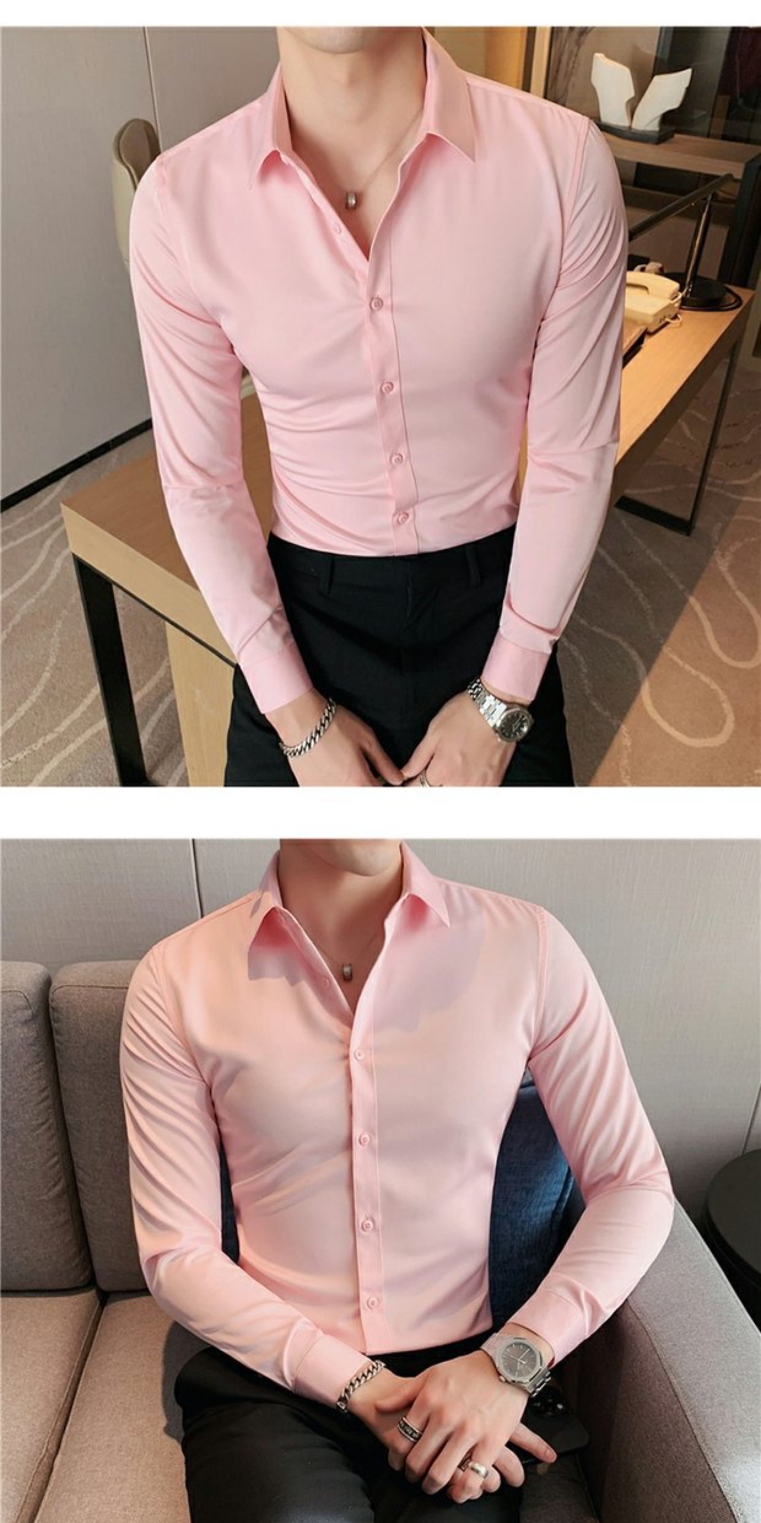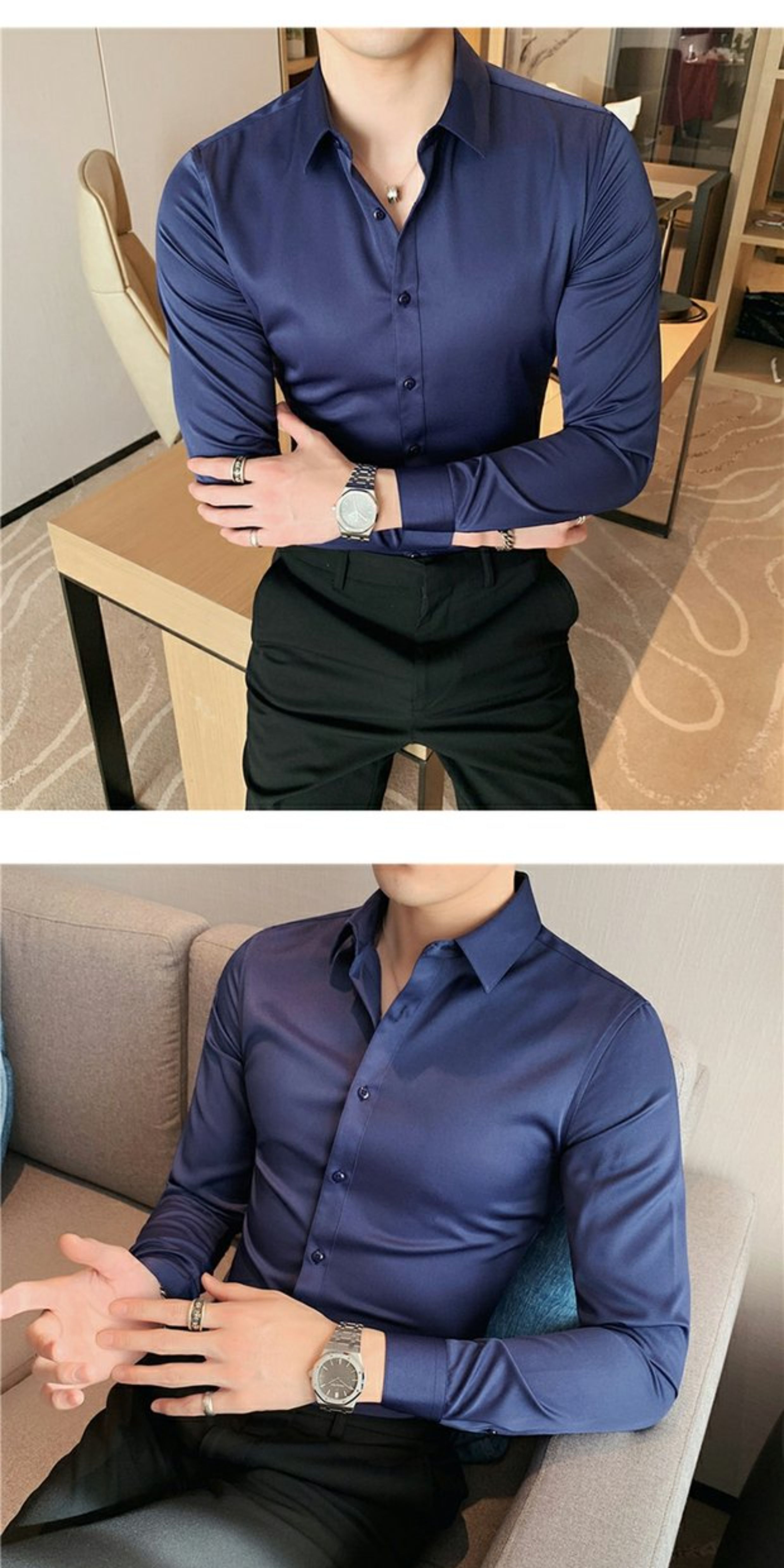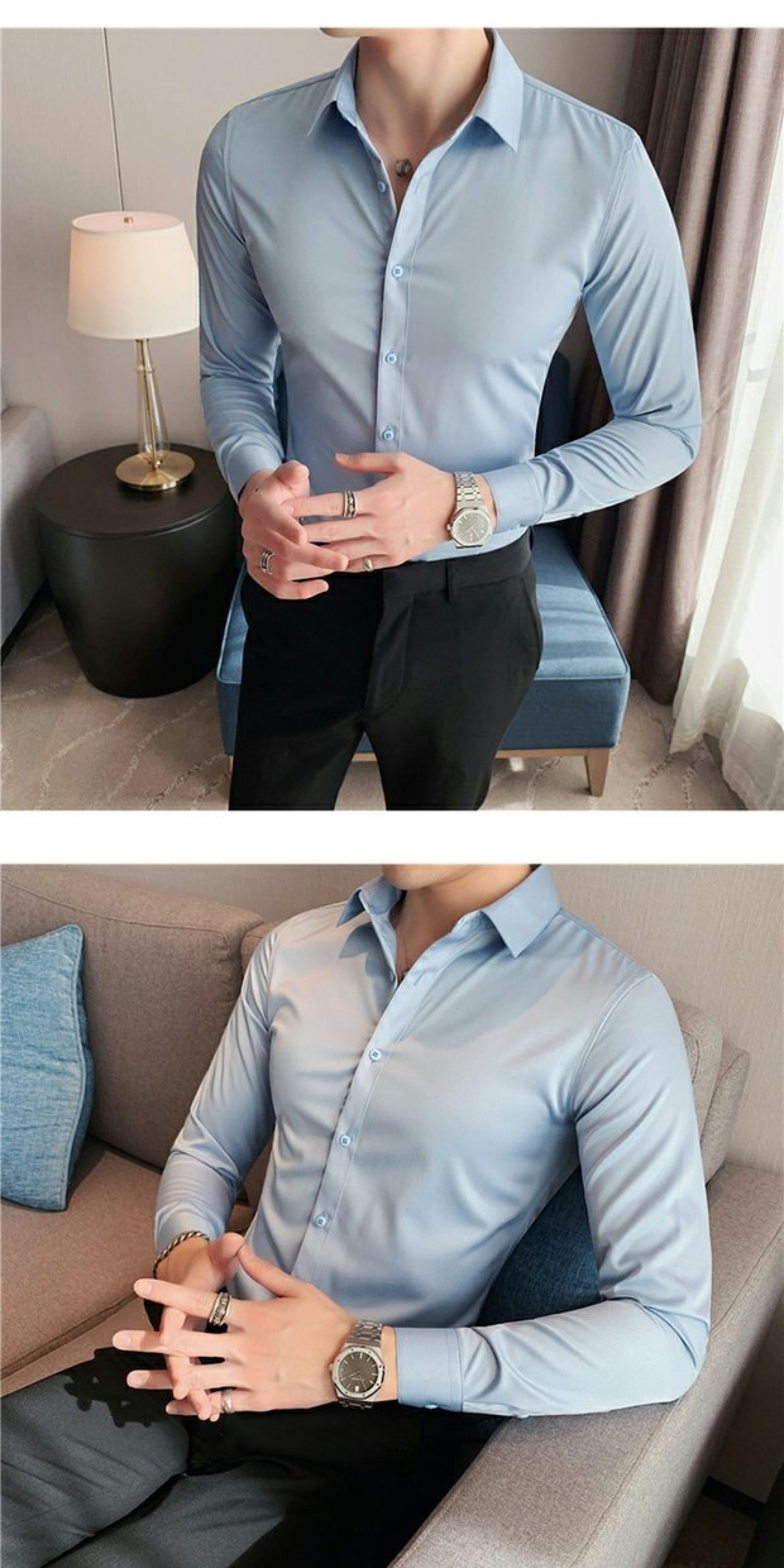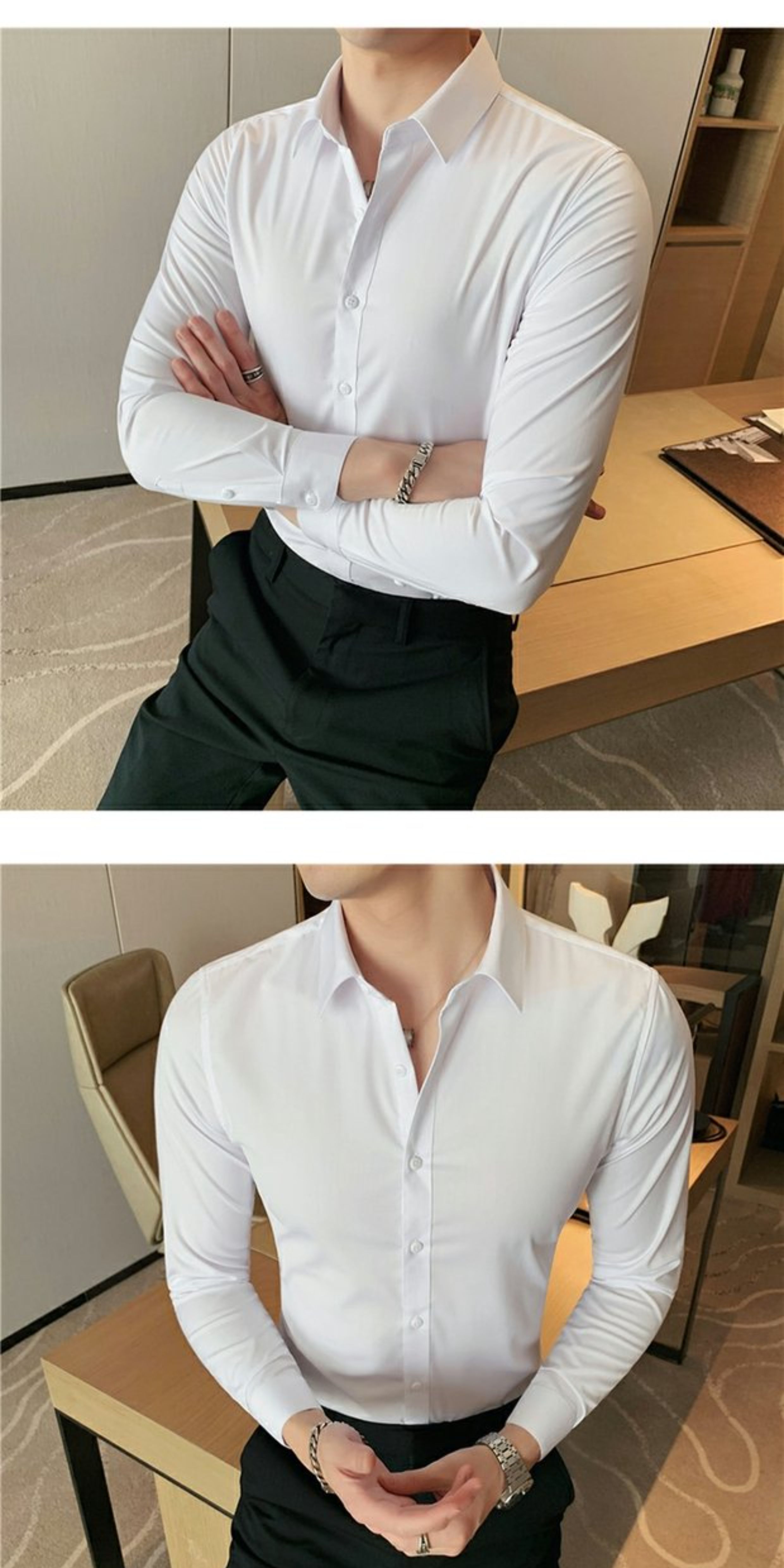 High-End, Cool Gray Long-Sleeved Suit Shirt for Men, Stretchy Inner Layer, Slim-Fit Business Style, Fleece-Lined Black Base Shirt