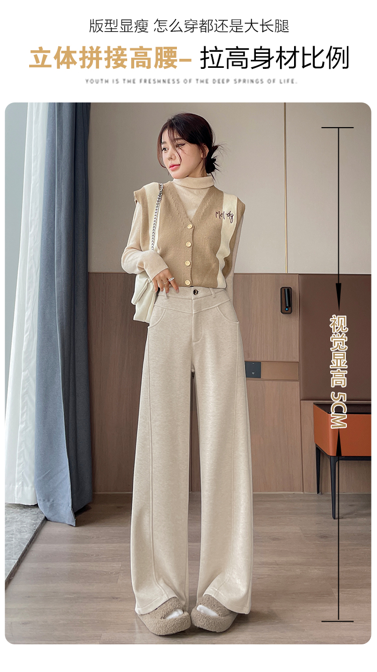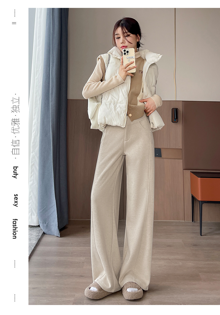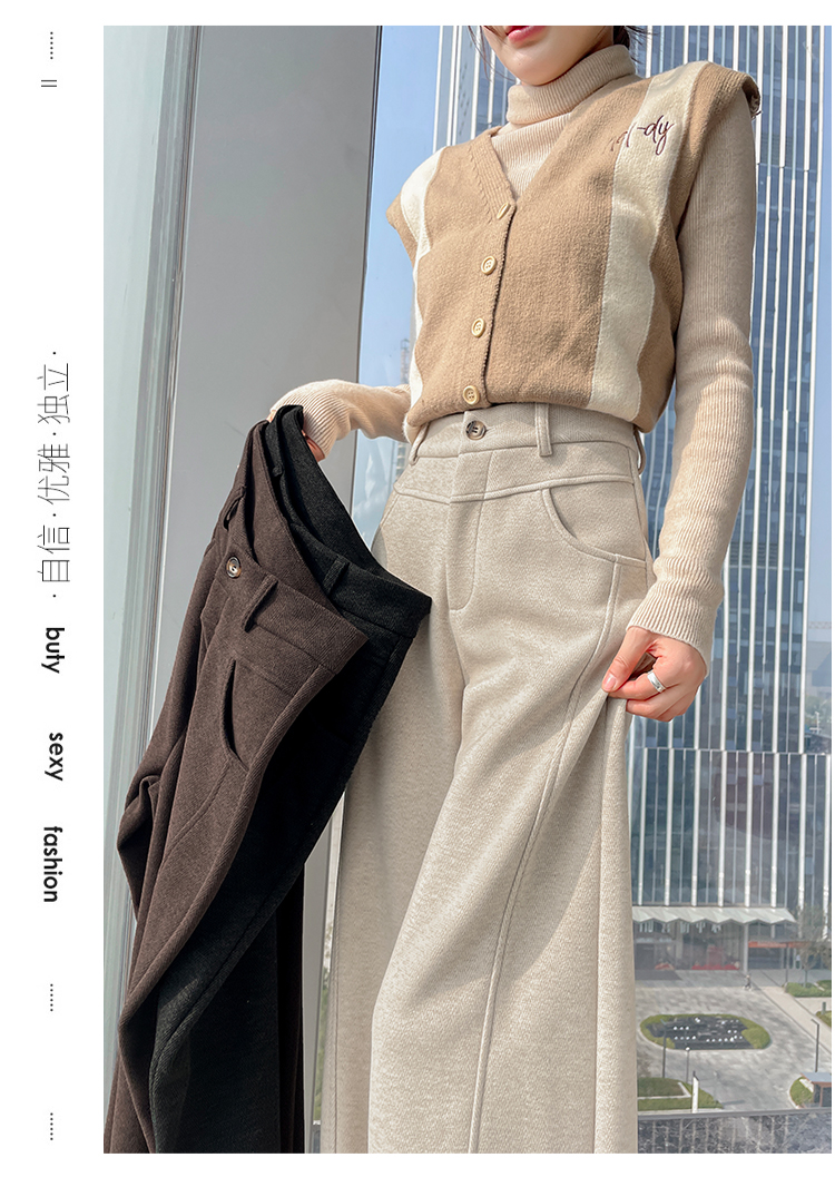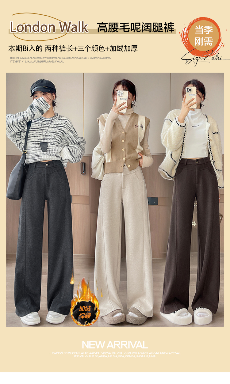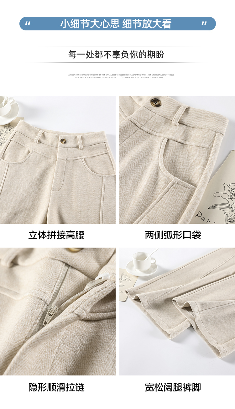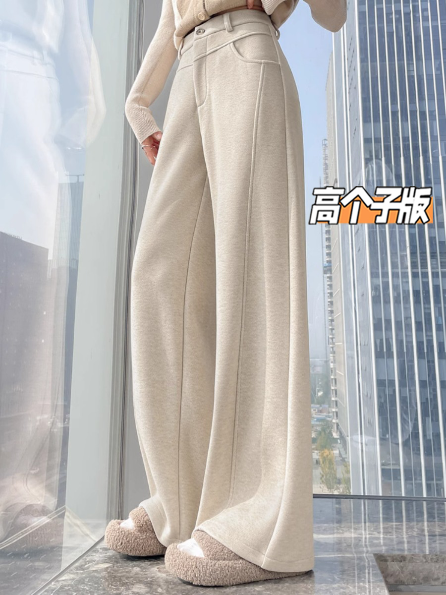 Tall Women's Extra-Long Apricot Cashmere Wool Suit Pants for Autumn and Winter, Fleece-Lined, High-Waisted, Slimming, Drapey, Extended Wide-Leg Pants