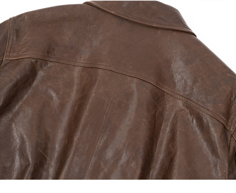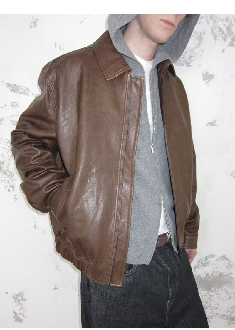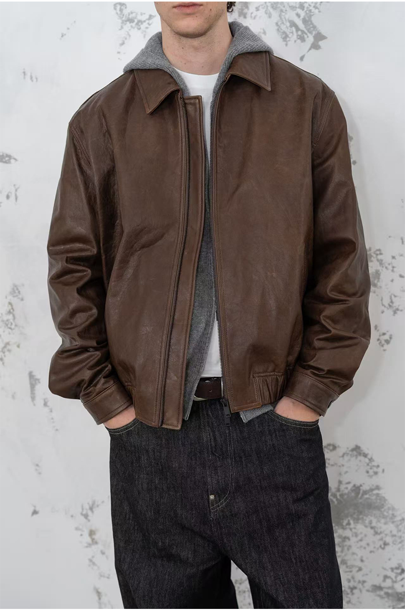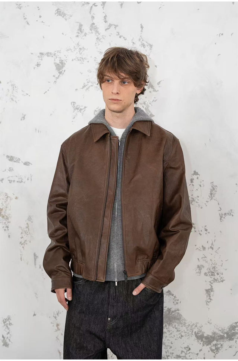Gremade Turkish Vintage Oil Waxed Sheepskin Short Elastic Cuff Straight Shoulder Lapel Leather Jacket