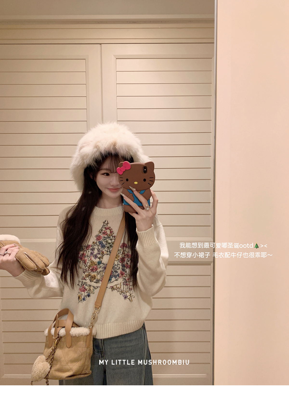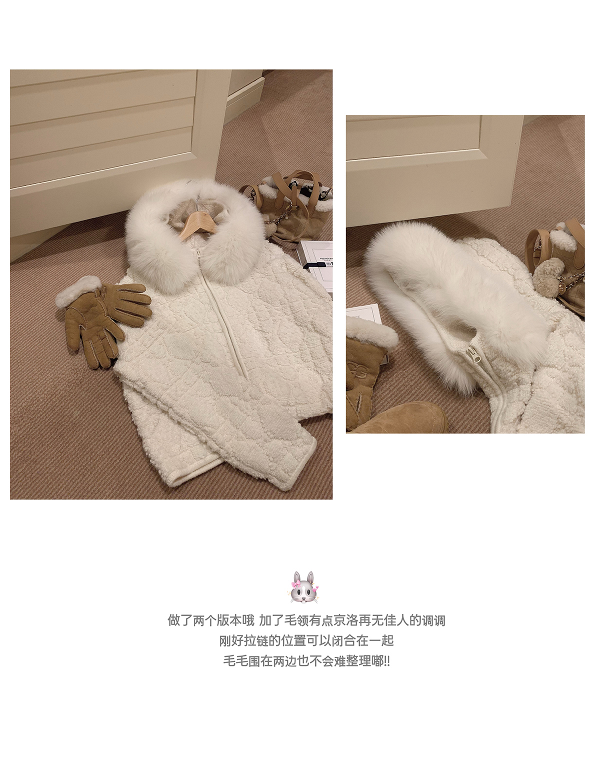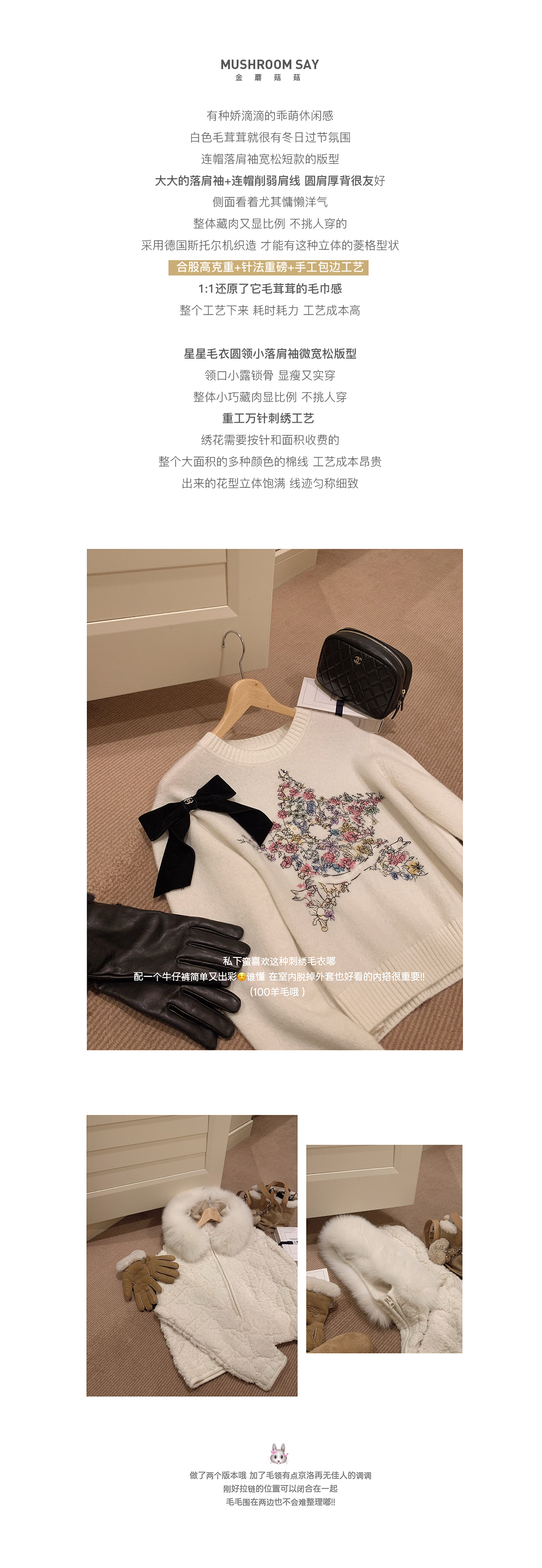 星星:100%绵羊毛 小白花:49.2%锦纶28.0%聚酯纤维22.8%绵羊毛(含微量其他纤维 毛领:狐狸毛 |