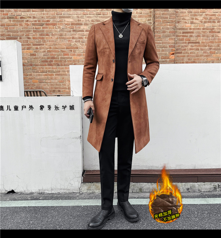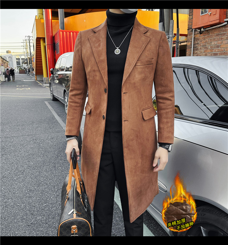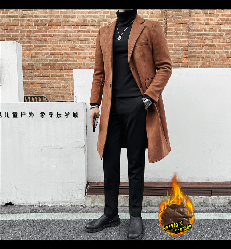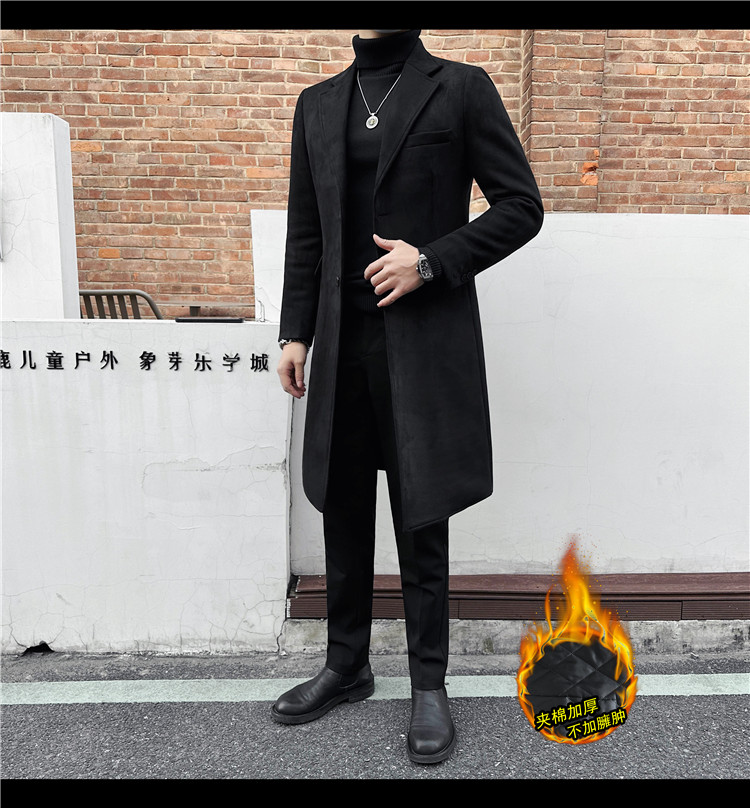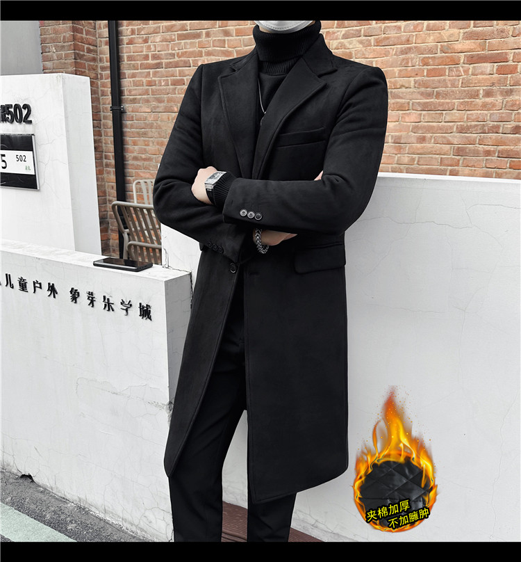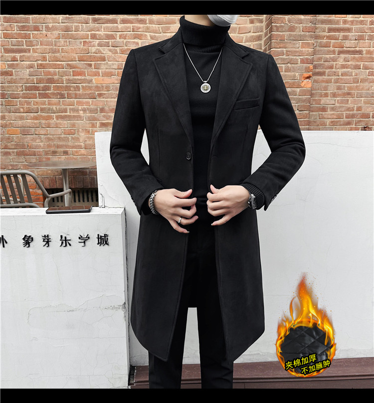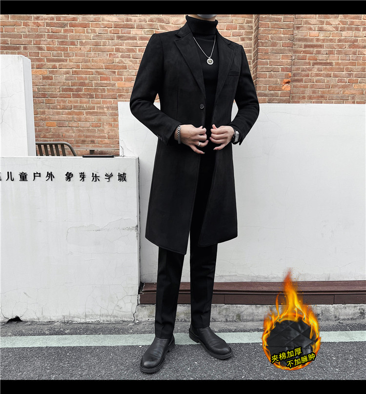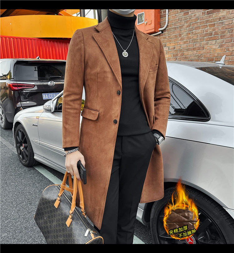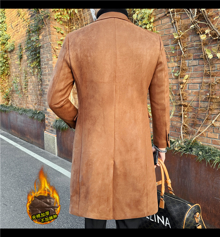 Suede Woolen Coat for Men, Mid-Length, Winter, Padded and Thickened, High-End, Trendy, Versatile Woolen Trench Coat