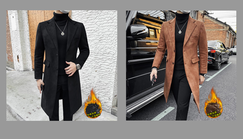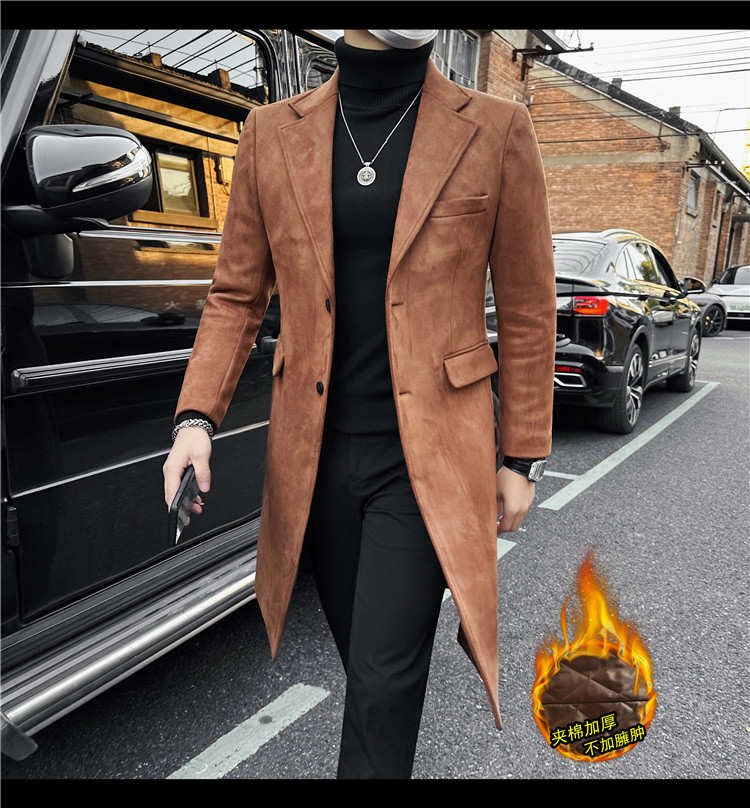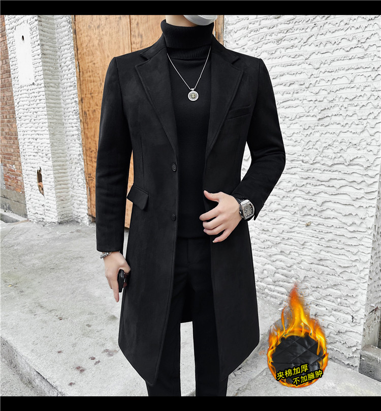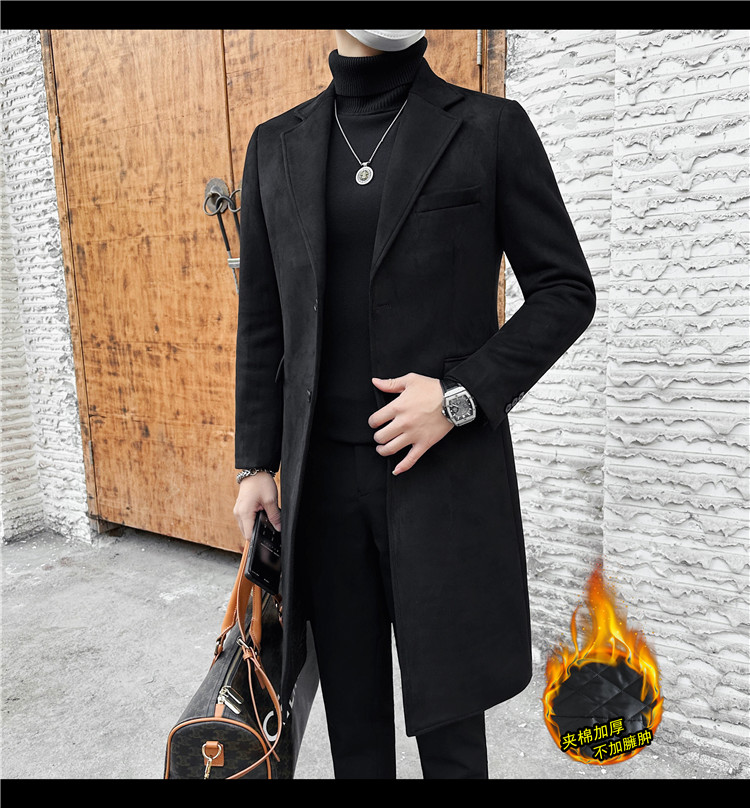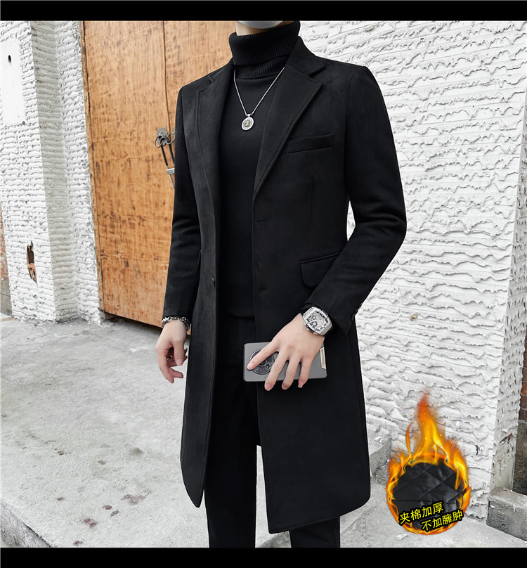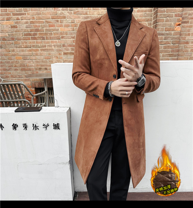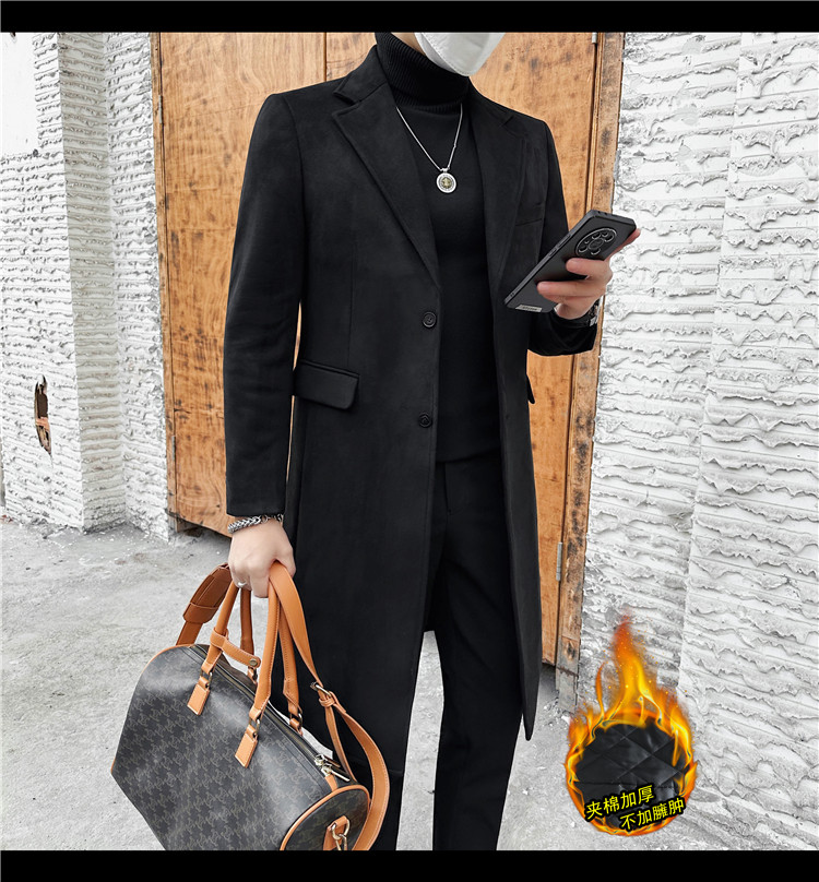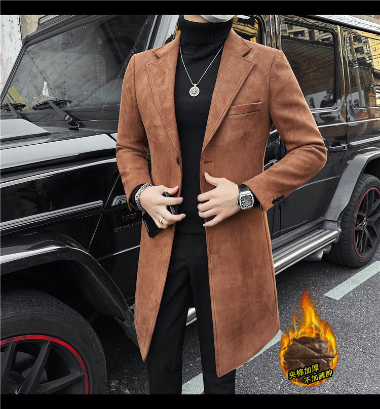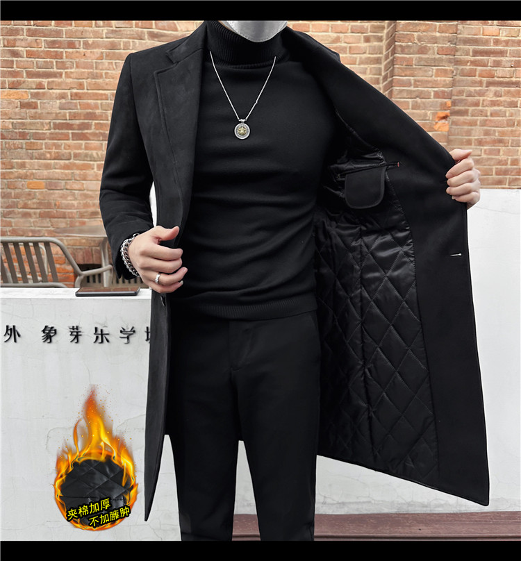 Suede Woolen Coat for Men, Mid-Length, Winter, Padded and Thickened, High-End, Trendy, Versatile Woolen Trench Coat
